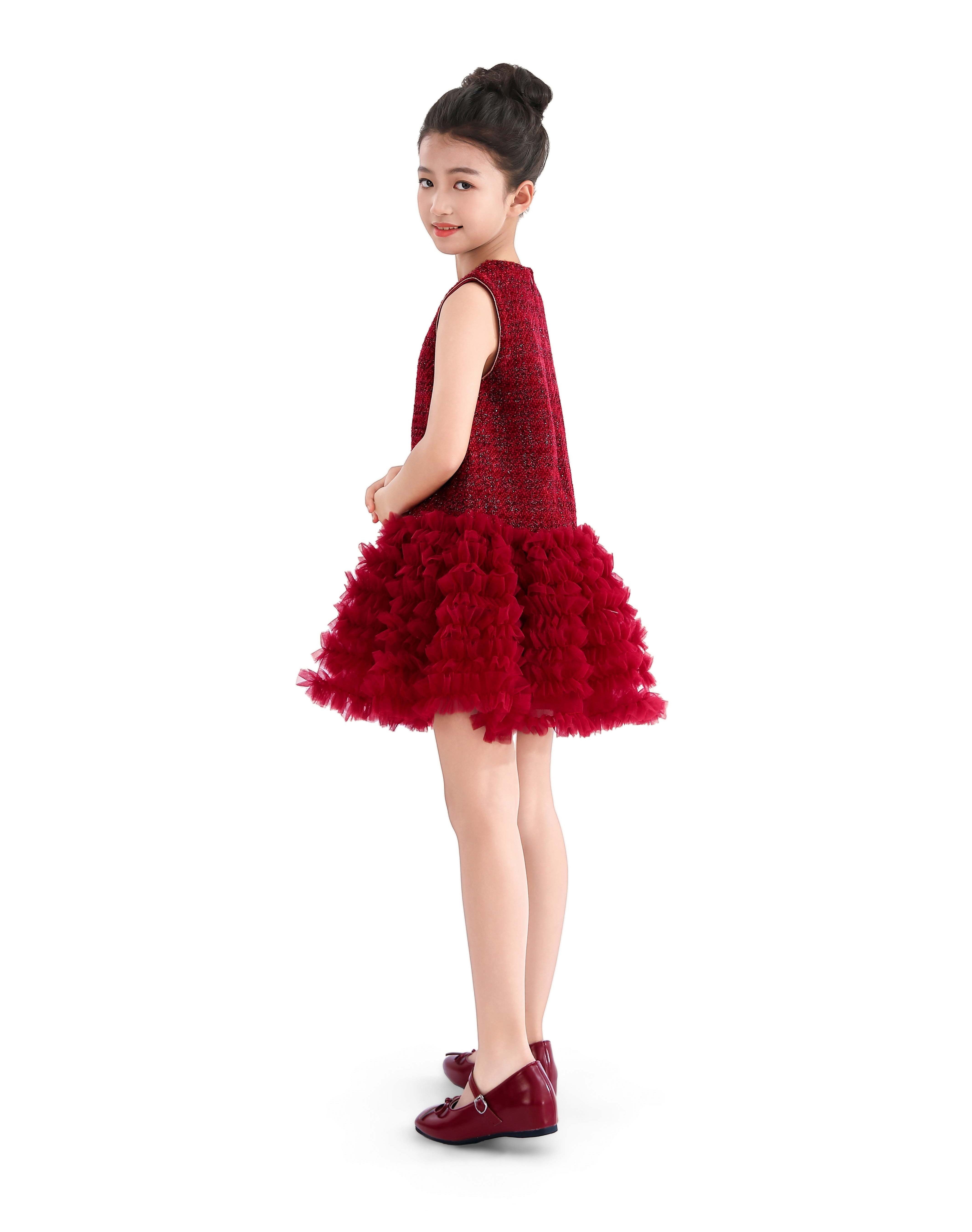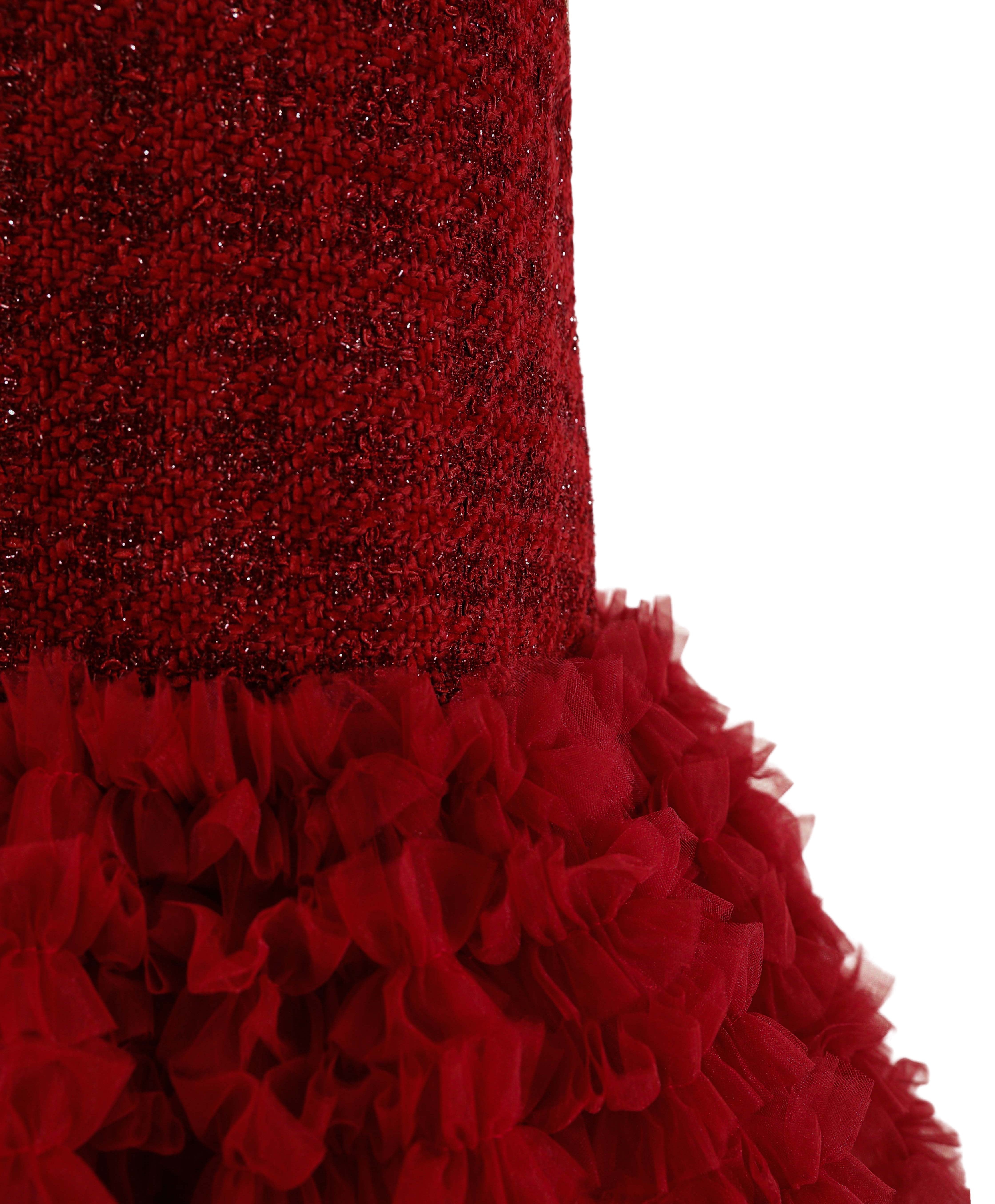 A standout blend of texture and volume, this red dress pairs a shimmering tweed bodice with a playful tulle skirt. Perfect for parties and festive occasions, it’s designed to dazzle with every twirl.