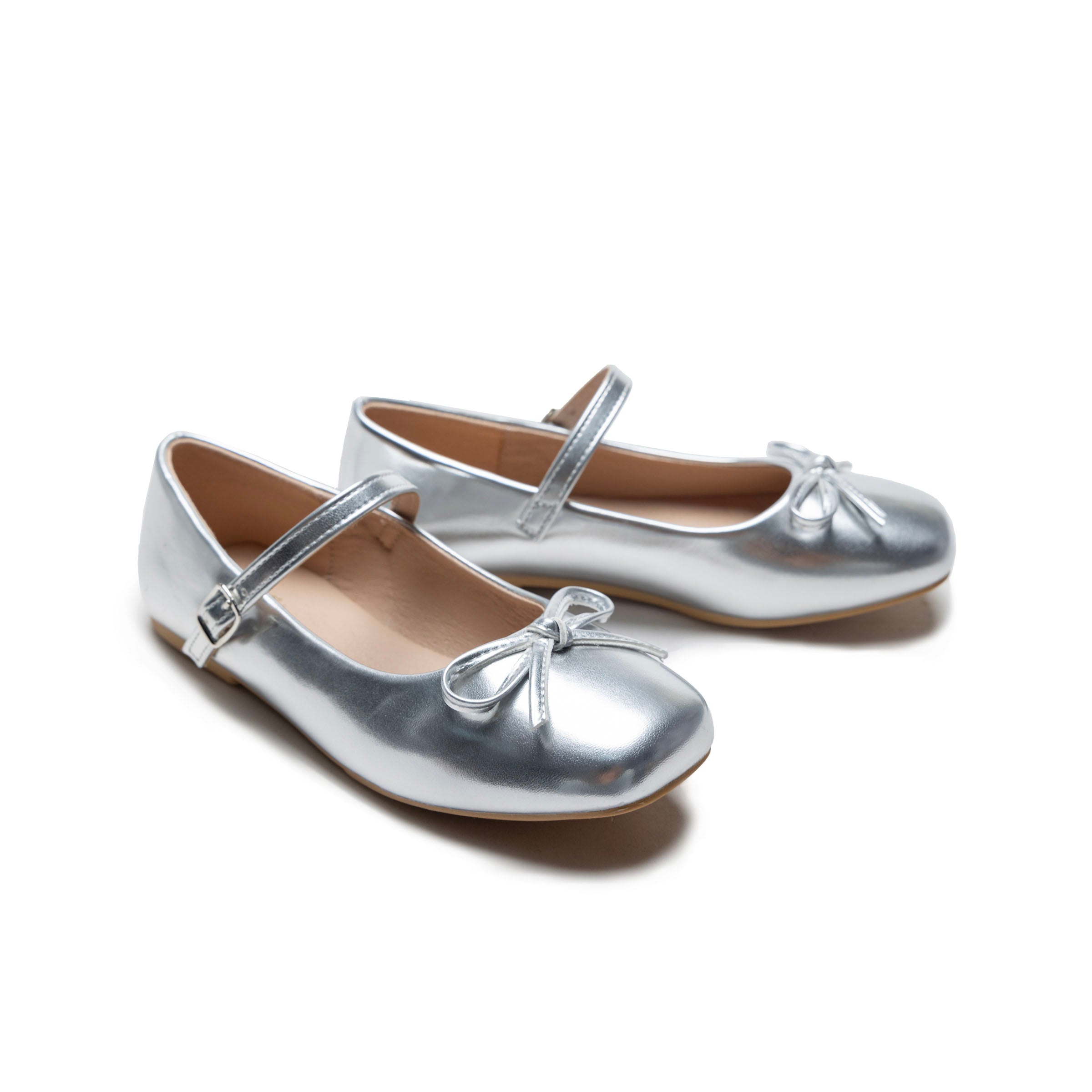 A sculpted bow graces the front, lending a soft, feminine accent to the modern metallic tone. Designed with comfort in mind, they offer a snug fit and gentle support for every step.