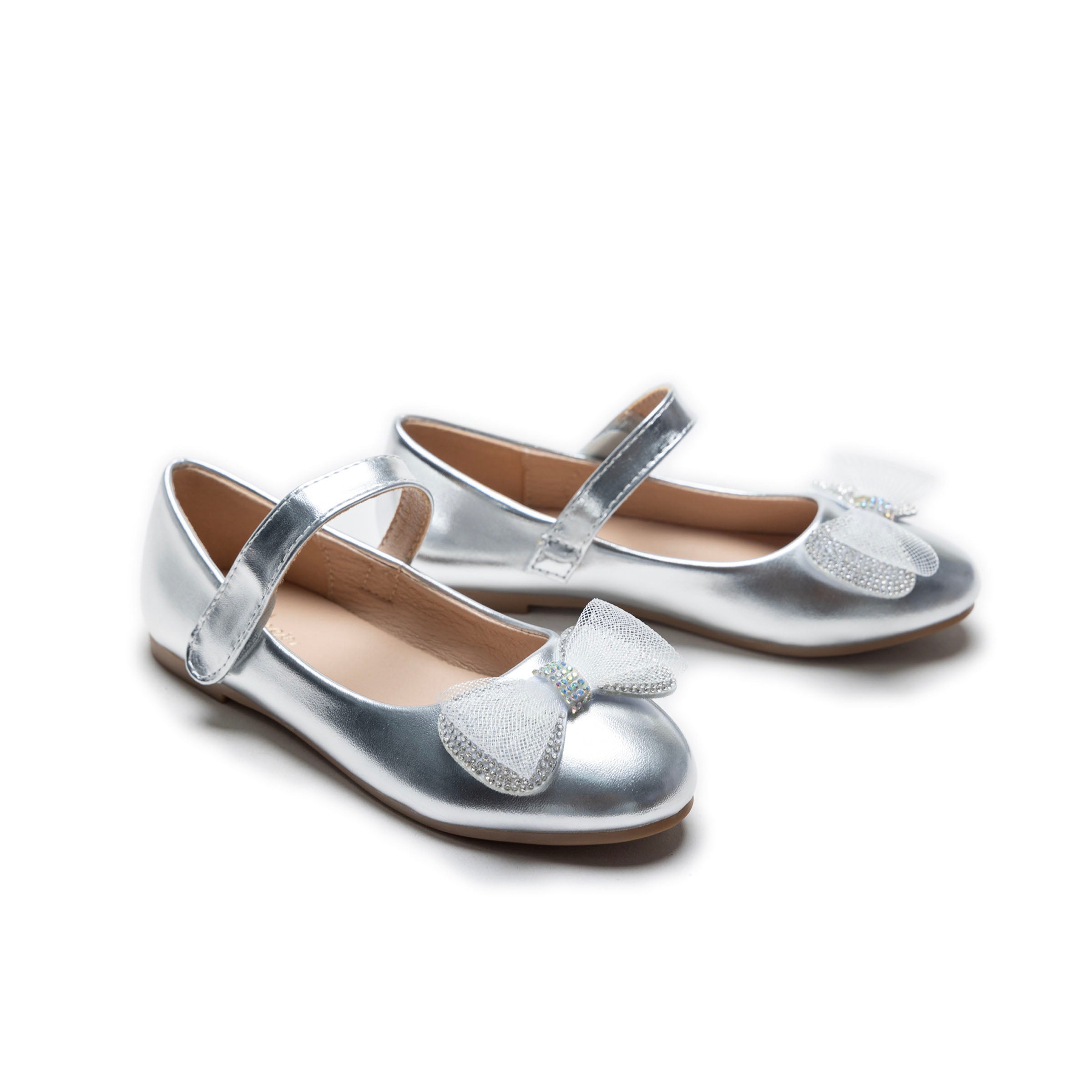 Shimmering with charm, the Silver Lydia Bow Flats offer a perfect balance of sparkle and sophistication. Their metallic finish catches the light beautifully, while the elegant bow detail adds a touch of playful refinement.