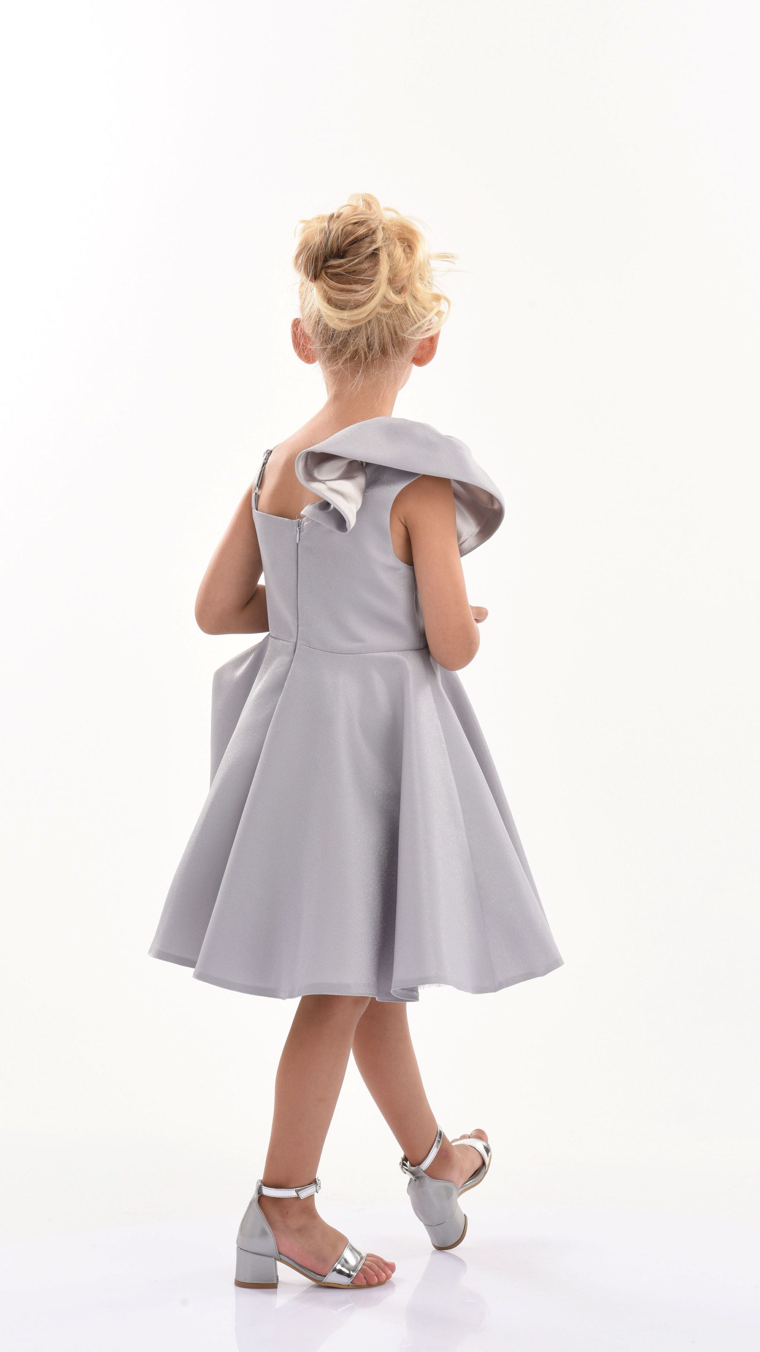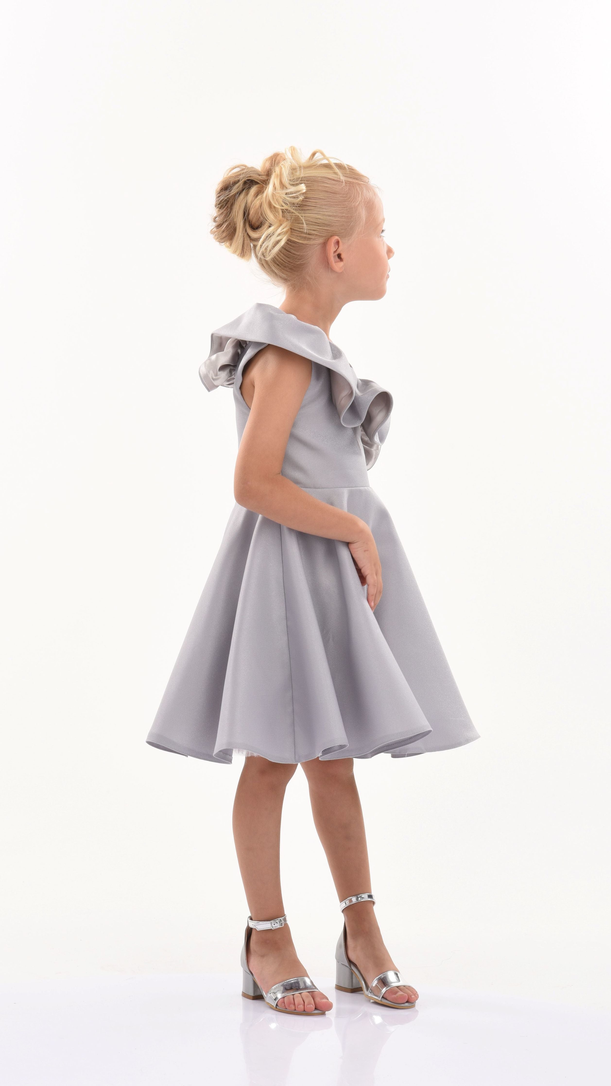 The Silver Riviera Off Shoulder Ruffle Dress for kid girls from Tulleen is a perfect blend of elegance and playfulness, ideal for special occasions. This dress features an off-shoulder ruffle design that adds a touch of glamour and sophistication. Moreover, the delicate ruffles cascade gracefully along the neckline, enhancing the dress's playful flair.