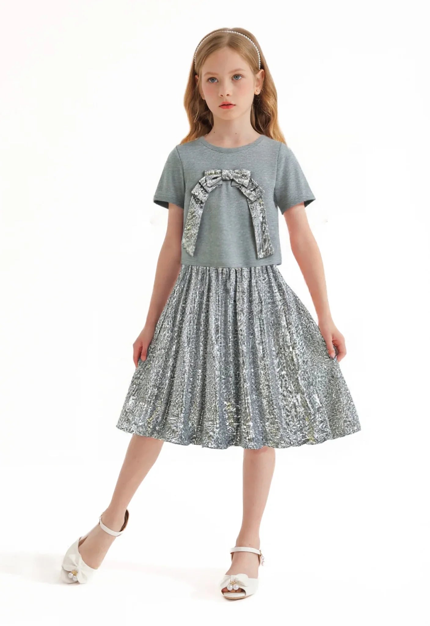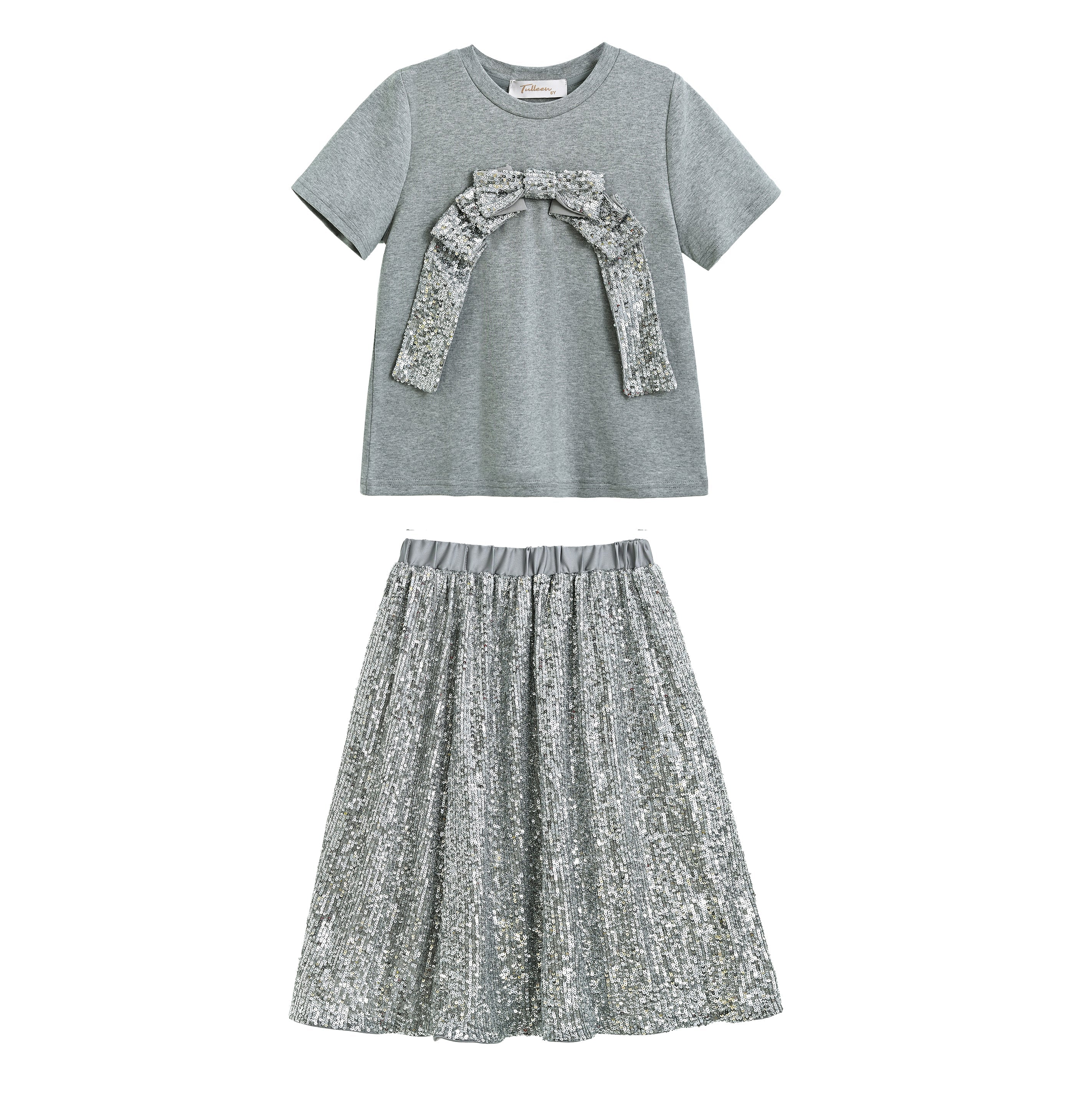 Silver Sequin Bow T-shirt & Skirt Set