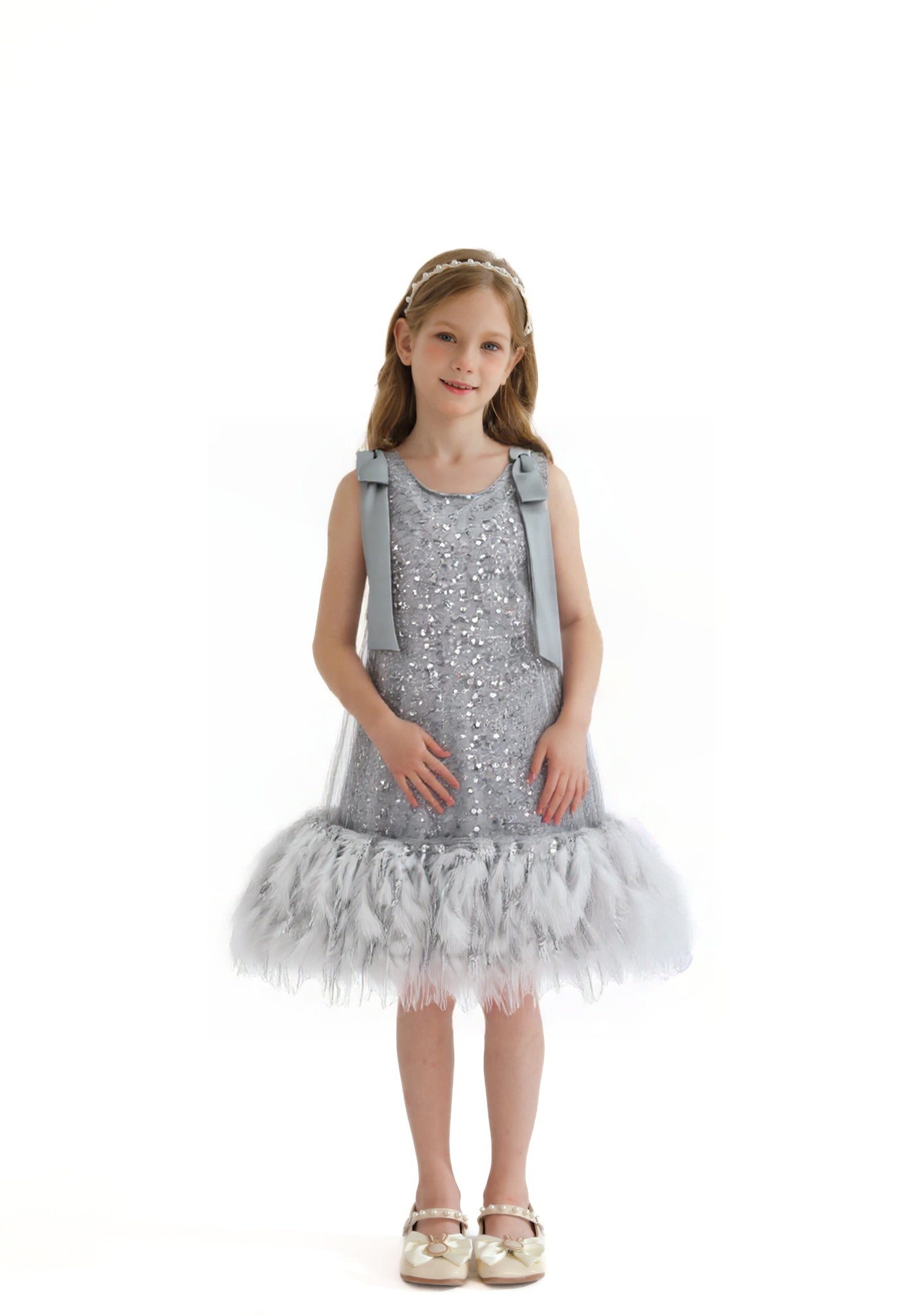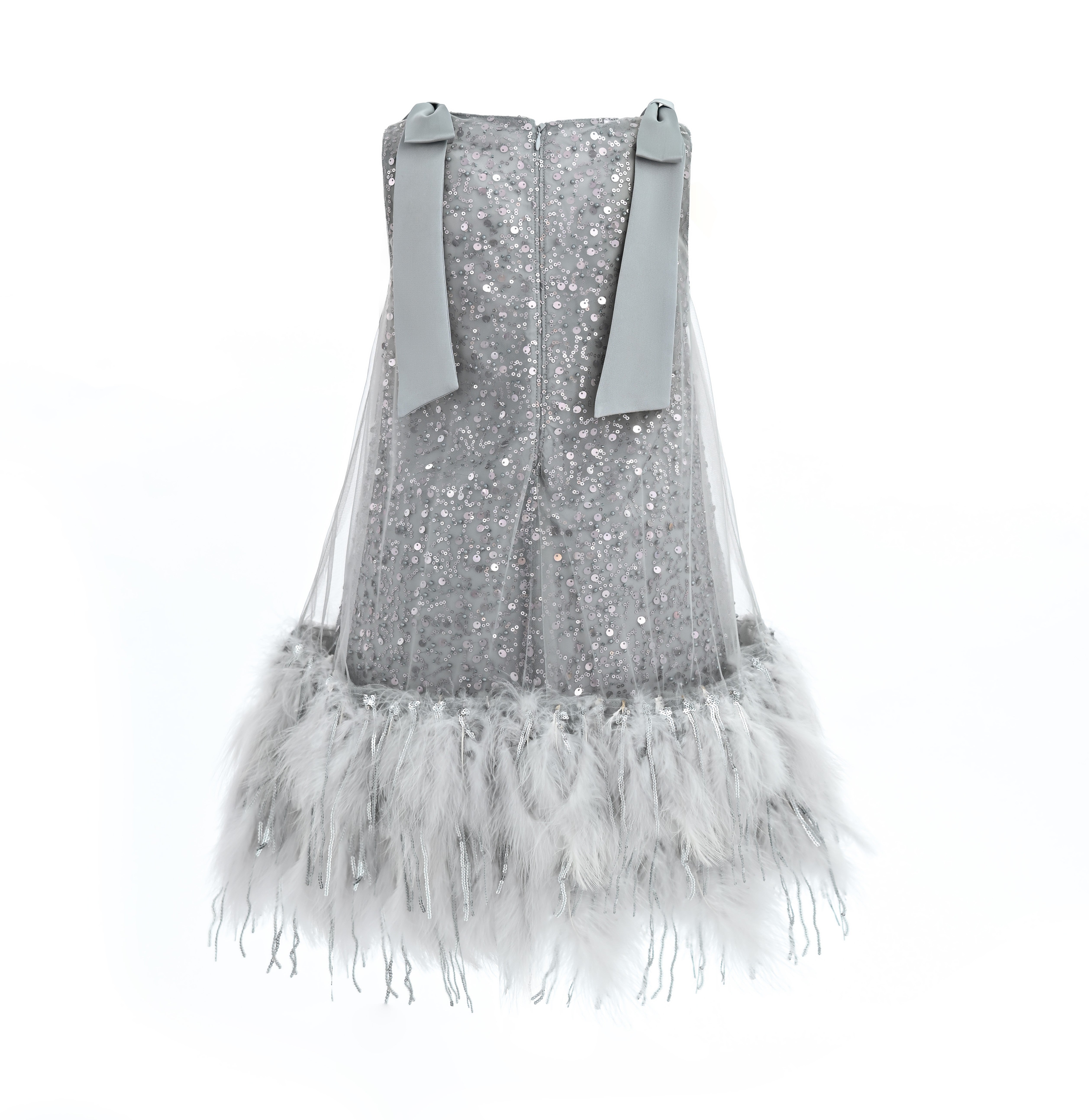 A dazzling choice for festive occasions, this sleeveless silver dress sparkles with sequins and finishes in a whimsical feathered hem. Satin shoulder ties add a soft, elegant touch to the shimmering silhouette.