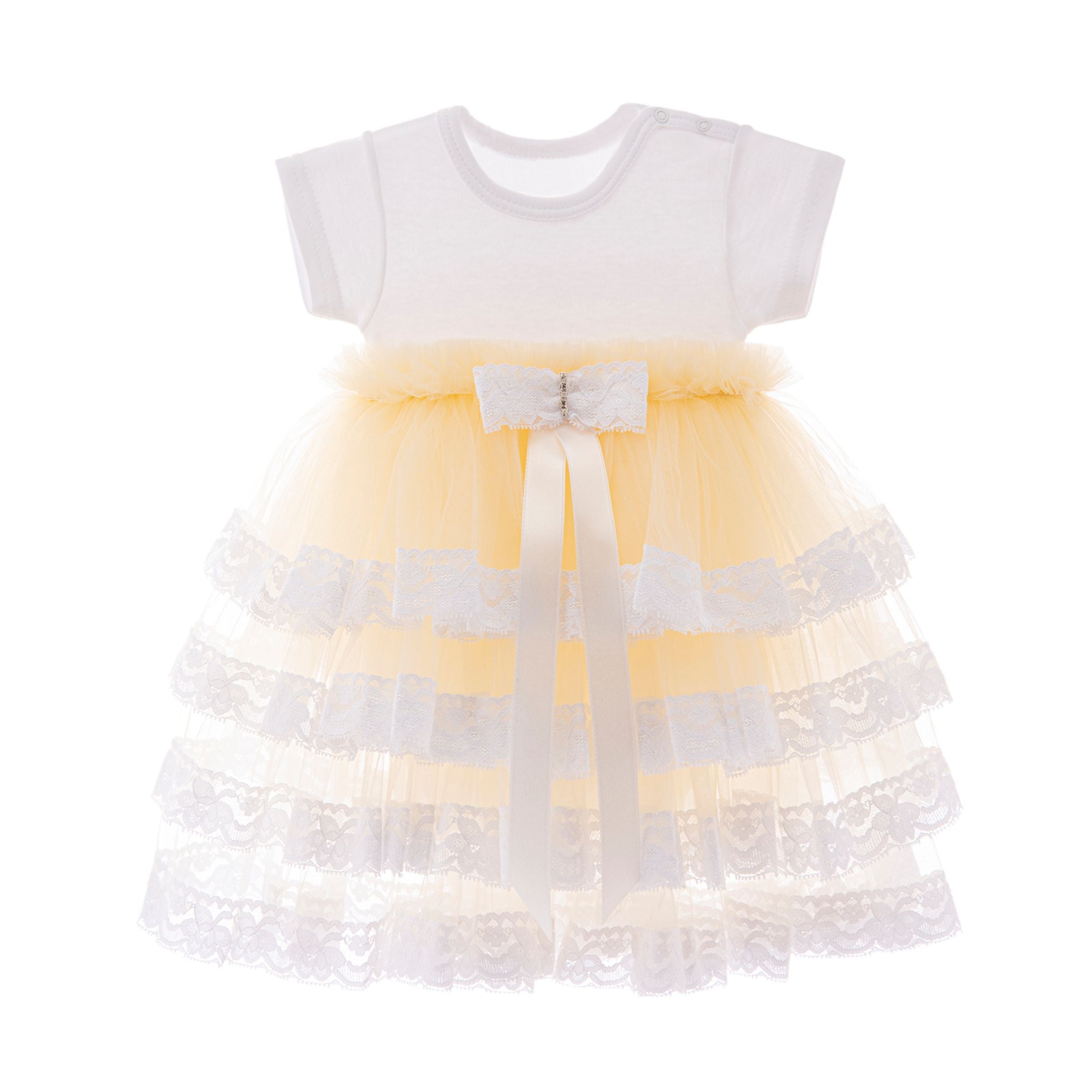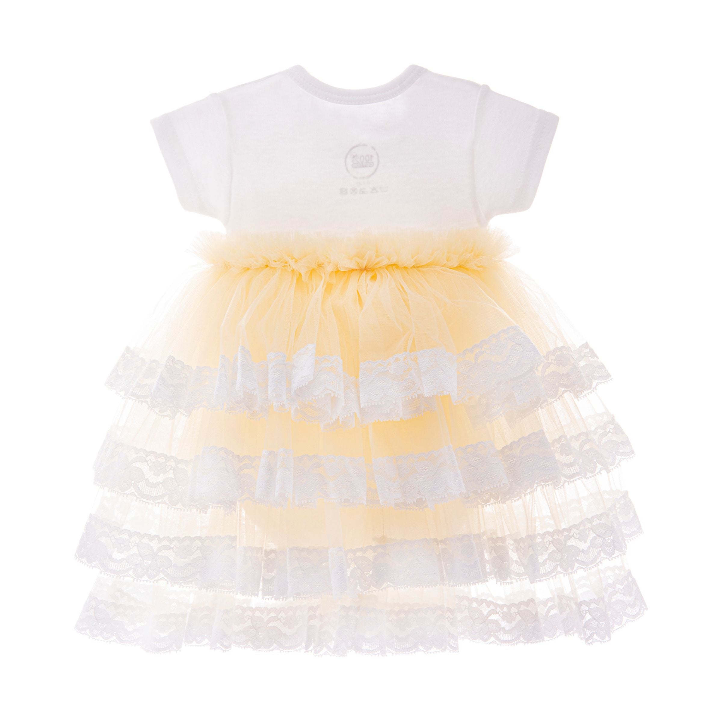 Beige Bella Vina ruffle babysuit tulle dress for baby girls from Tulleen. Featuring a white cotton jersey babysuit with button closure, paired with a lace hem tulle skirt with a beige hue.