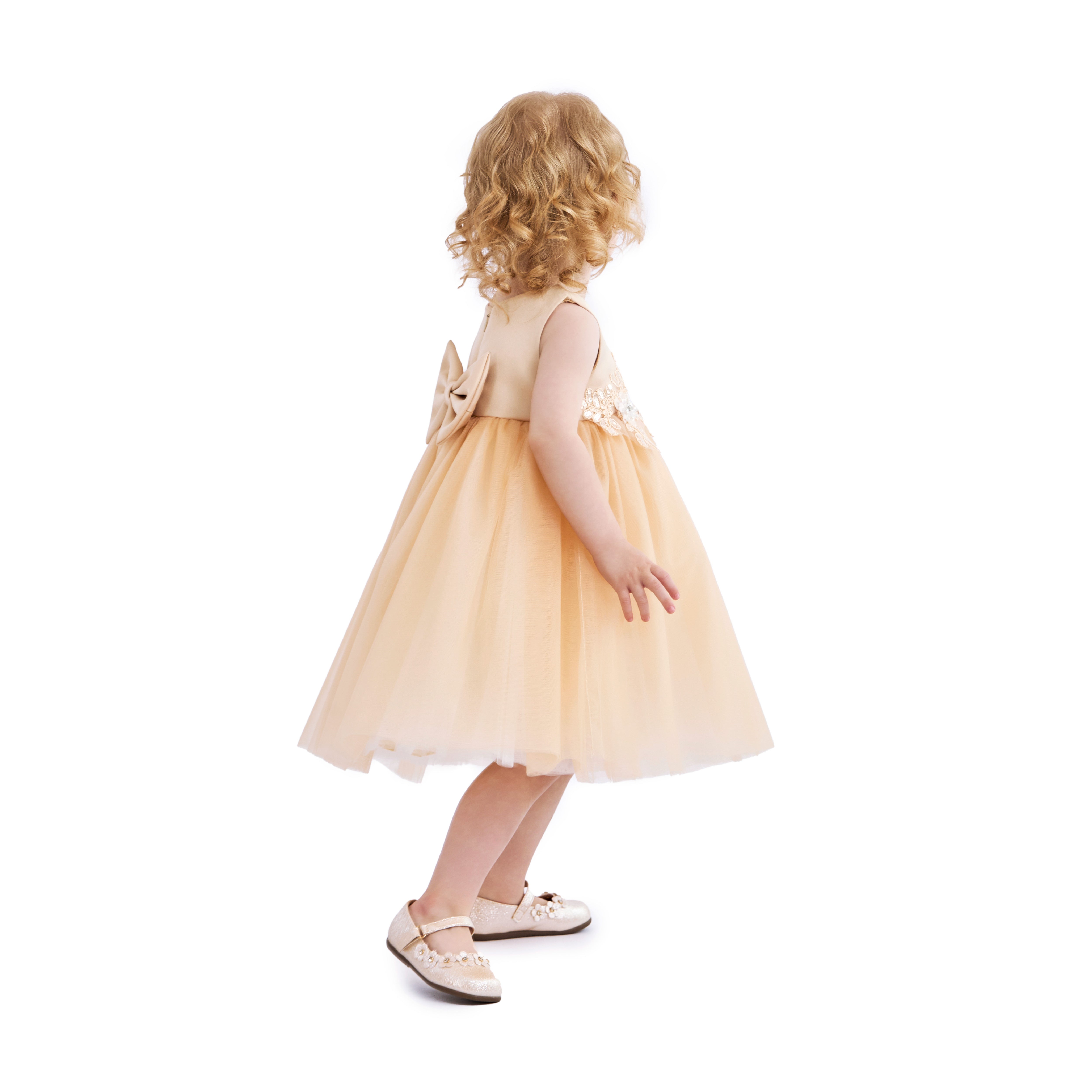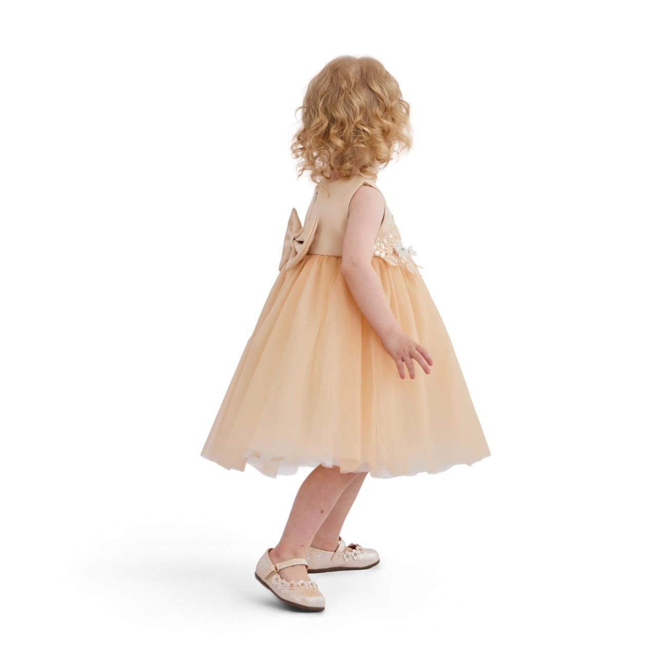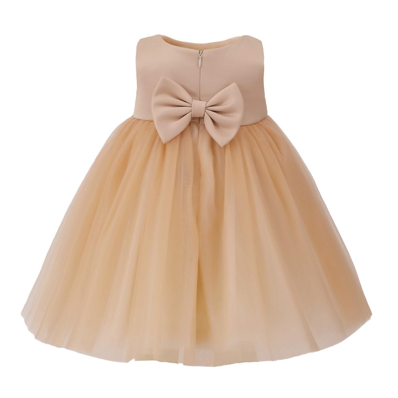 A refined dress for a child that pairs a structured bodice with a full, flared skirt and a statement waist bow, creating a timeless, picture‑ready silhouette for formal occasions.