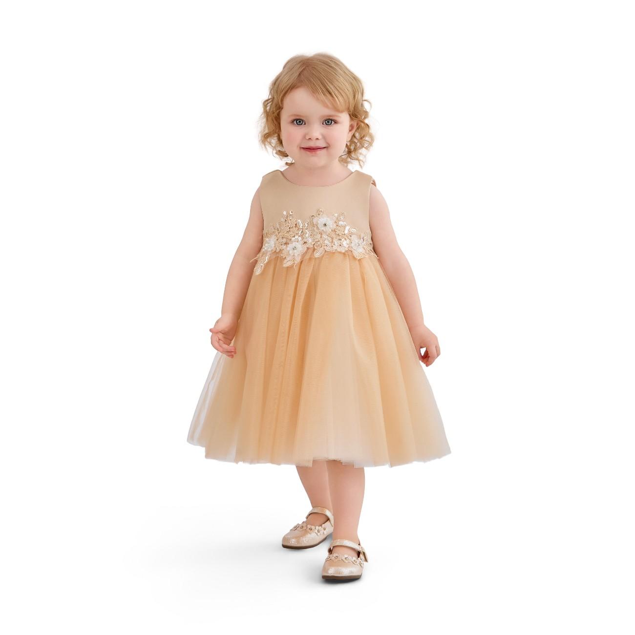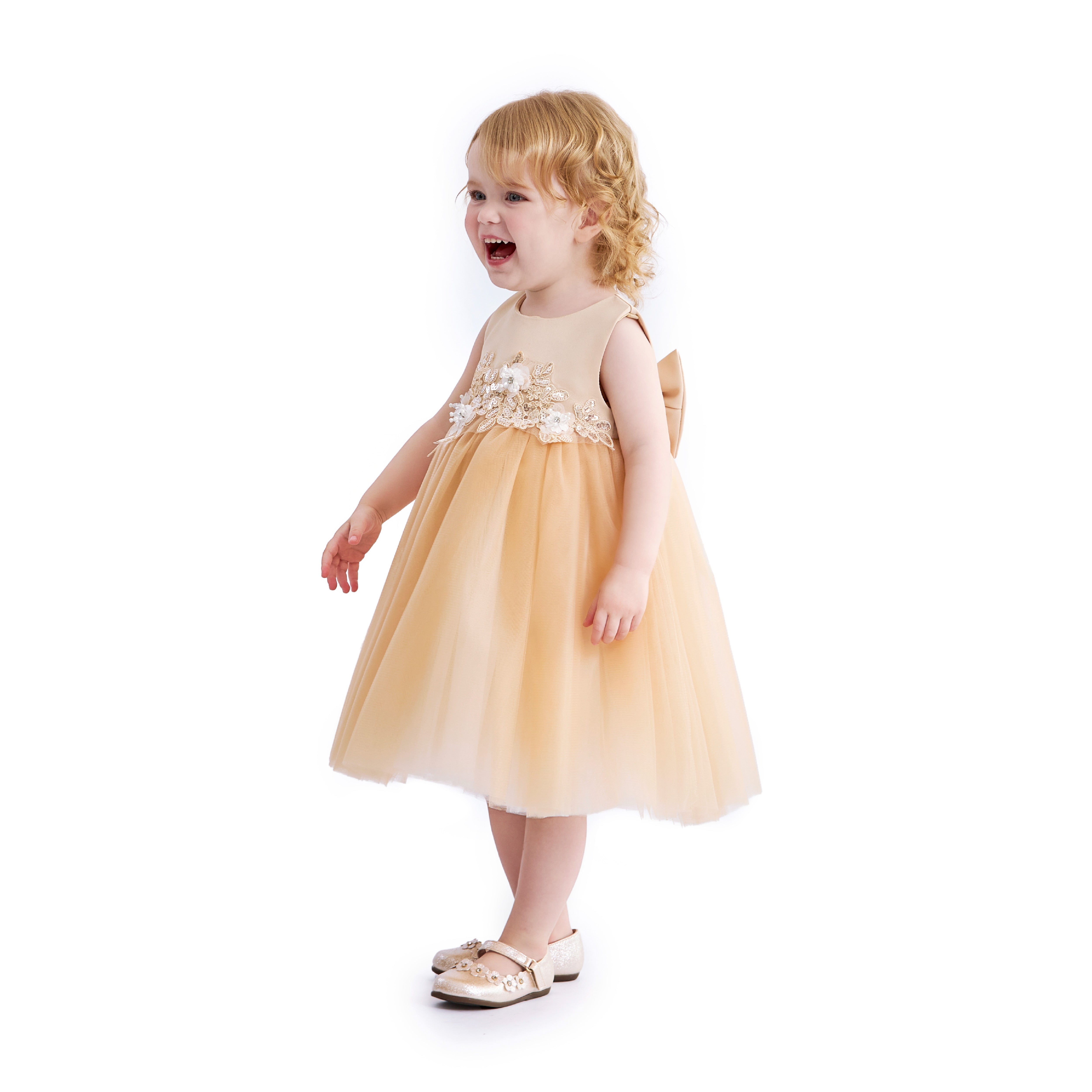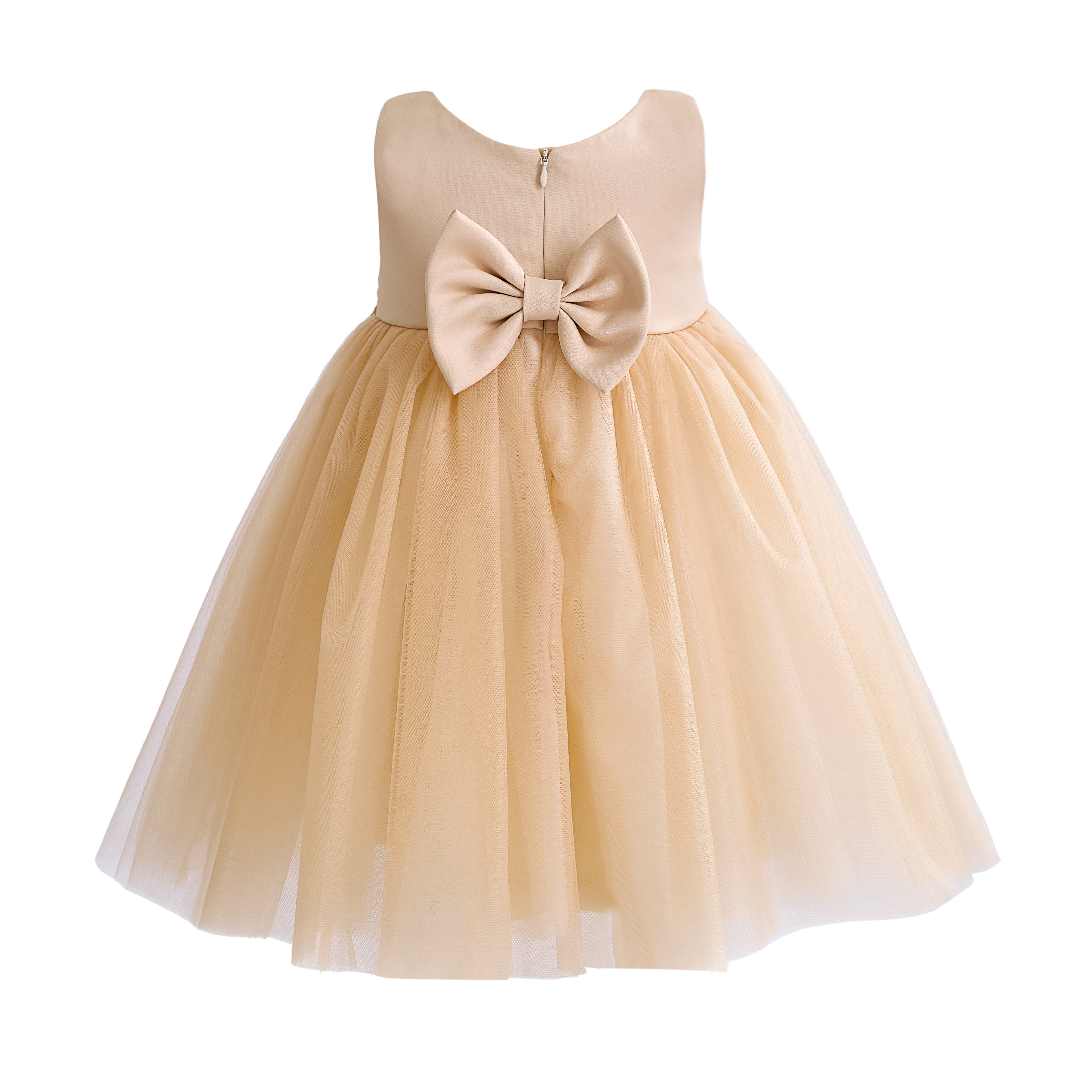 A refined dress for a child that pairs a structured bodice with a full, flared skirt and a statement waist bow, creating a timeless, picture‑ready silhouette for formal occasions.