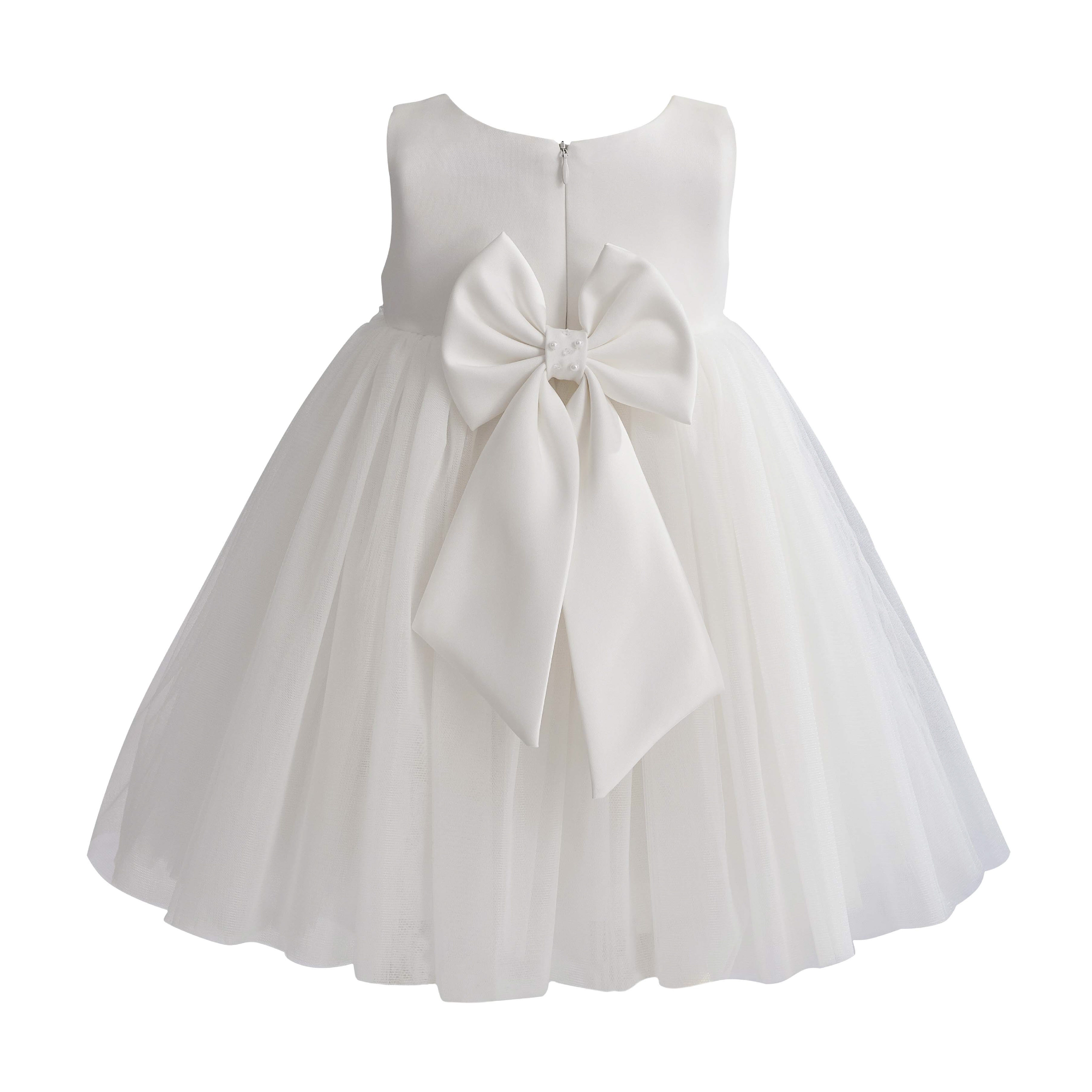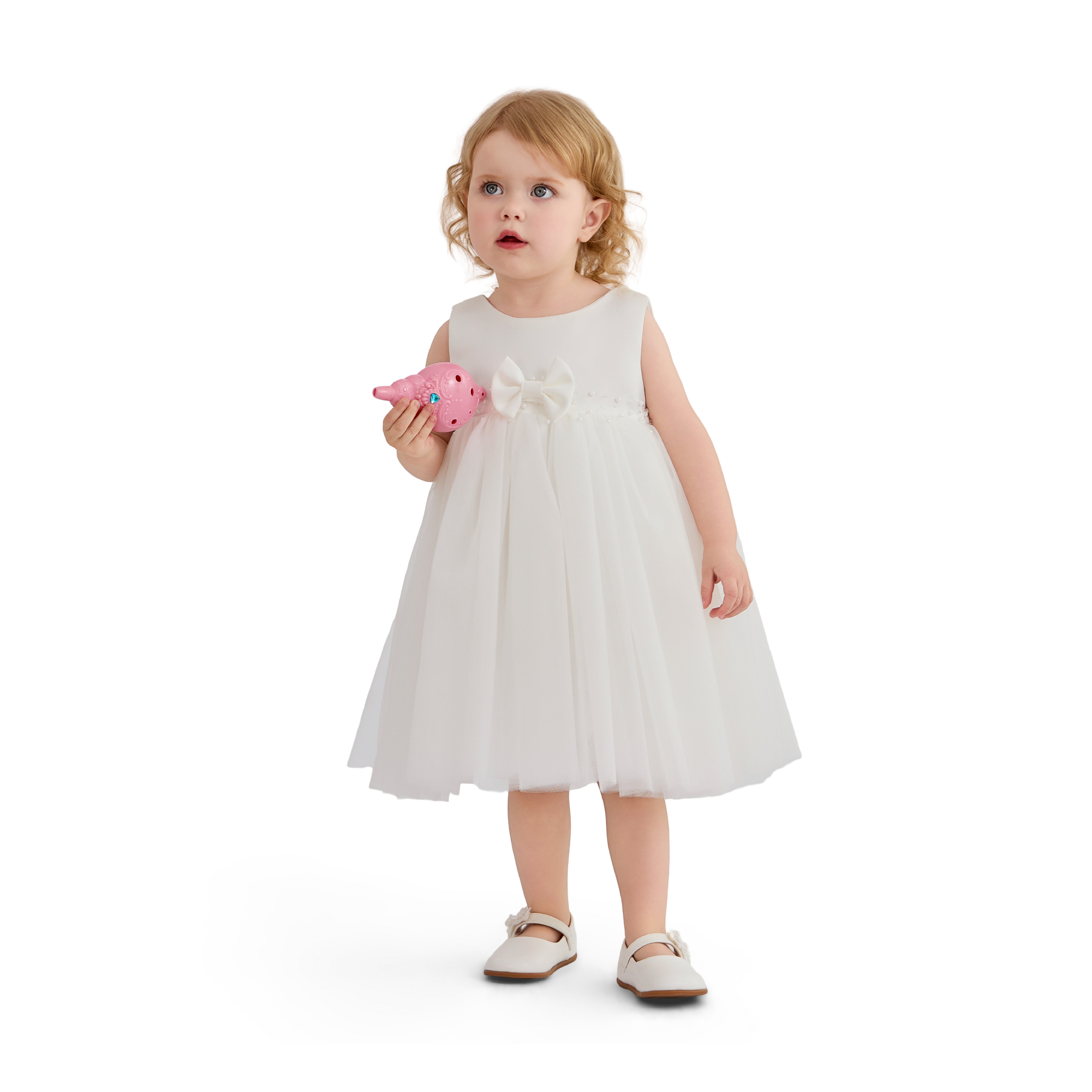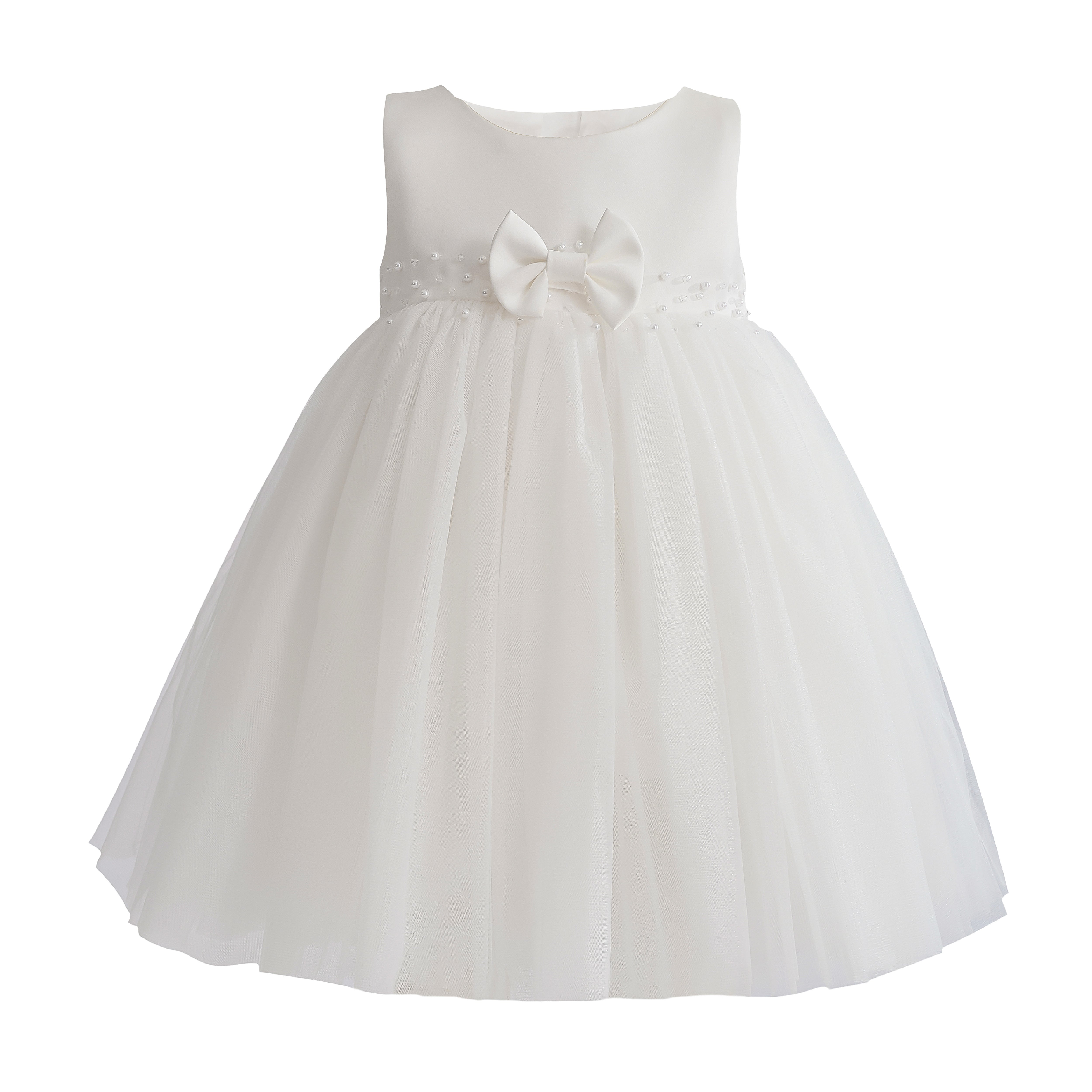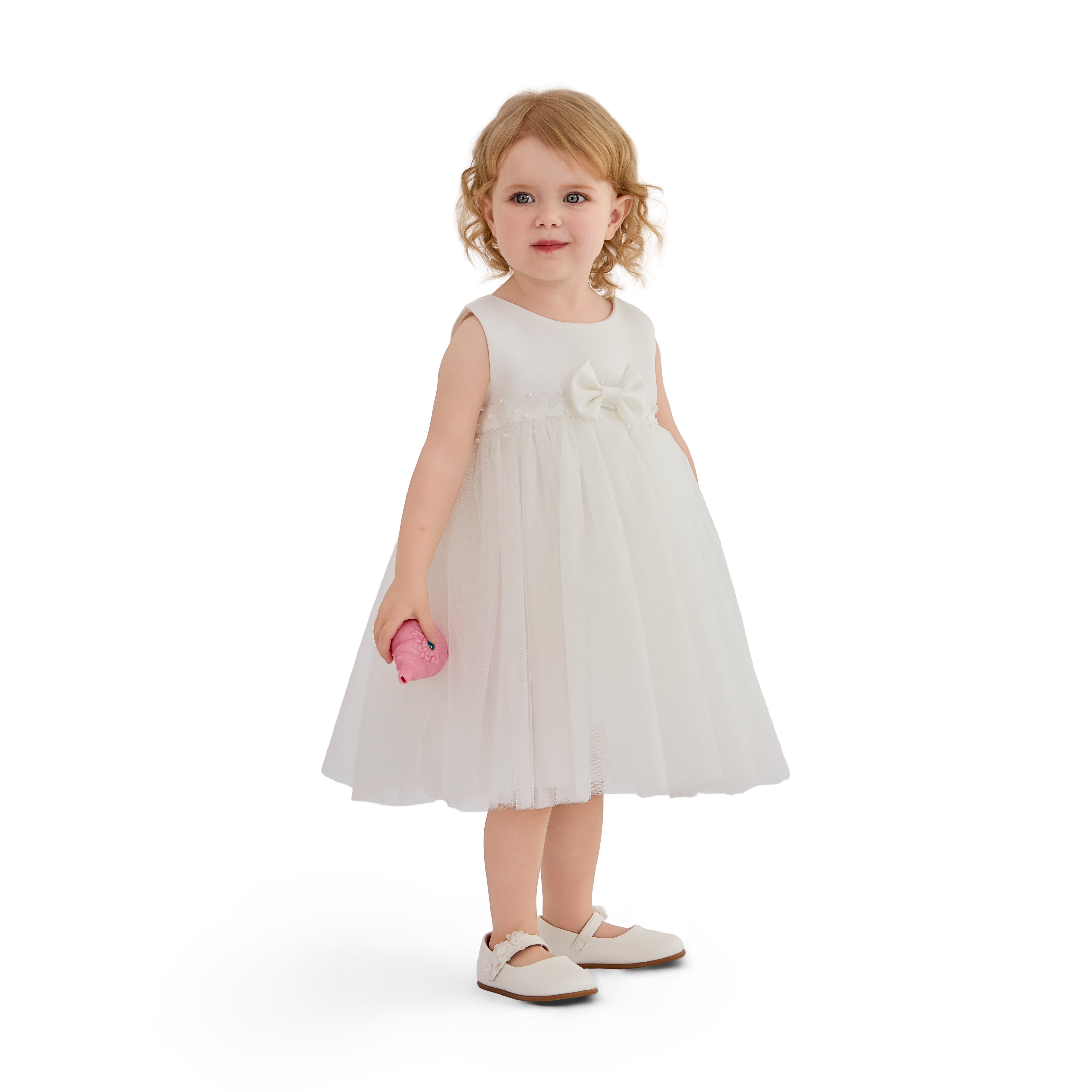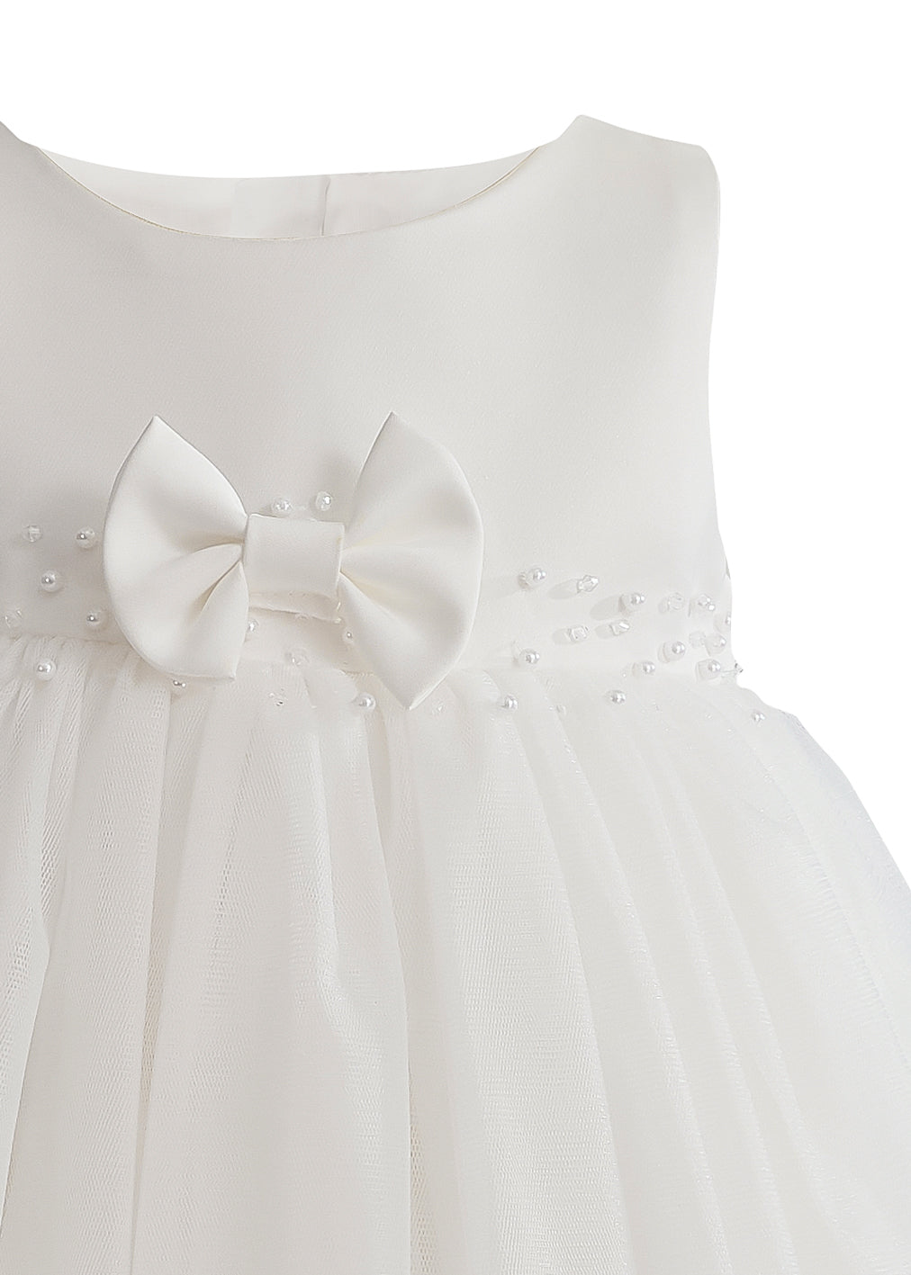 - Design details: Pearl‑trimmed waistband and small central bow for classic, picture‑ready charm