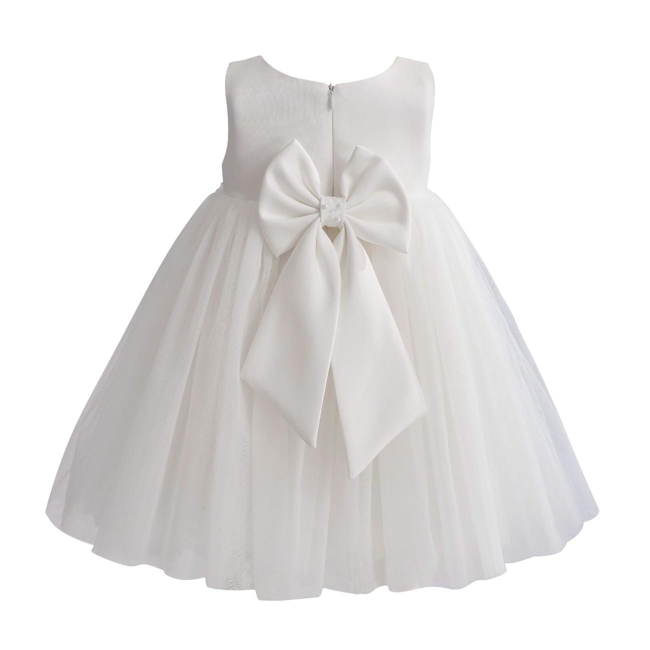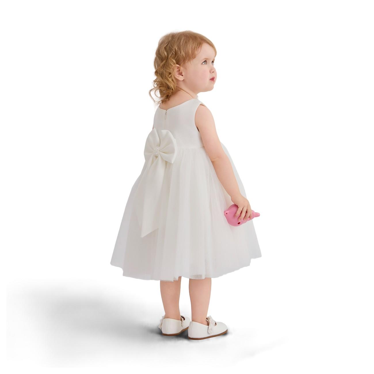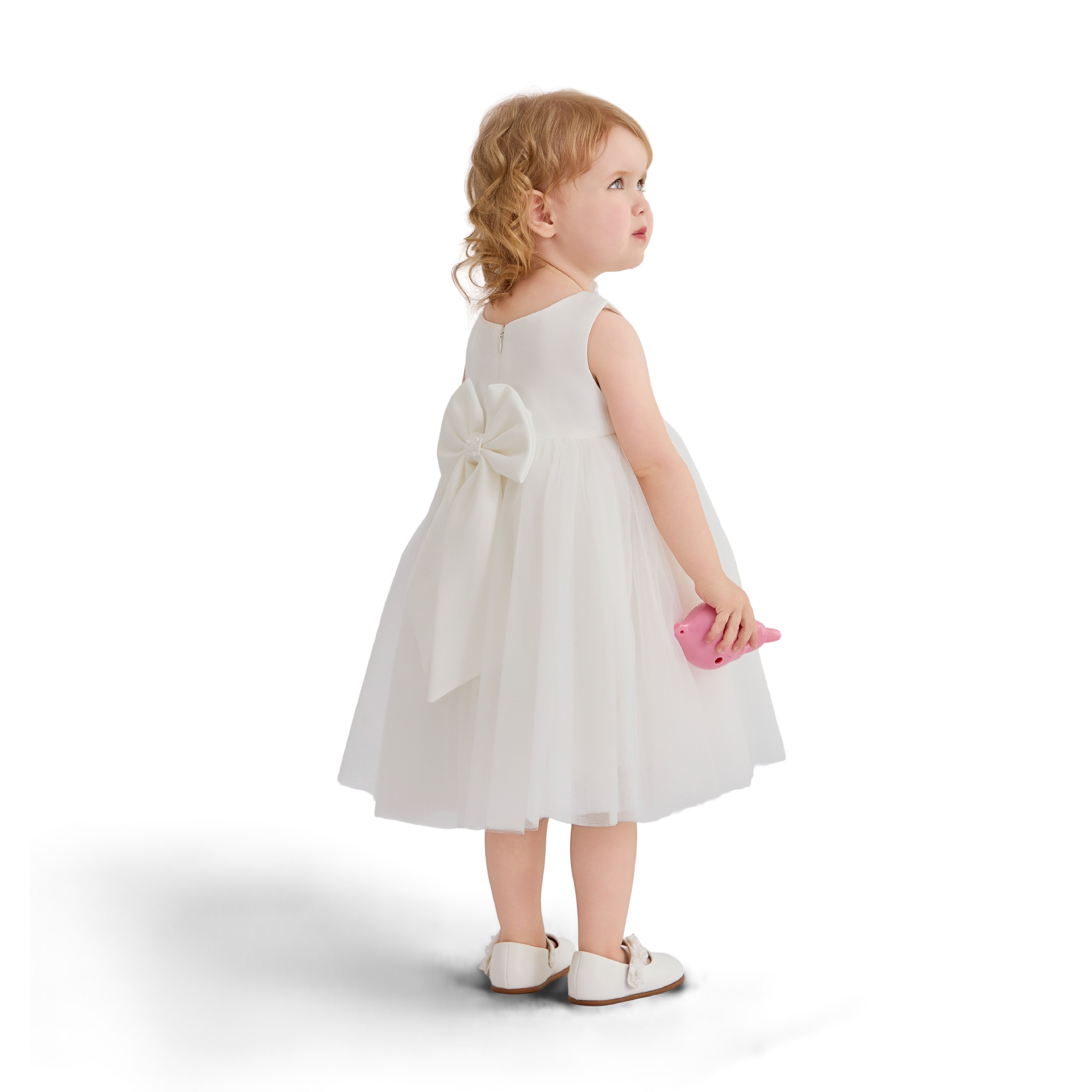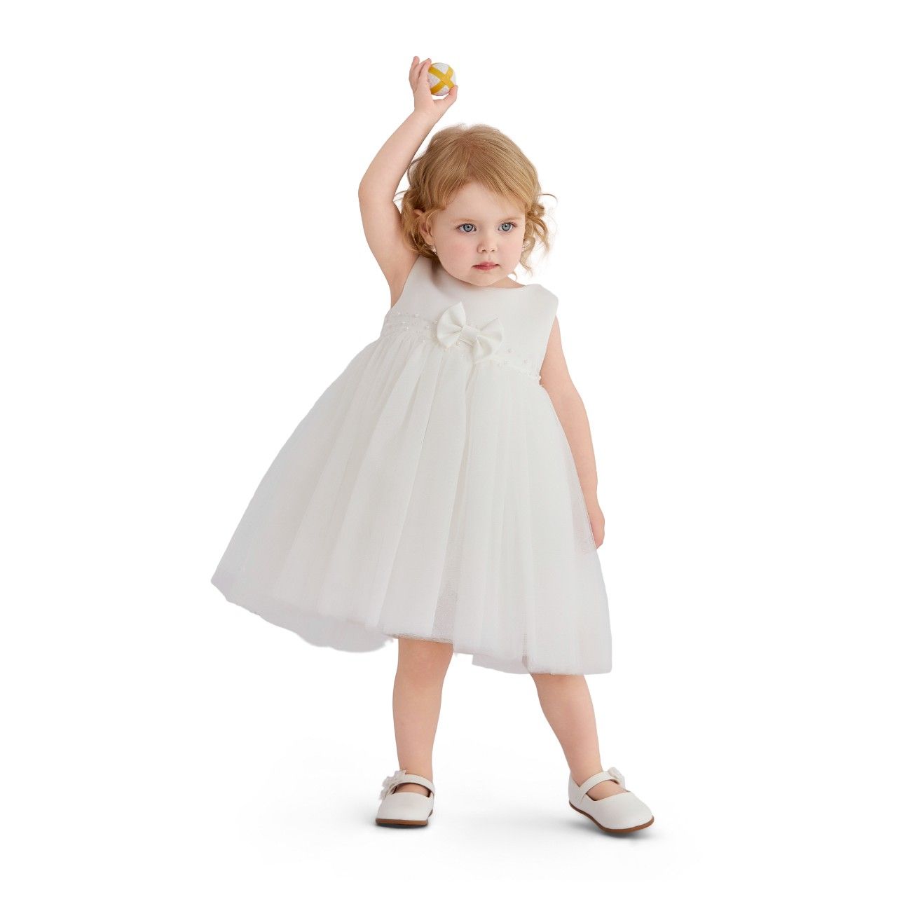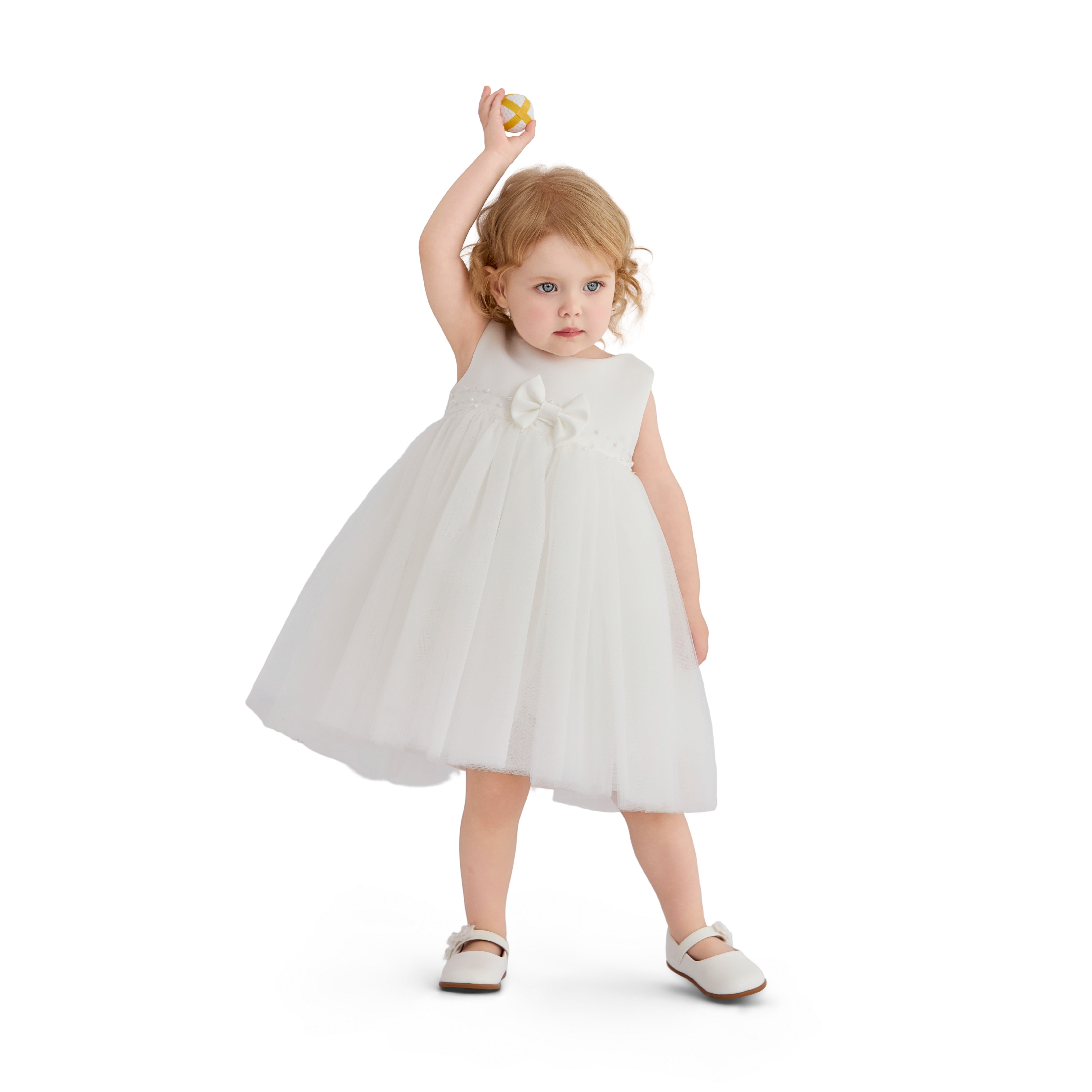 - Design details: Pearl‑trimmed waistband and small central bow for classic, picture‑ready charm