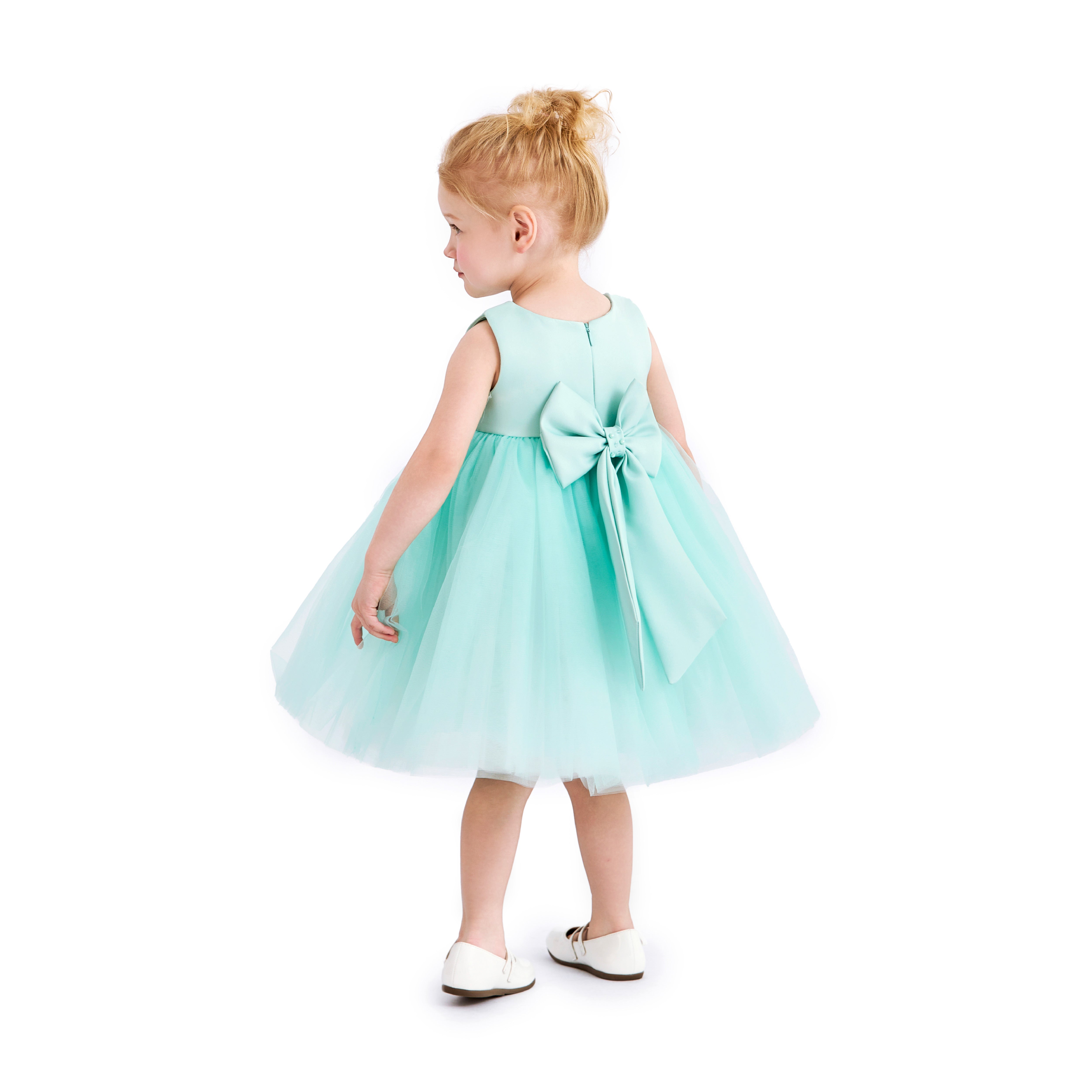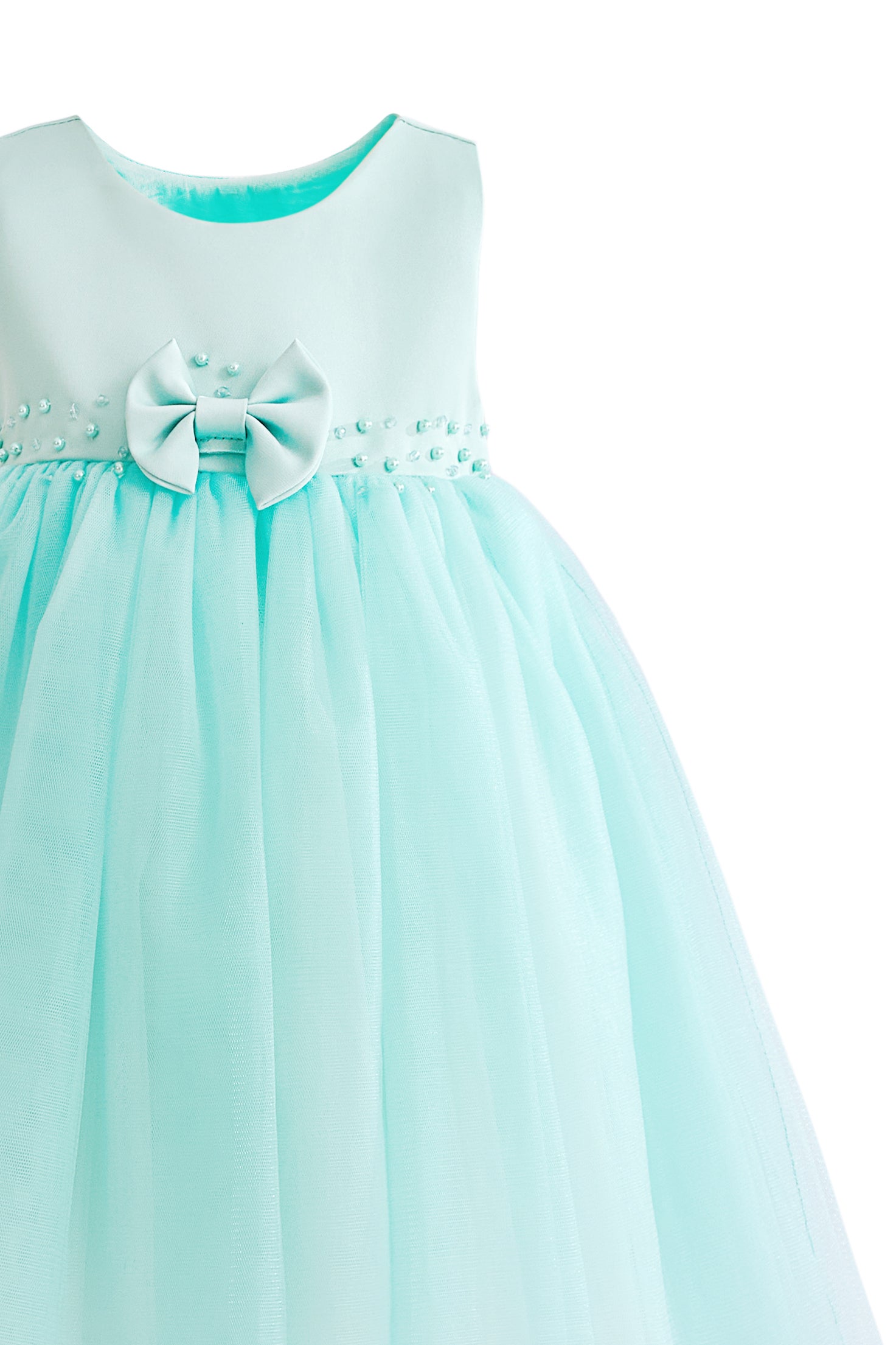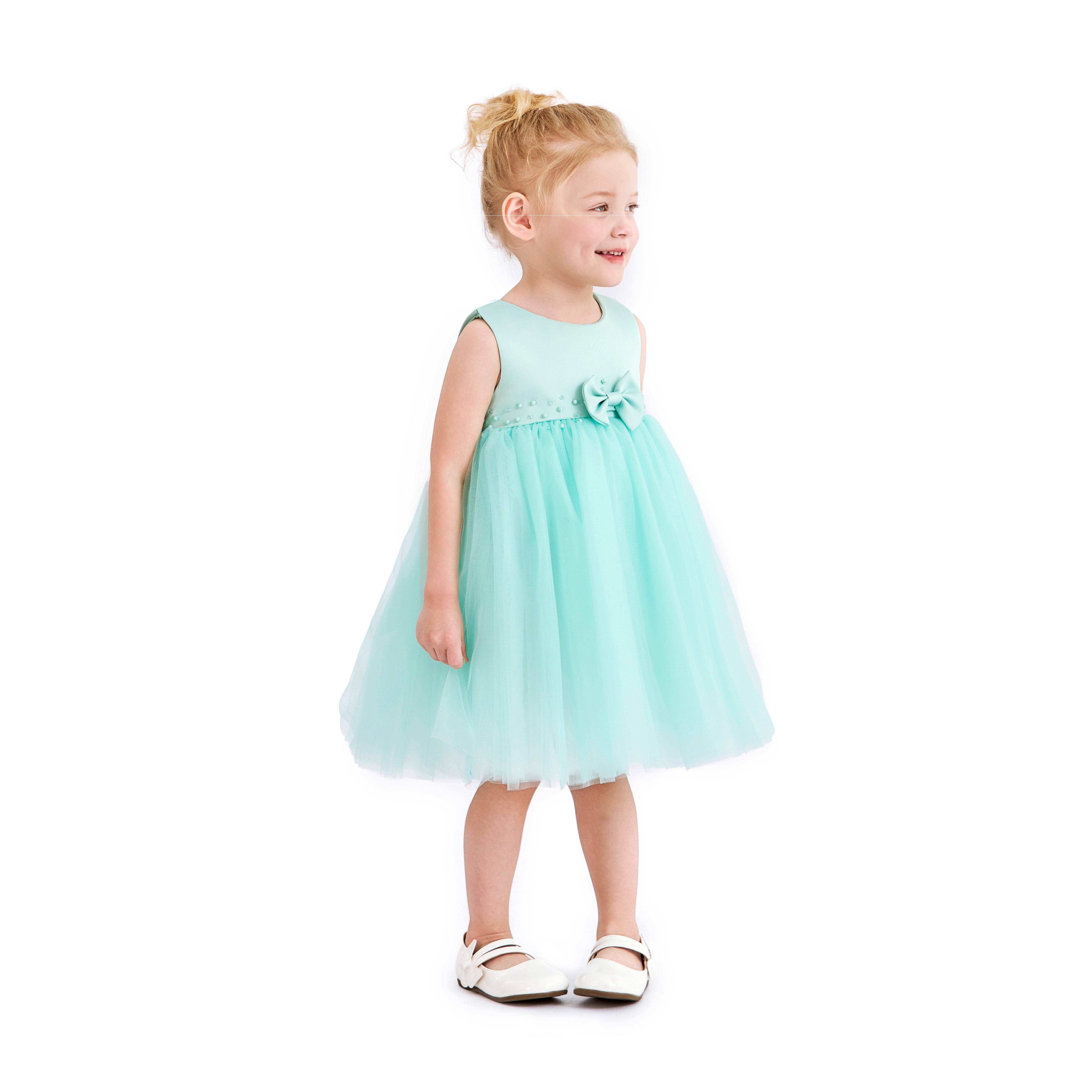 - Design details: Pearl‑trimmed waistband and small central bow for classic, picture‑ready charm