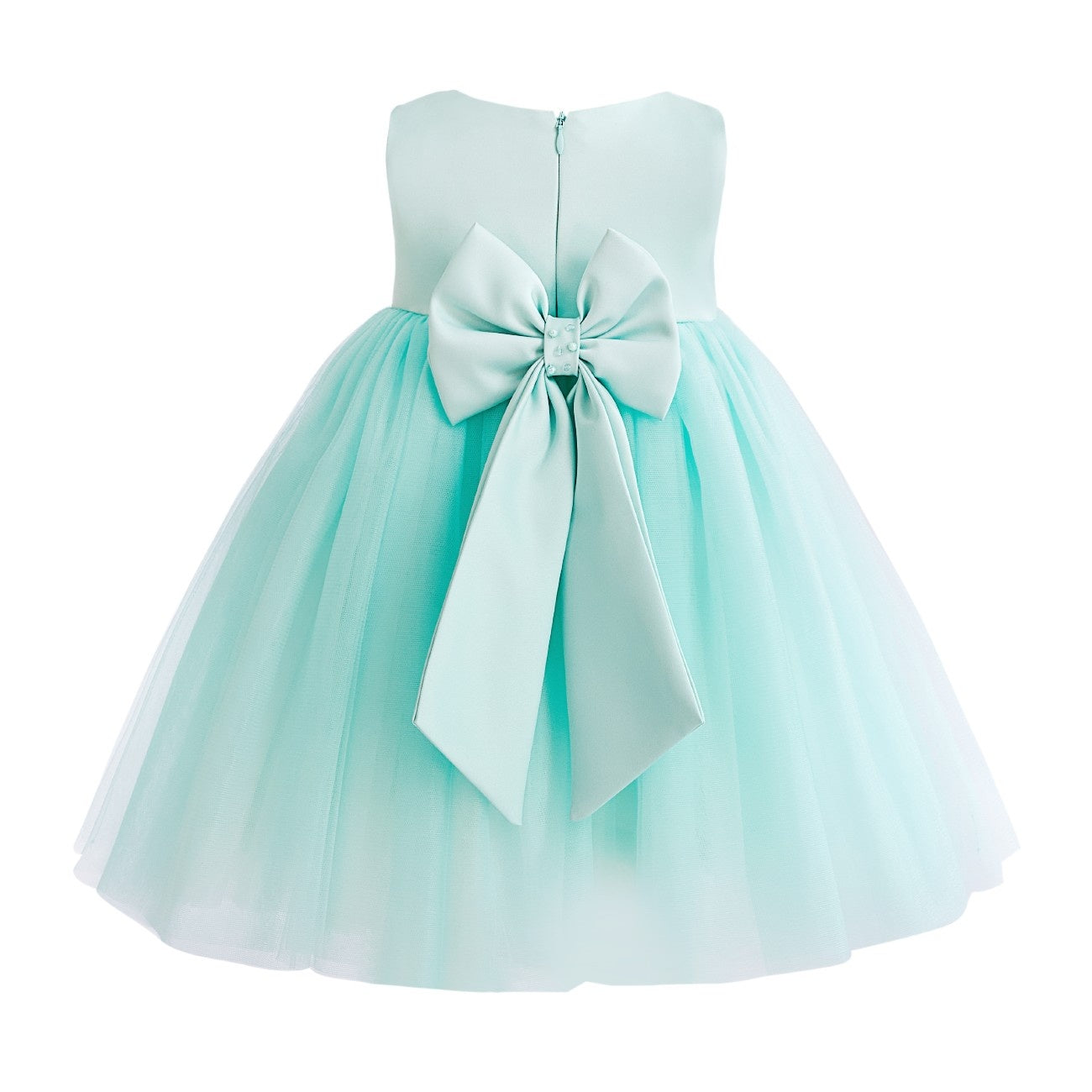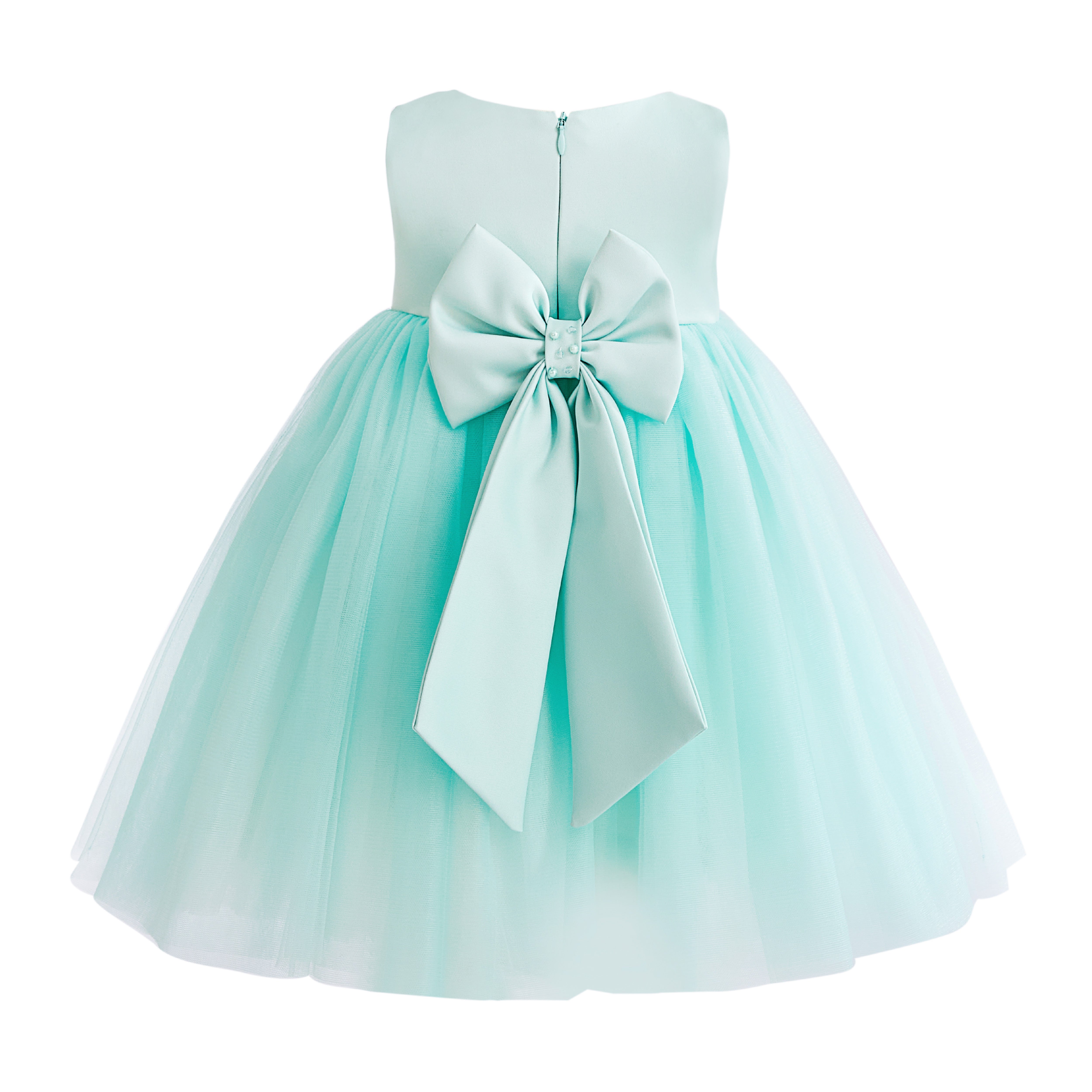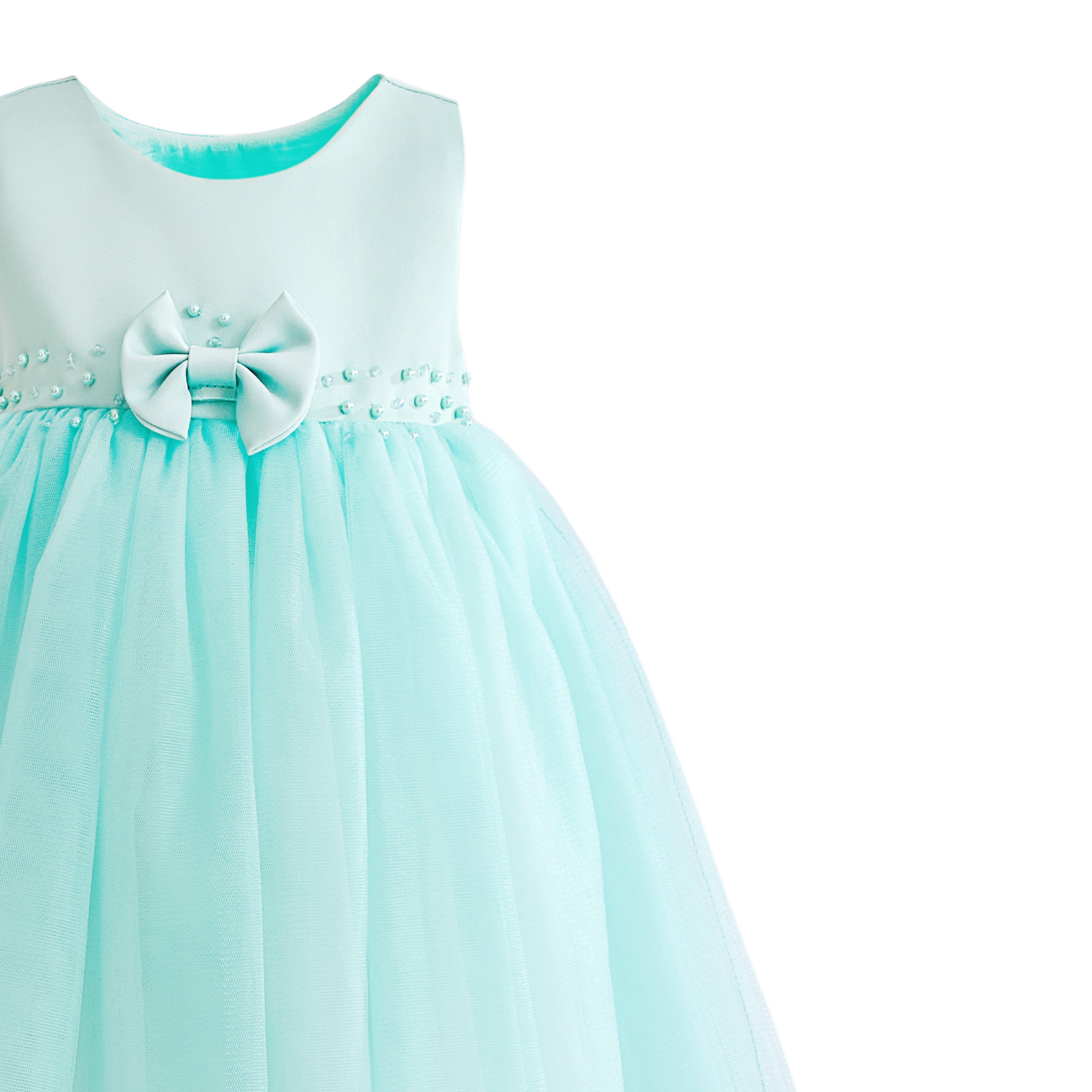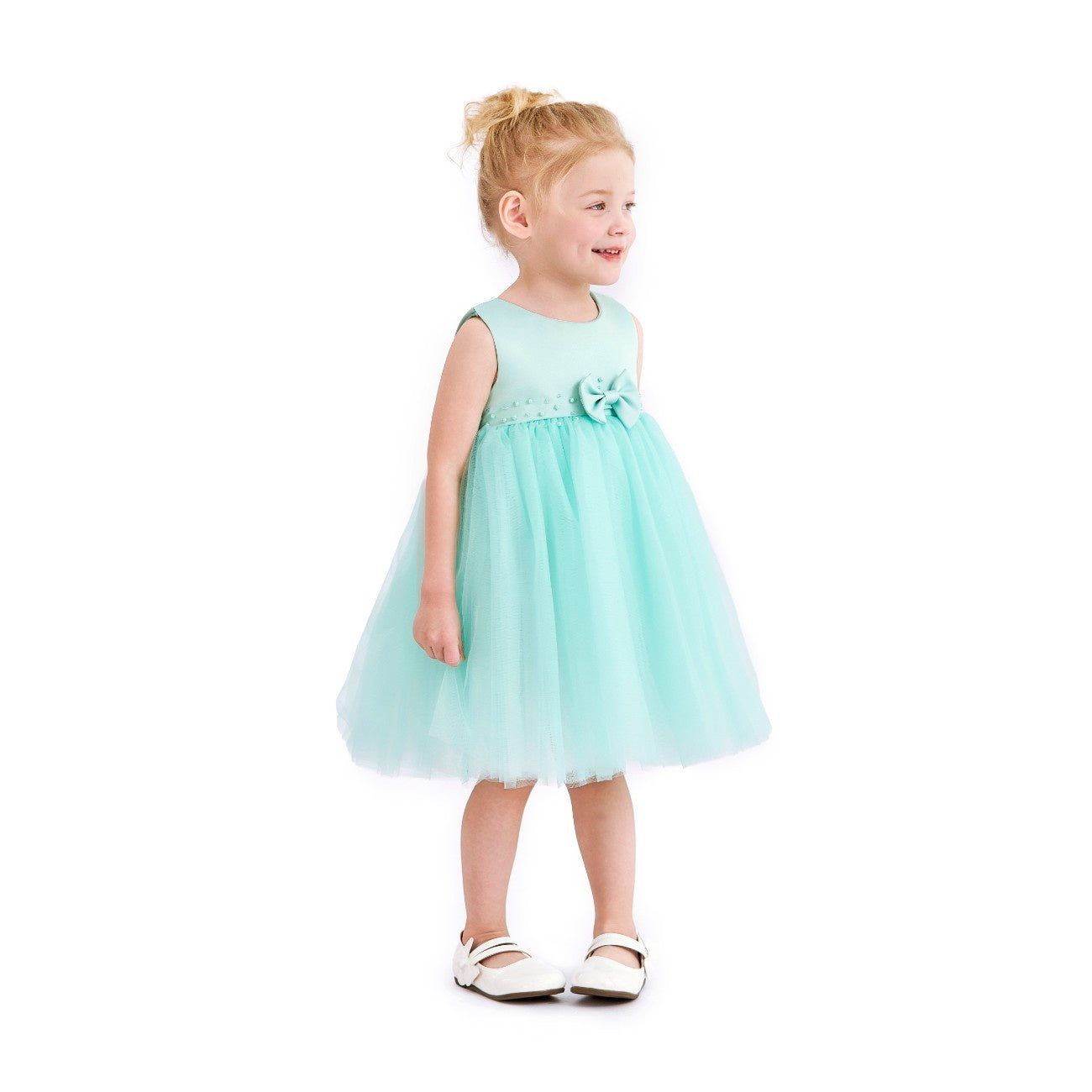 - Design details: Pearl‑trimmed waistband and small central bow for classic, picture‑ready charm