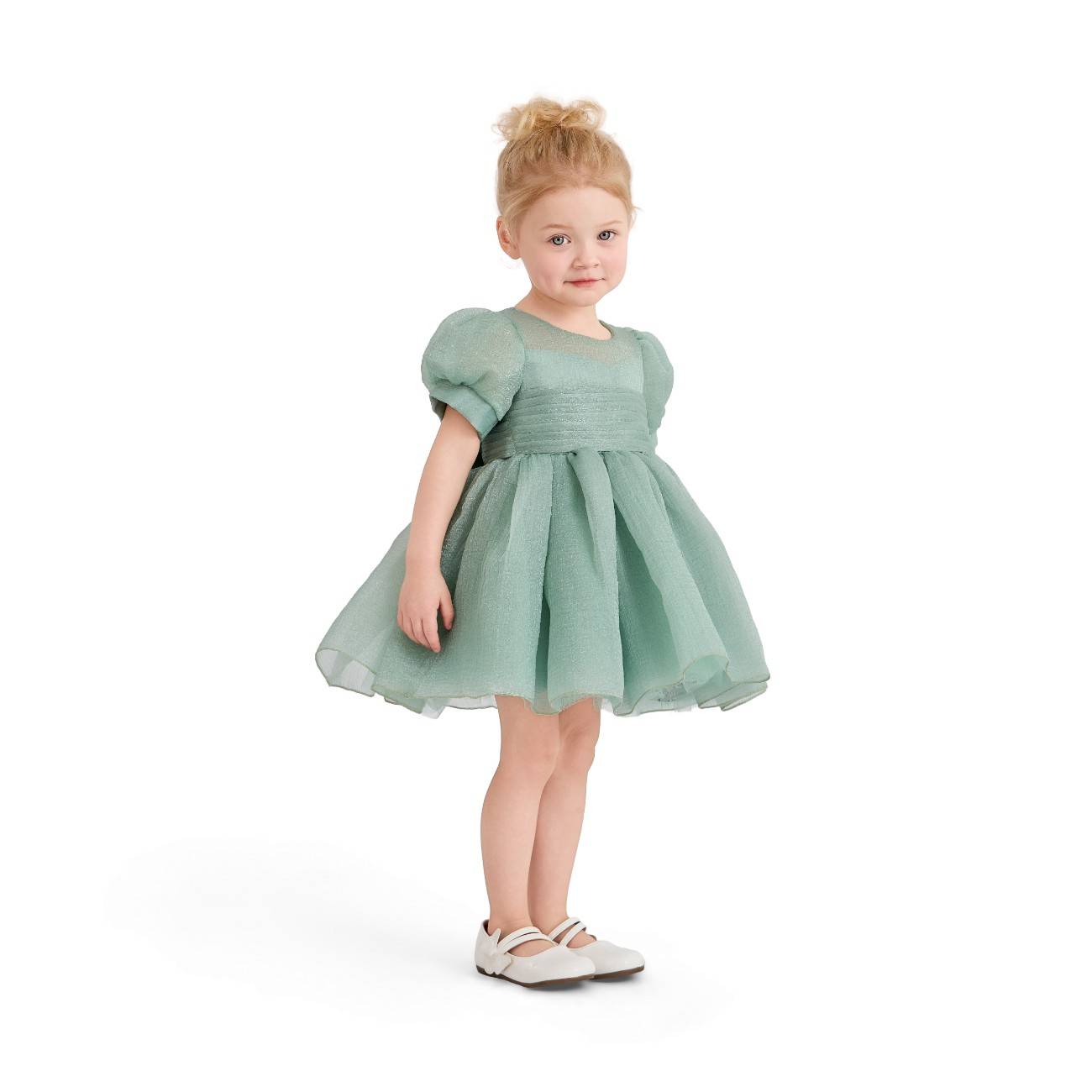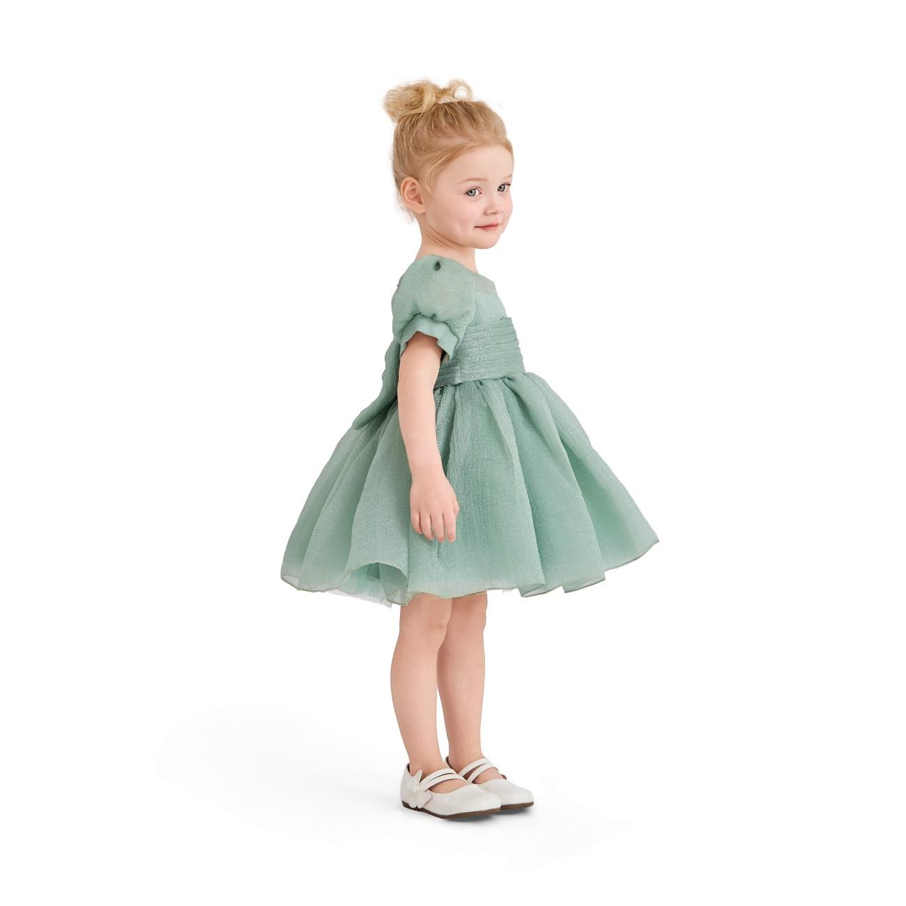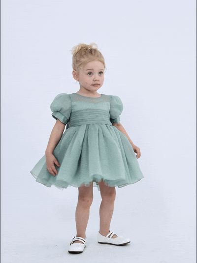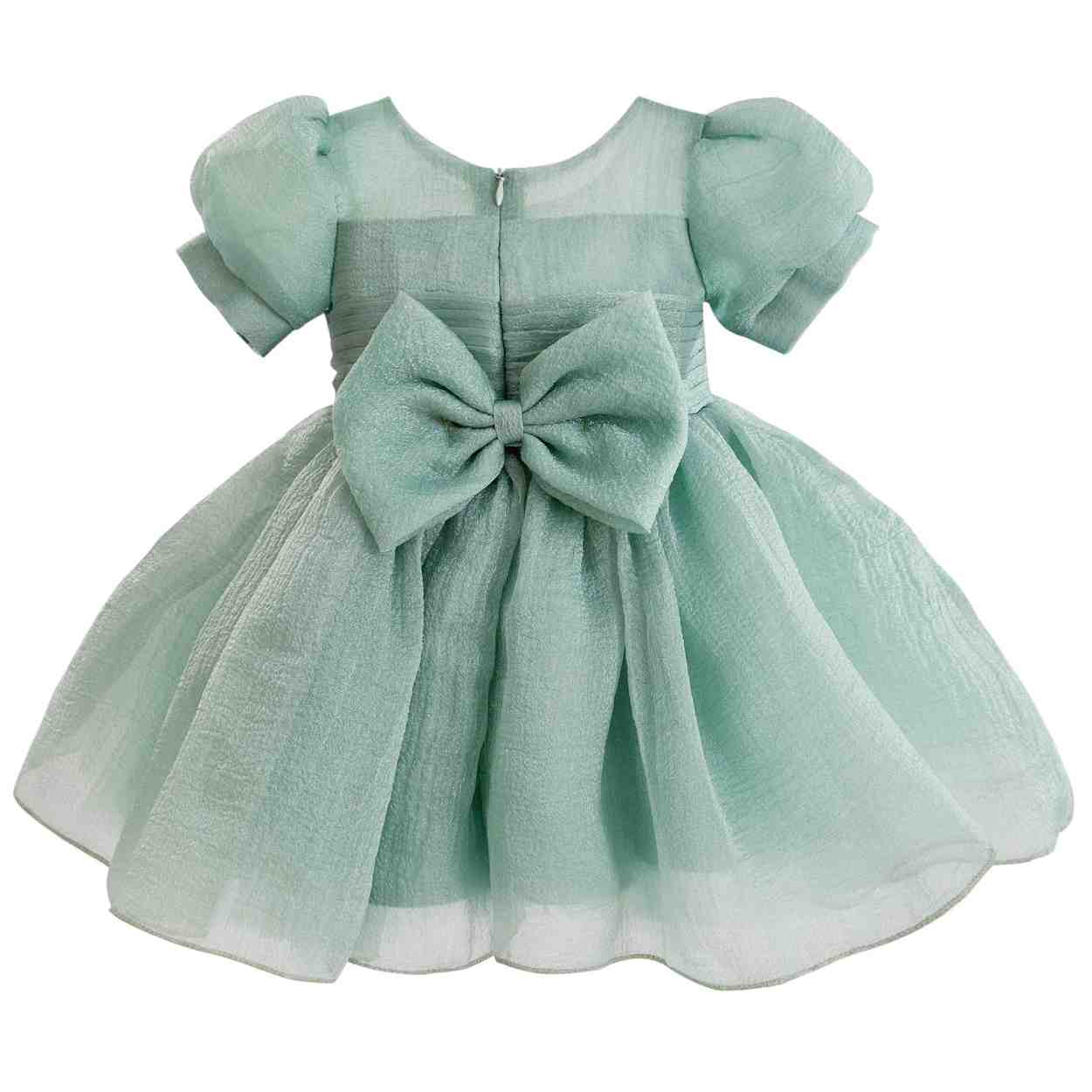 This elegant children’s dress features puffed short sleeves, a fitted bodice, and a layered flared skirt in semi-sheer fabric. At the back, a large satin bow creates a charming focal point, adding sophistication and playfulness to the design. Perfect for festive and formal occasions, it balances delicate detailing with a classic silhouette.