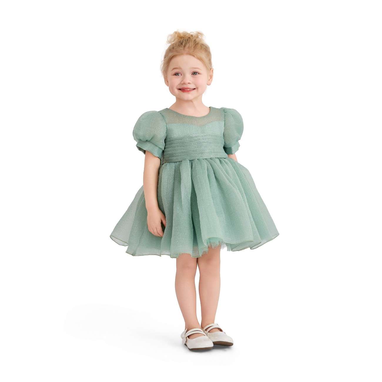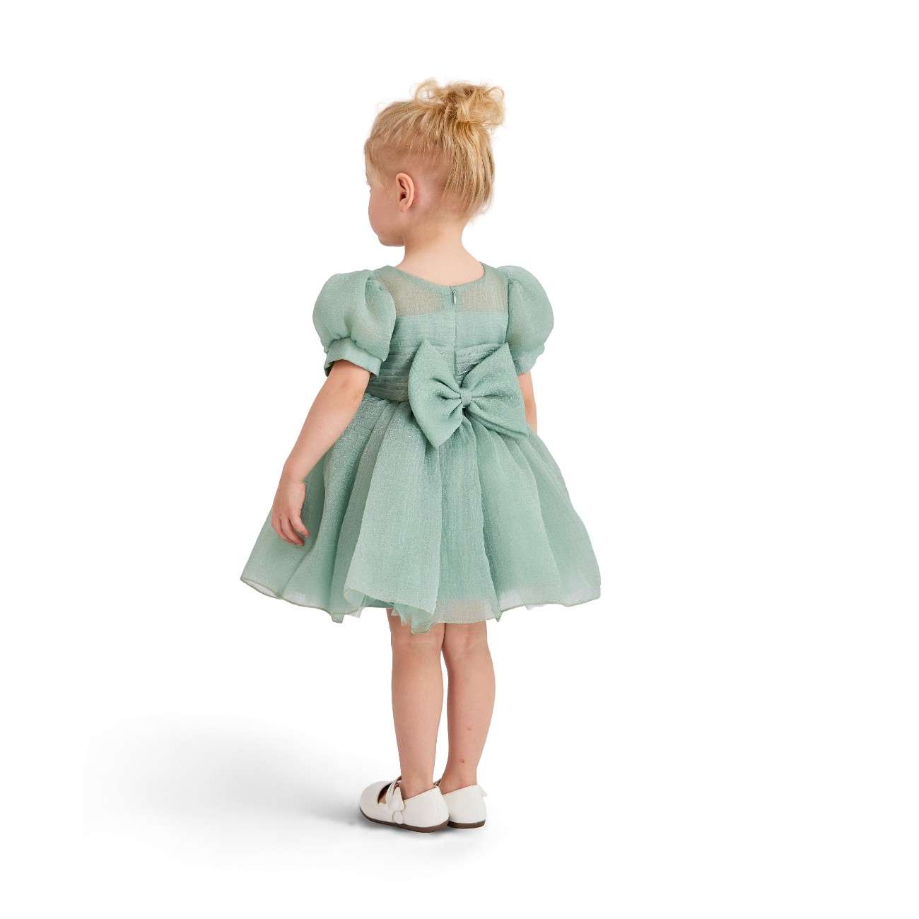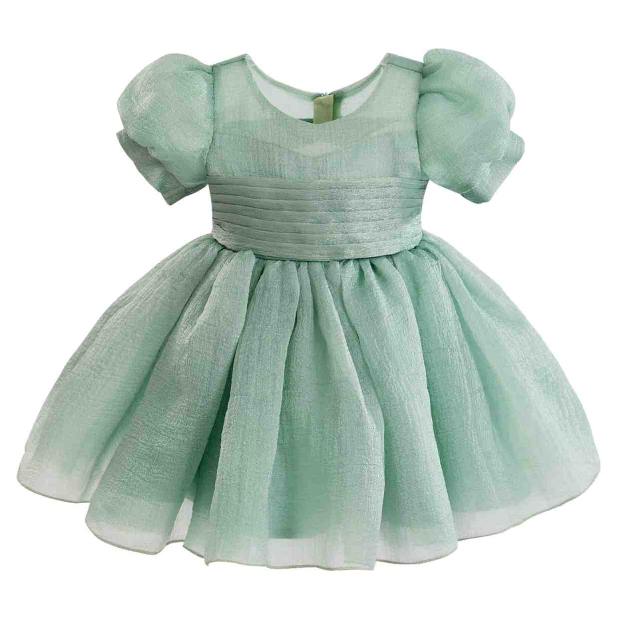 This elegant children’s dress features puffed short sleeves, a fitted bodice, and a layered flared skirt in semi-sheer fabric. At the back, a large satin bow creates a charming focal point, adding sophistication and playfulness to the design. Perfect for festive and formal occasions, it balances delicate detailing with a classic silhouette.