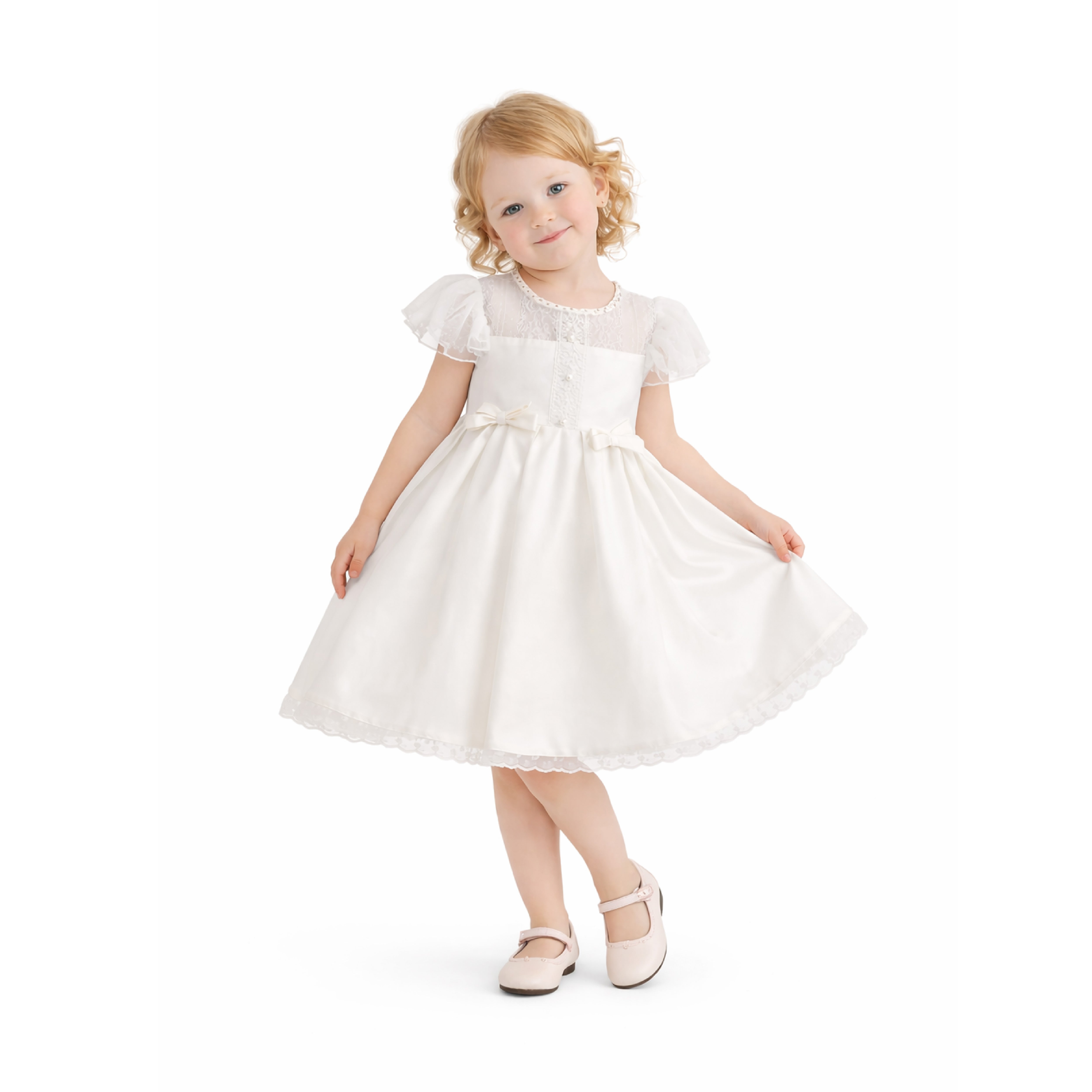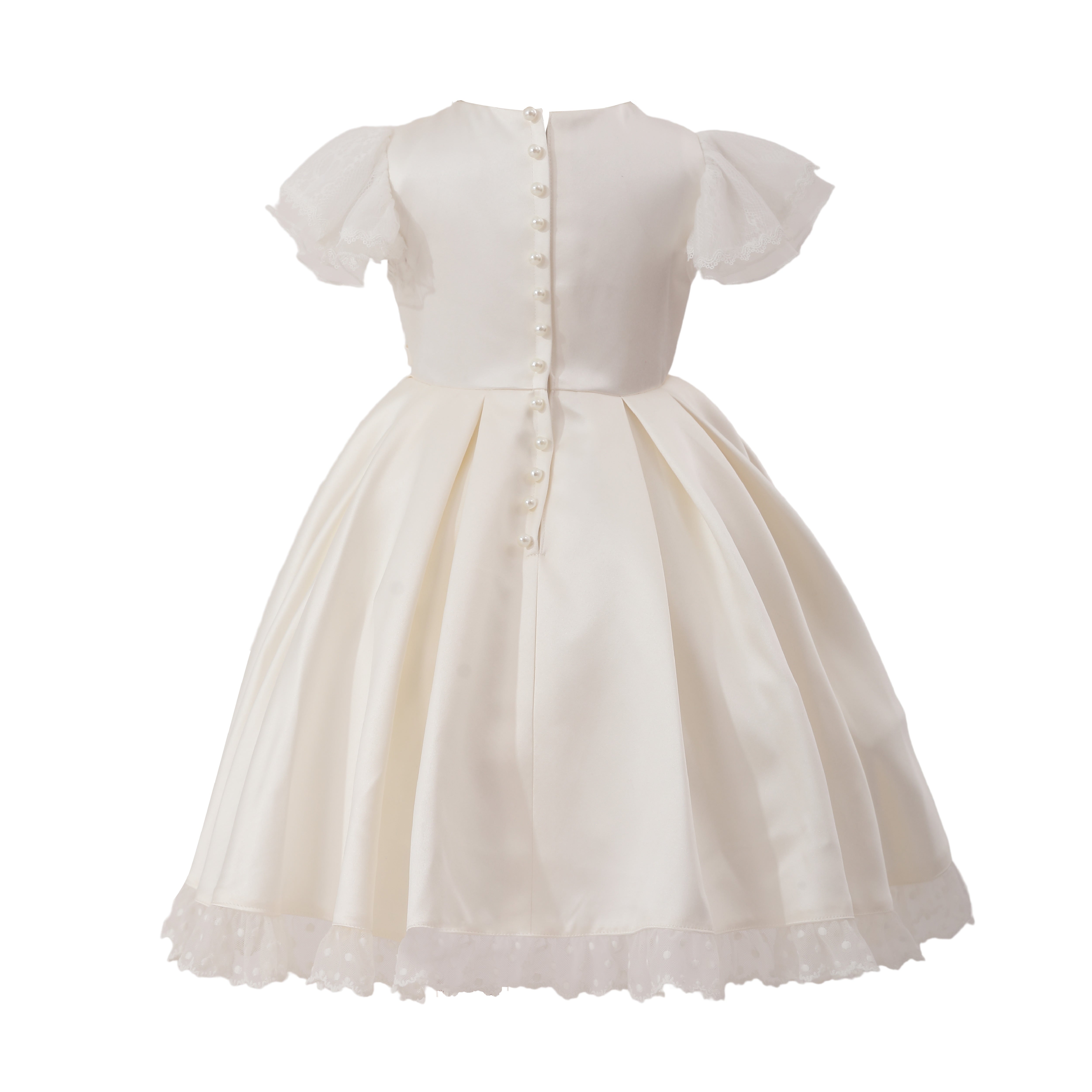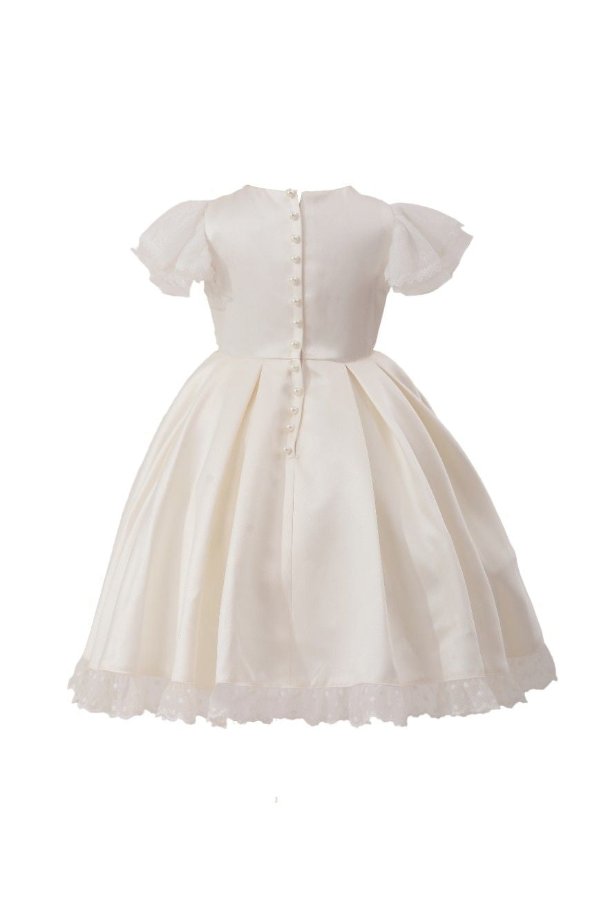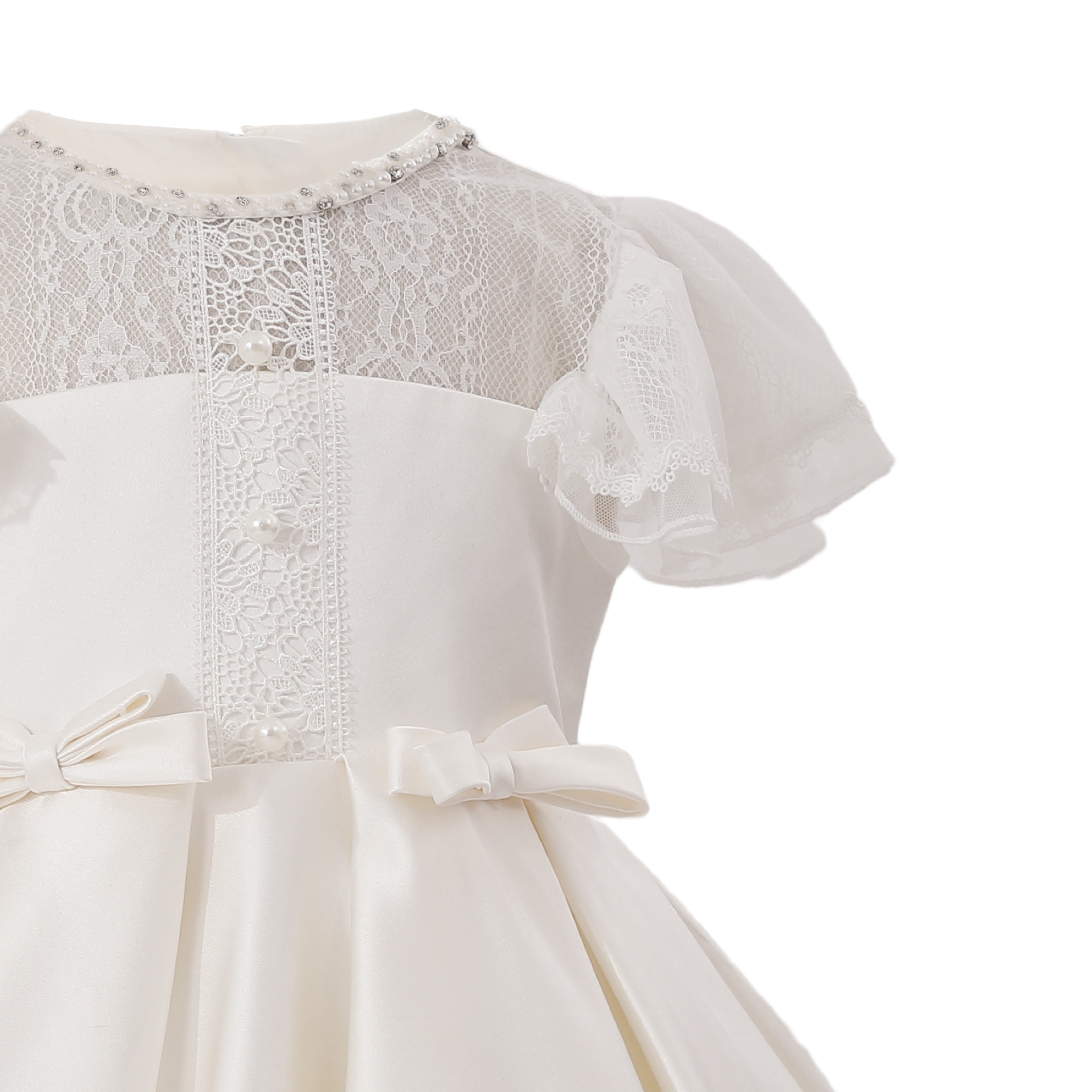 A timeless choice for special occasions, this dress blends delicate lace with satin elegance. The puff sleeves and lace-trimmed hem add a touch of vintage charm, while dainty bows at the waist complete the look with sweet sophistication.