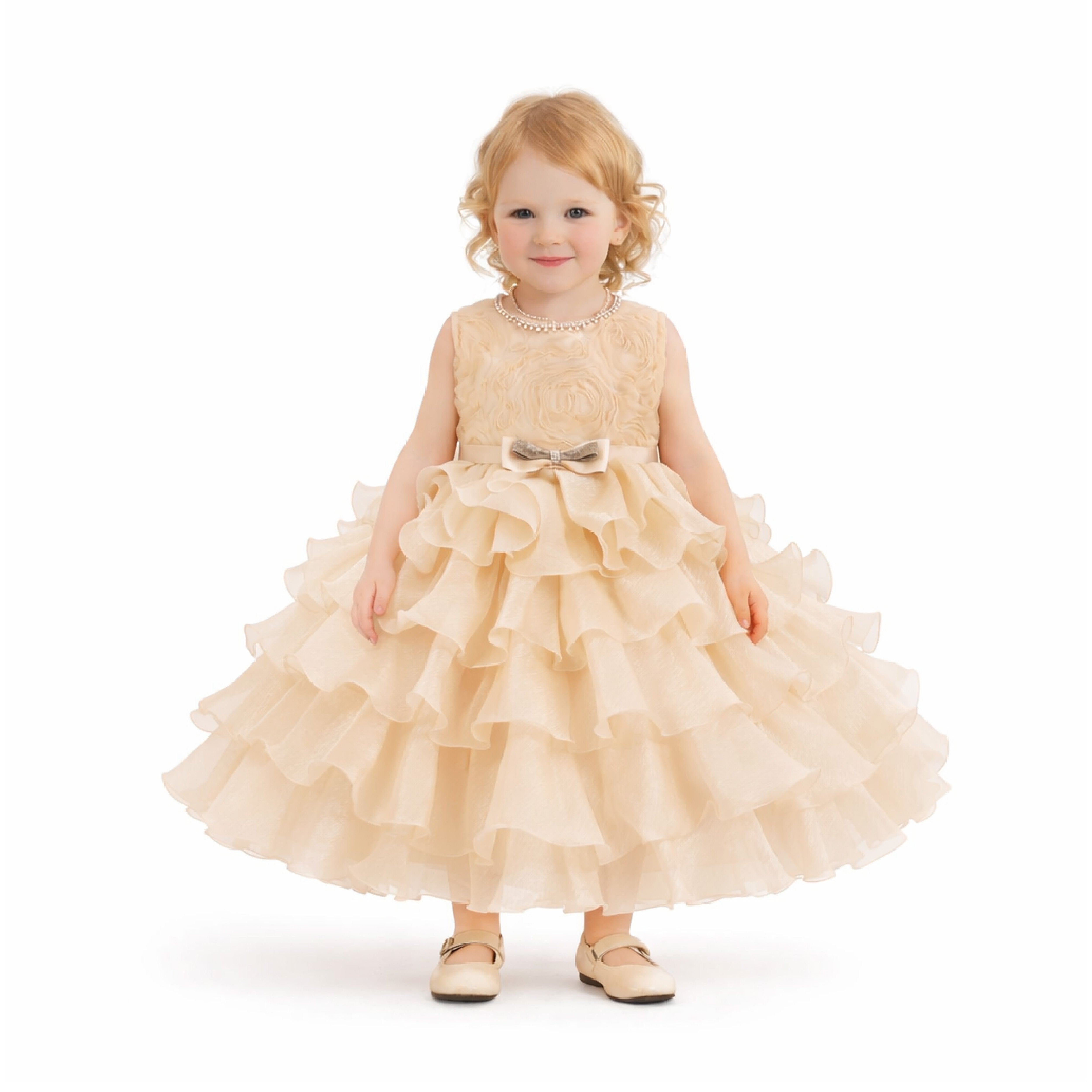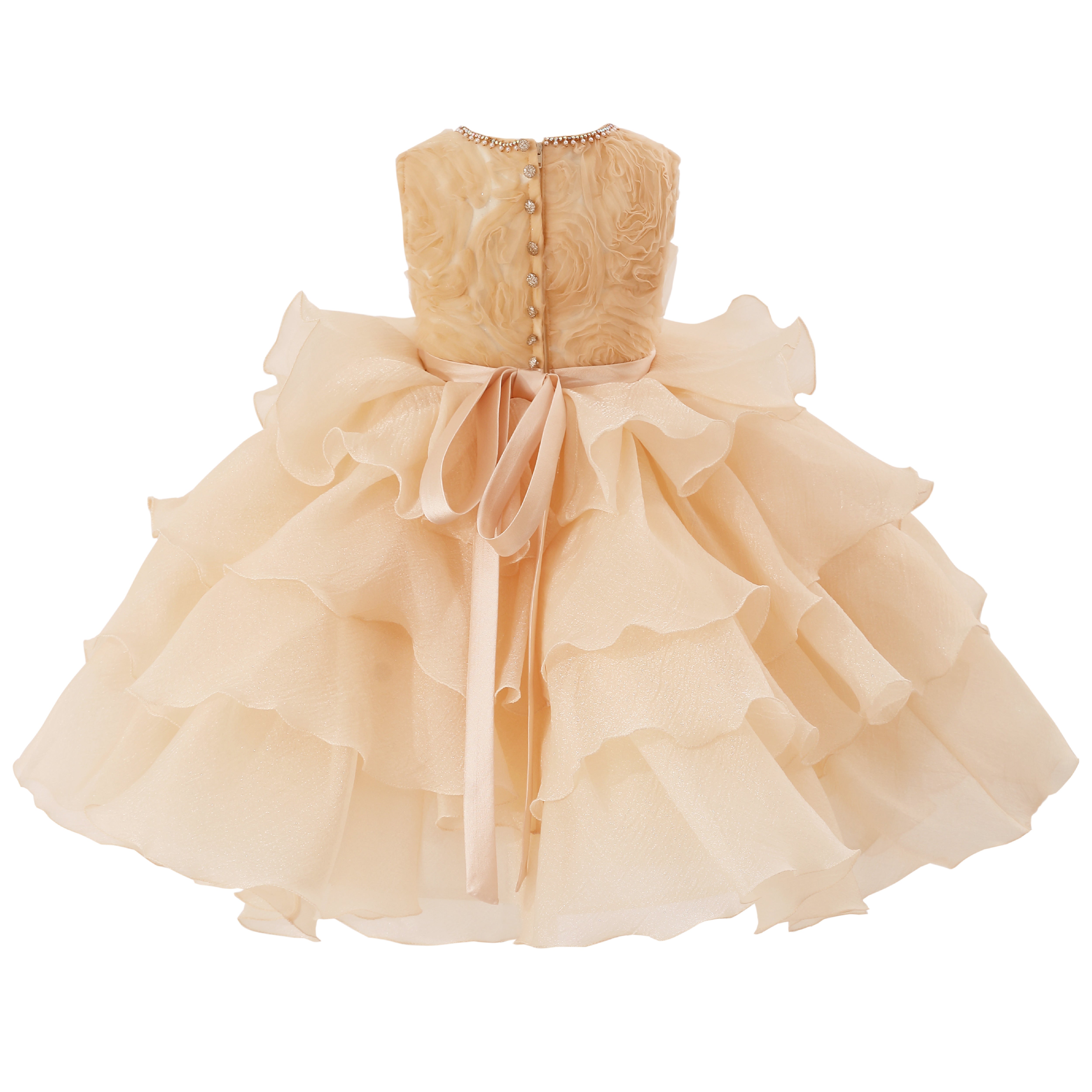 A sophisticated design with textured floral details and a dramatic layered skirt, perfect for weddings, parties, or pageants. The elegant embellishments and voluminous silhouette make it a standout choice for special celebrations.