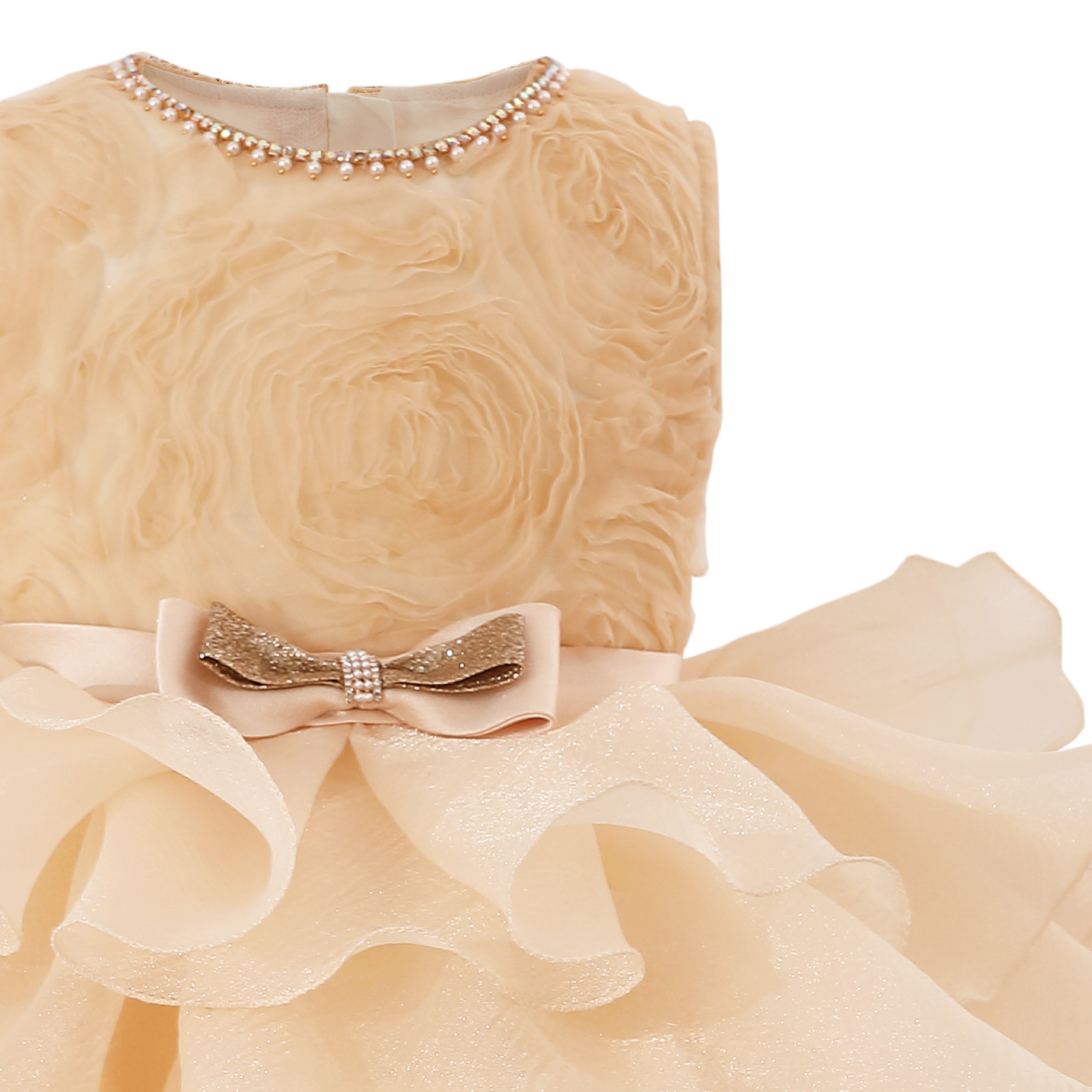 - Sleeveless floral bodice with delicate neckline embellishment and bow accent