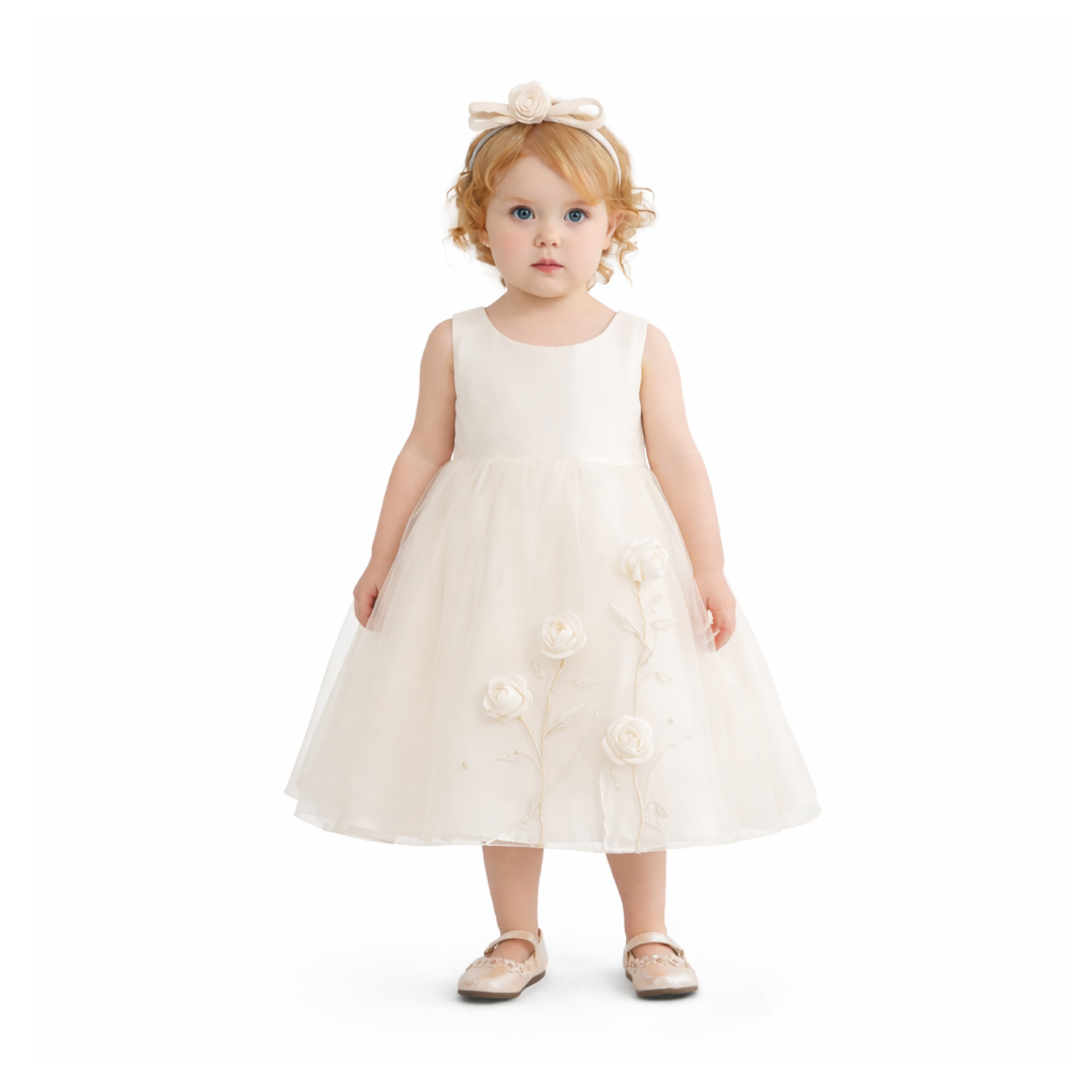 A graceful occasion piece designed with delicate detailing and soft elegance, perfect for weddings, christenings, or formal celebrations. The floral embellishments and sheer overlays add a refined touch to its timeless silhouette.