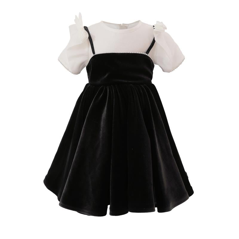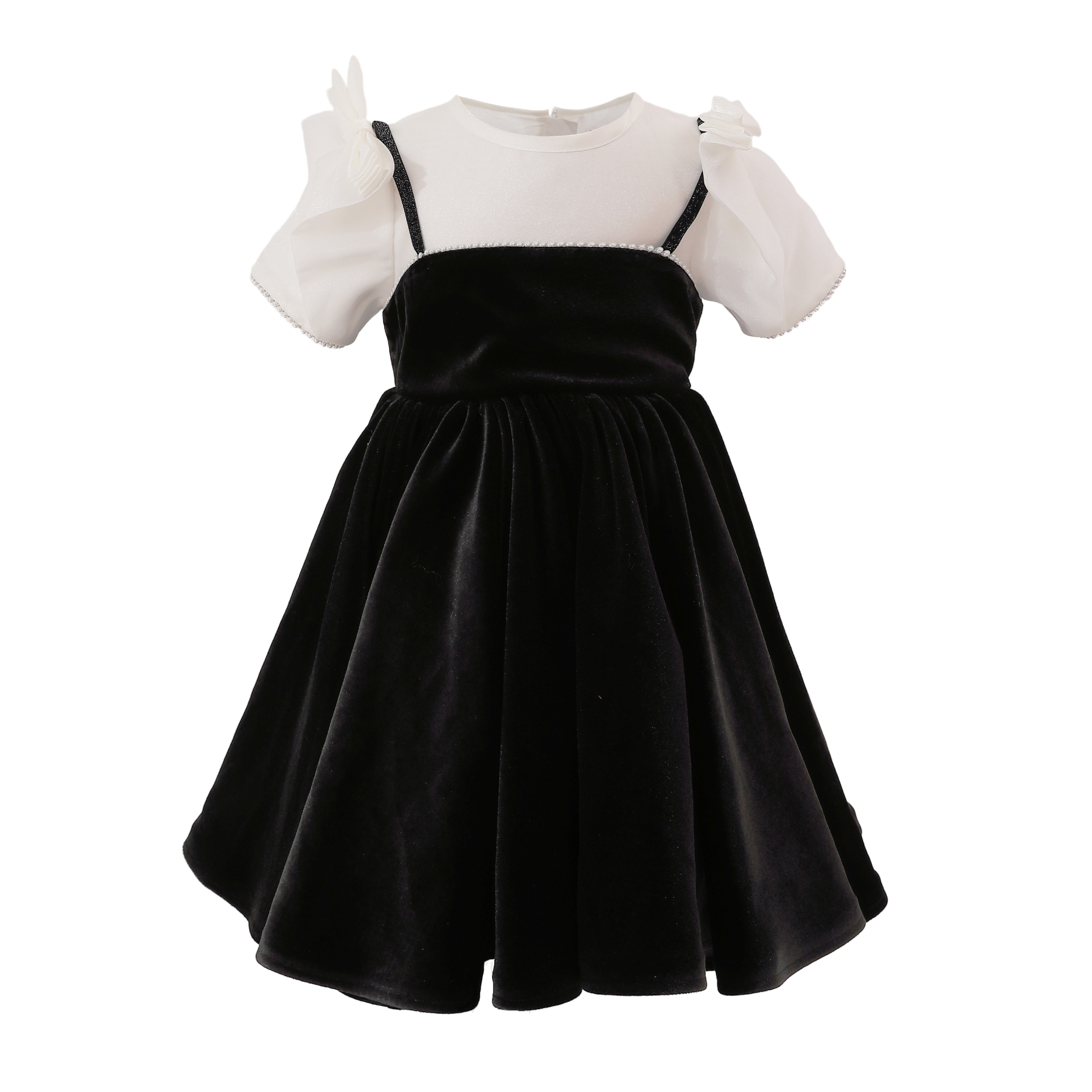 A refined two-tone piece that pairs soft textures with elegant detailing, perfect for formal occasions or stylish gatherings. The flared skirt and shoulder bows bring charm and sophistication to the look.