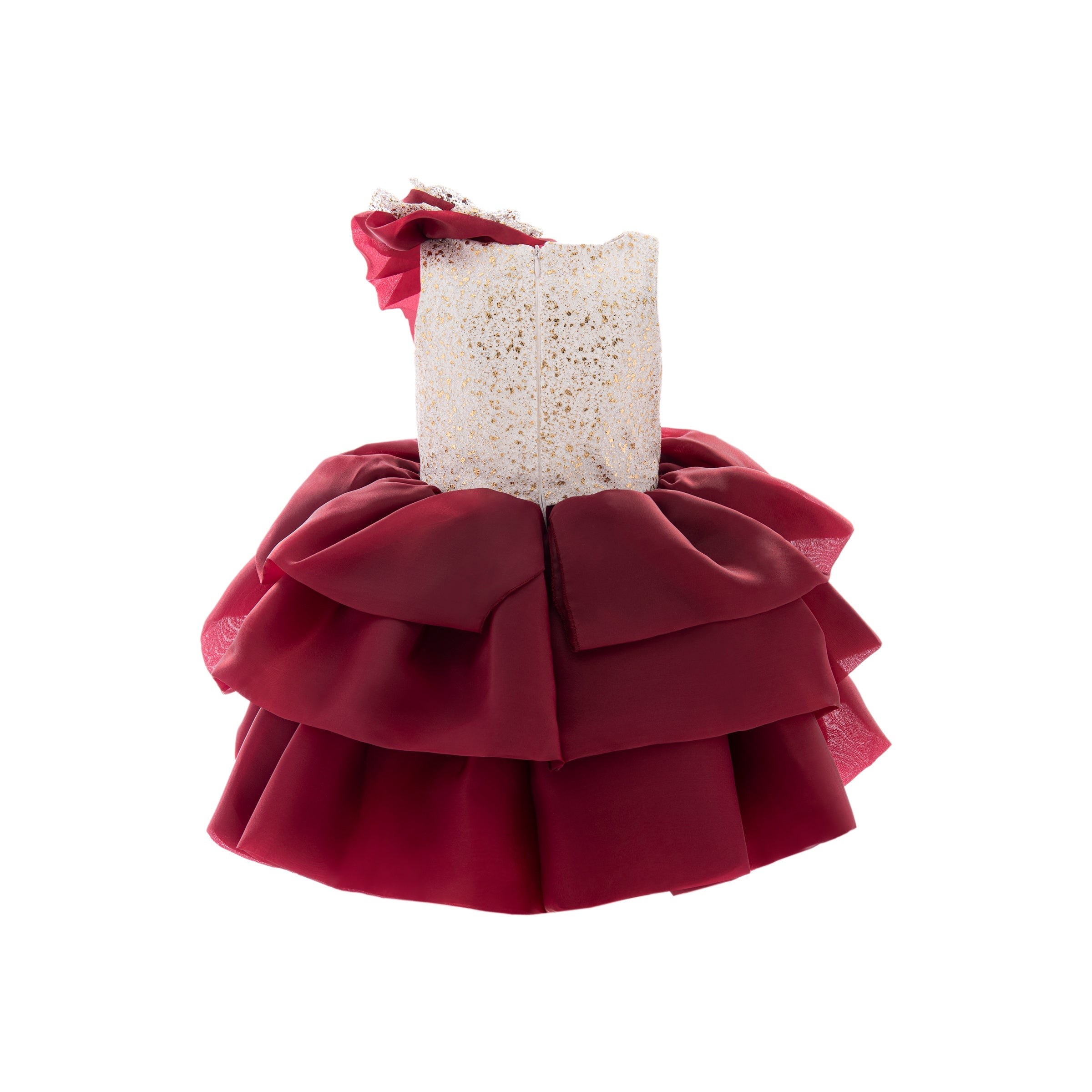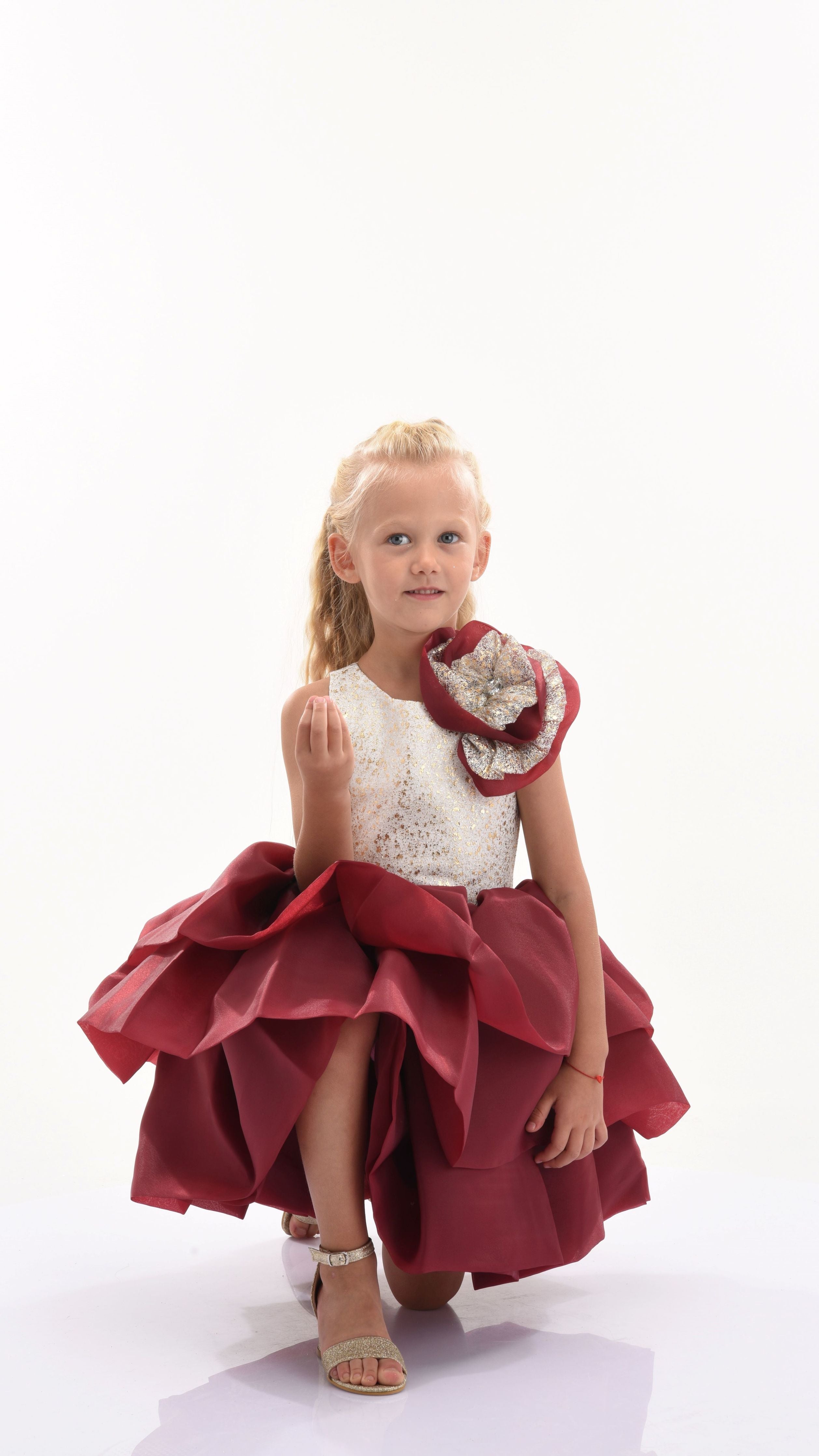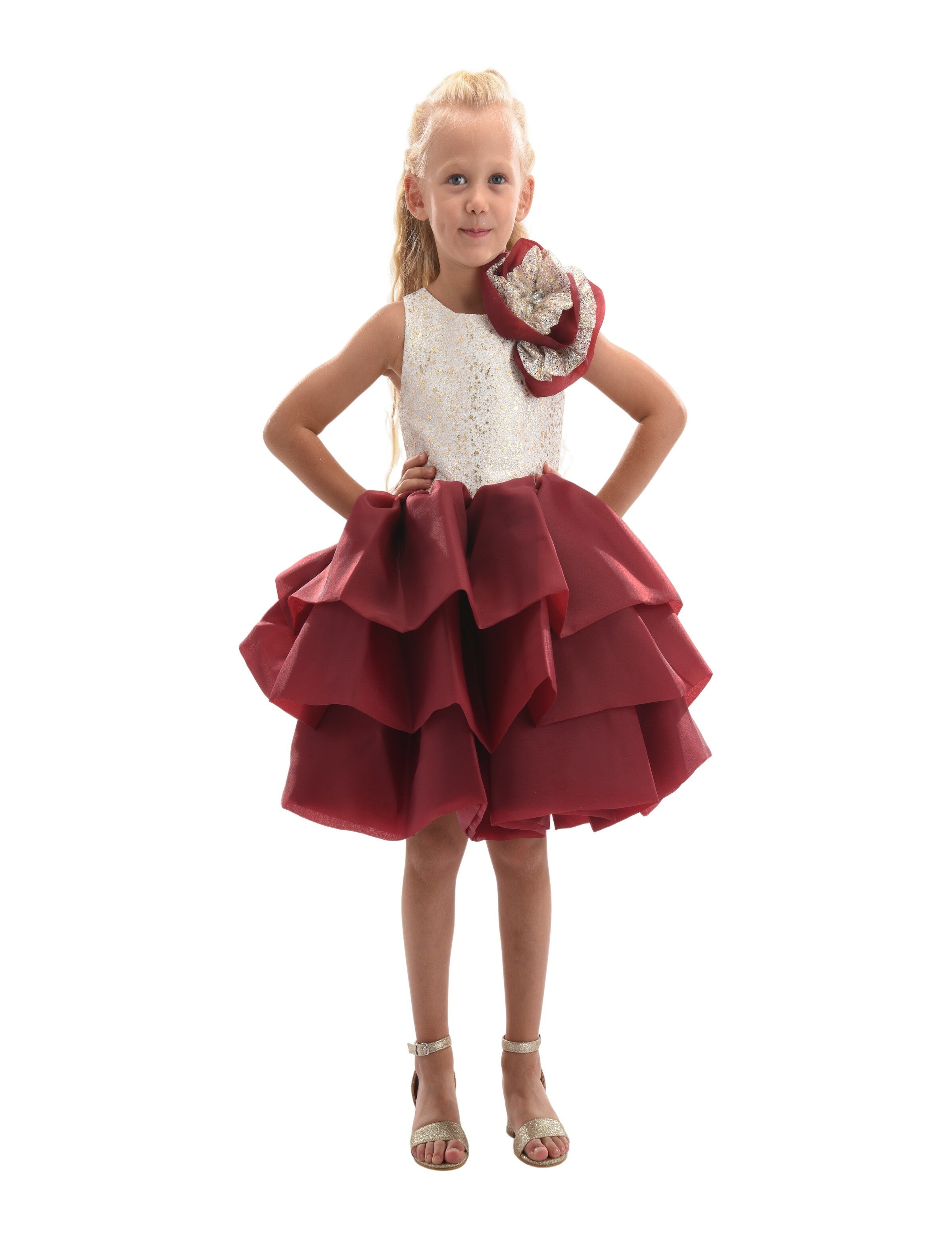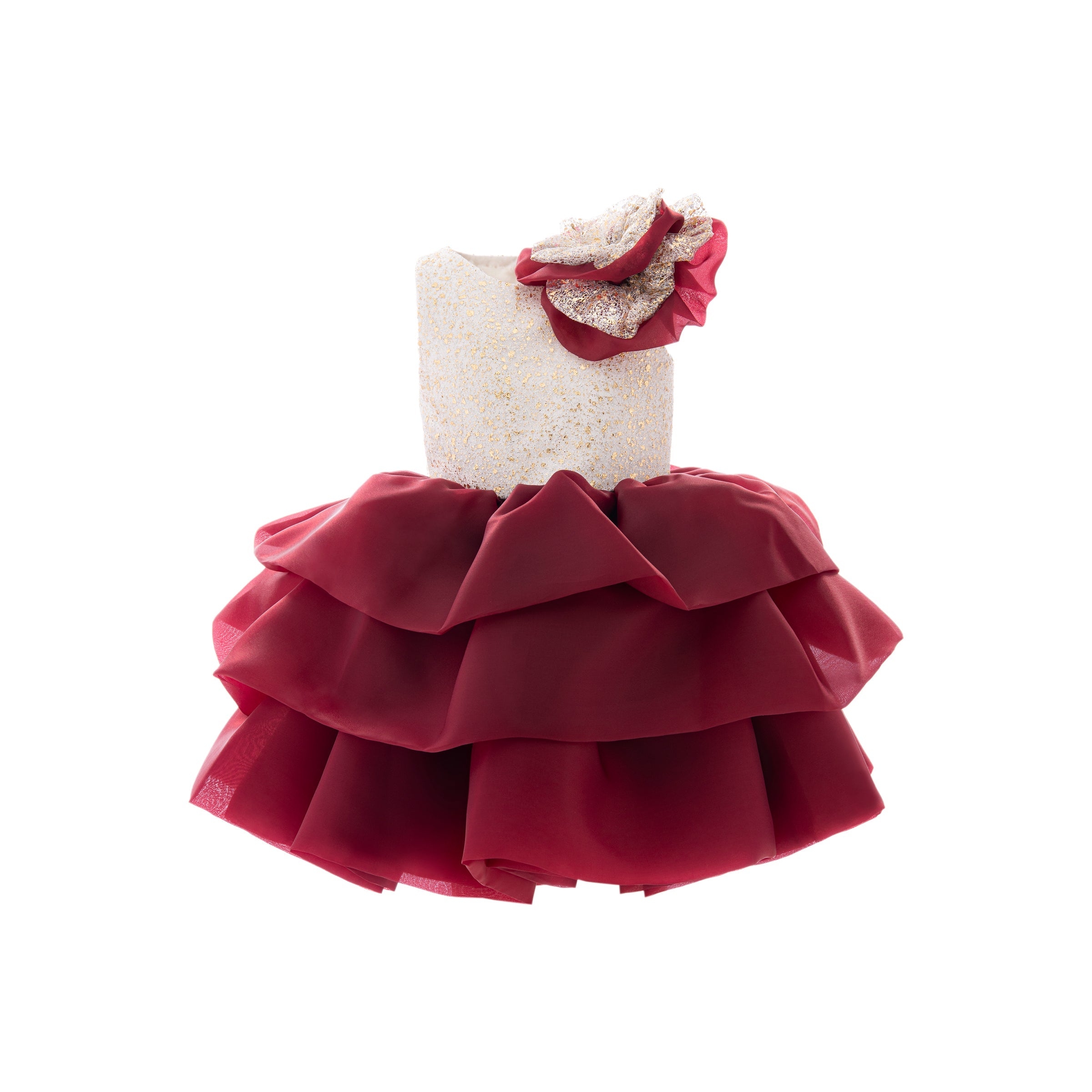 The Burgundy Ladera Tiered Ruffle Dress for kid girls from Tulleen is a stunning piece perfect for any special occasion. This dress features a sleeveless cream embroidered gold bodice that adds a touch of elegance and sophistication. The cream and burgundy ruffle applique on the left shoulder provides a unique and charming detail.