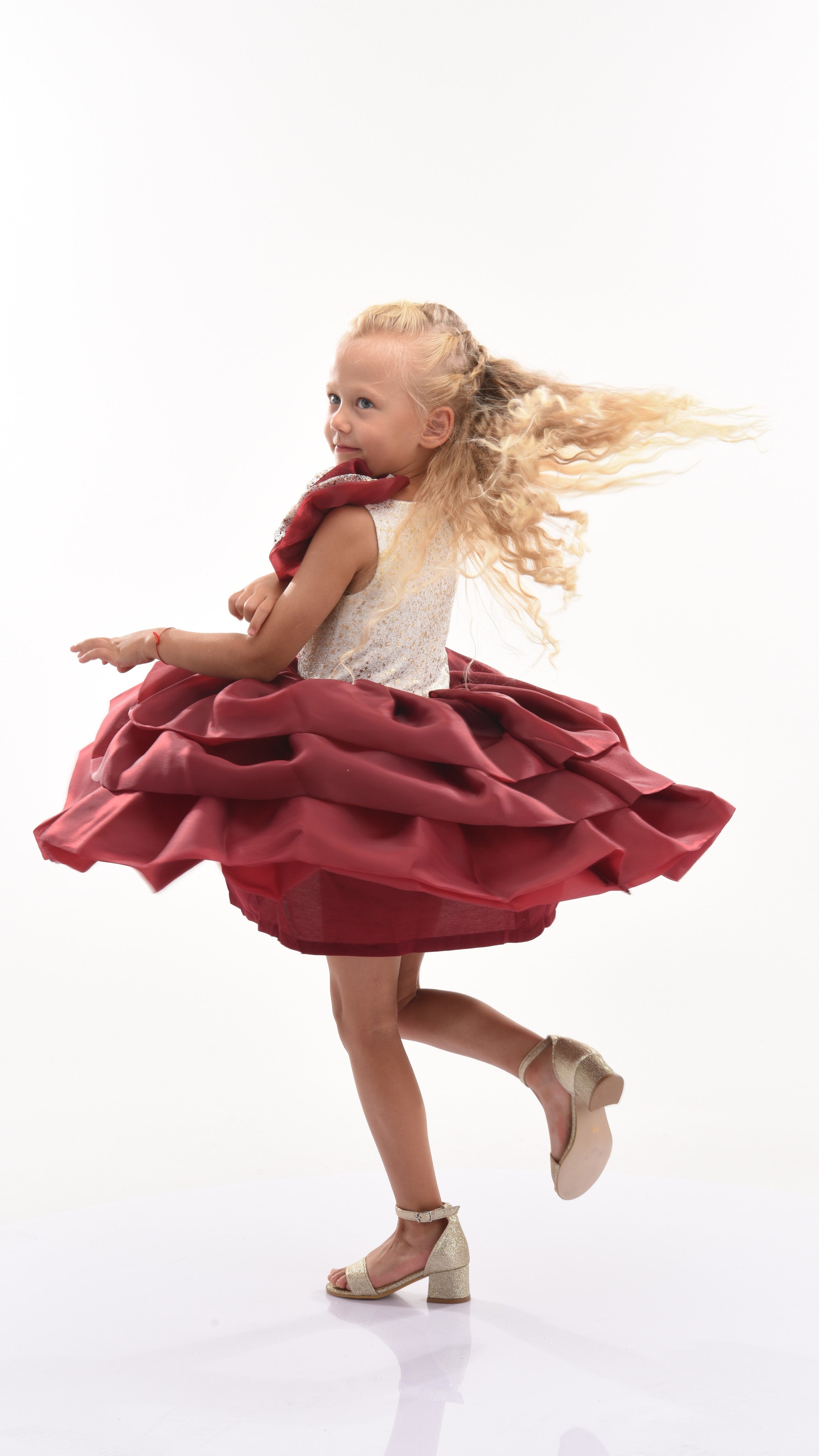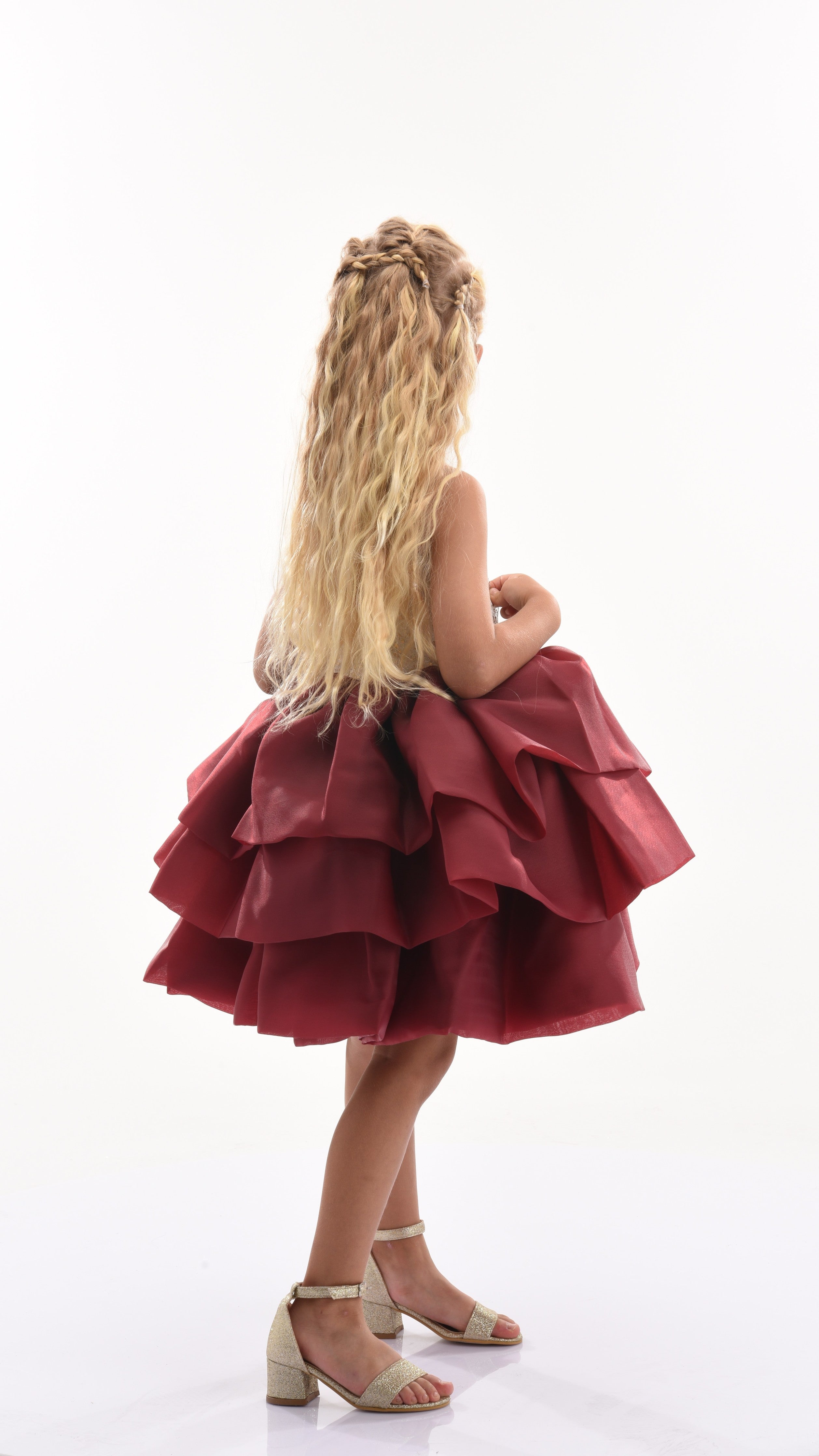 The dress has a straight hem leading to a full burgundy tiered gown, creating a beautiful and enchanting silhouette. Made from high-quality materials, this dress ensures both durability and comfort. Additionally, it requires dry cleaning to maintain its pristine appearance. Overall, the Burgundy Ladera Tiered Ruffle Dress combines elegance, charm, and unique design elements, making your child look and feel special at any event.
