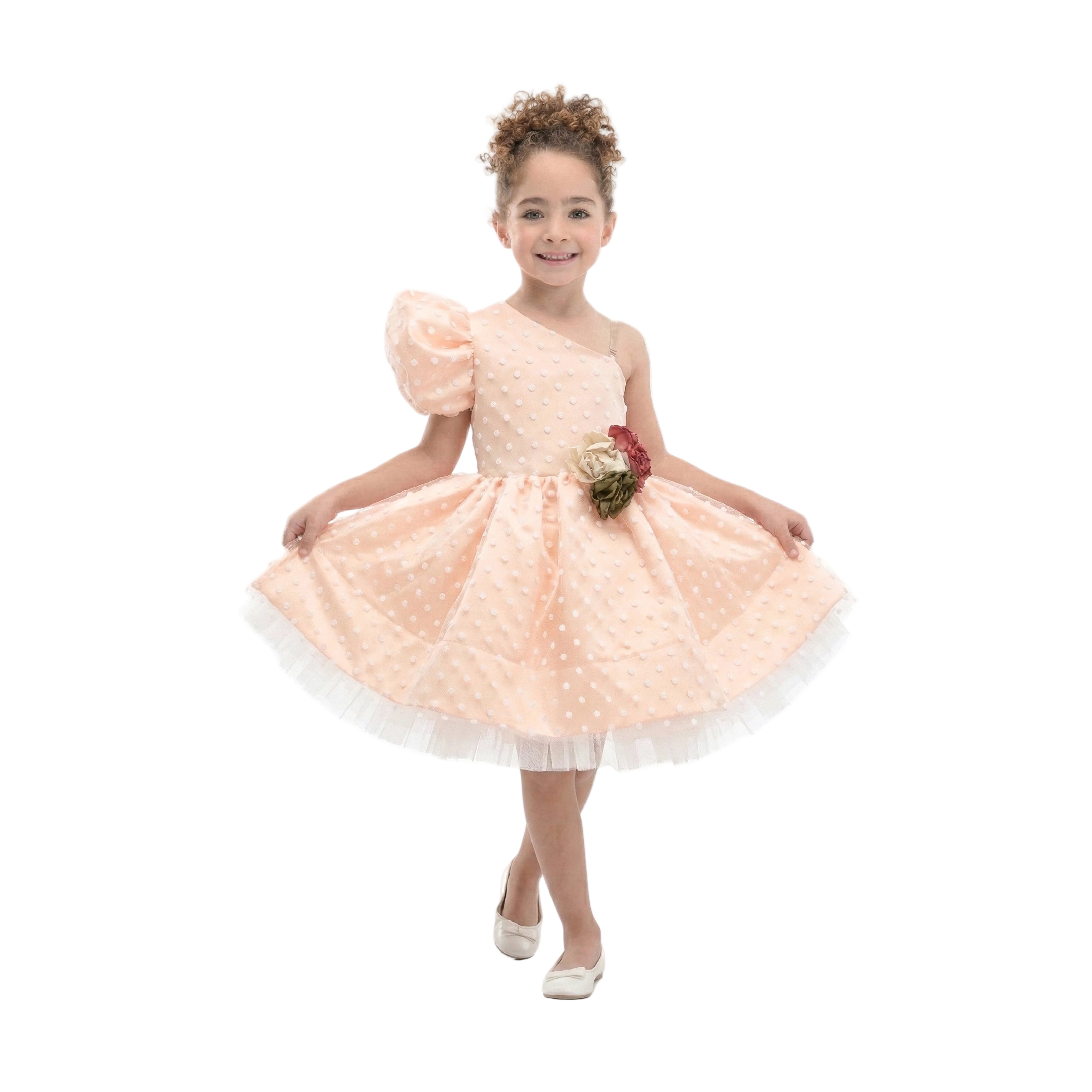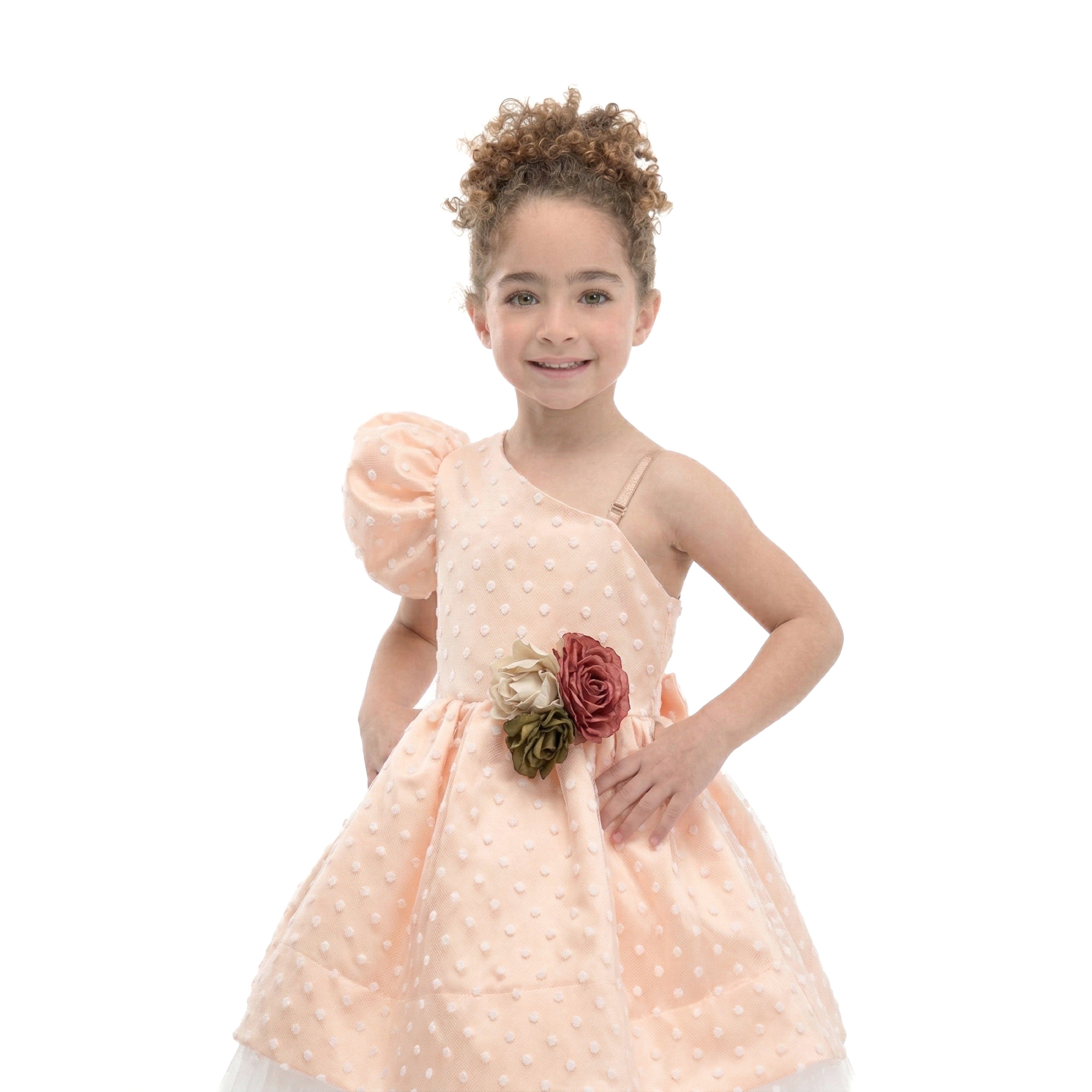 This peach off shoulder polka dot dress is simply precious, featuring an asymmetric shoulder collar, adorned with a beautiful multicolor rose assortment adjacent to the hip, leading to a layered continuation of the polka dot pattern to create the perfect princess silhouette.