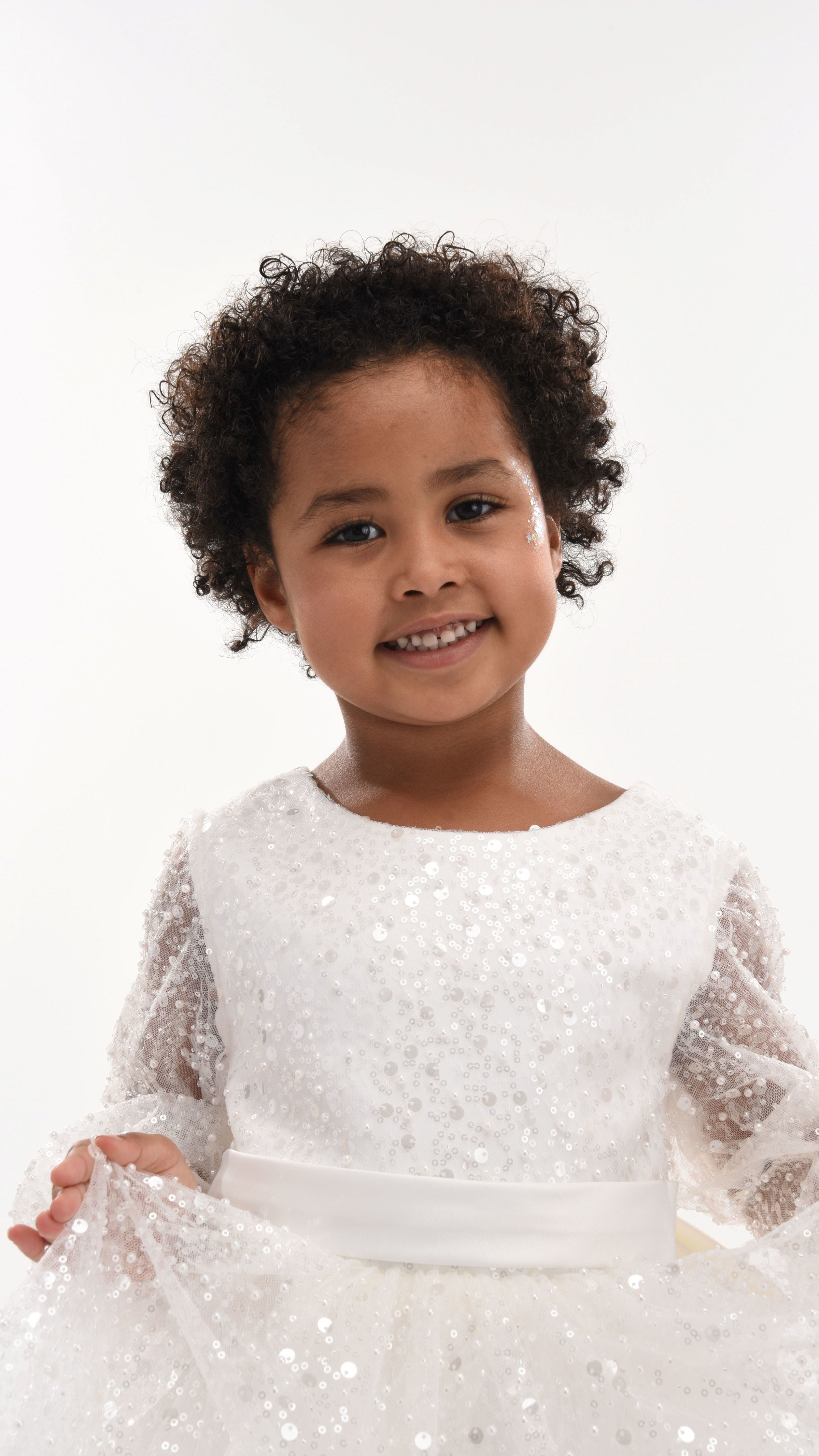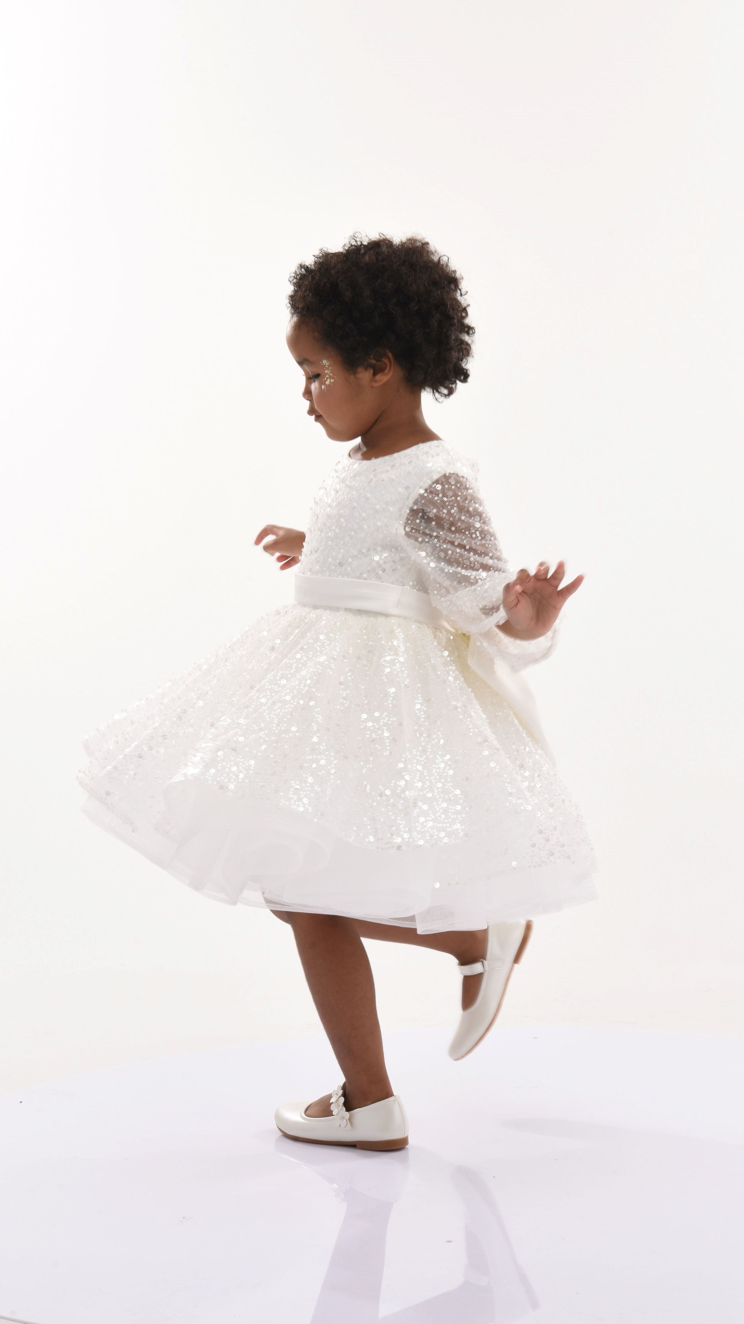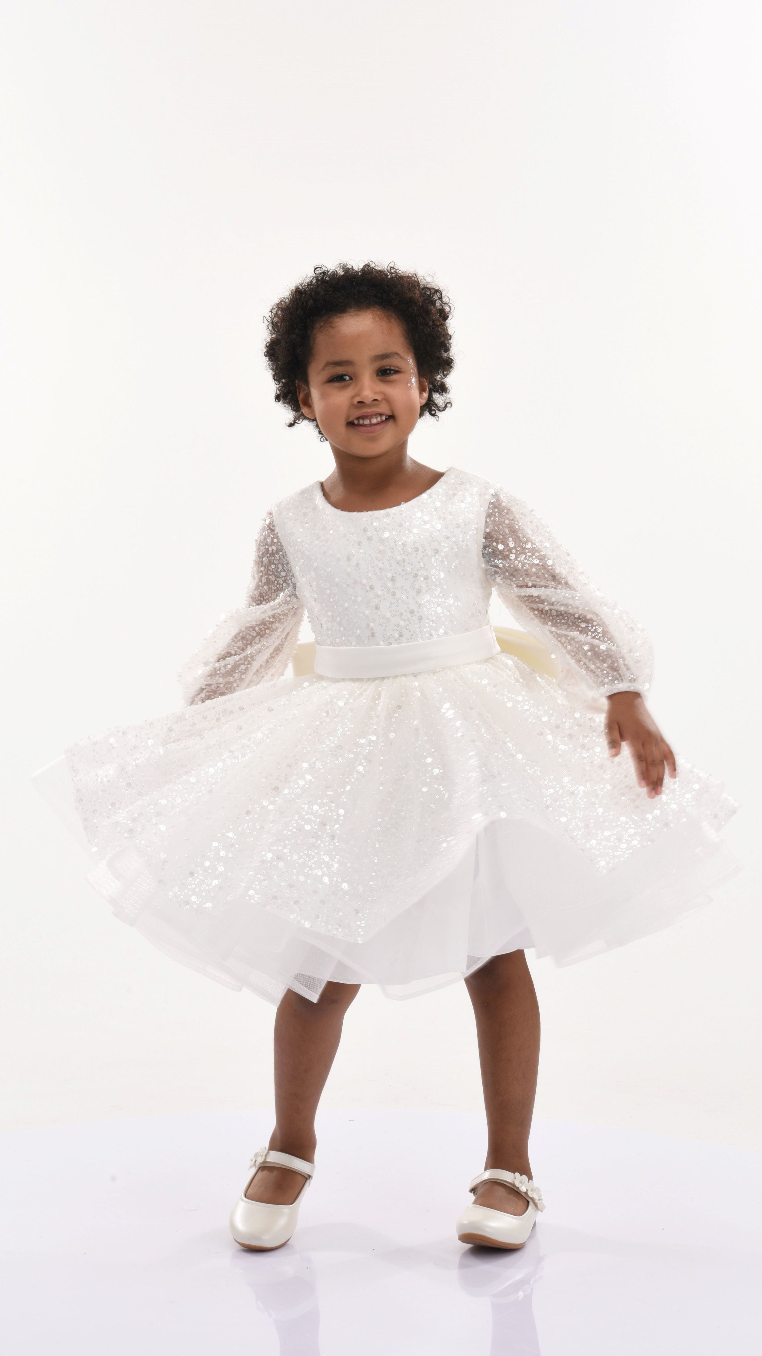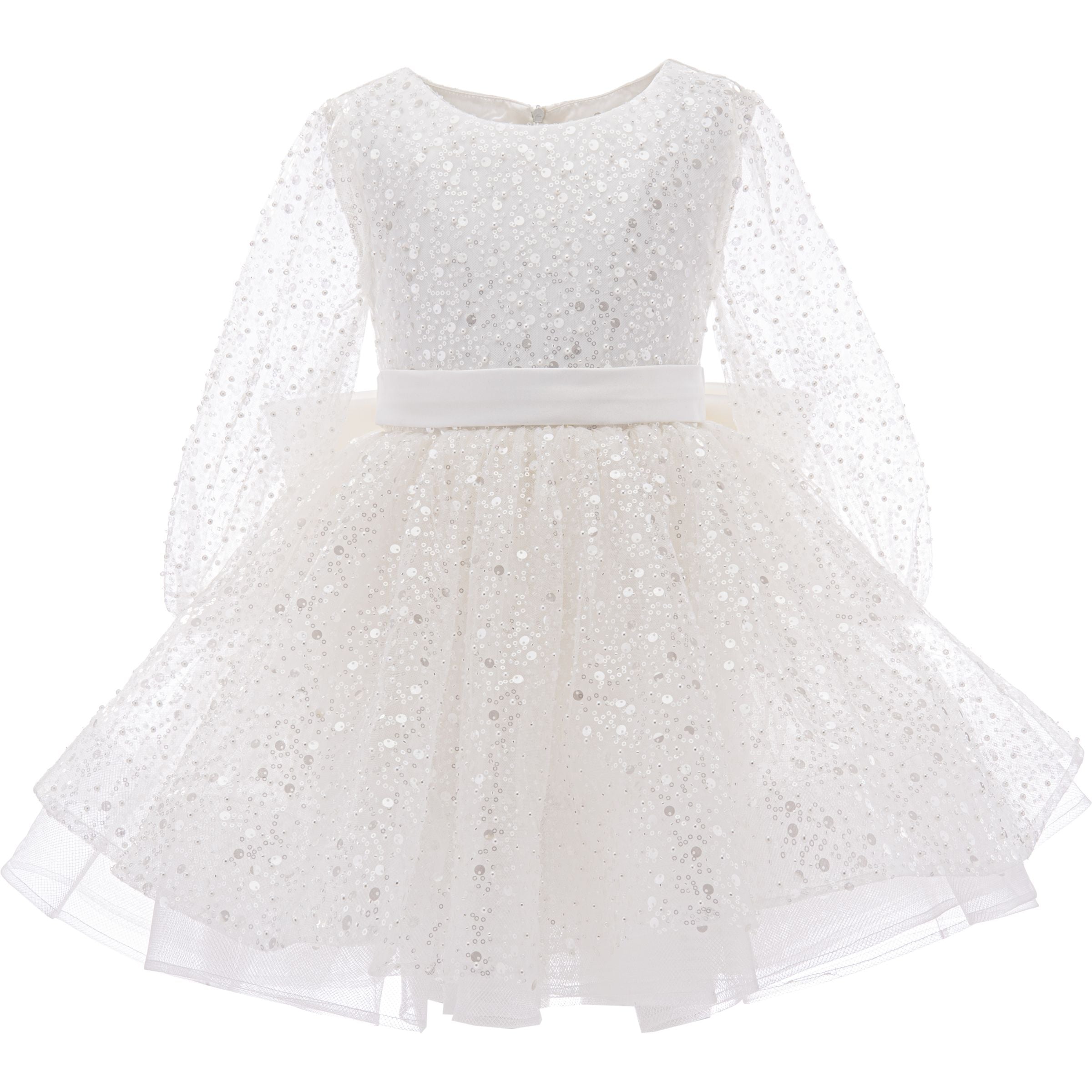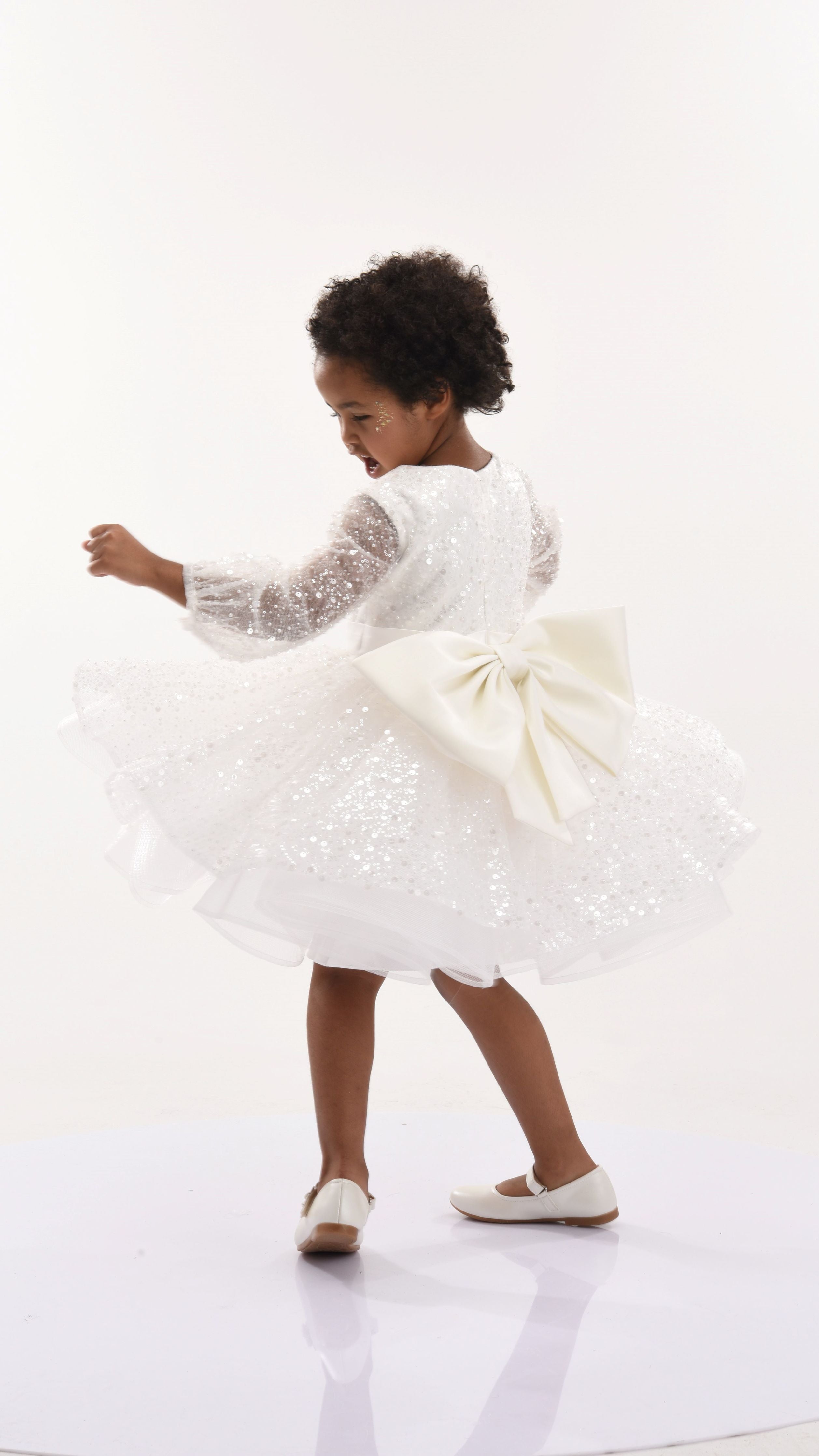 A satin belt with a big bow adorns the back, adding a dash of sophistication. The dress also features long mesh sleeves, providing a delicate and airy feel that makes your little one look graceful. The all-over glimmer print adds a magical touch, with shimmering patterns that catch the light from every angle.