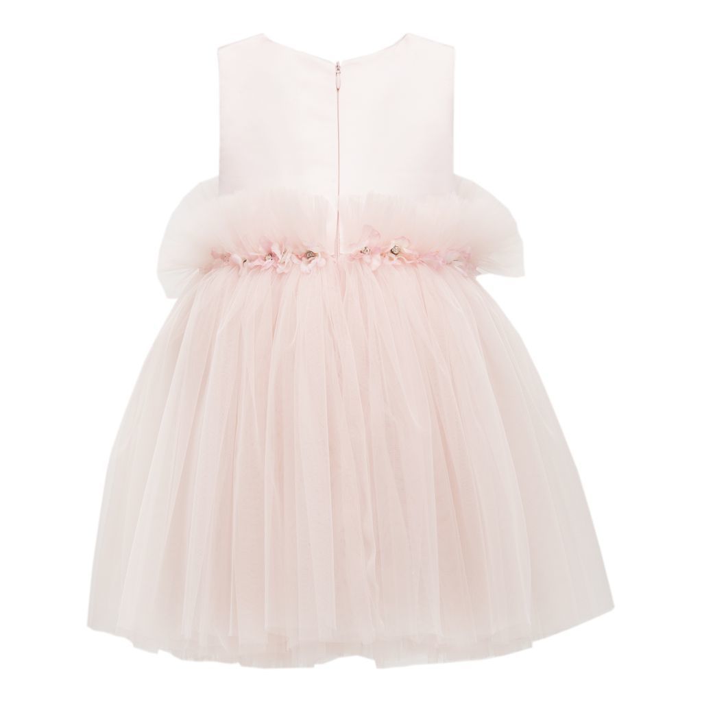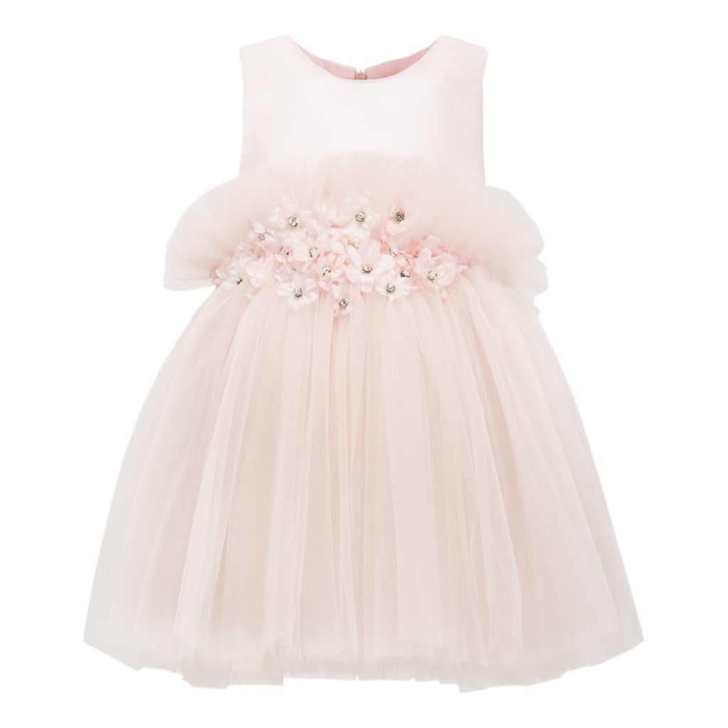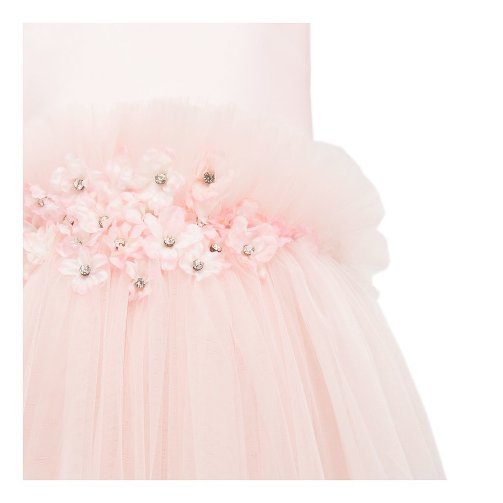 Pink flower tulle dress kid girls from Tulleen, featuring a pink floral applique with gem centers across the hem, sleeveless soft pink bodice and soft pink tulle skirt for a lightweight and flowing fit.