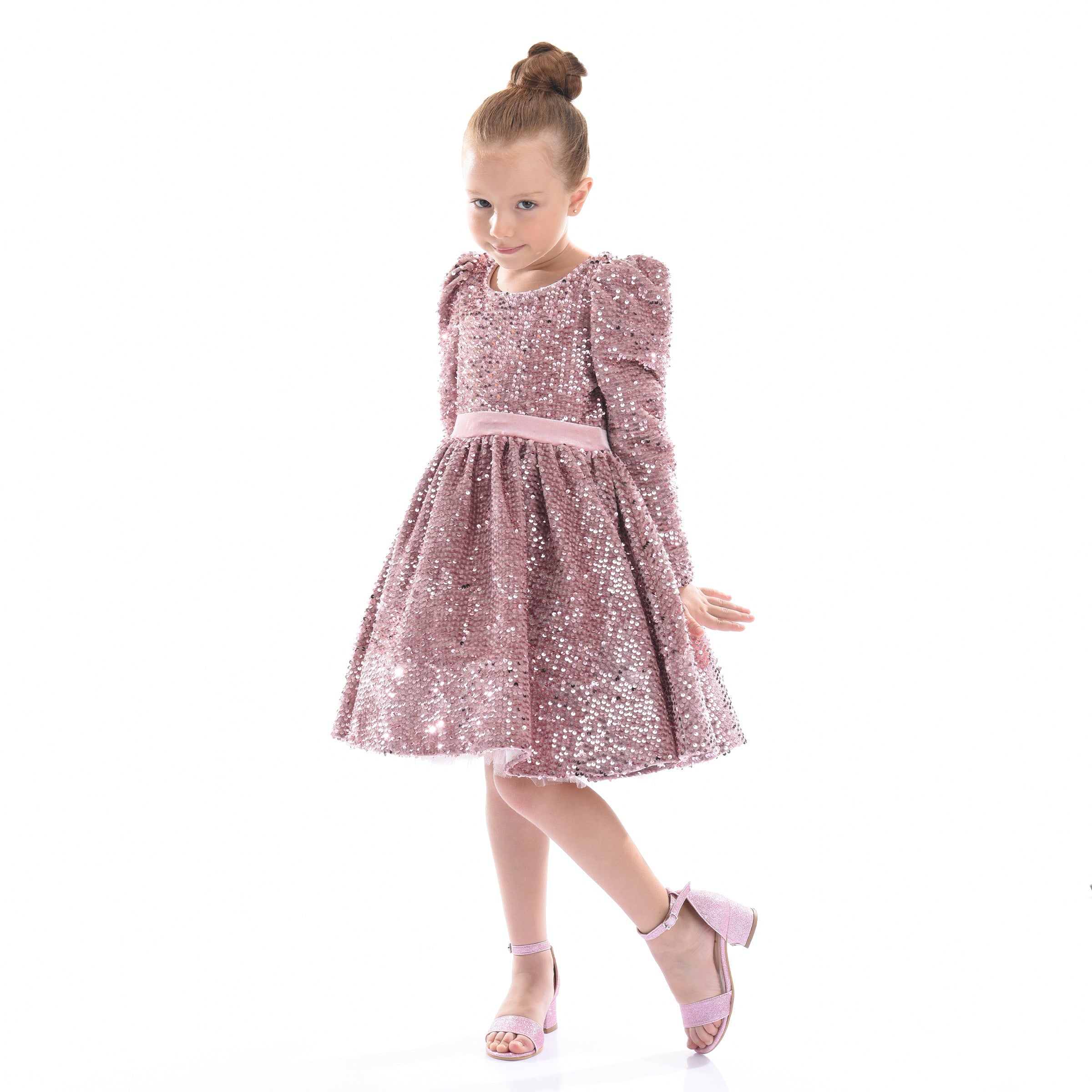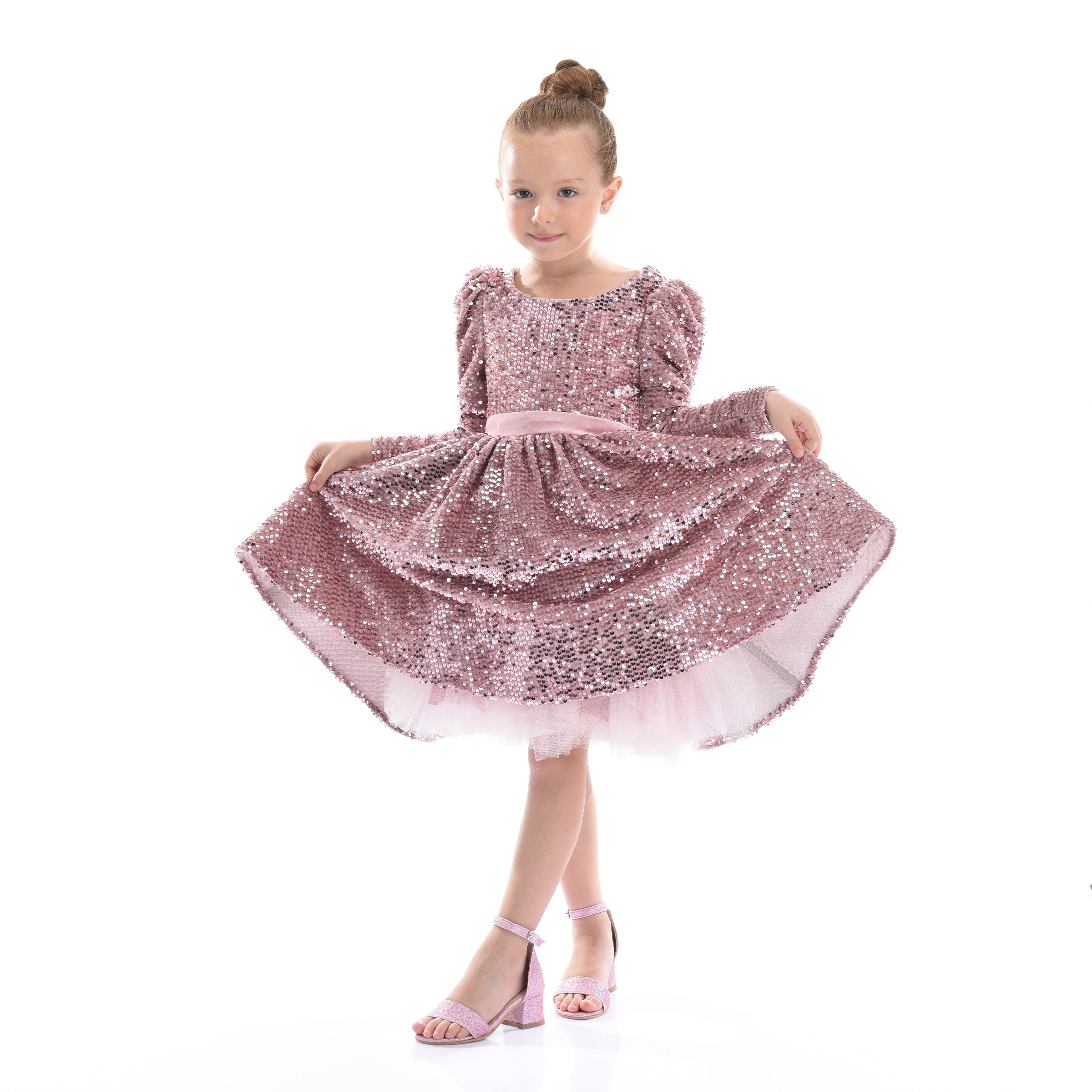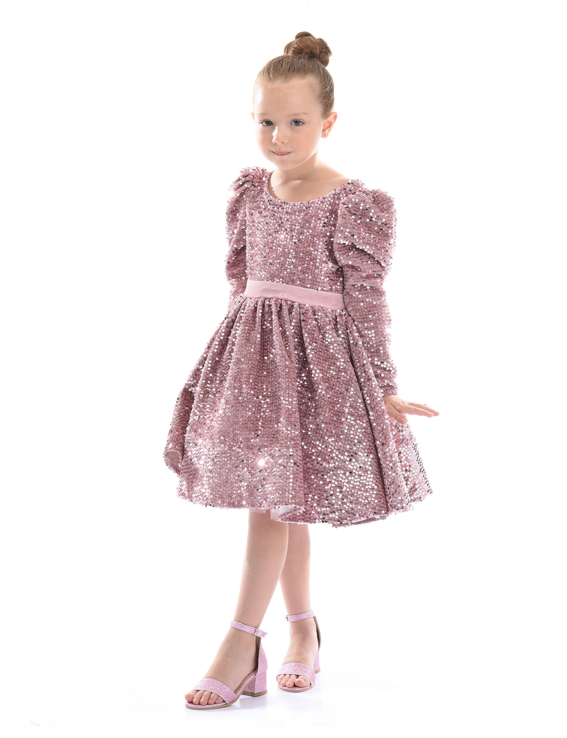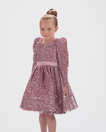 The Pink Merribrook Sequin Bow Long Sleeve Dress for kid girls from Tulleen combines sparkle and charm in a stunning ensemble. This dress features an all-over sequin design that catches the light beautifully, making your child shine at any event. The long sleeves add elegance while ensuring comfort and warmth.