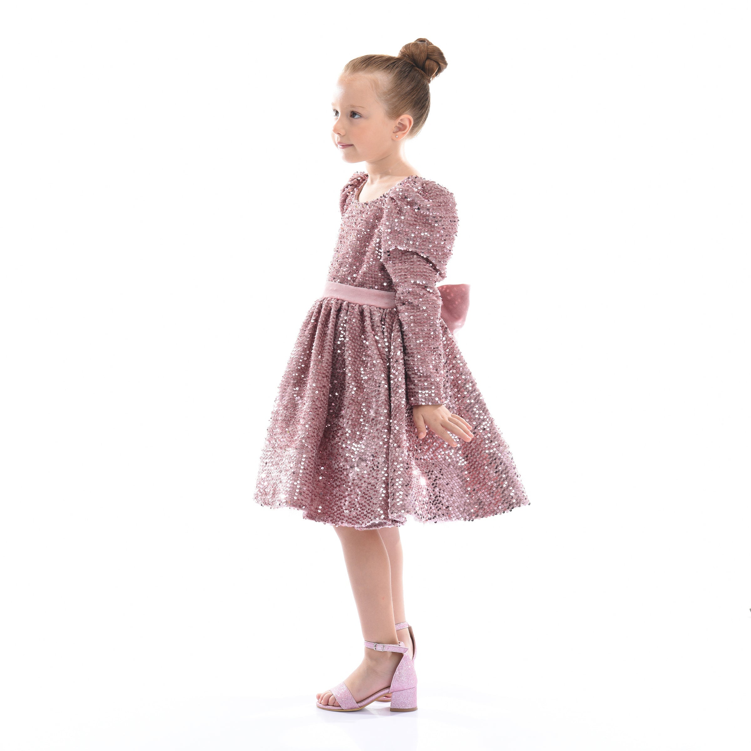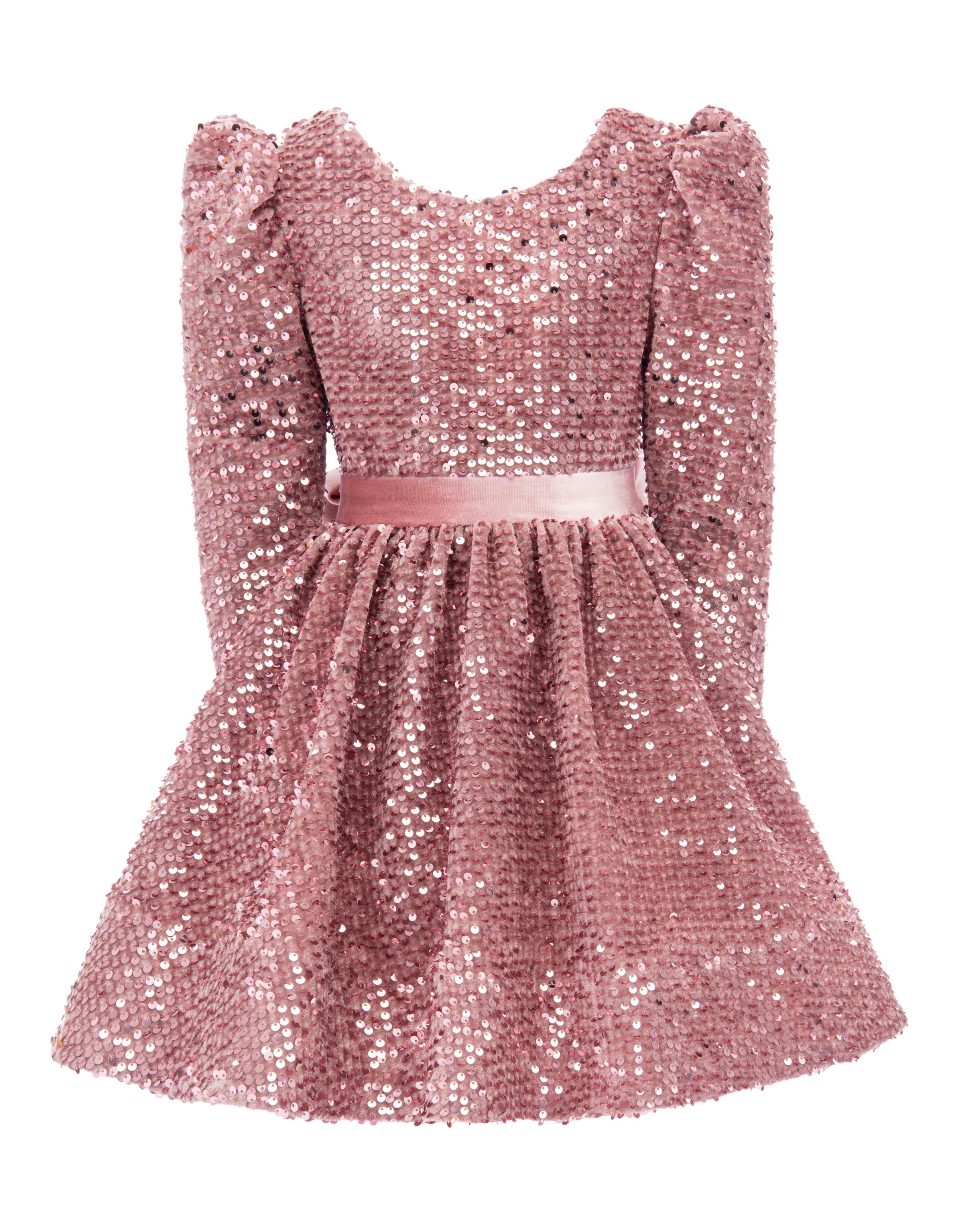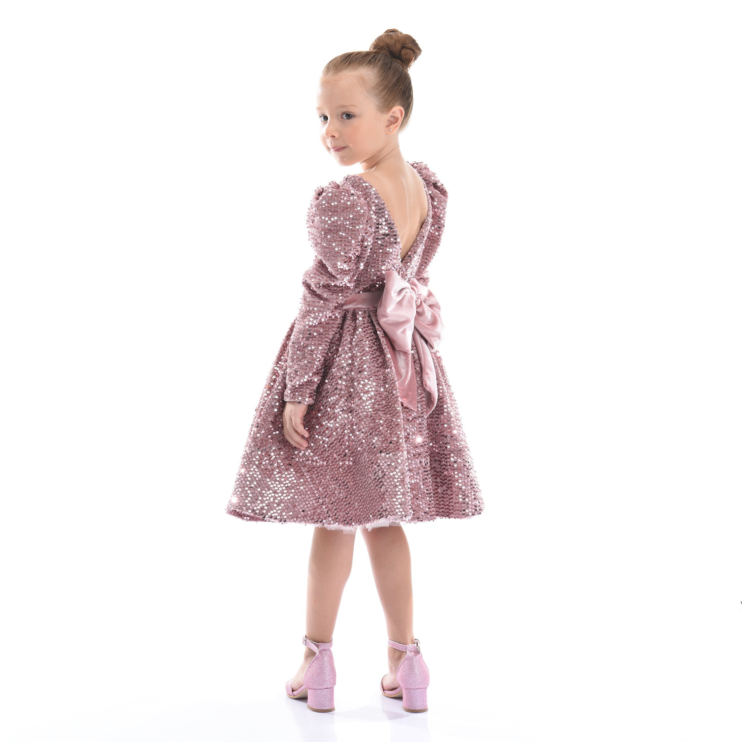 Overall, the Pink Merribrook Sequin Bow Long Sleeve Dress combines elegance, charm, and playful design elements, making it perfect for special occasions.