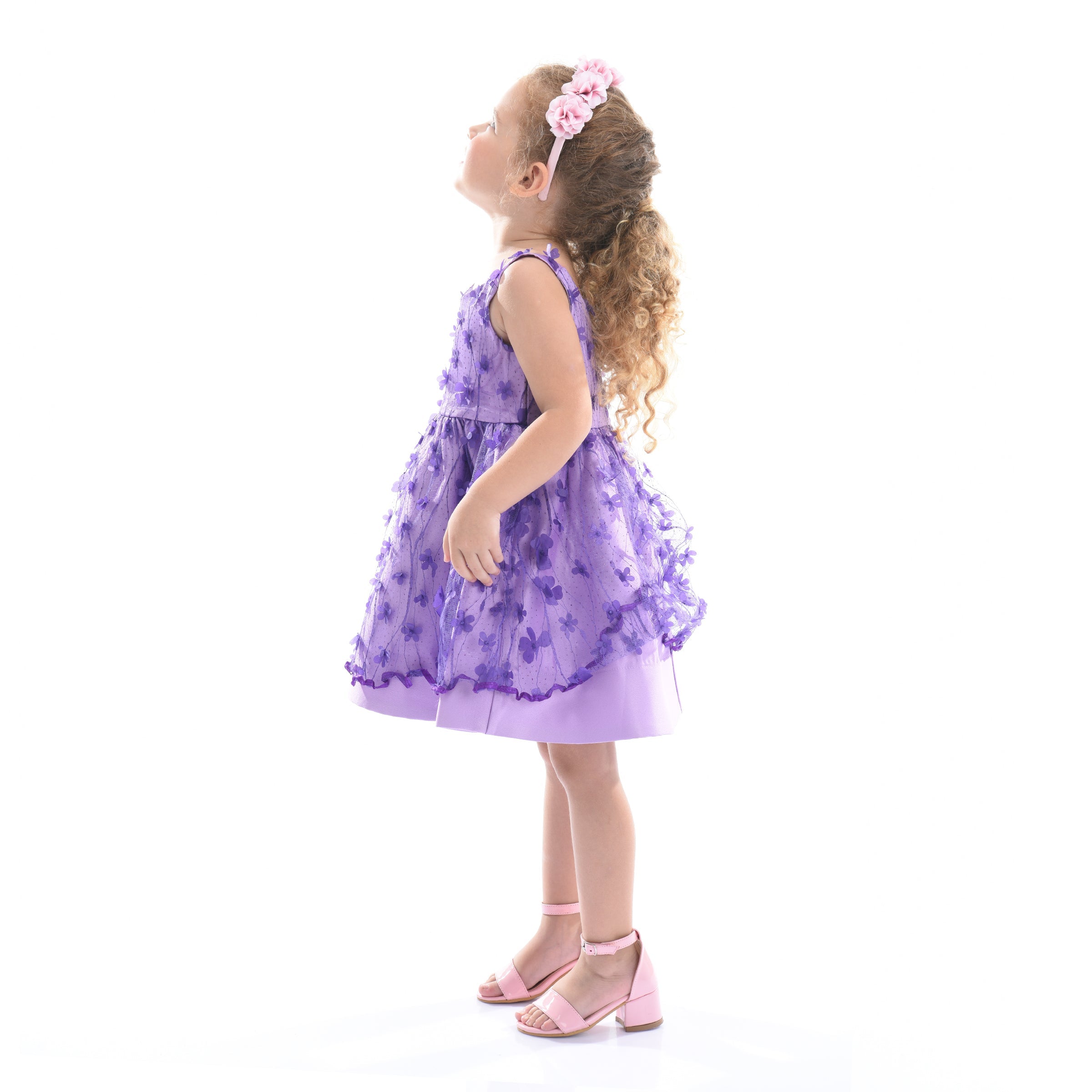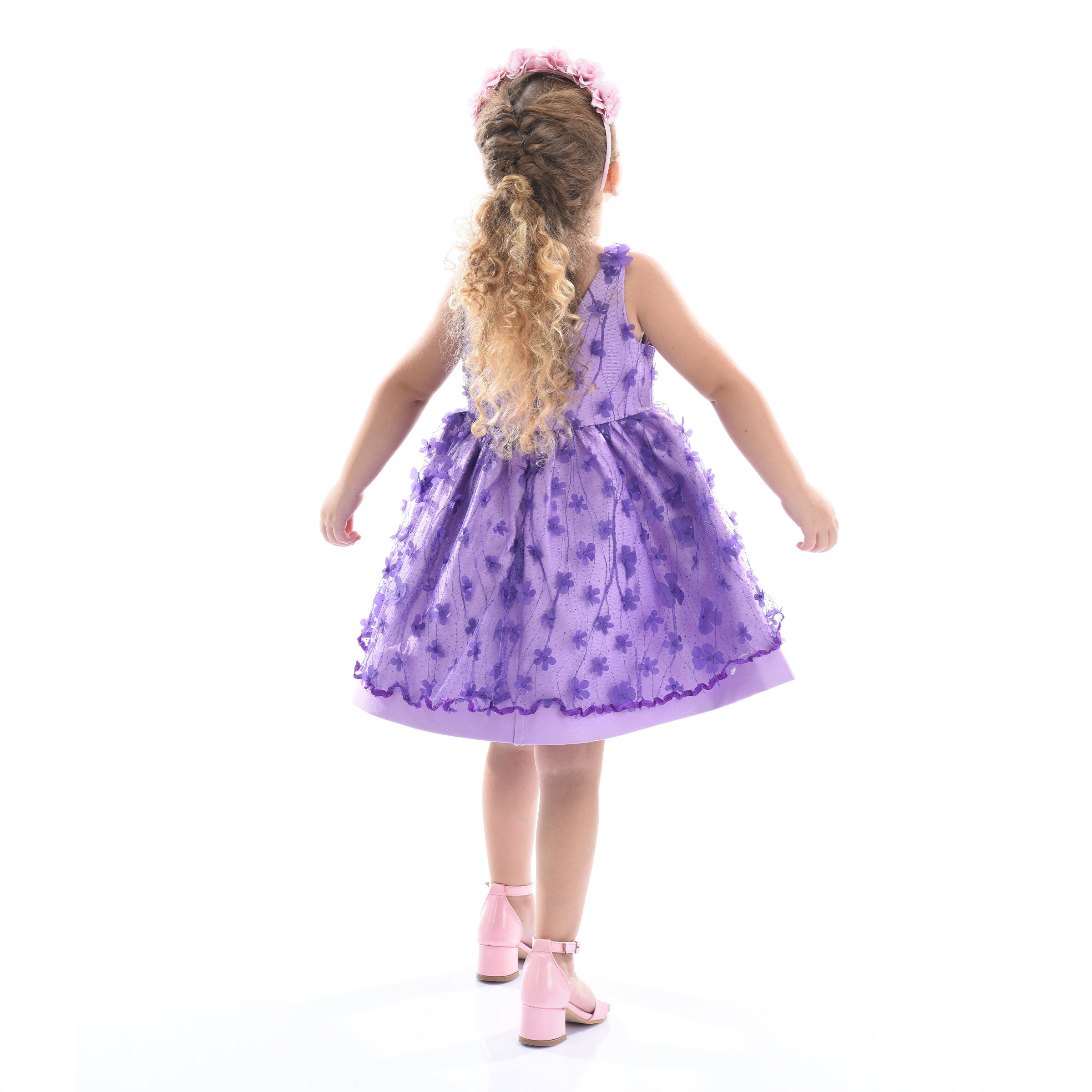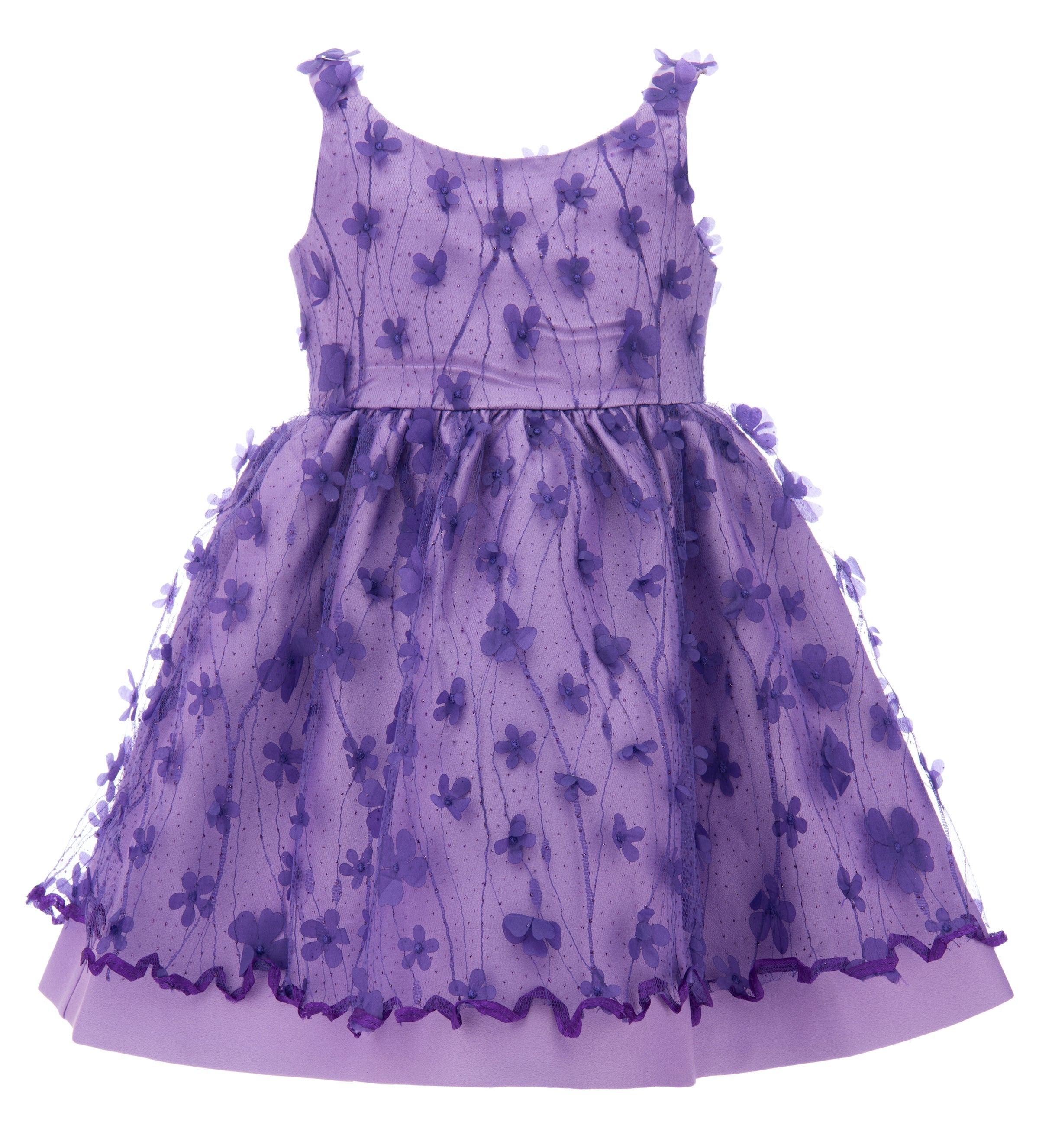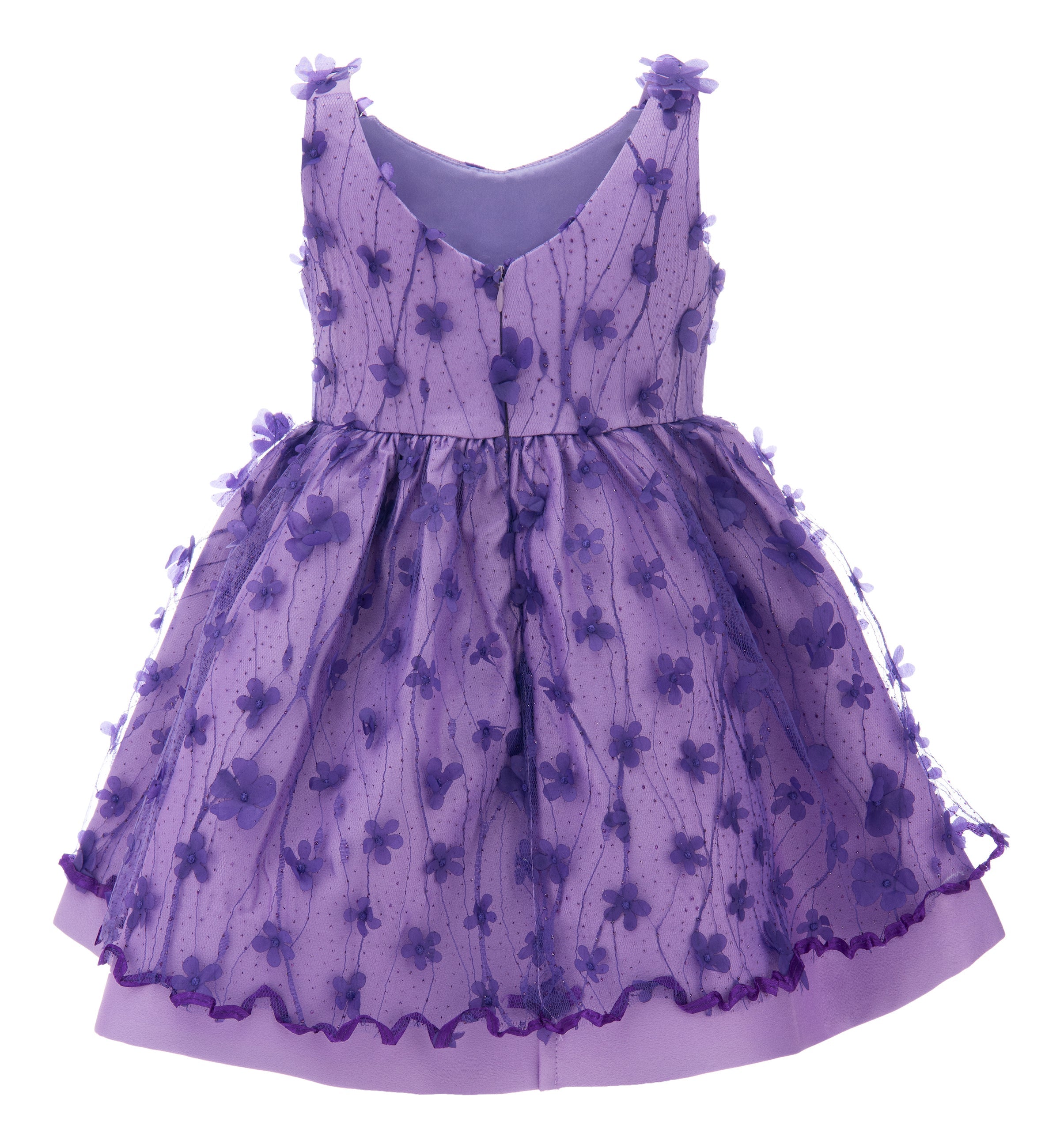 The Purple Ravine Floral Dress for kid girls from Tulleen is a captivating choice for any special occasion. This dress is decorated with 3D floral embellishments lined with shining and glimmering strands of tulle, ensuring it catches the eye. The bodice, double-layered in deep purple, features mini cutout flowers that seamlessly match the skirt, creating a cohesive and charming look.