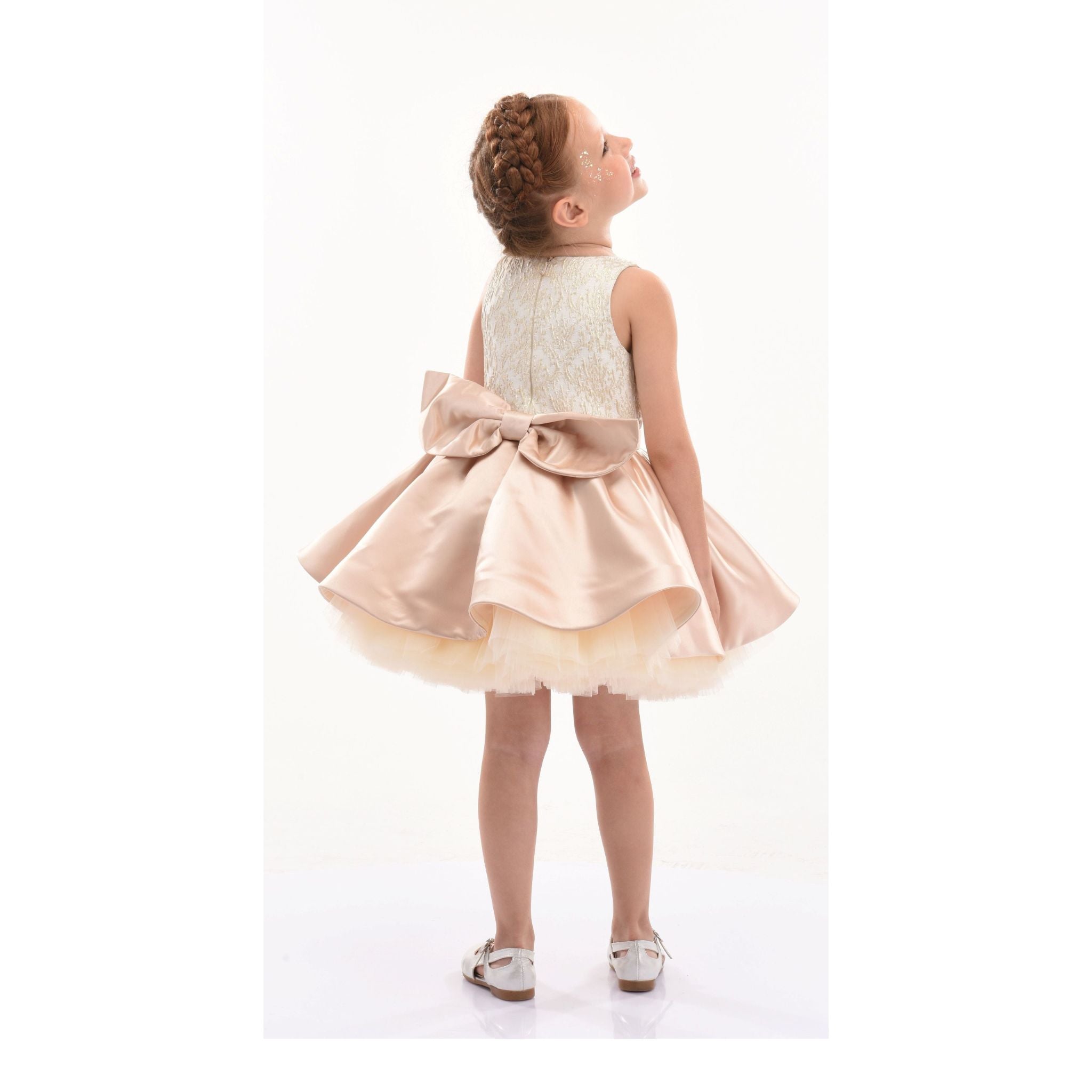 A matching big bow in rose gold adds a playful yet refined detail. The dress also boasts a layered satin and tulle skirt in rose gold and champagne, creating a beautiful and enchanting silhouette. Made from high-quality materials, this dress ensures both durability and comfort. Overall, the Rose Gold Elwood Satin Bow Dress combines elegance, charm, and playful design elements, making your child look and feel special at any event.