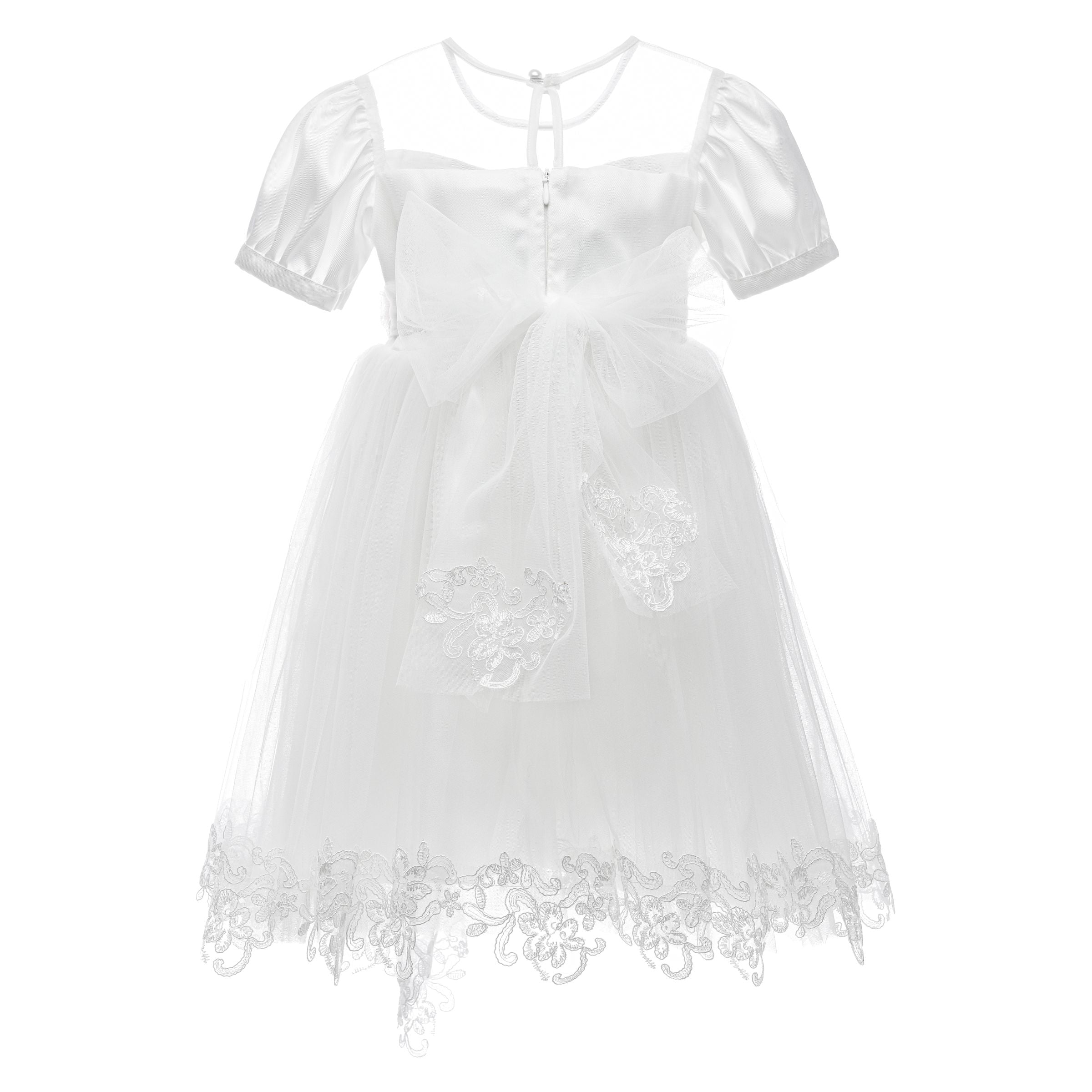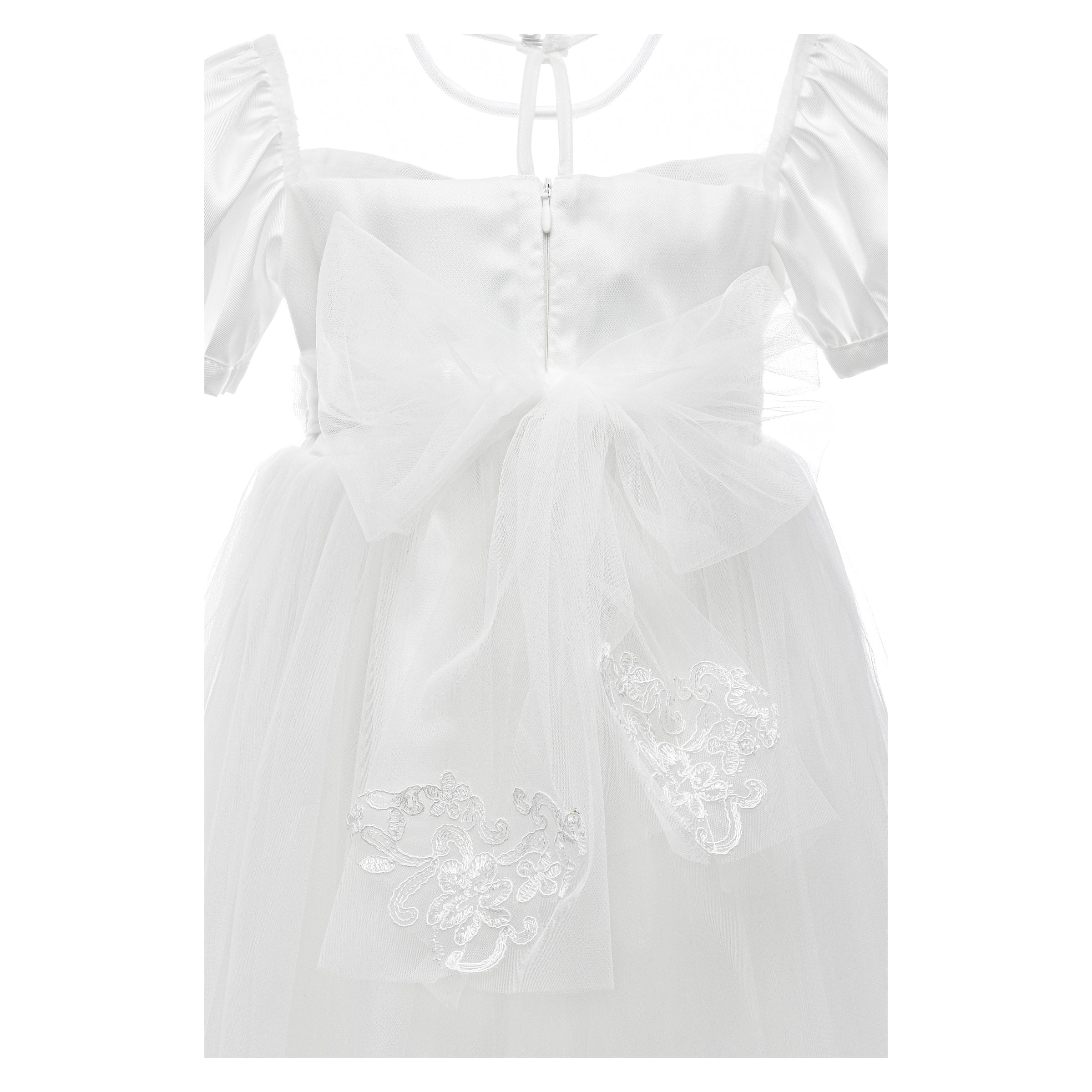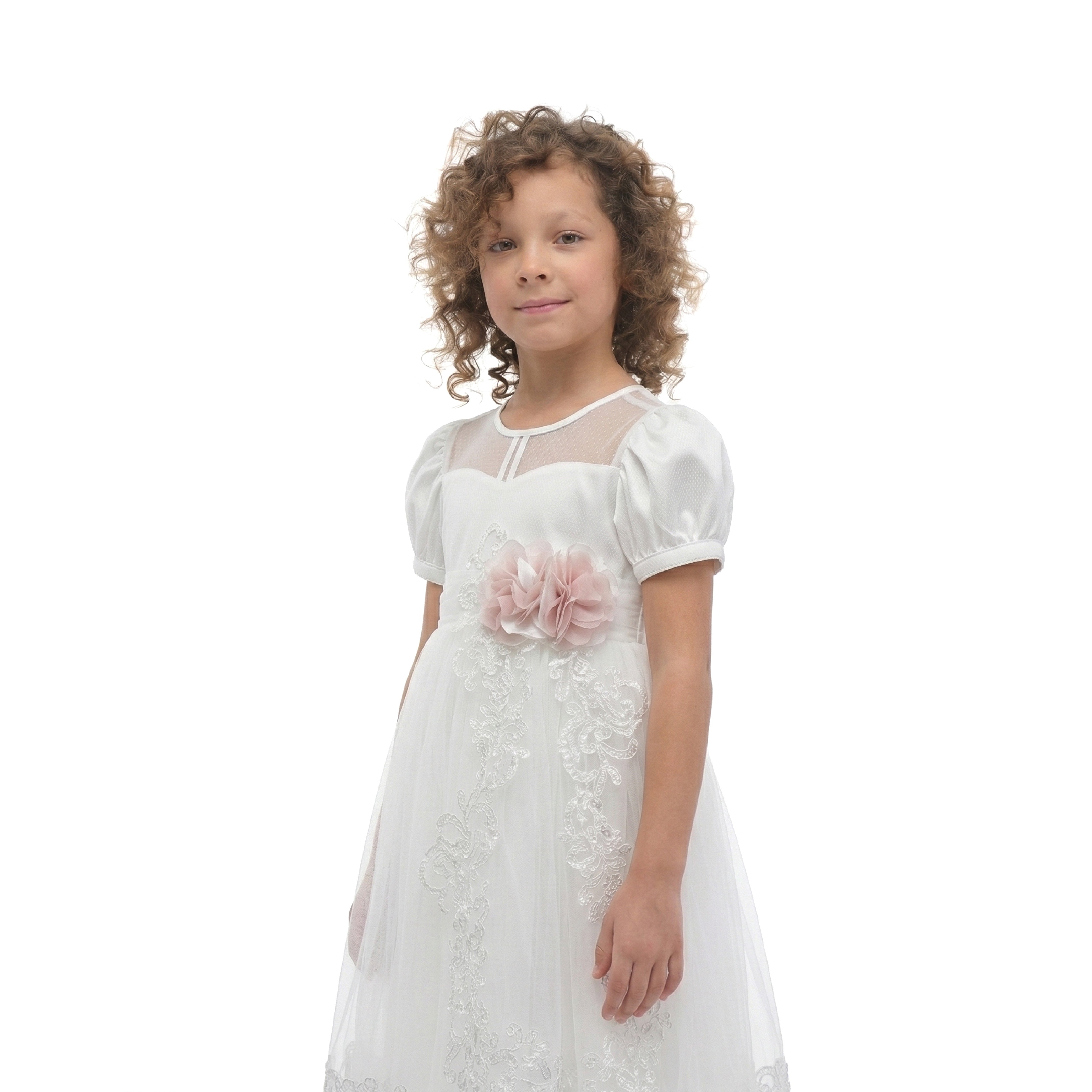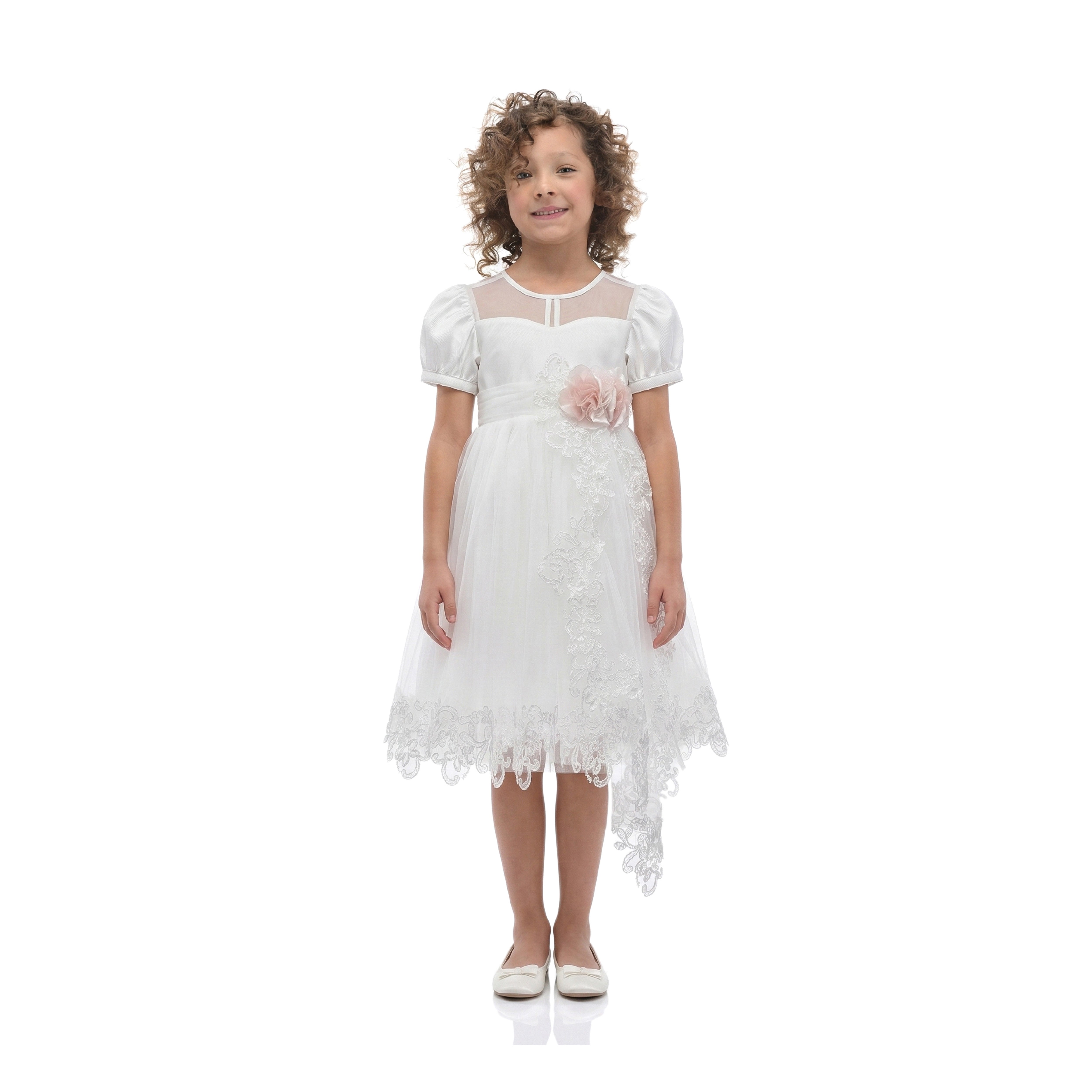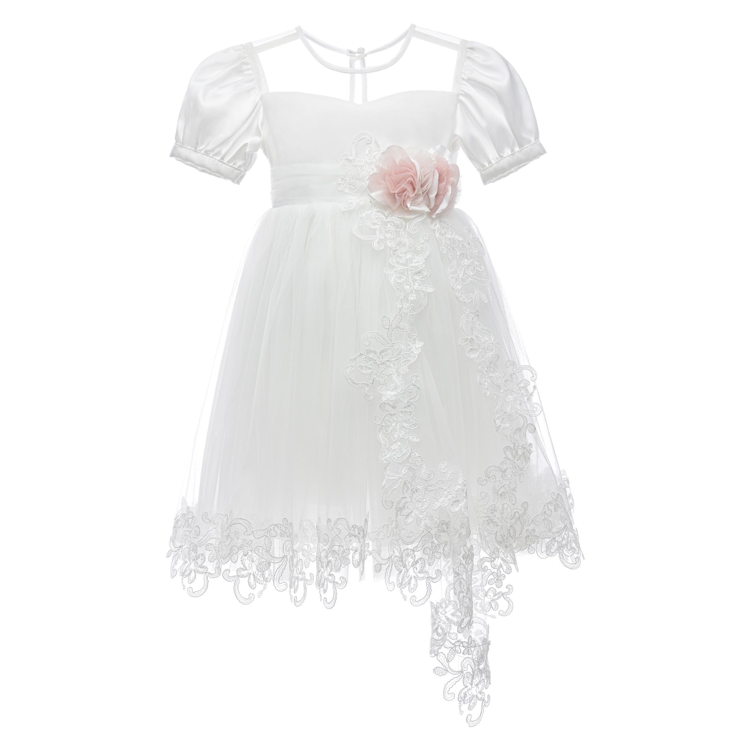 The White Florence Lace Dress is a picture of grace, designed for enchanting moments. It features a square illusion neckline and sweet puff sleeves, with a blush fabric flower at the waist from which cascades an elegant lace detail. This knee-length ivory dress is ideal for capturing the innocence and joy of special celebrations.