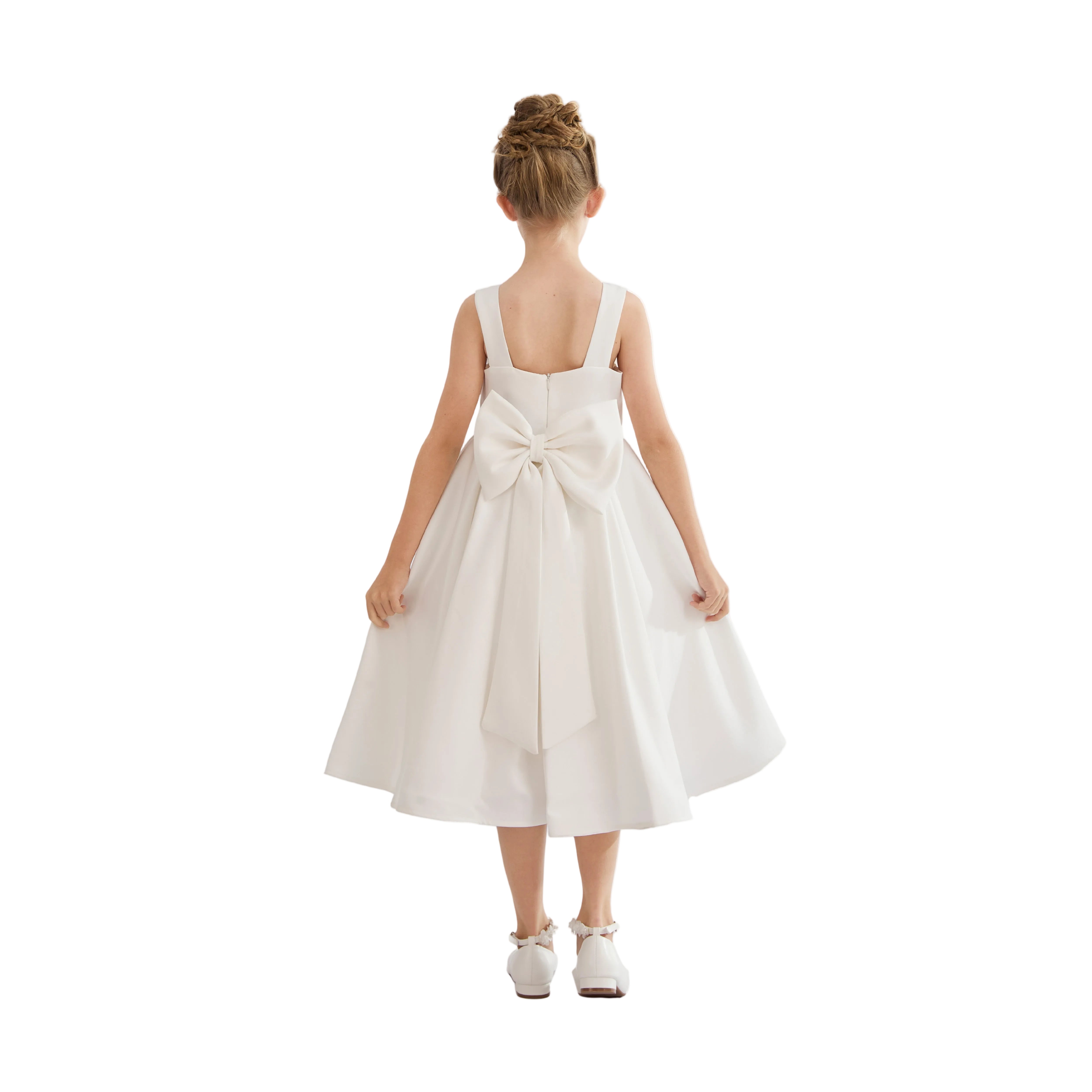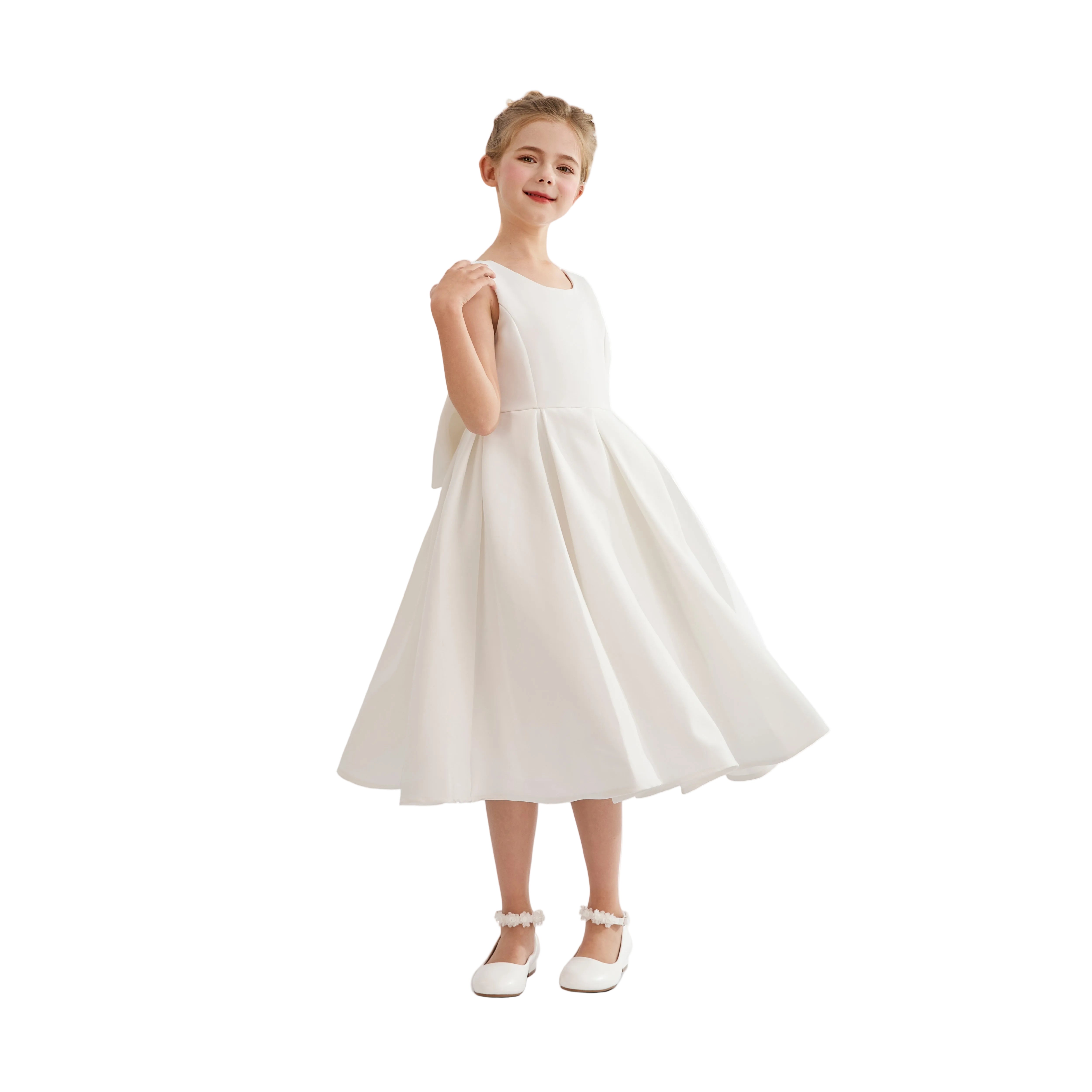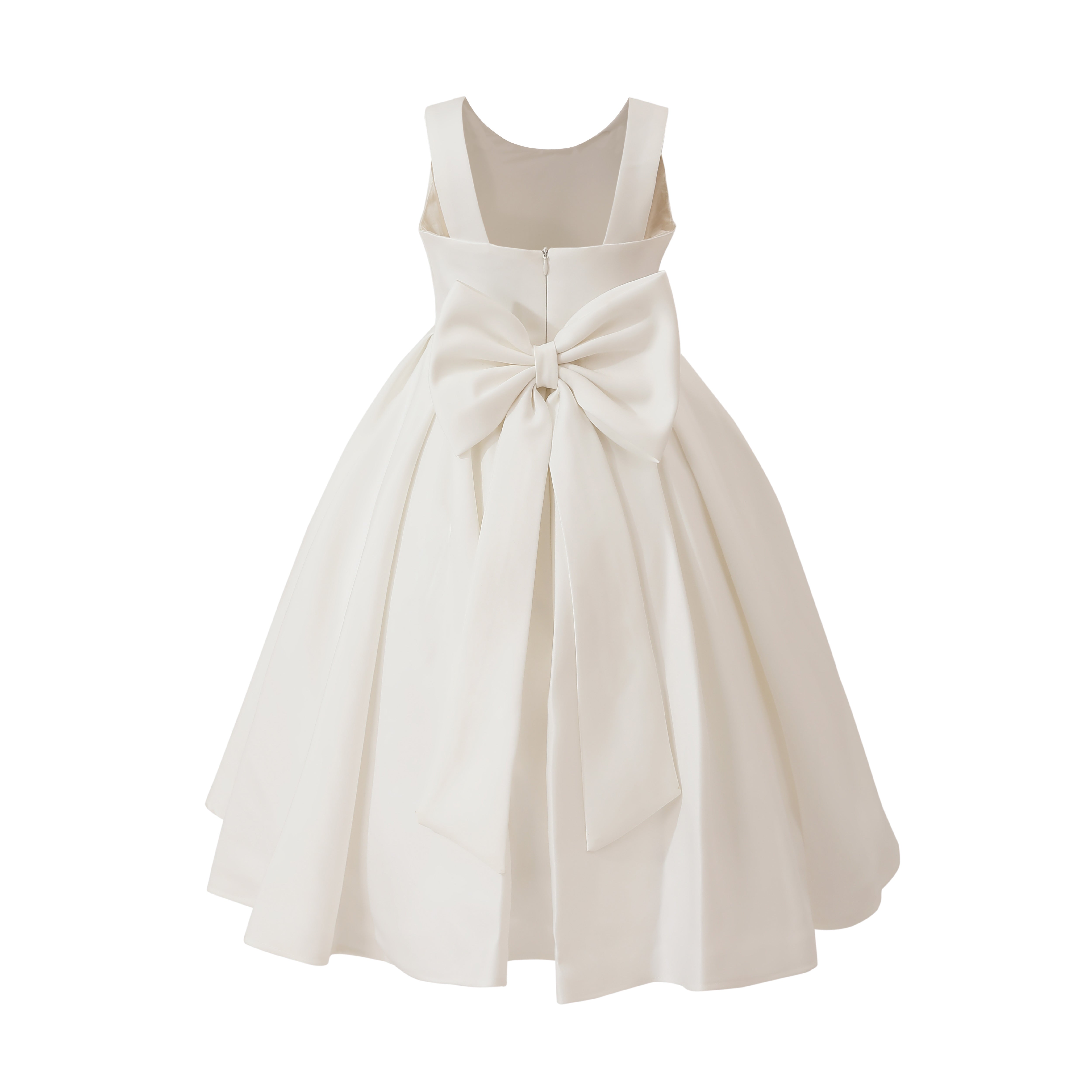 This formal sleeveless dress features wide shoulder straps and a fitted bodice, flowing into a full flared skirt for a classic A-line silhouette. At the back, a large satin bow serves as the centerpiece, adding elegance and charm to the smooth, polished design. Perfect for weddings, parties, or other special occasions, it balances timeless sophistication with playful detailing.