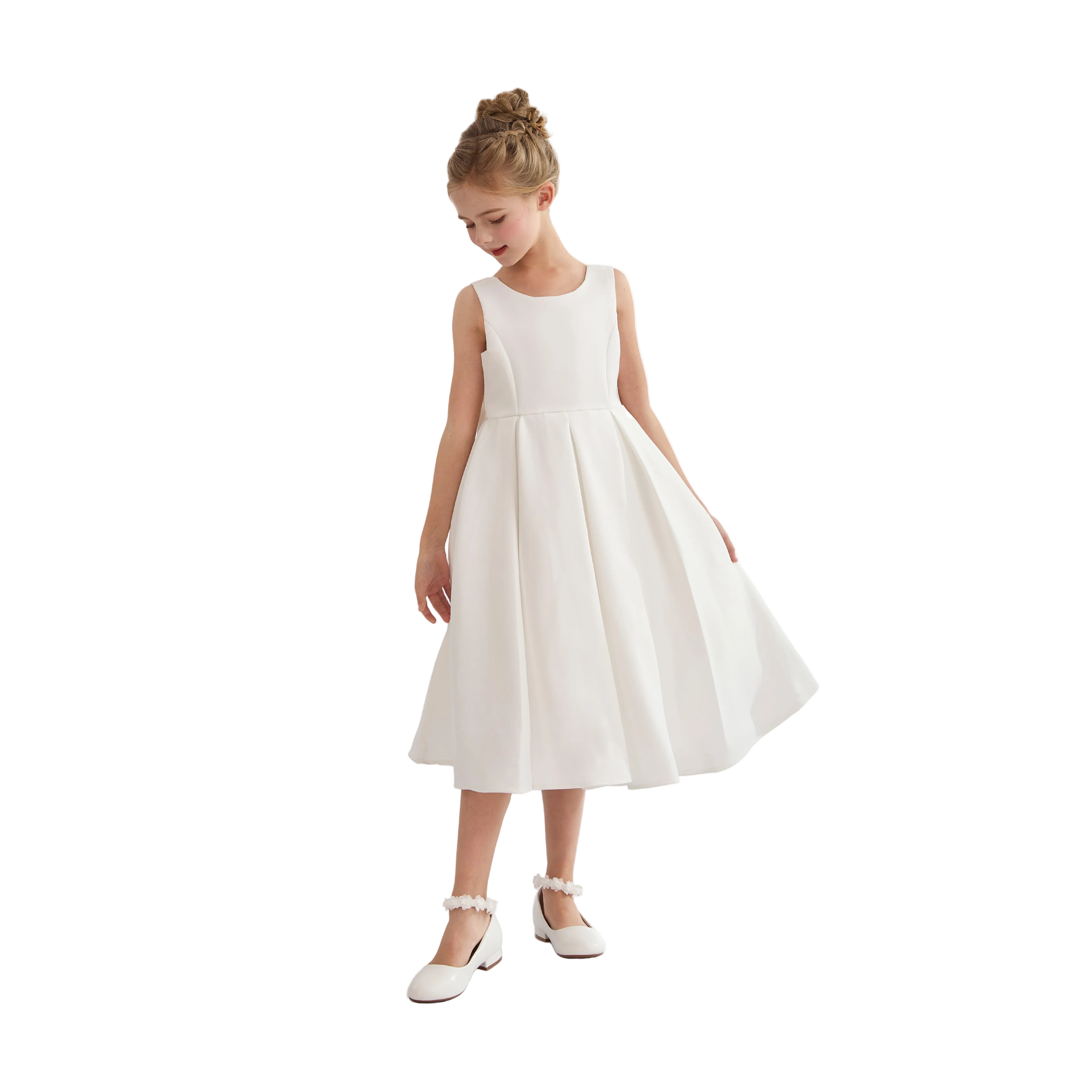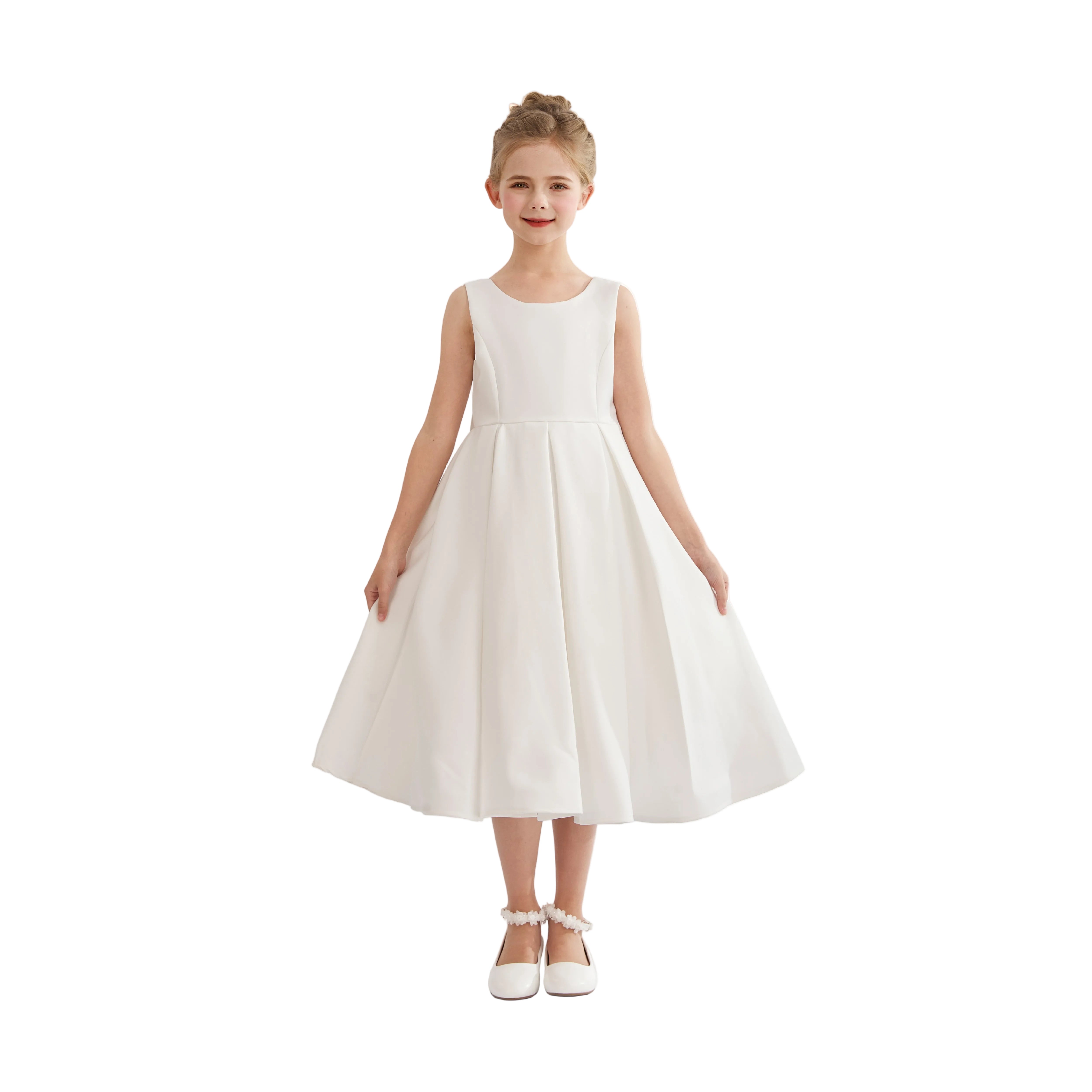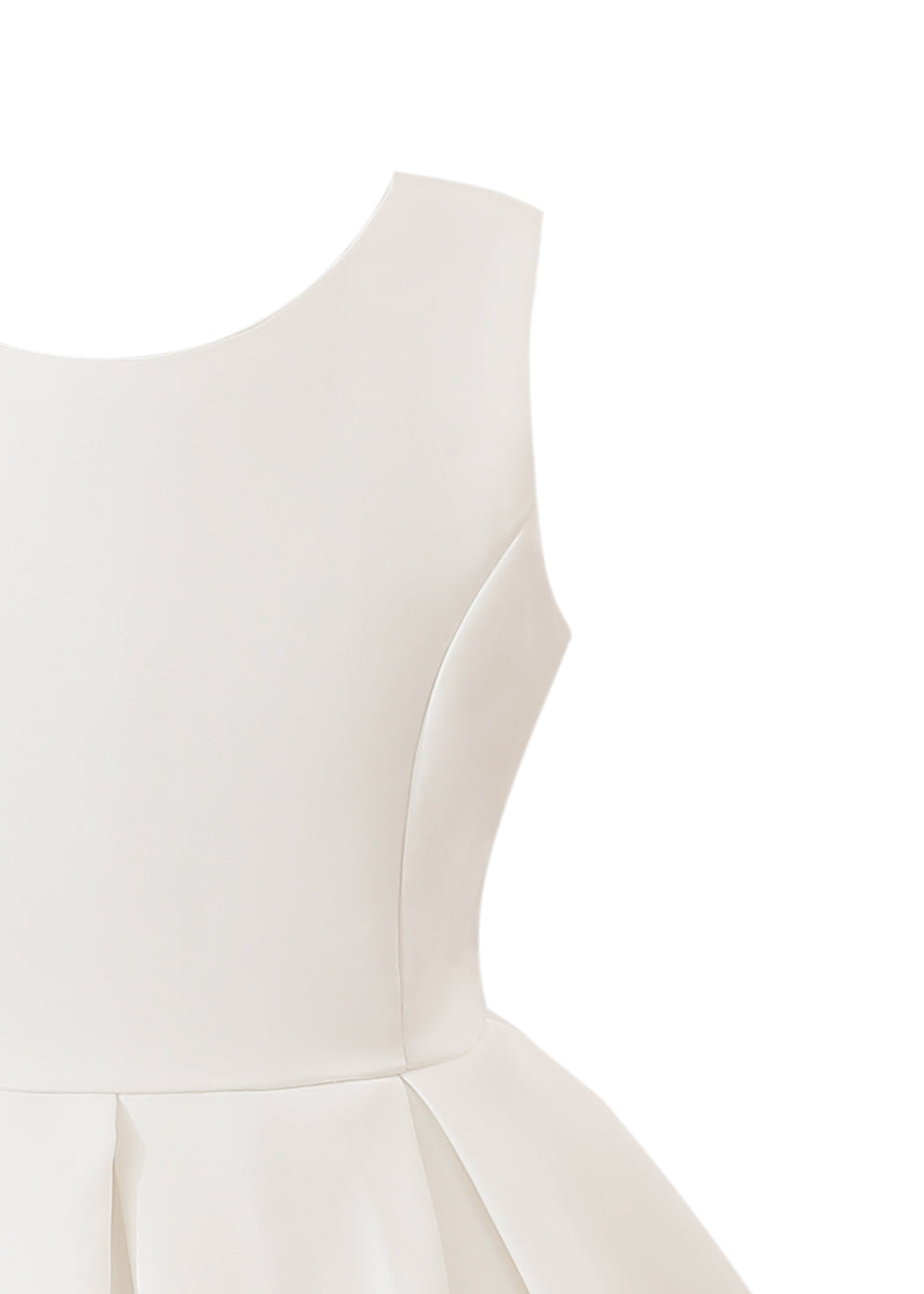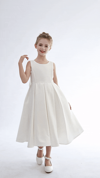 This formal sleeveless dress features wide shoulder straps and a fitted bodice, flowing into a full flared skirt for a classic A-line silhouette. At the back, a large satin bow serves as the centerpiece, adding elegance and charm to the smooth, polished design. Perfect for weddings, parties, or other special occasions, it balances timeless sophistication with playful detailing.