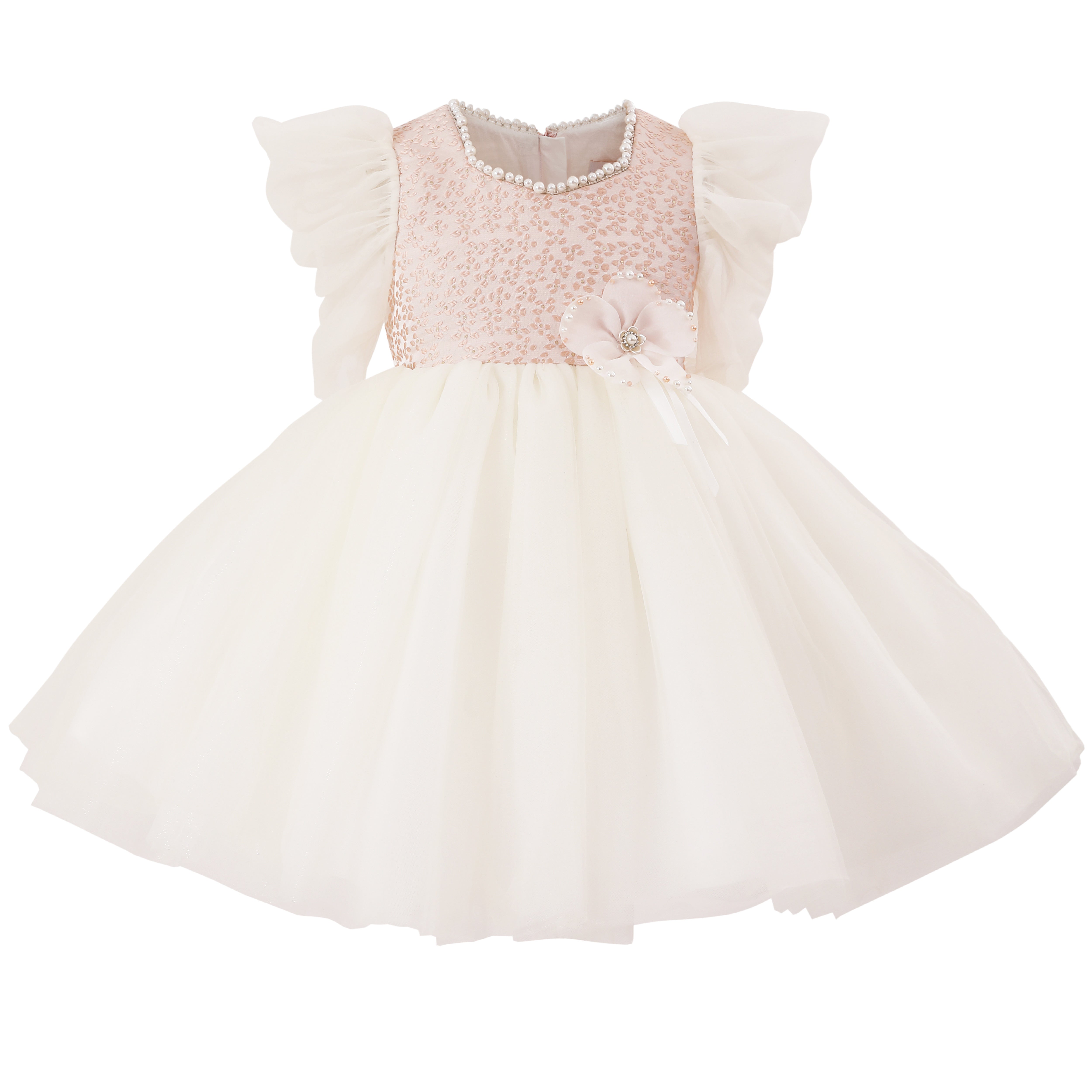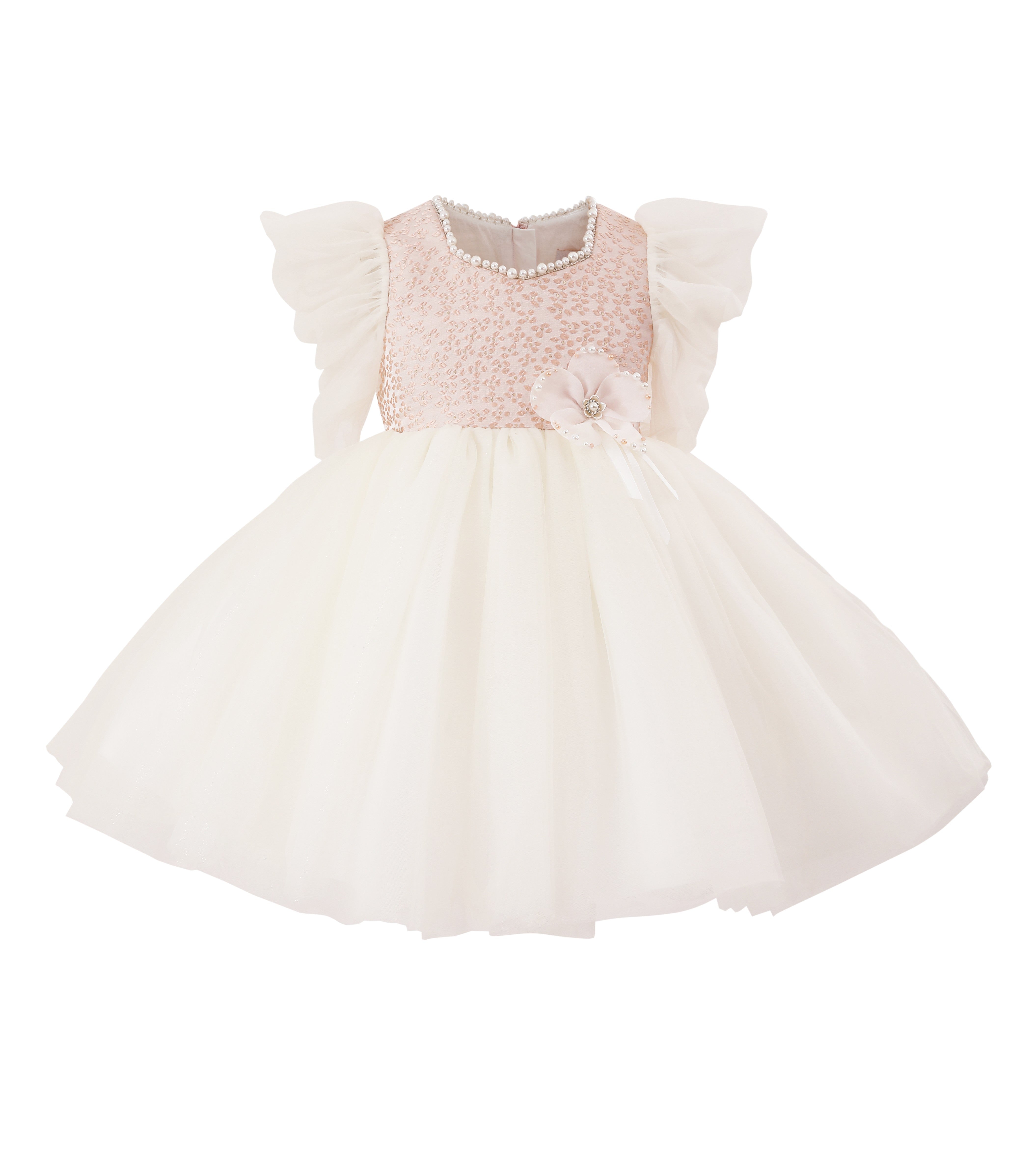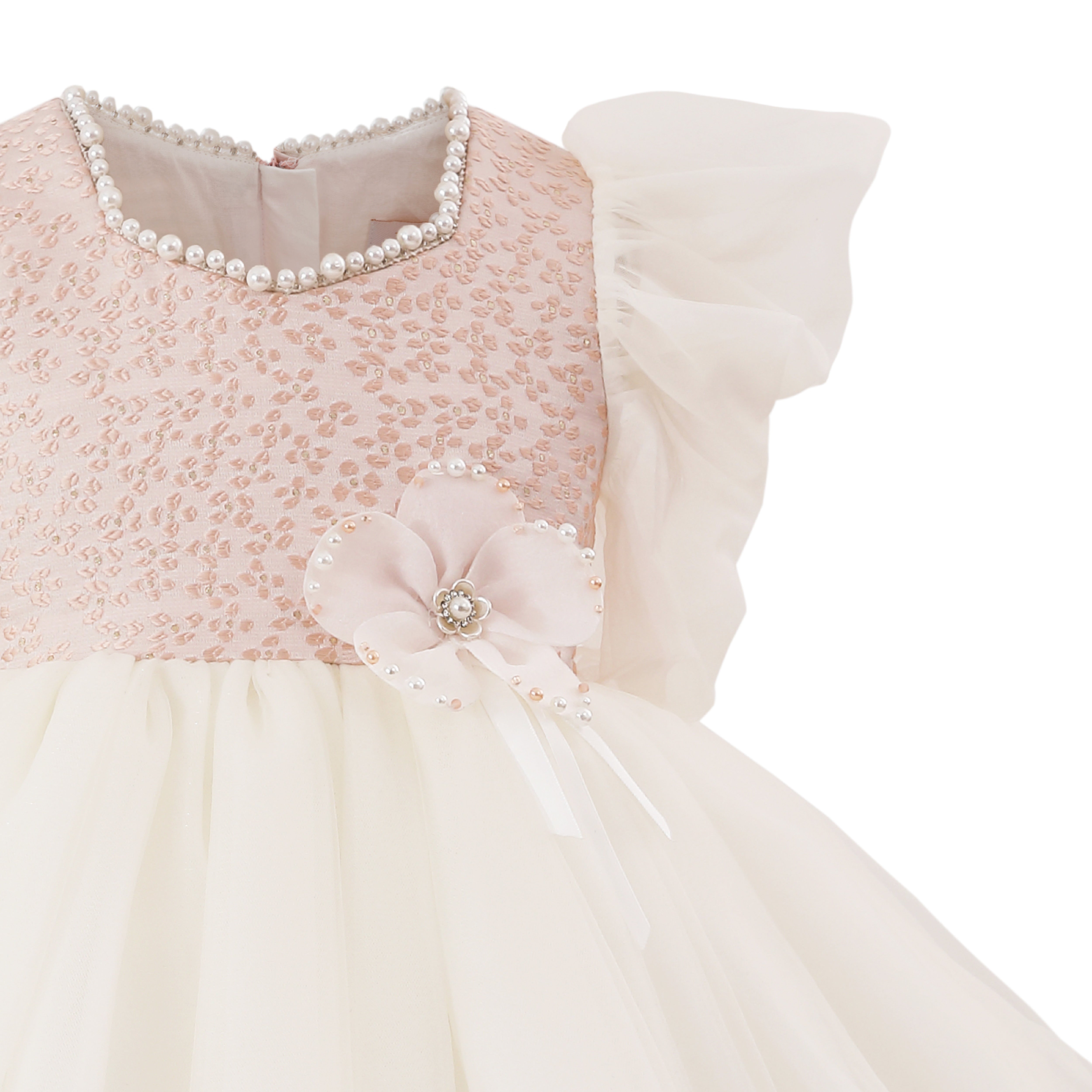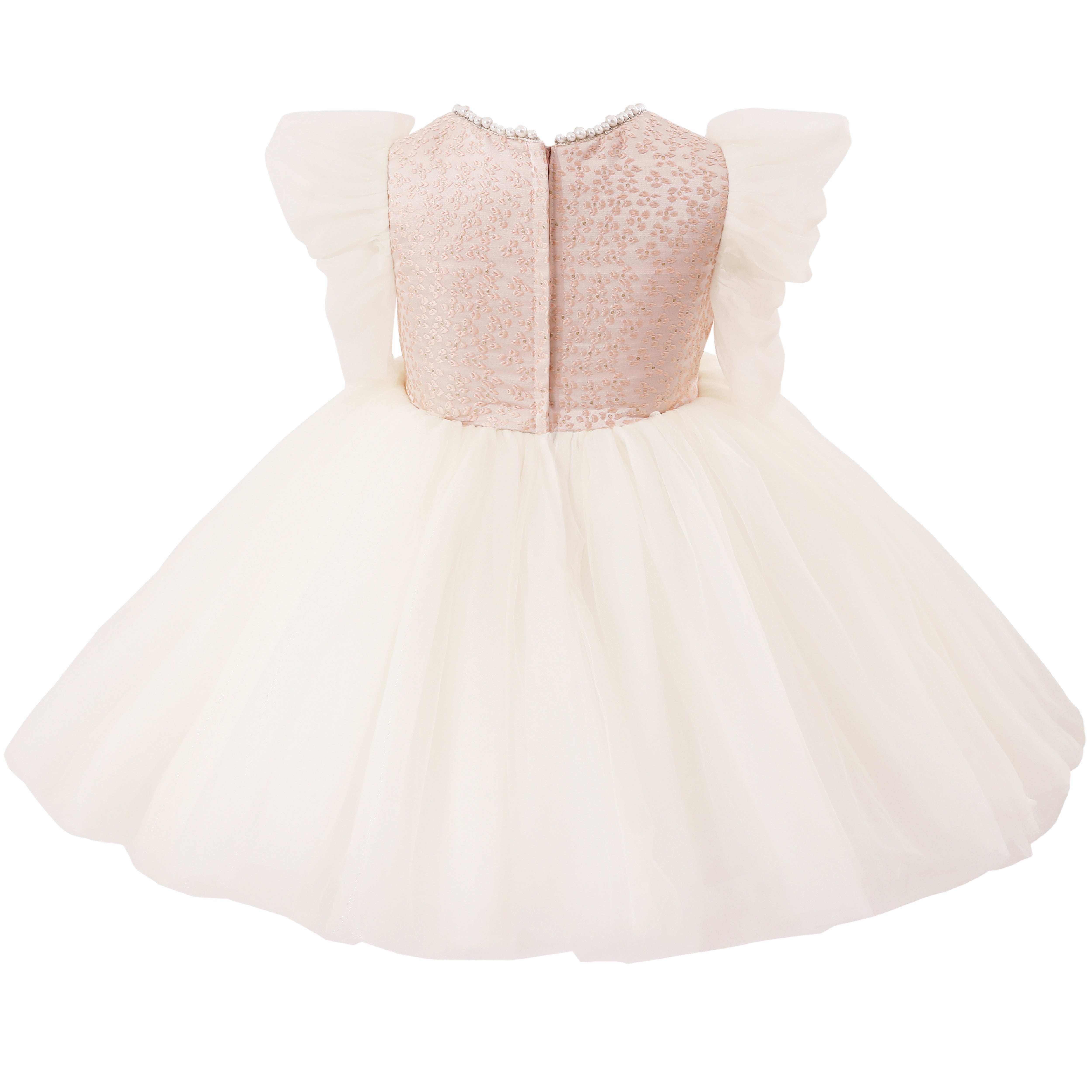 - Sequined pink bodice with pearl neckline and sheer ruffled sleeves