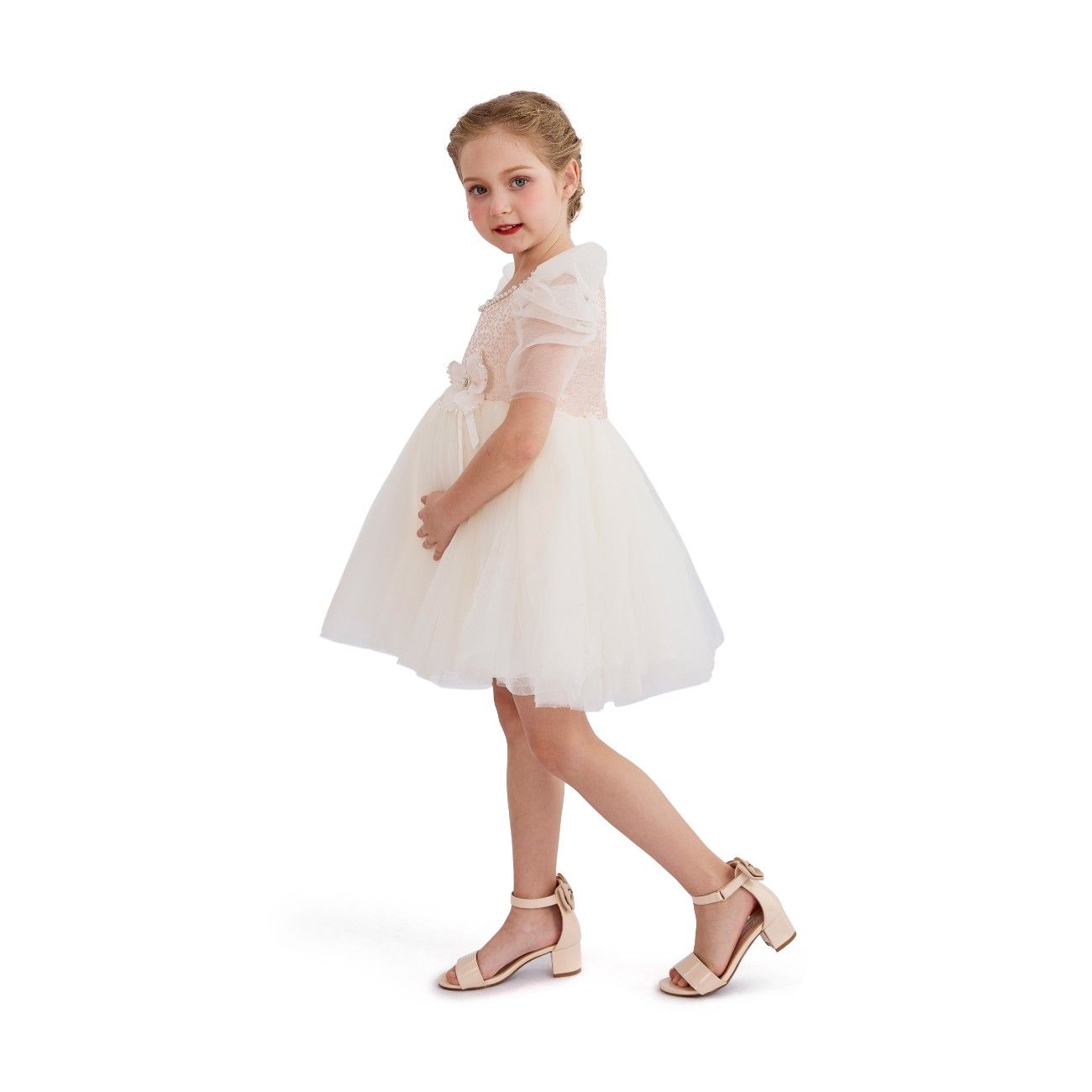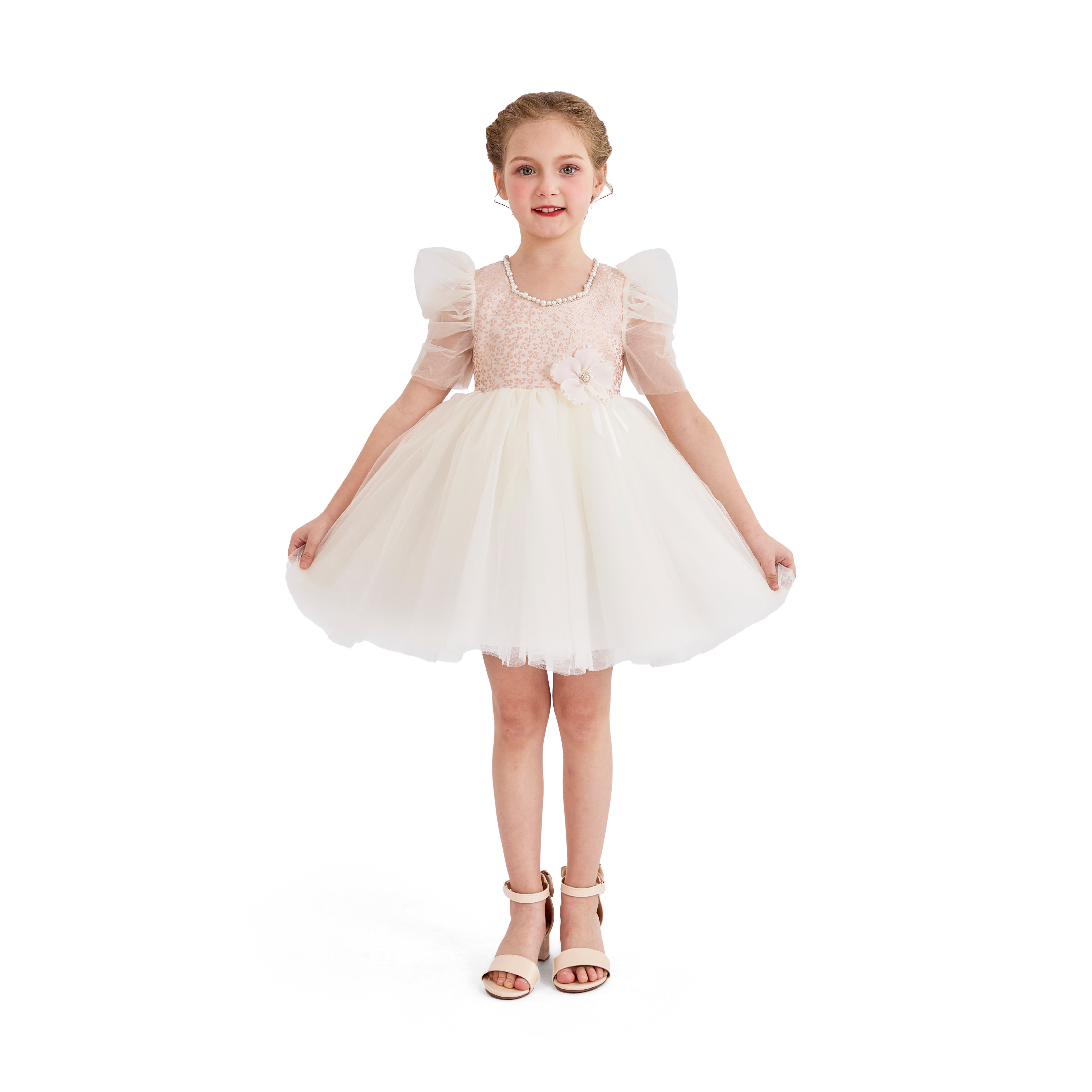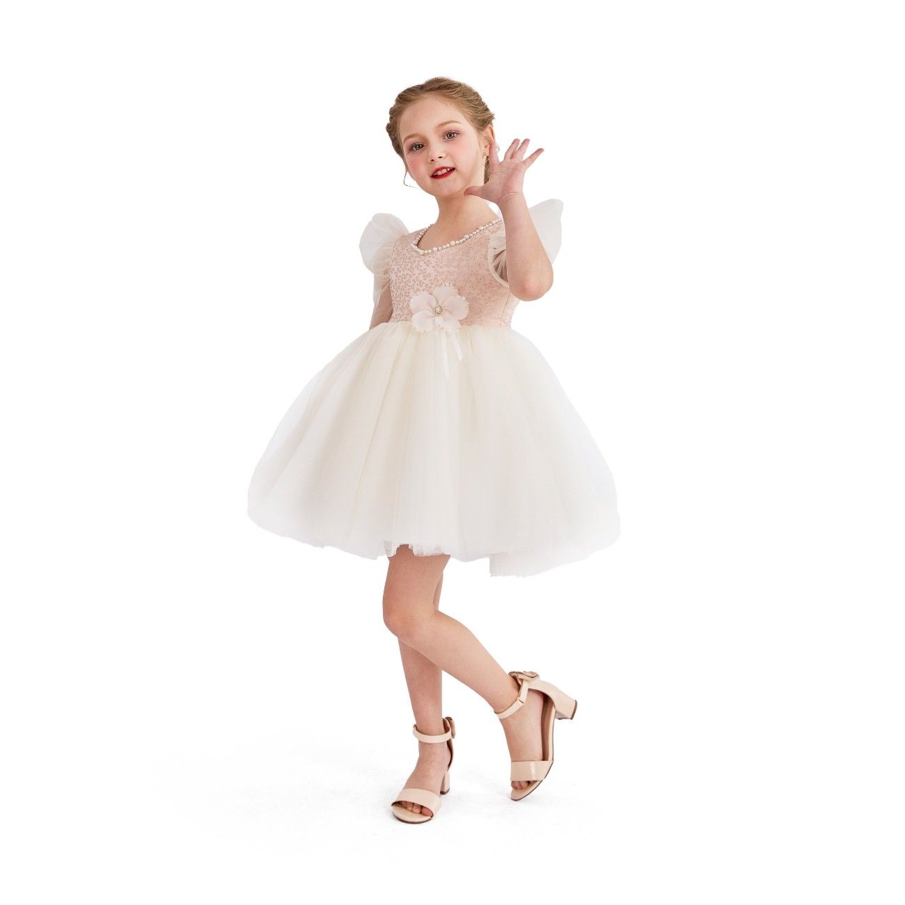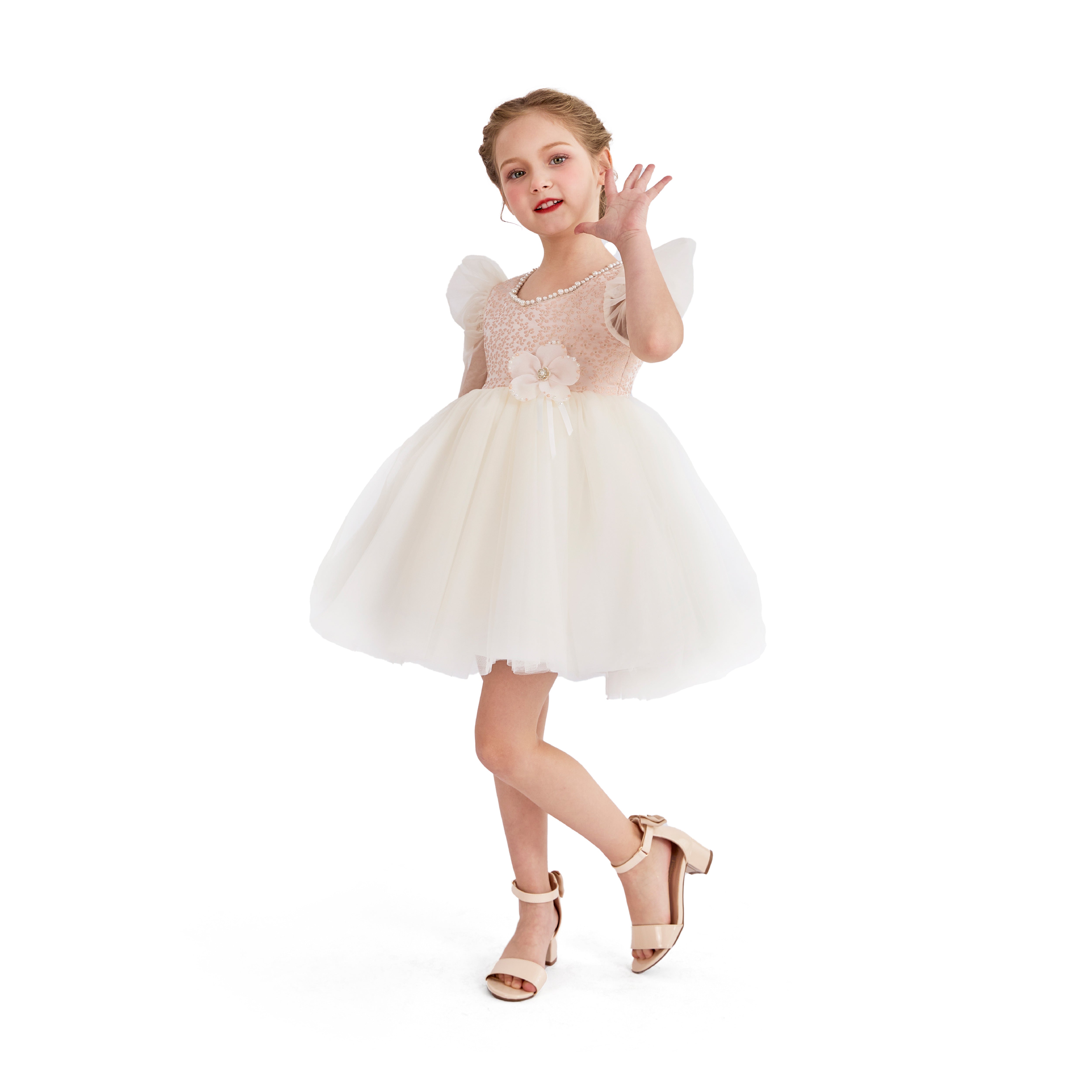 - Sequined pink bodice with pearl neckline and sheer ruffled sleeves