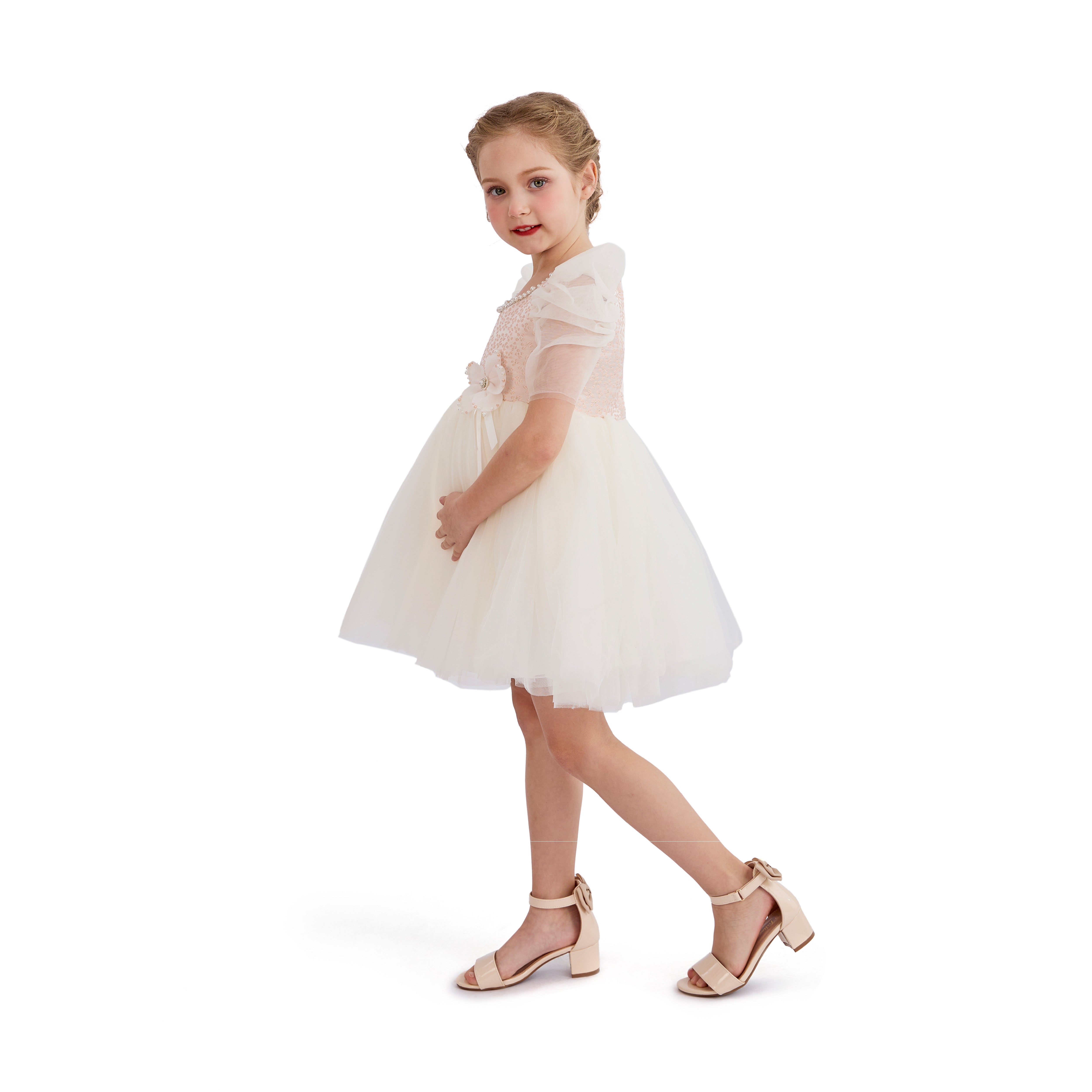 - Voluminous layered white tulle skirt accented with a delicate floral detail