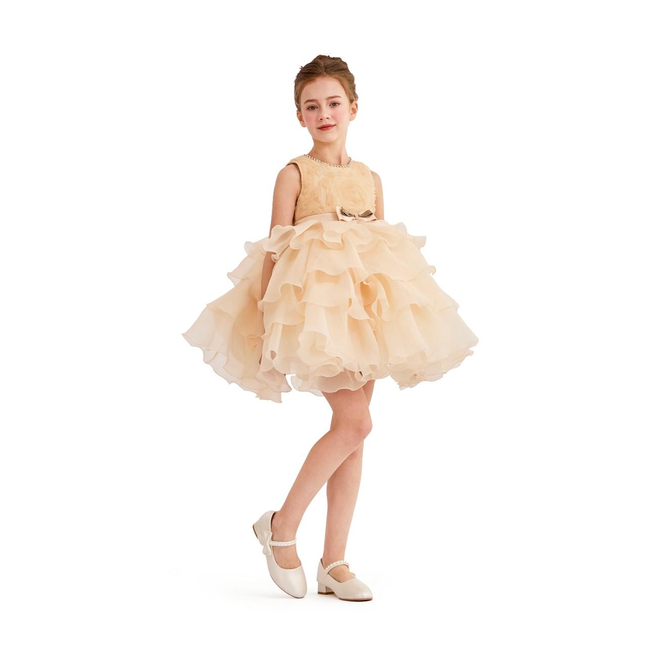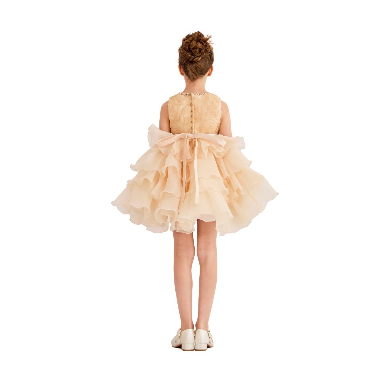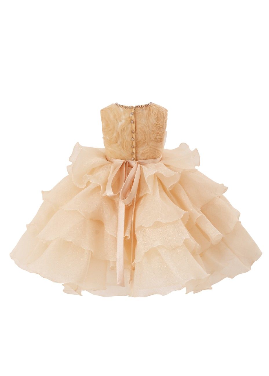 A sophisticated design with textured floral details and a dramatic layered skirt, perfect for weddings, parties, or pageants. The elegant embellishments and voluminous silhouette make it a standout choice for special celebrations.