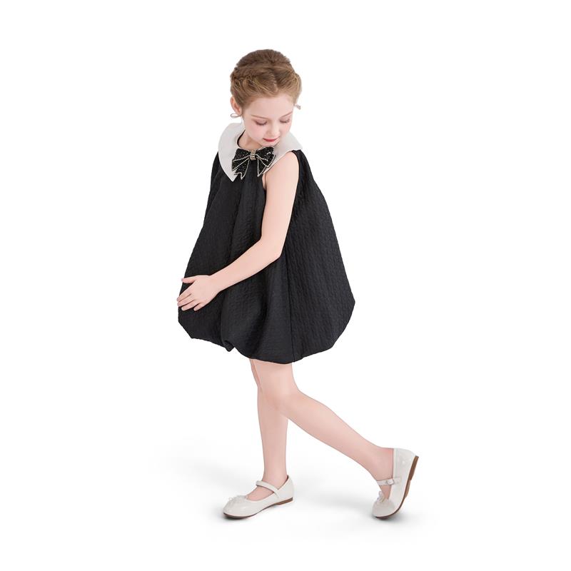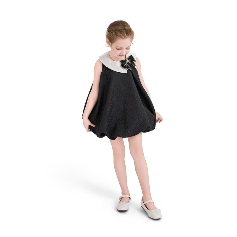 Elegantly bold, this black dress features a voluminous skirt and a sculptural white collar accented by a statement bow. The crinkled fabric adds depth, making it a standout choice for formal occasions.