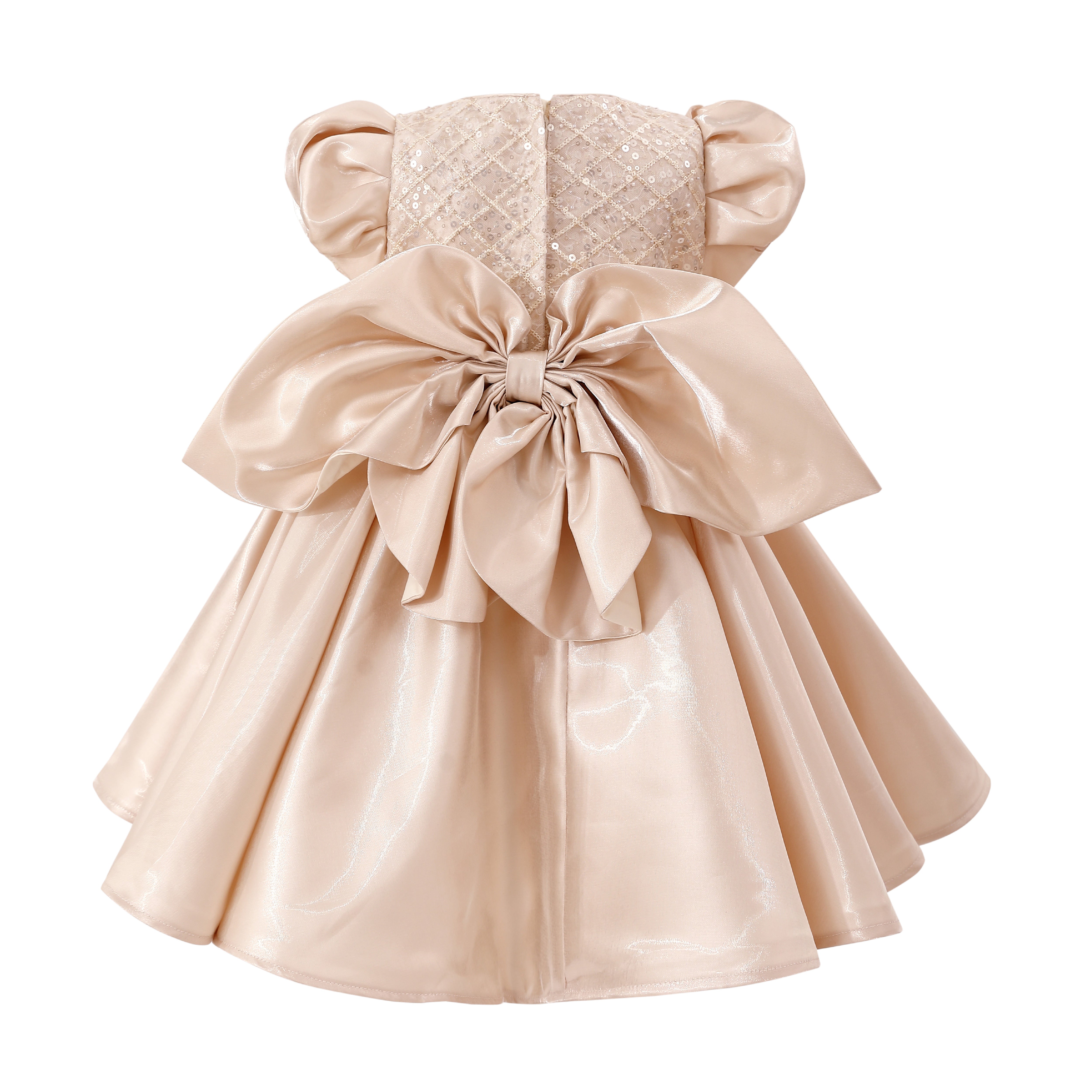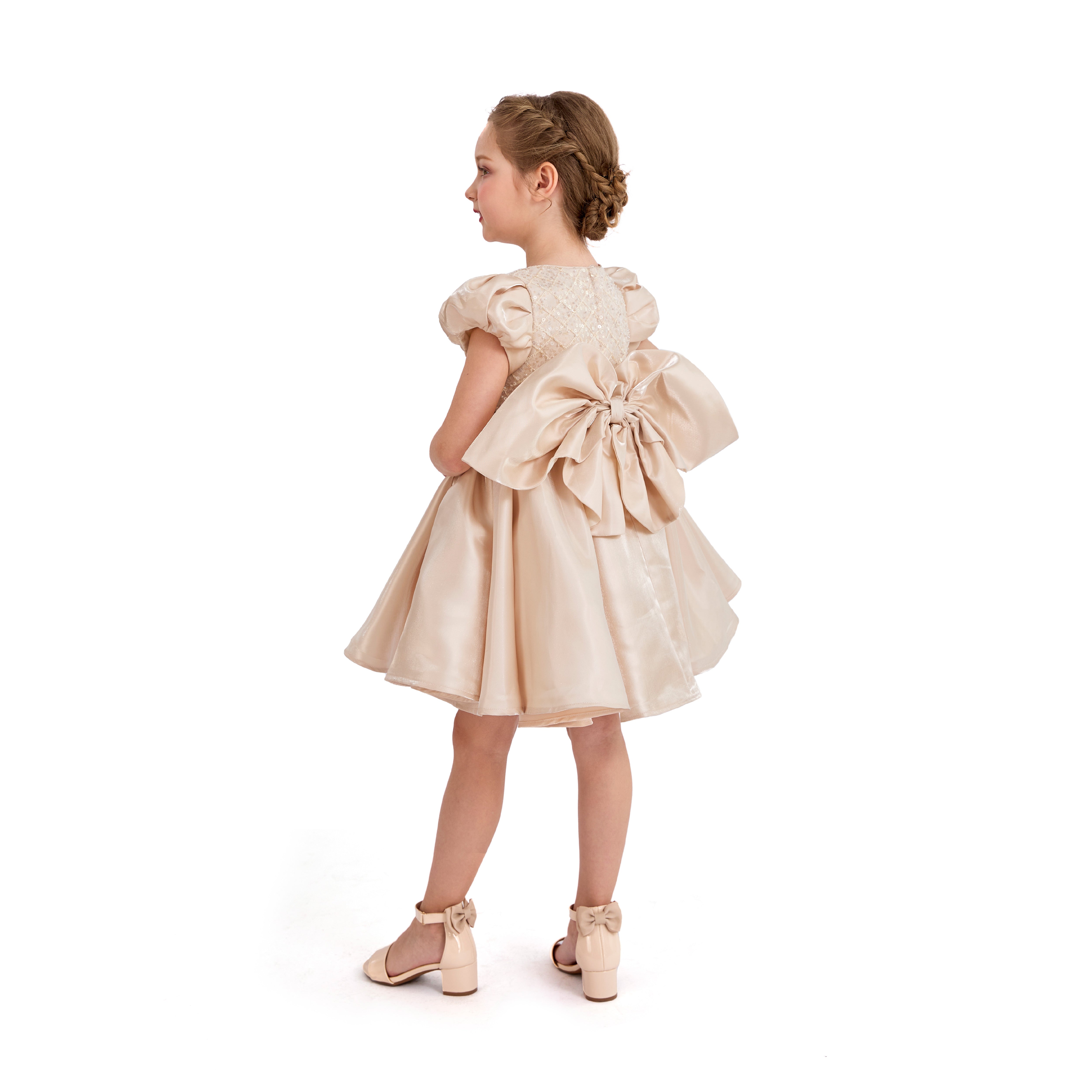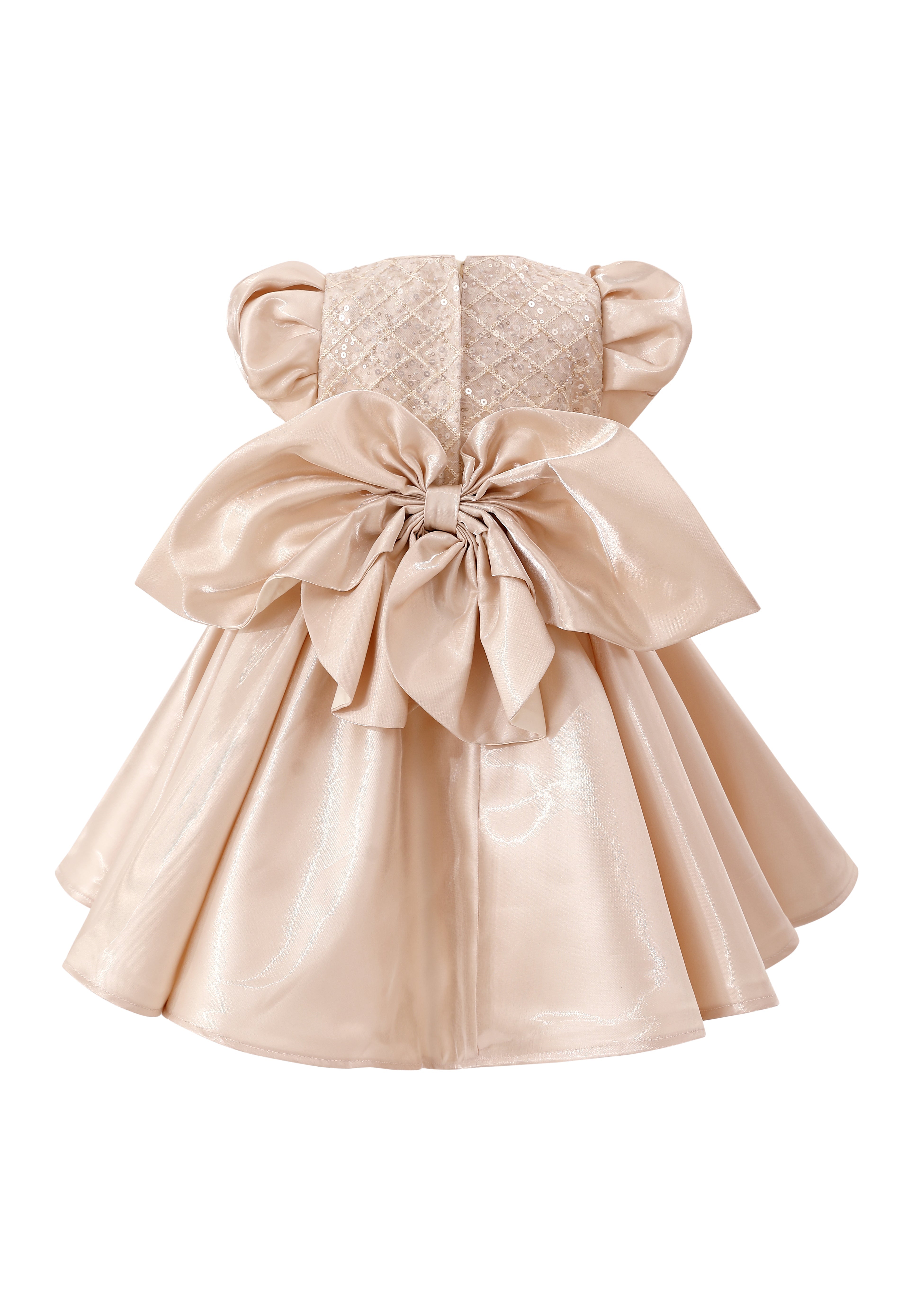 A glamorous design that shines from every angle, with its quilted sequin bodice and voluminous satin skirt. The dramatic bow at the back adds a statement finish, making it perfect for weddings, birthdays, or formal celebrations.