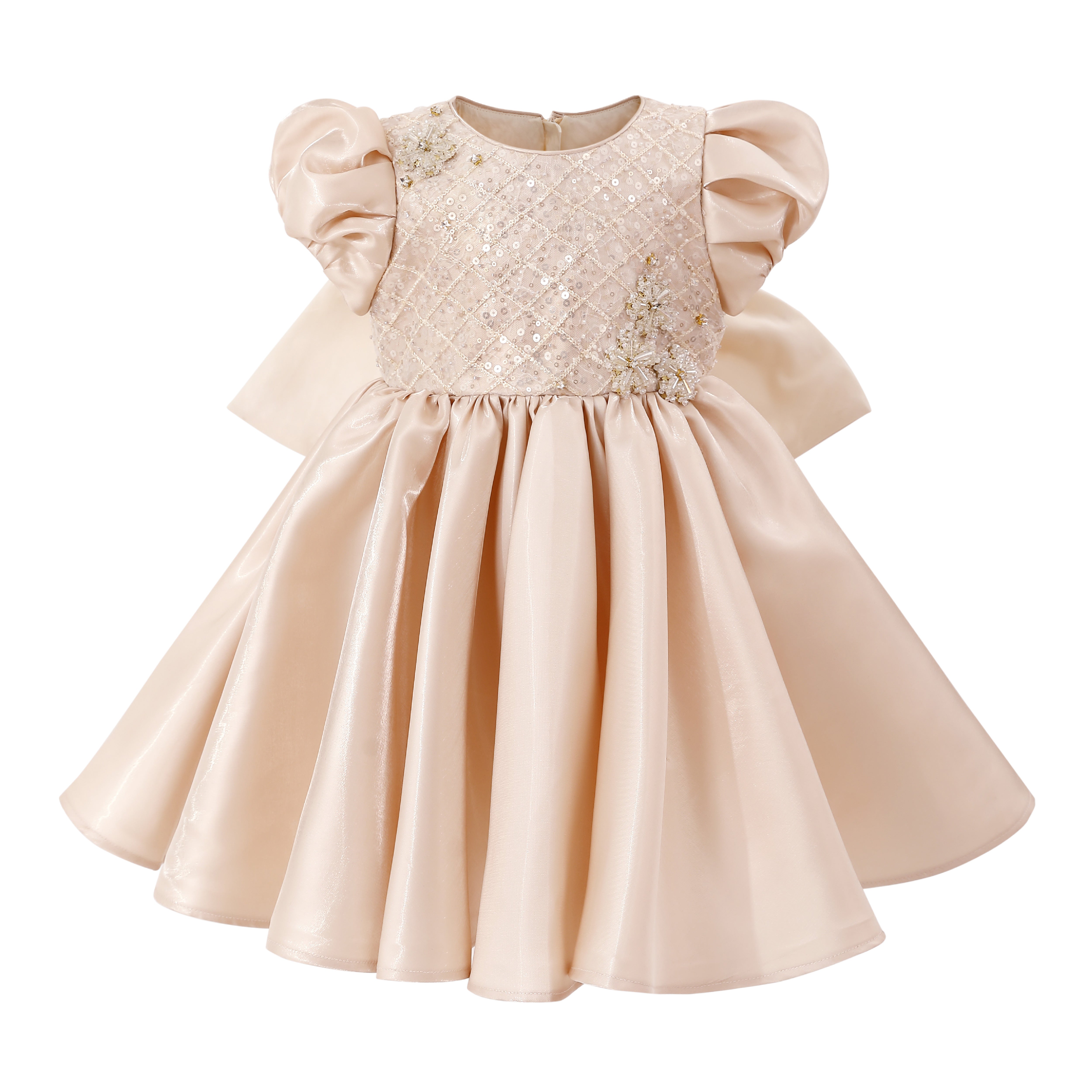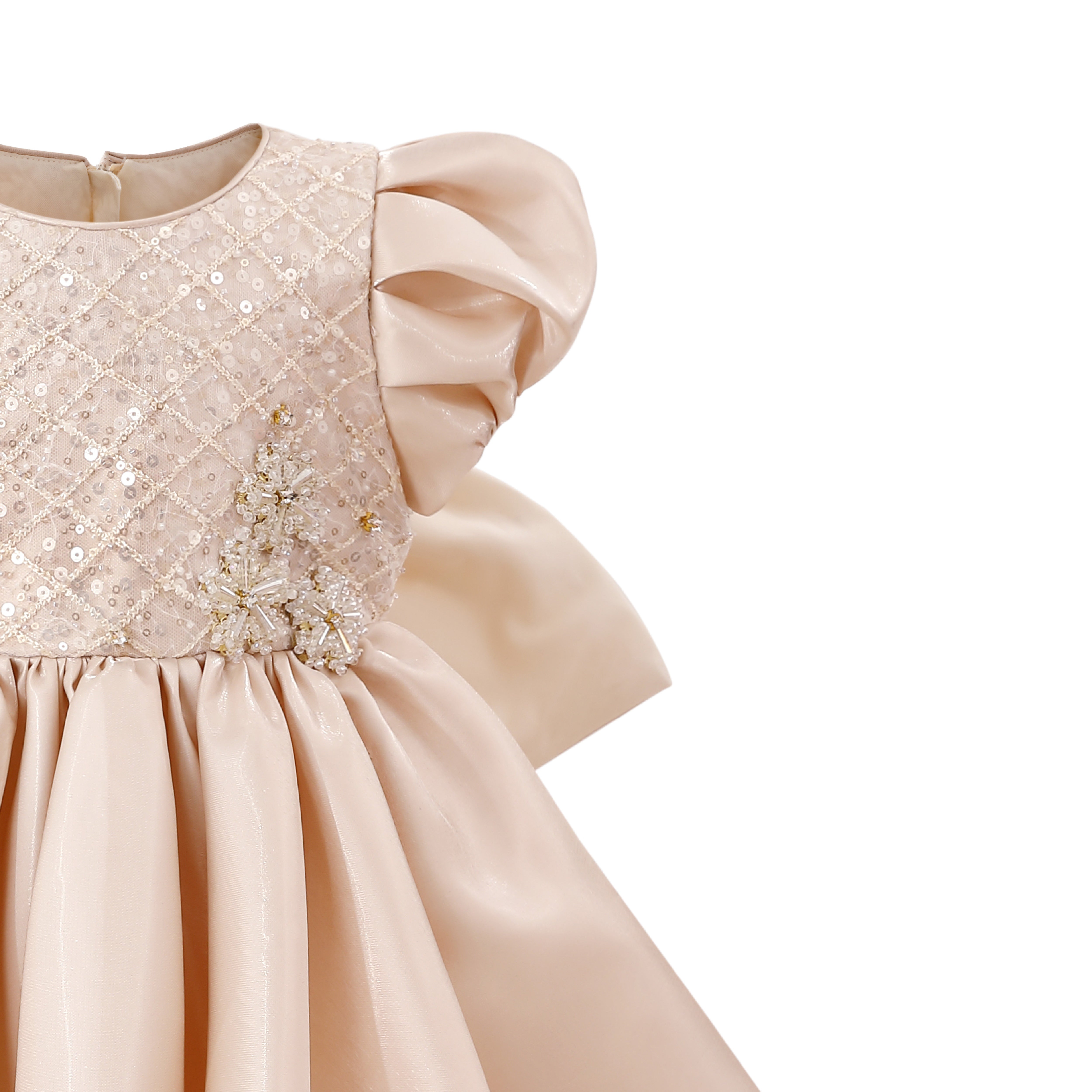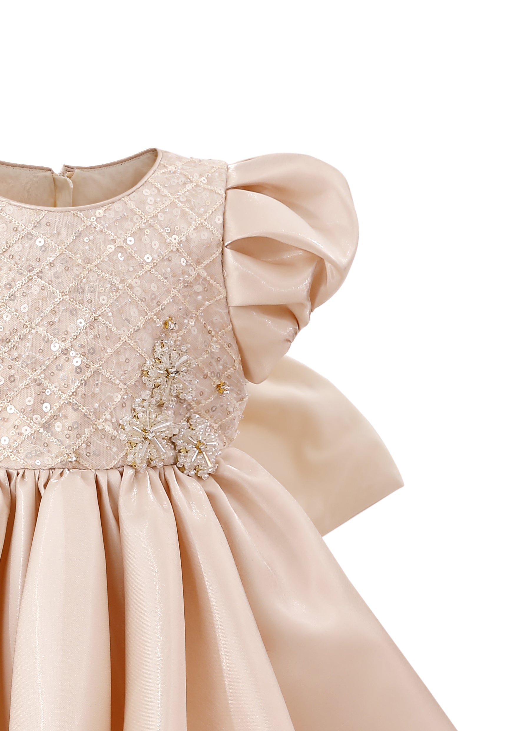 A glamorous design that shines from every angle, with its quilted sequin bodice and voluminous satin skirt. The dramatic bow at the back adds a statement finish, making it perfect for weddings, birthdays, or formal celebrations.