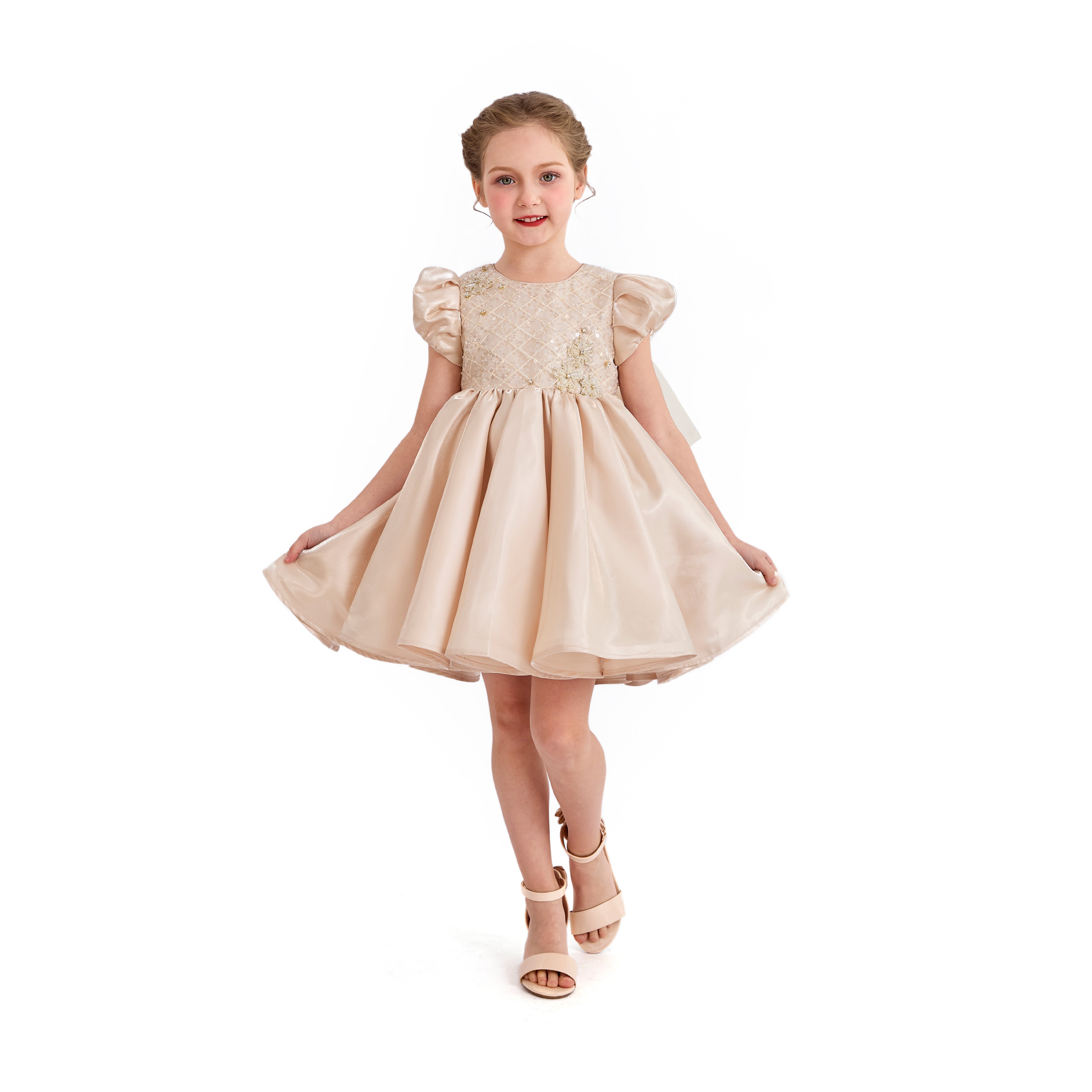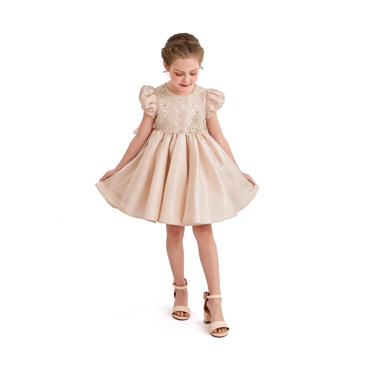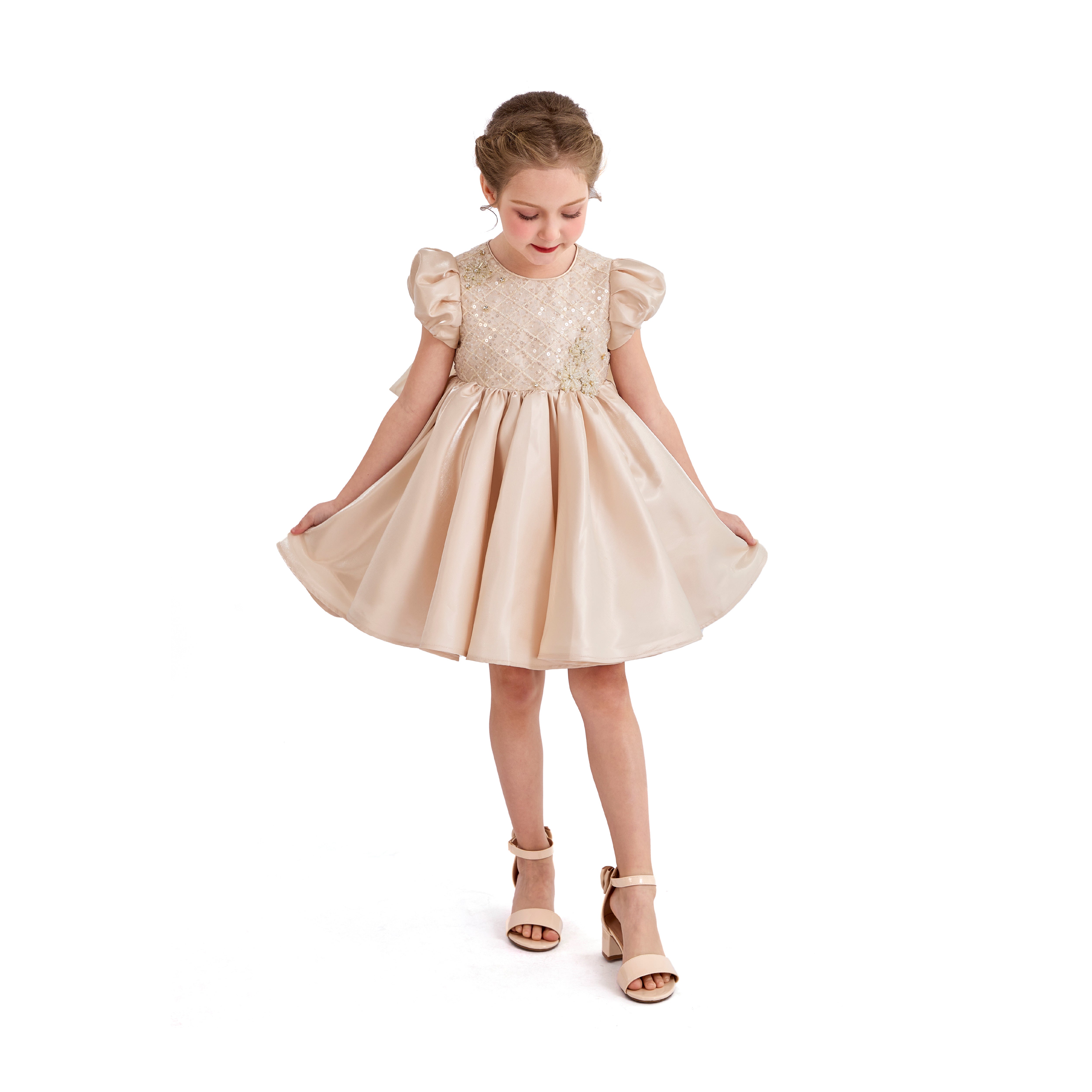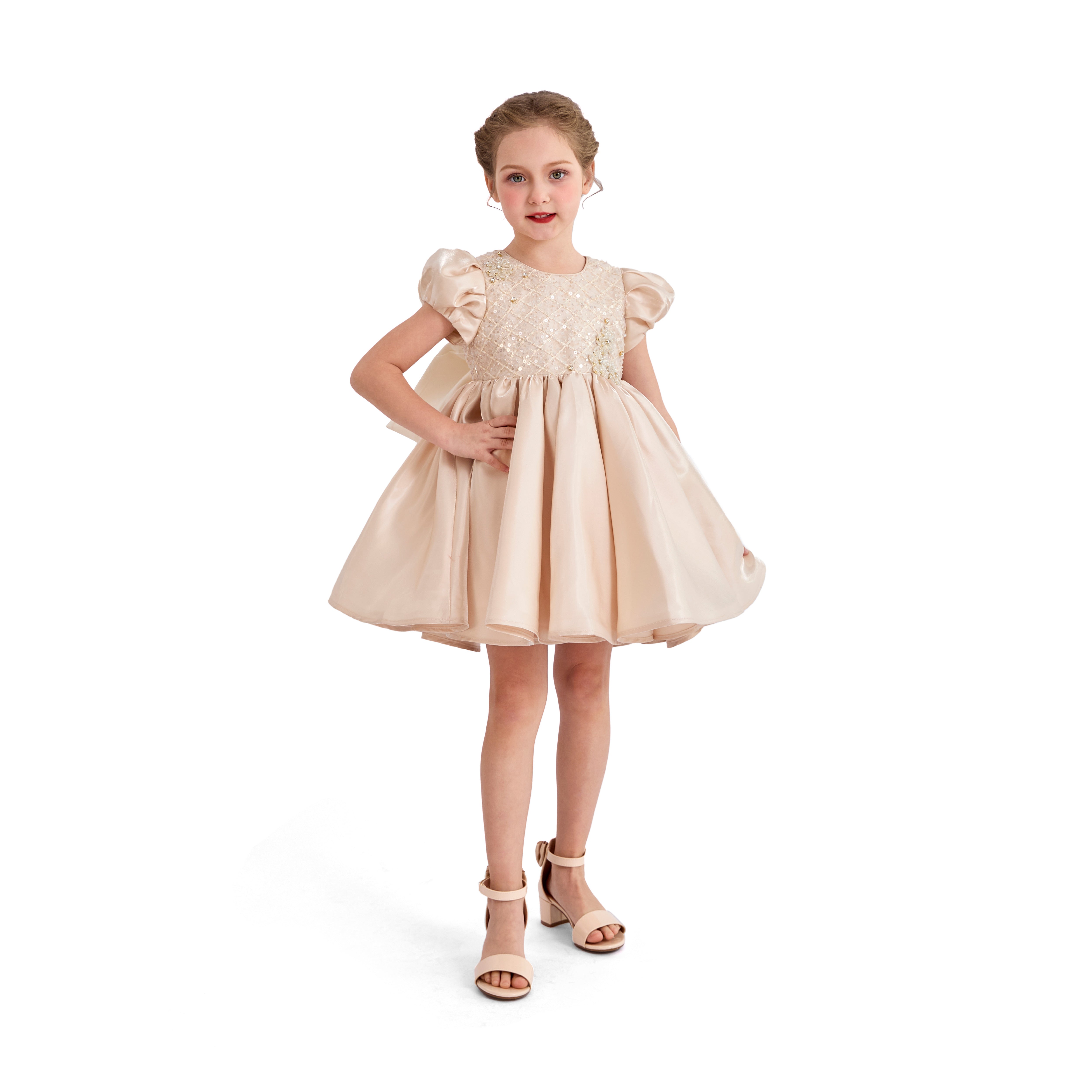 - Puffy short sleeves and sparkling quilted bodice for a refined look