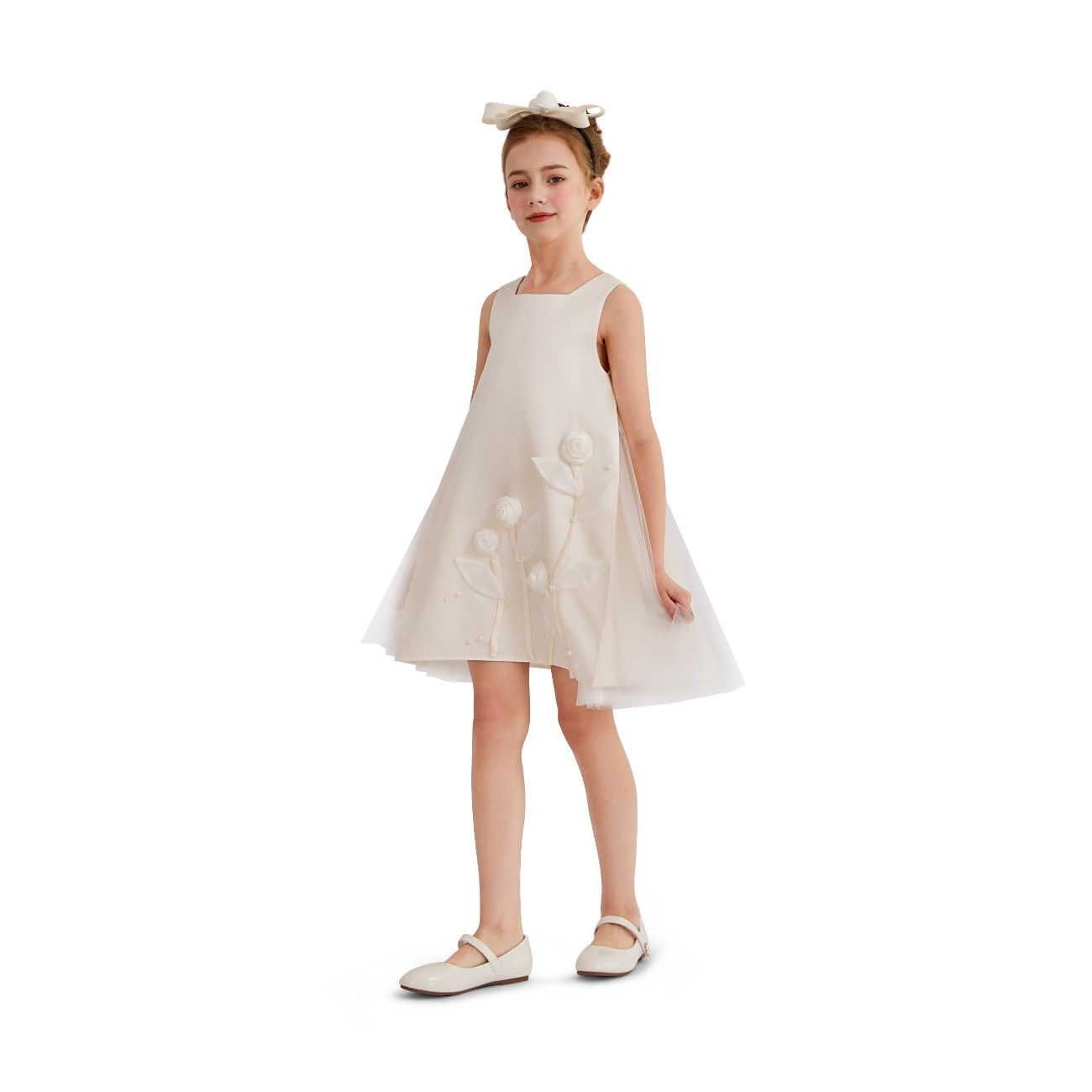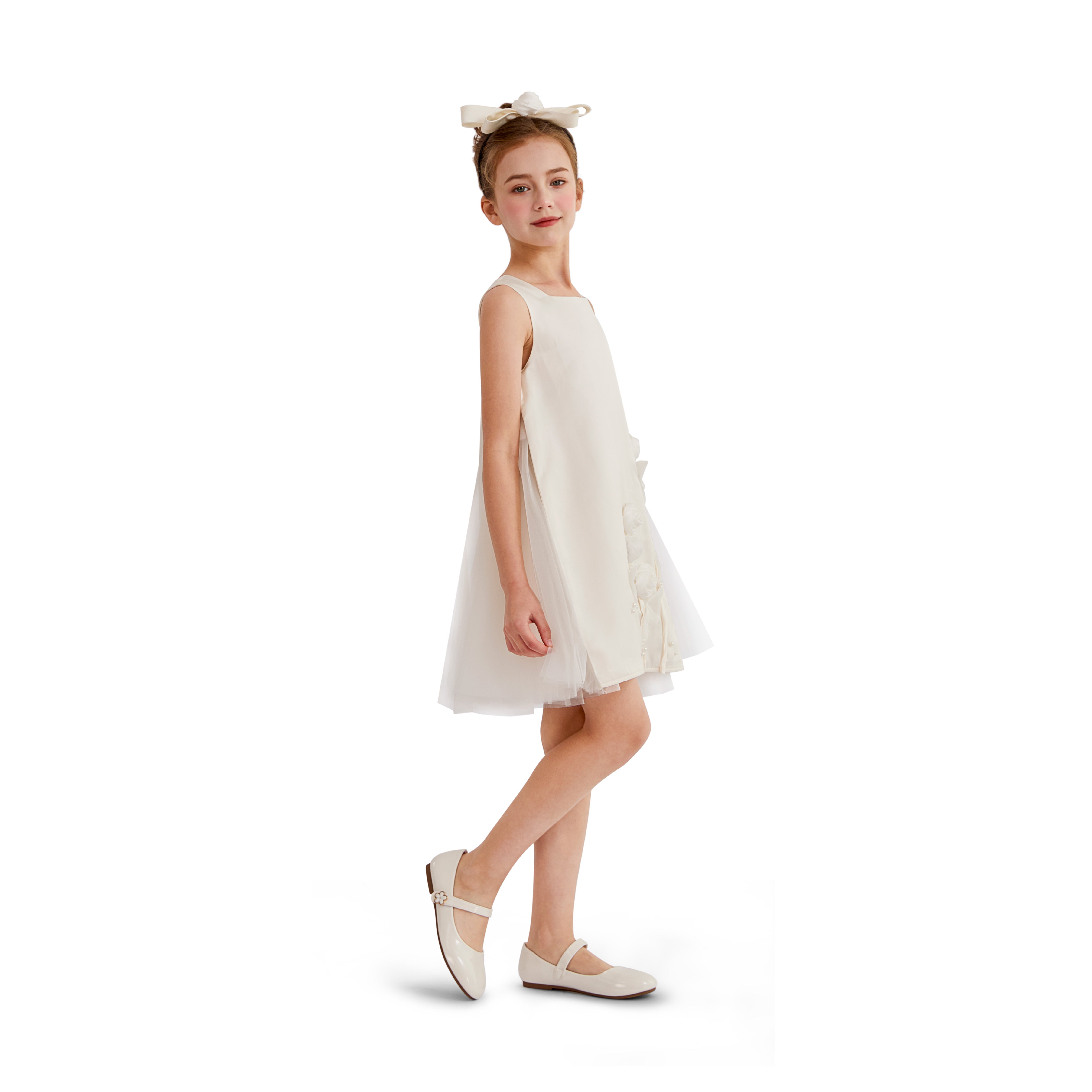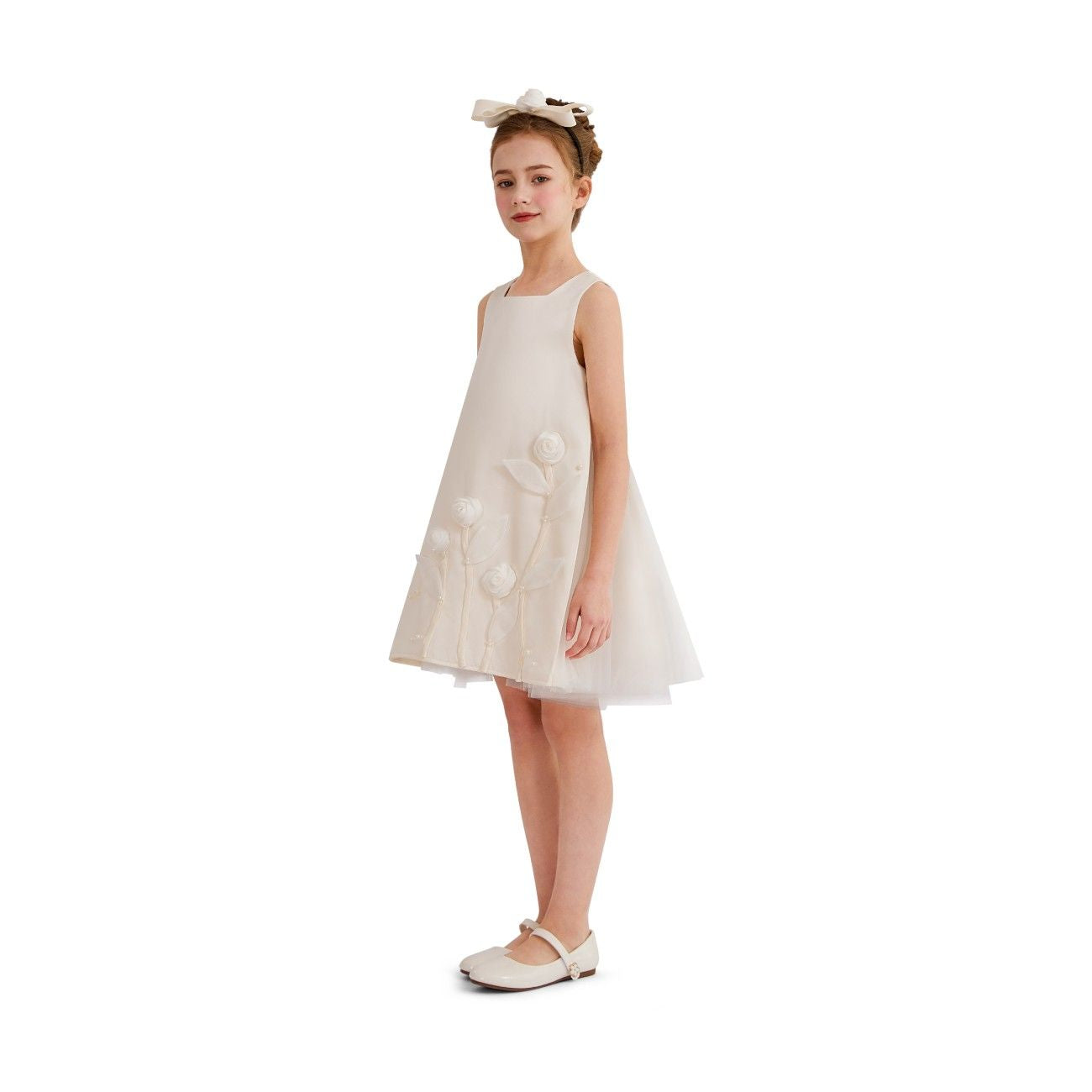 A graceful occasion piece designed with delicate detailing and soft elegance, perfect for weddings, christenings, or formal celebrations. The floral embellishments and sheer overlays add a refined touch to its timeless silhouette.