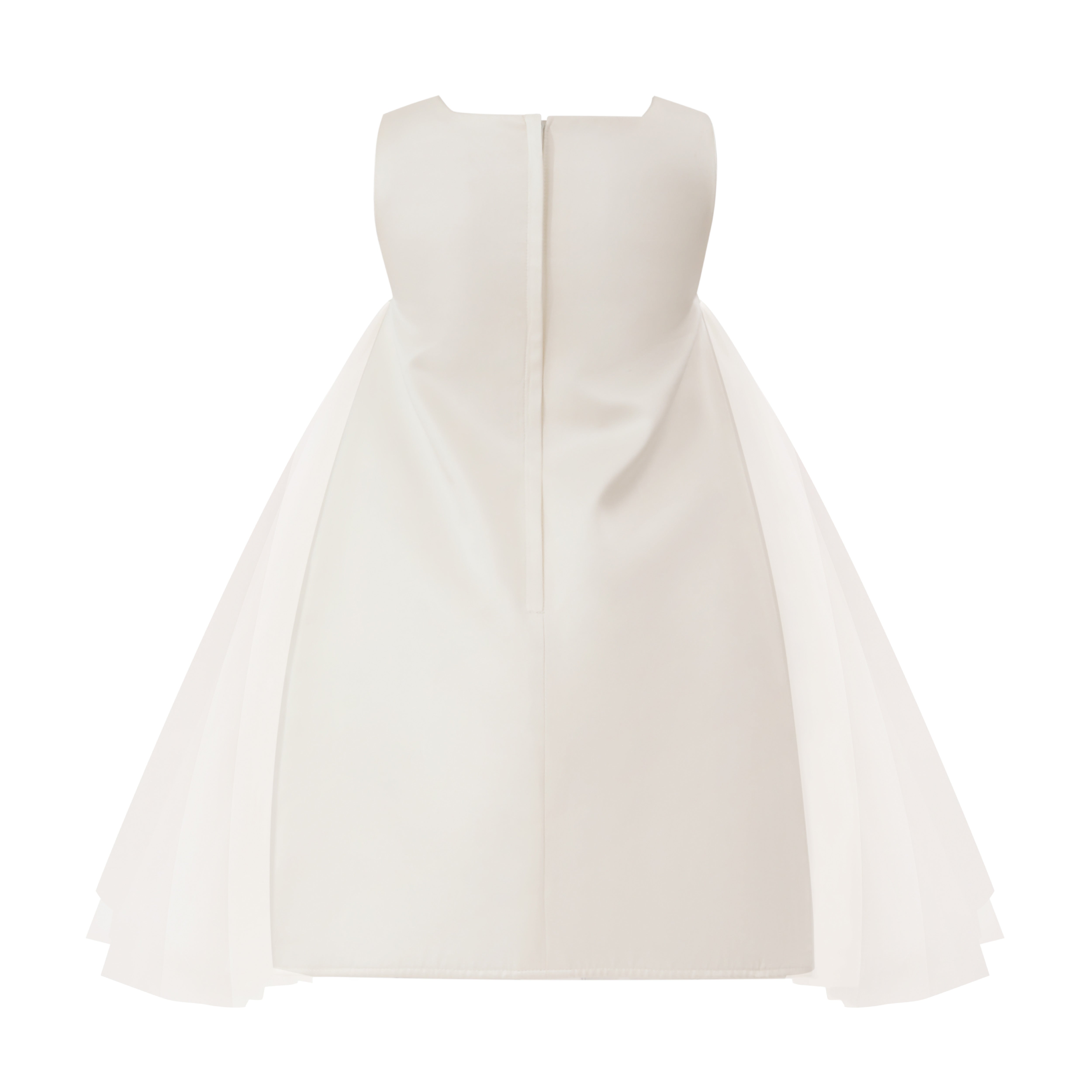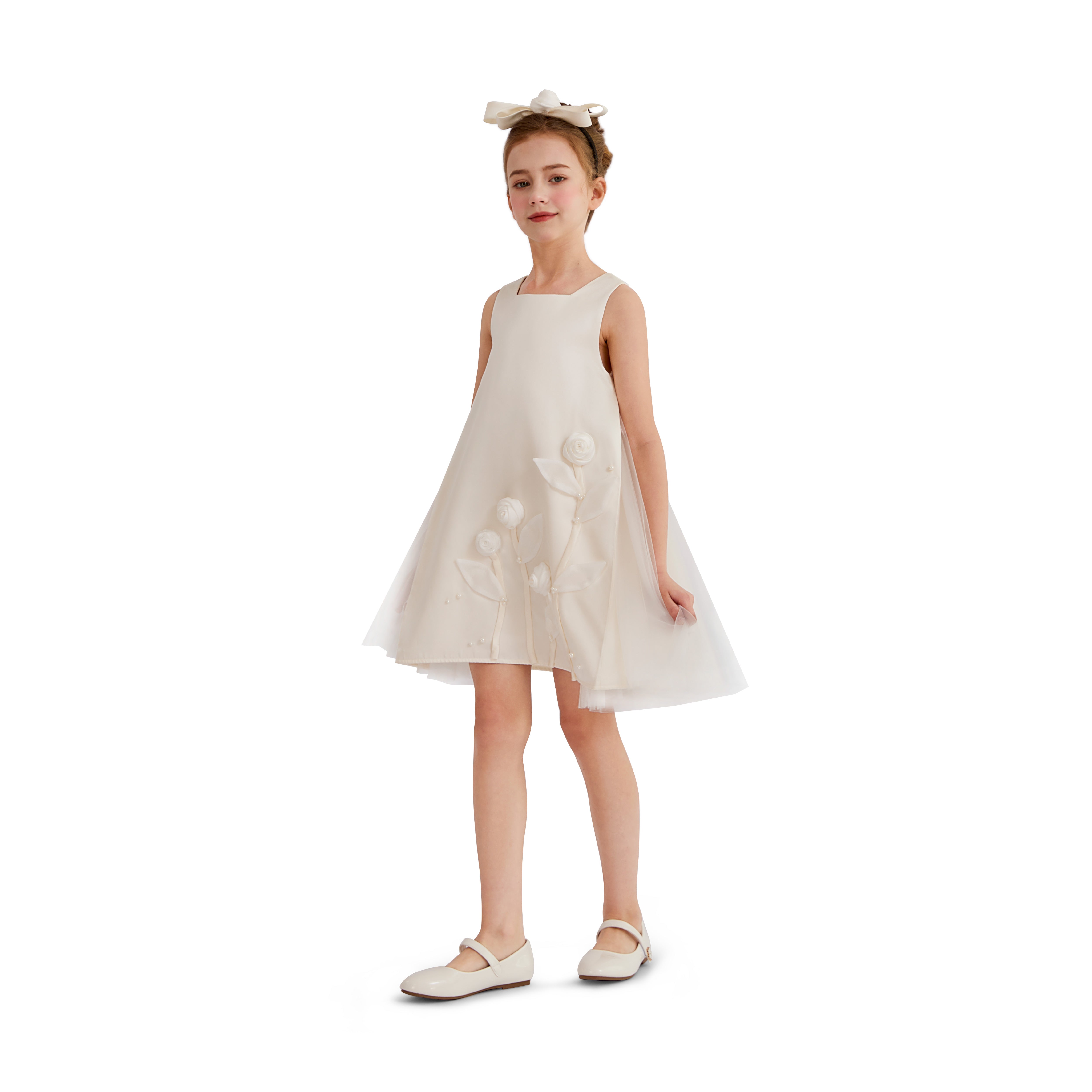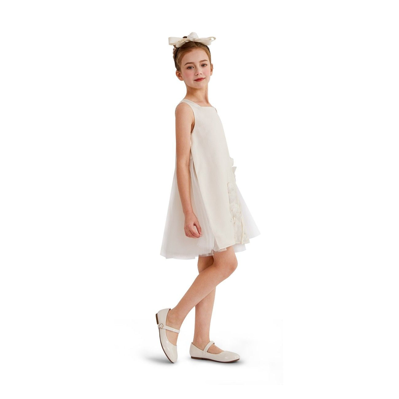 A graceful occasion piece designed with delicate detailing and soft elegance, perfect for weddings, christenings, or formal celebrations. The floral embellishments and sheer overlays add a refined touch to its timeless silhouette.