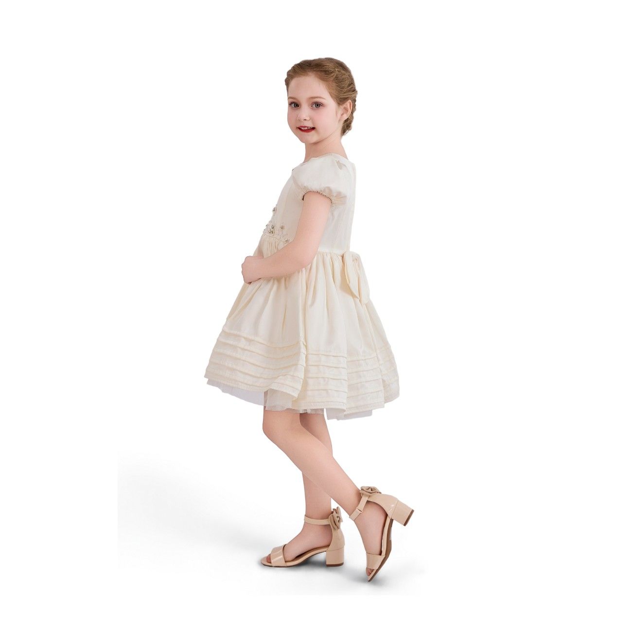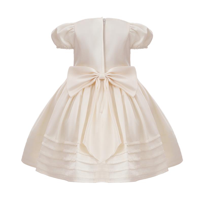 A timeless silhouette for baby's most elegant moments—this dress blends delicate floral embellishments with soft pleats and puffed sleeves for a refined, classic look.
