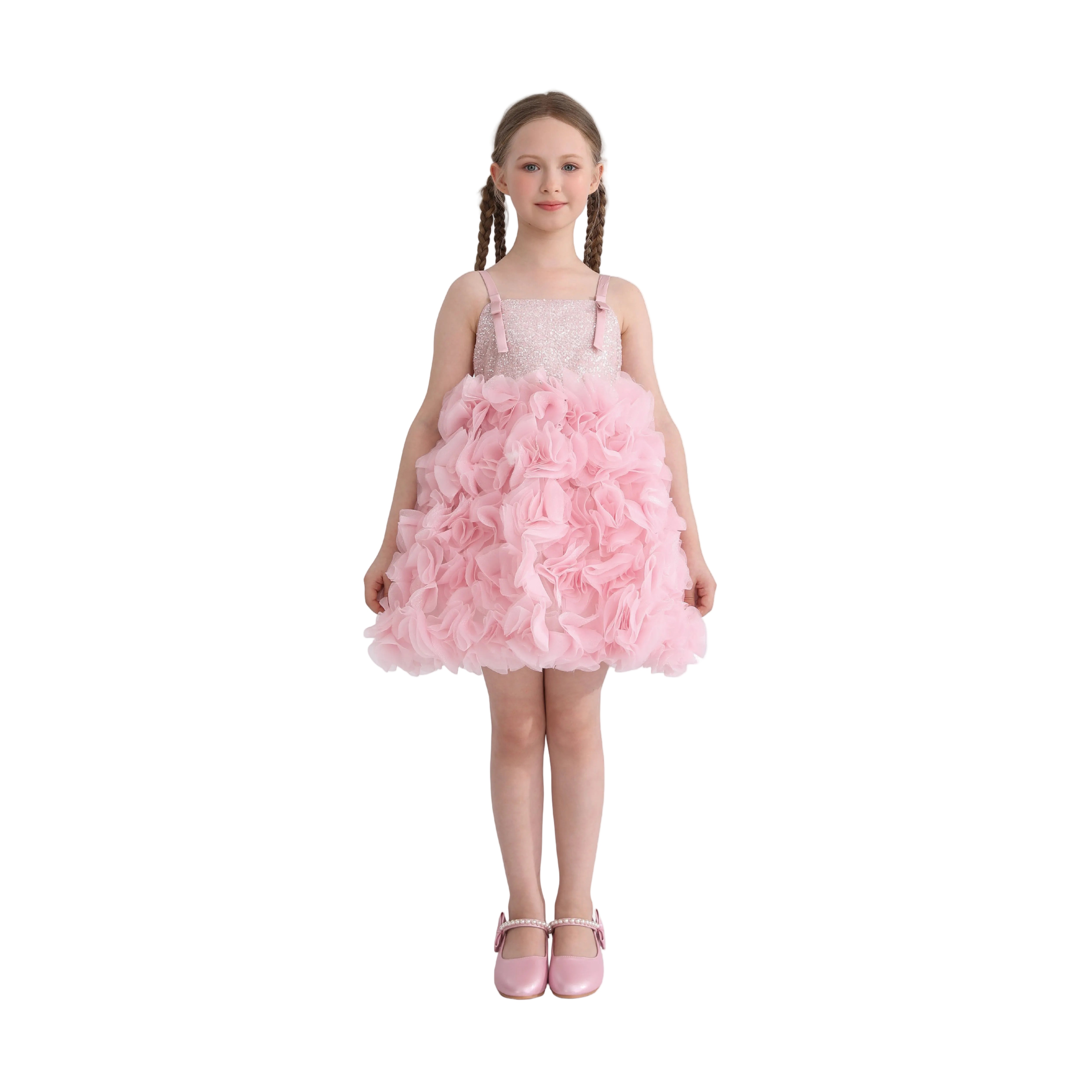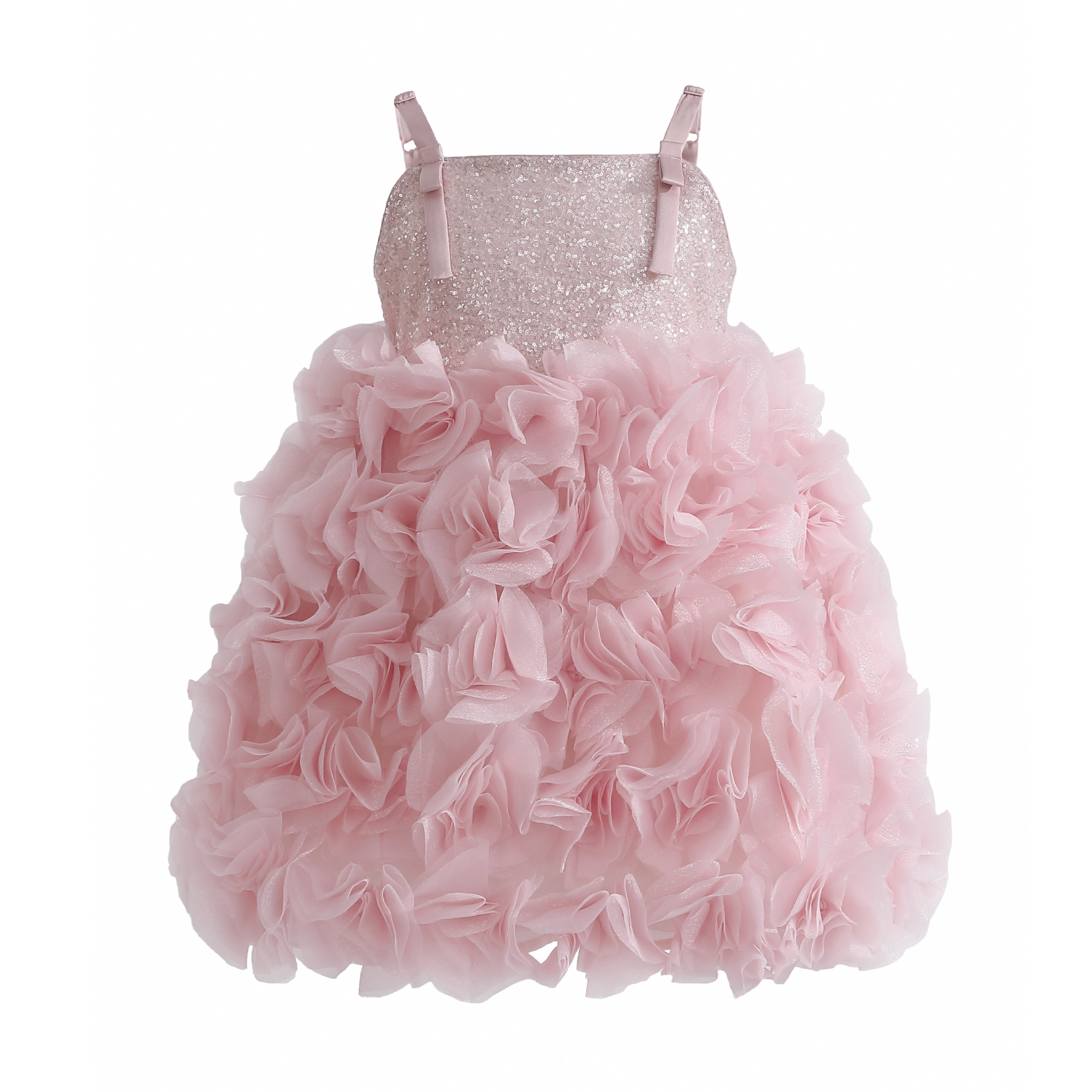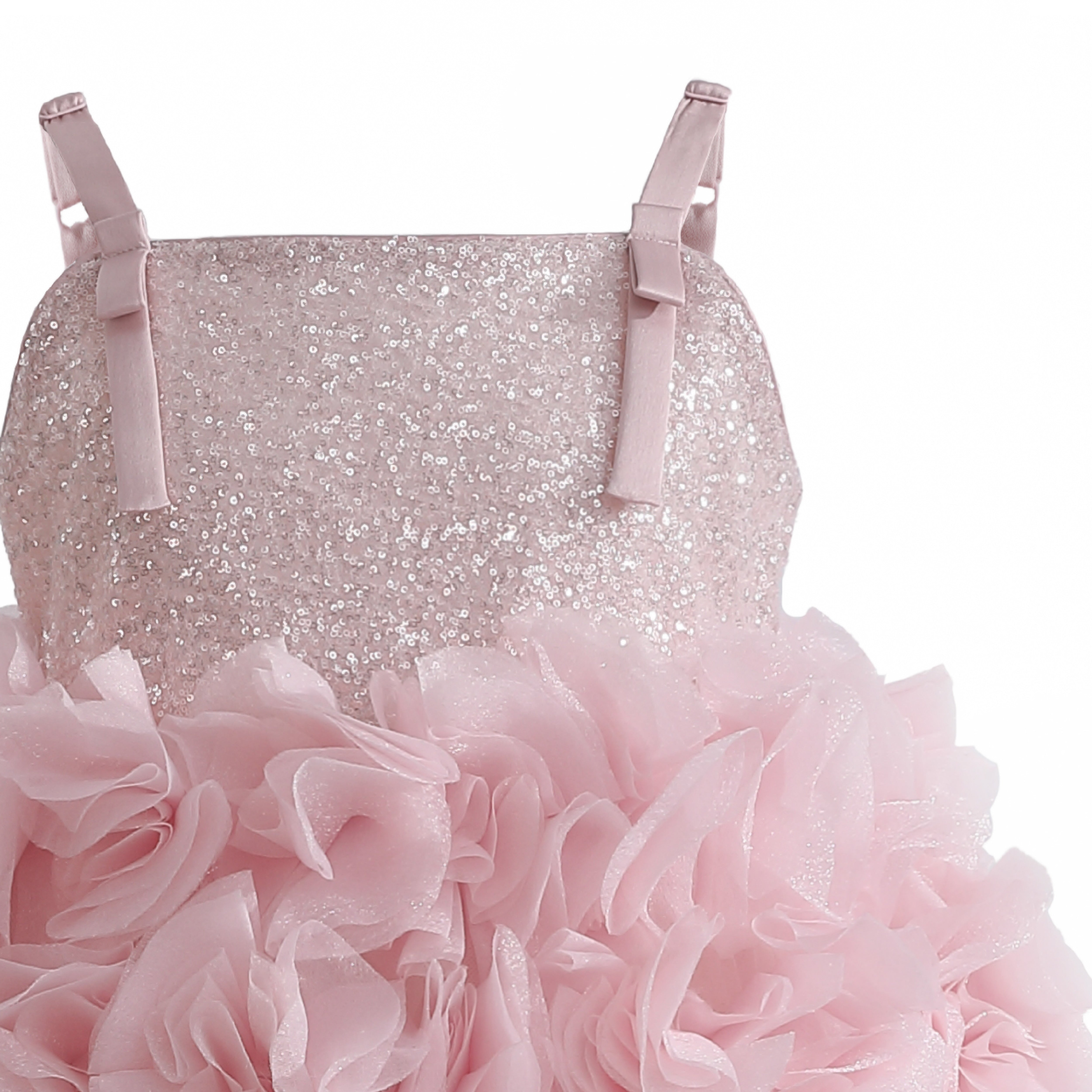 A stunning formal dress with a shimmering glitter bodice and delicate thin straps. The voluminous skirt is adorned with cascading ruffled layers, creating a floral-inspired texture that makes this gown perfect for weddings, parties, or pageants.