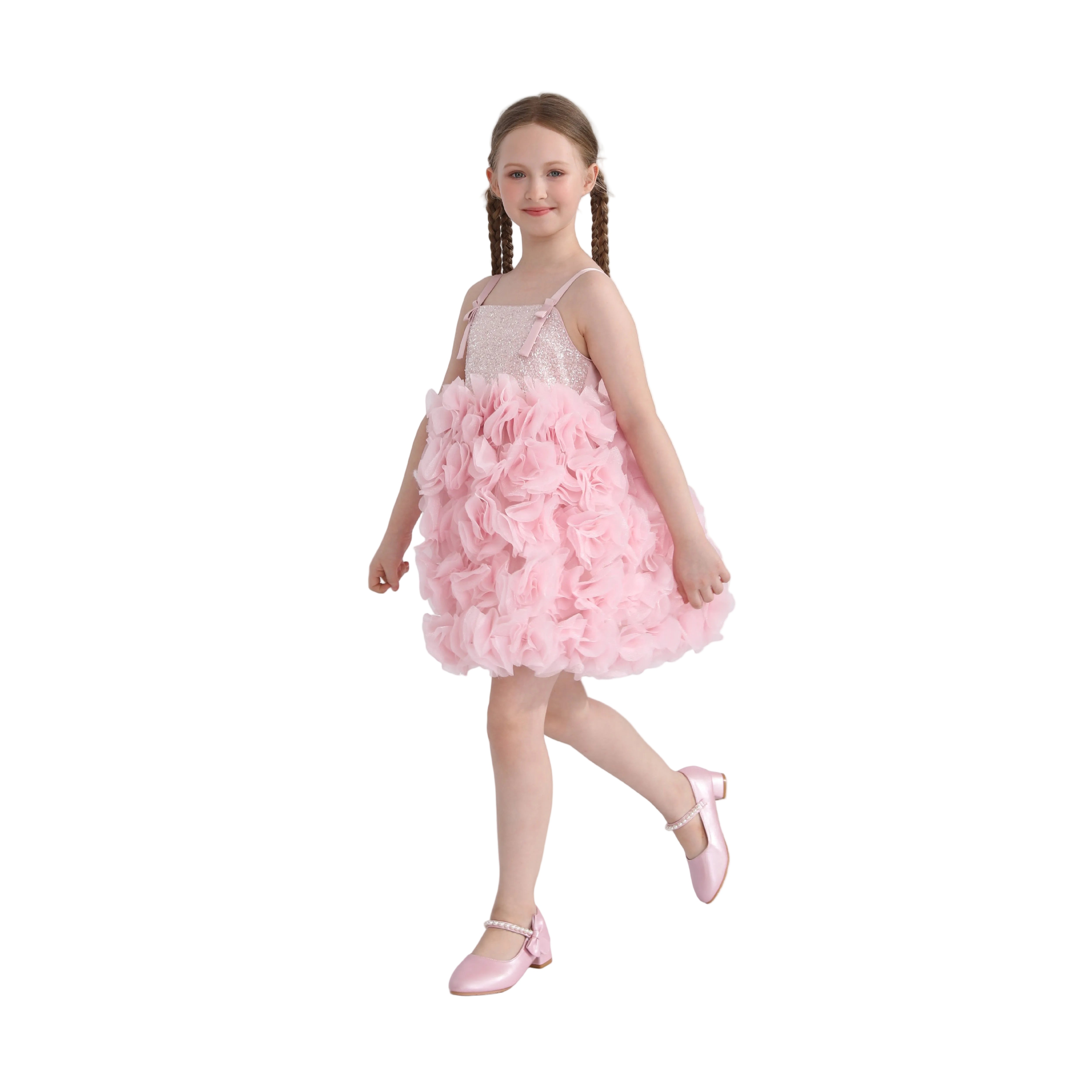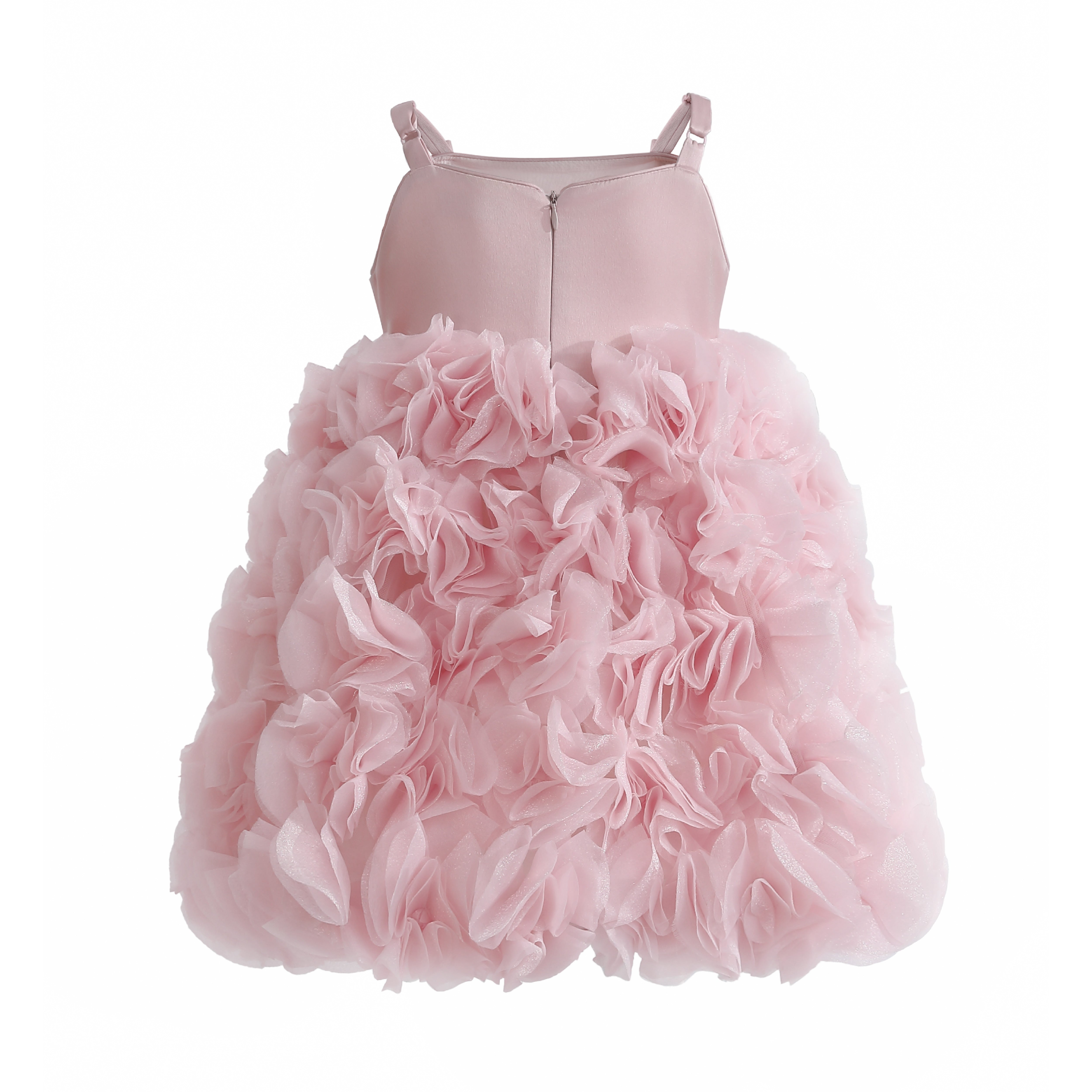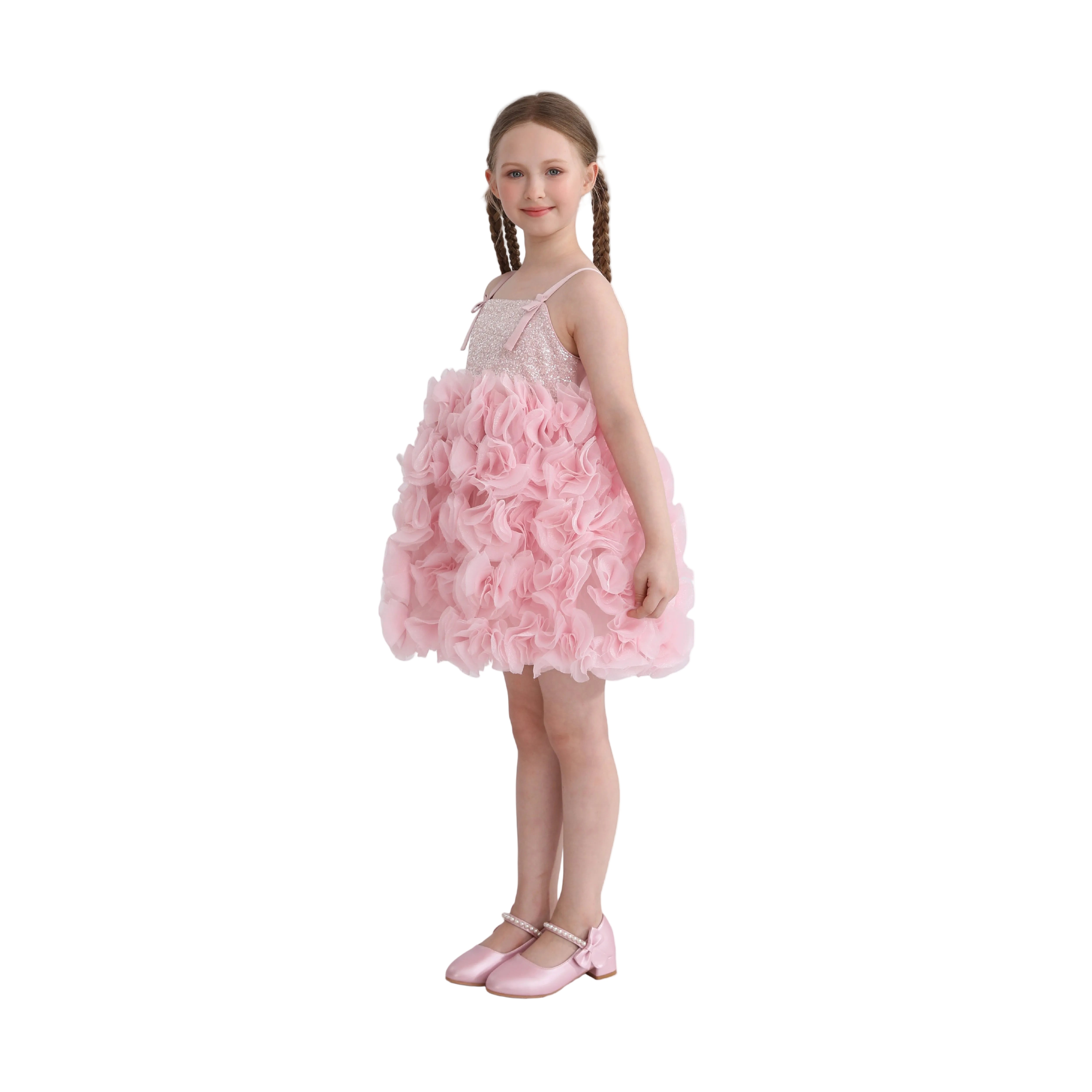 A stunning formal dress with a shimmering glitter bodice and delicate thin straps. The voluminous skirt is adorned with cascading ruffled layers, creating a floral-inspired texture that makes this gown perfect for weddings, parties, or pageants.