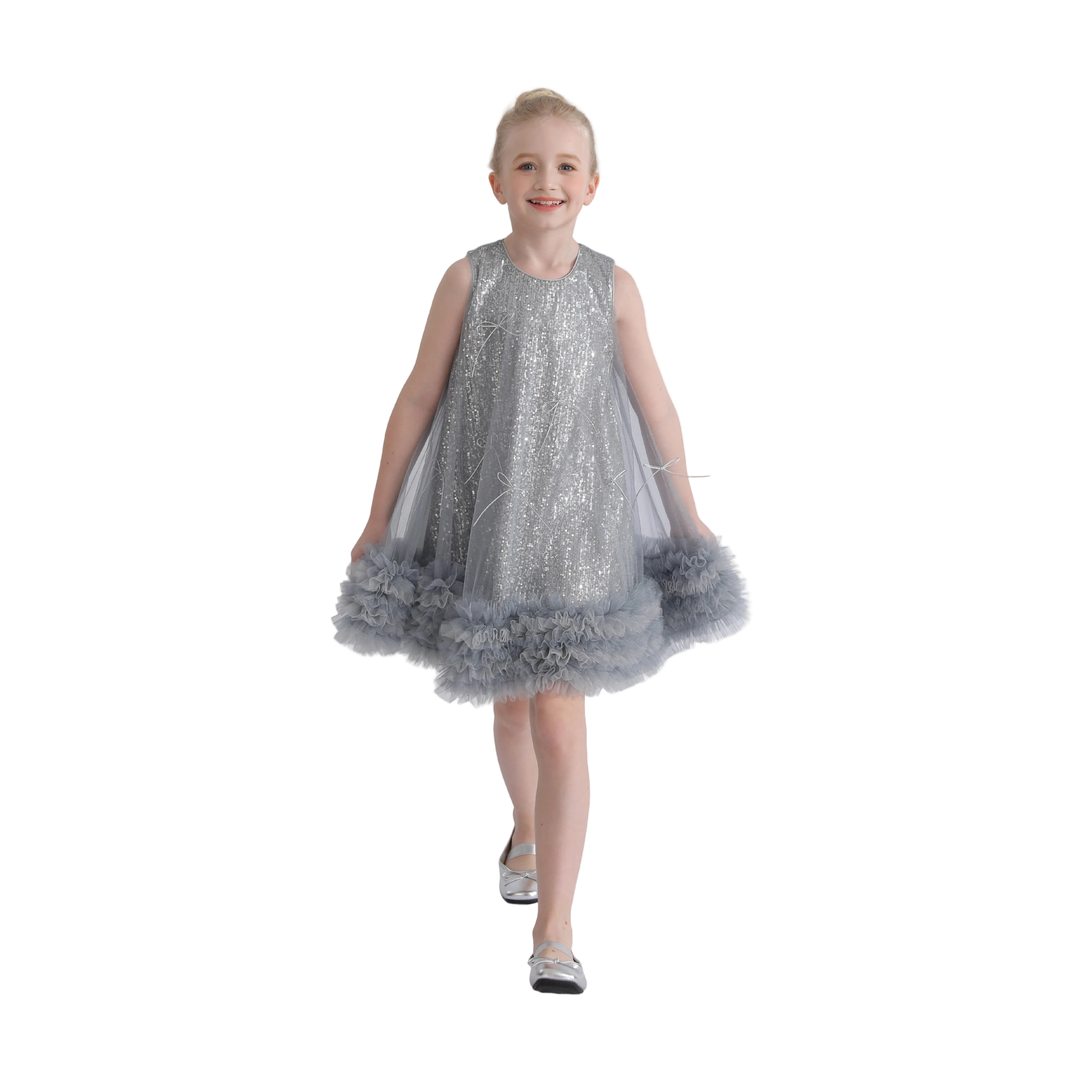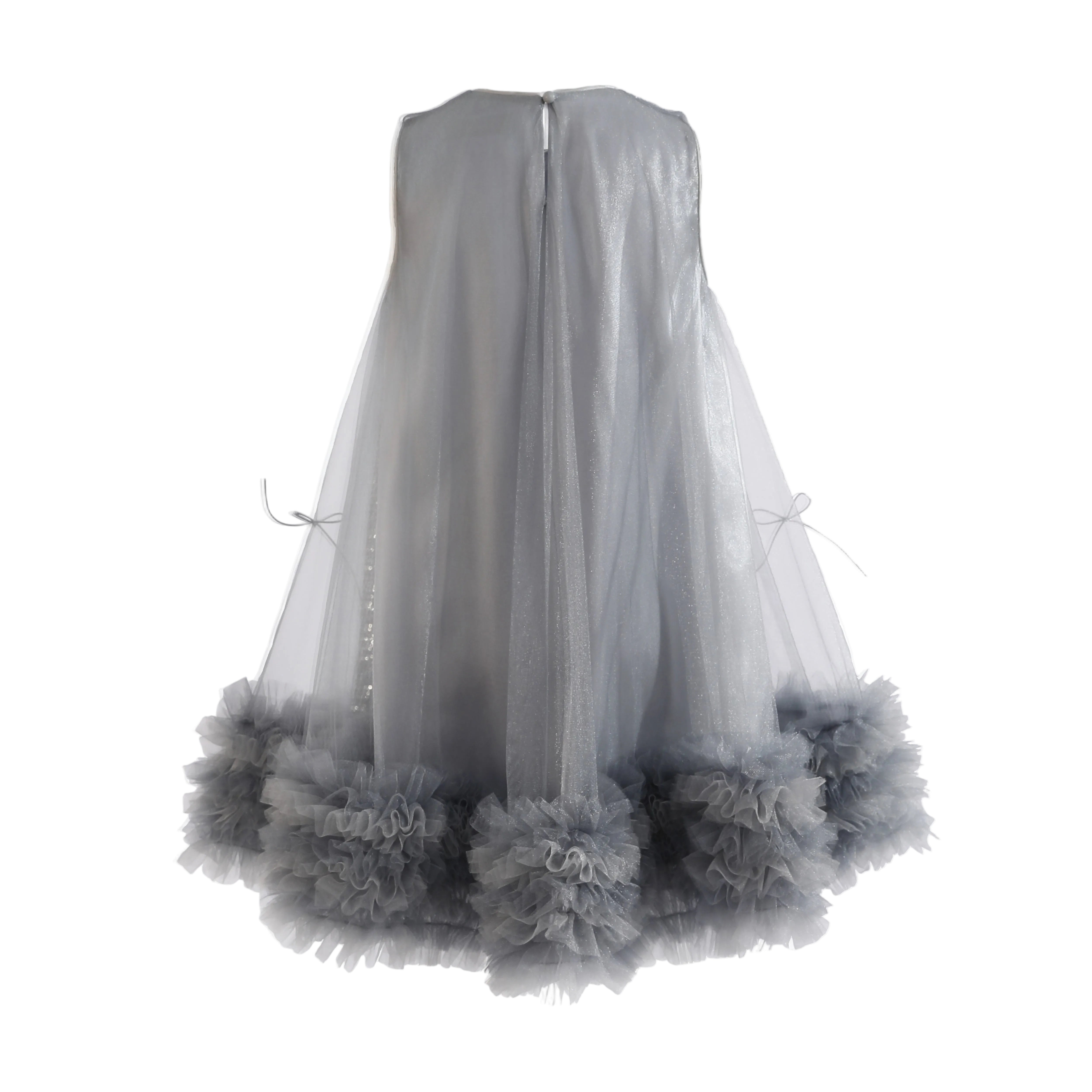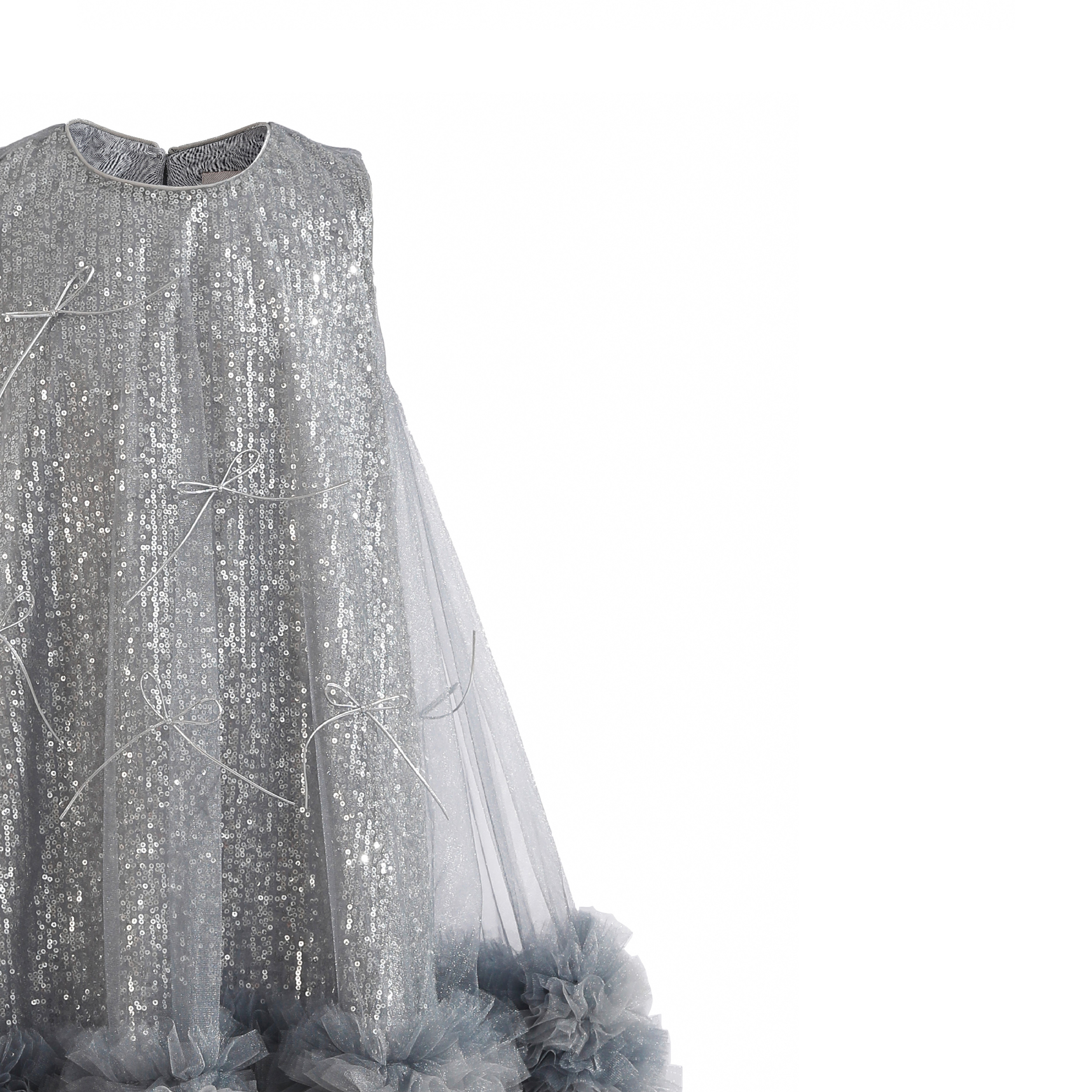 A dazzling blue-gray dress with a shimmering sequined bodice and a flared silhouette. Sheer tulle overlays adorned with delicate ribbon bows and voluminous ruffled trim at the hemline add drama and elegance, making it perfect for festive occasions.