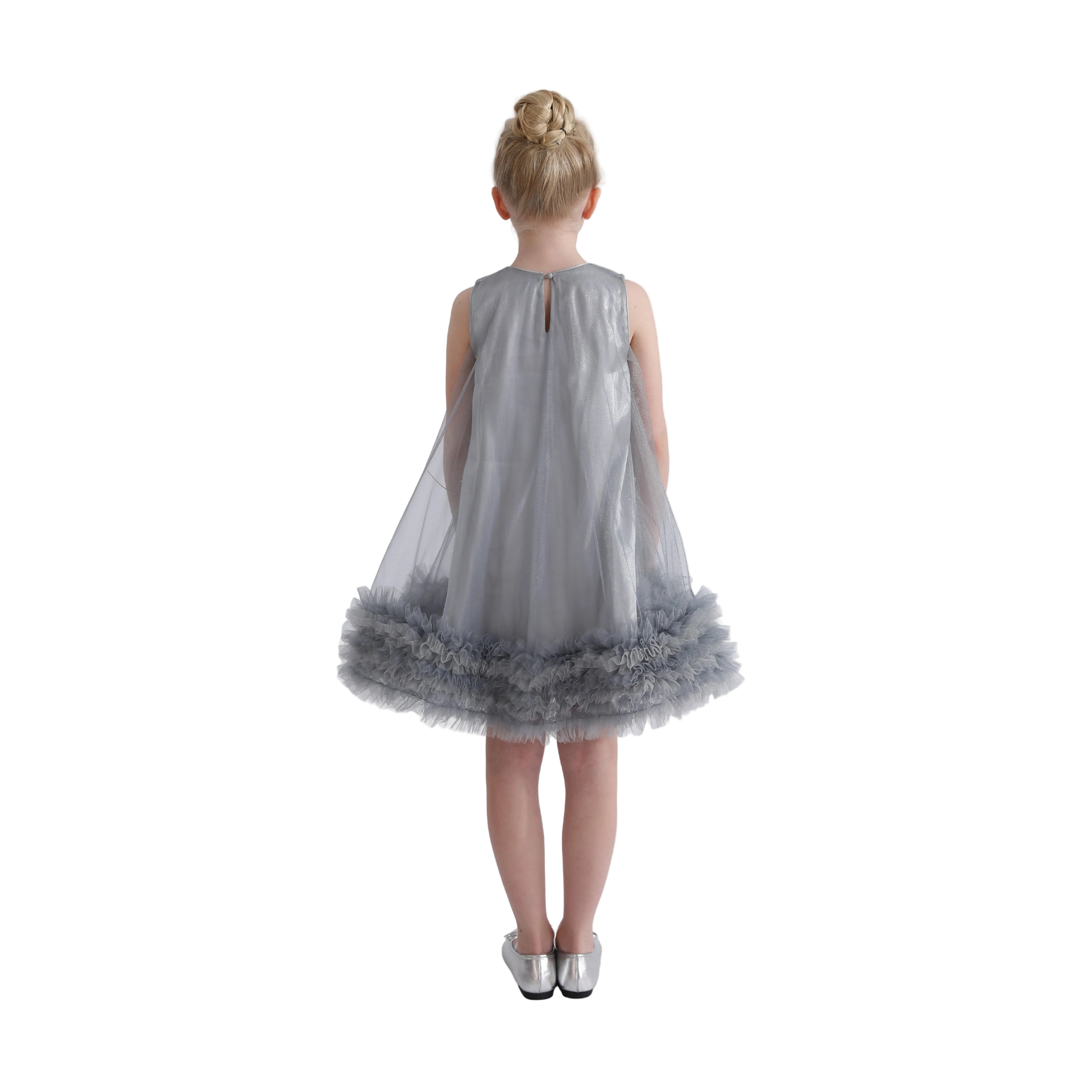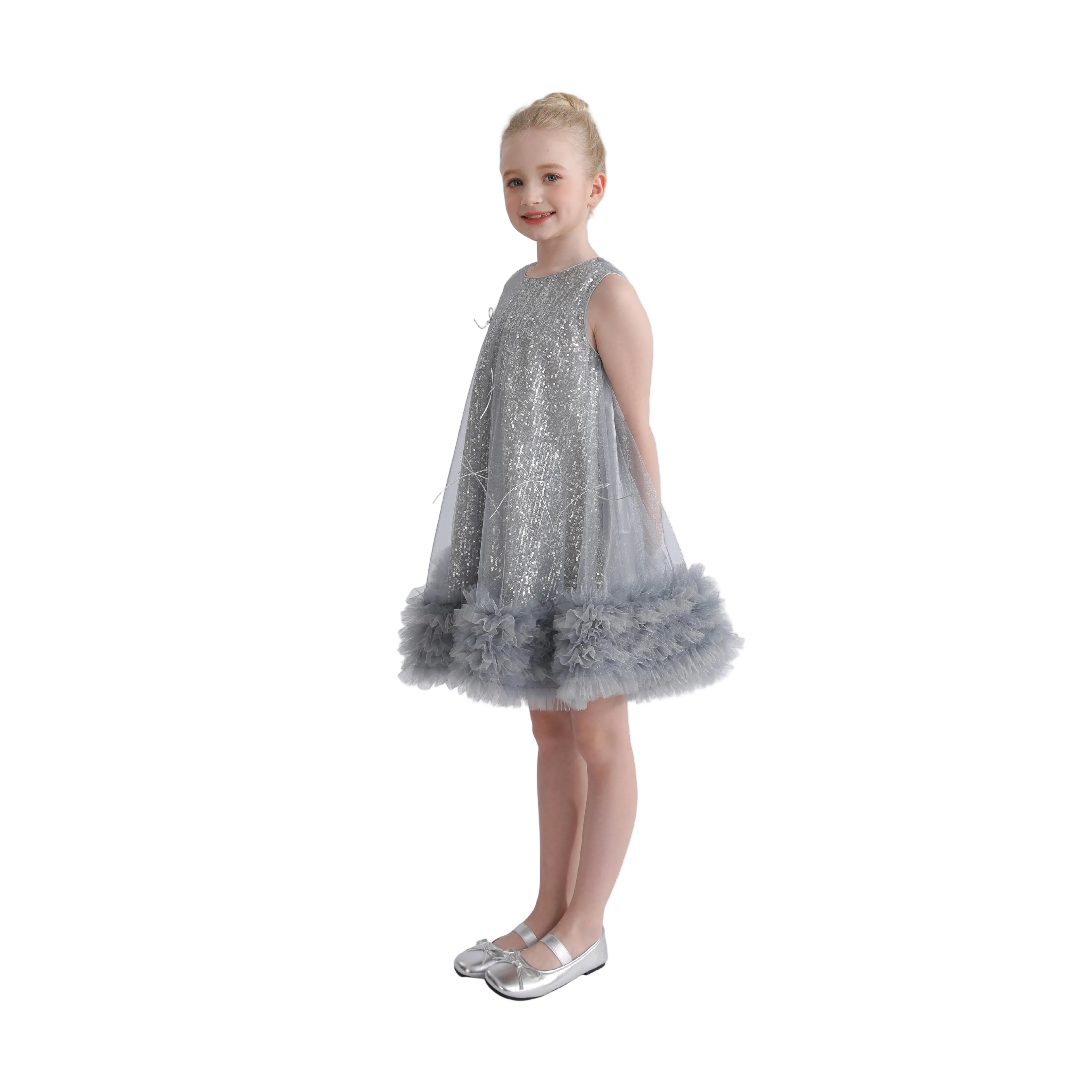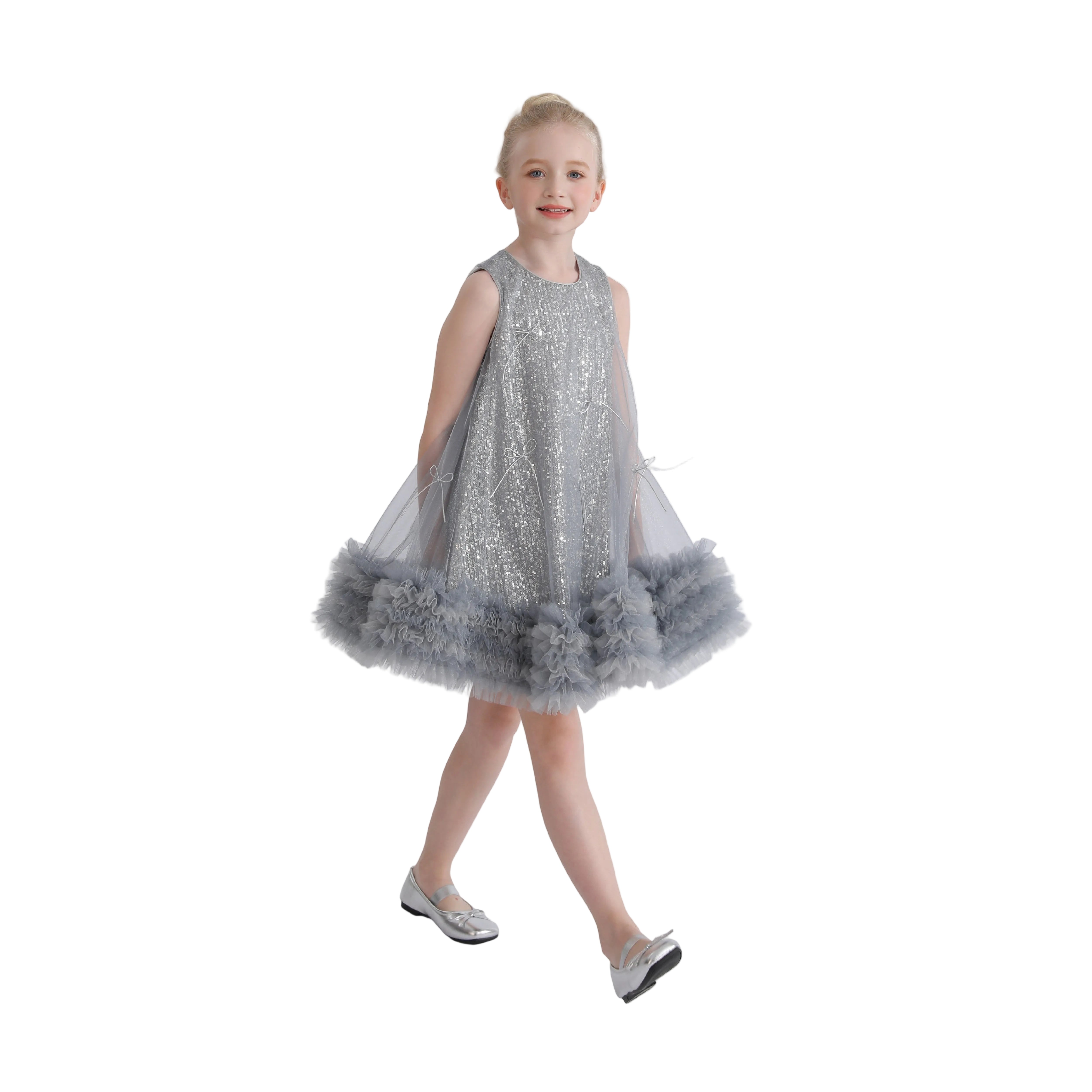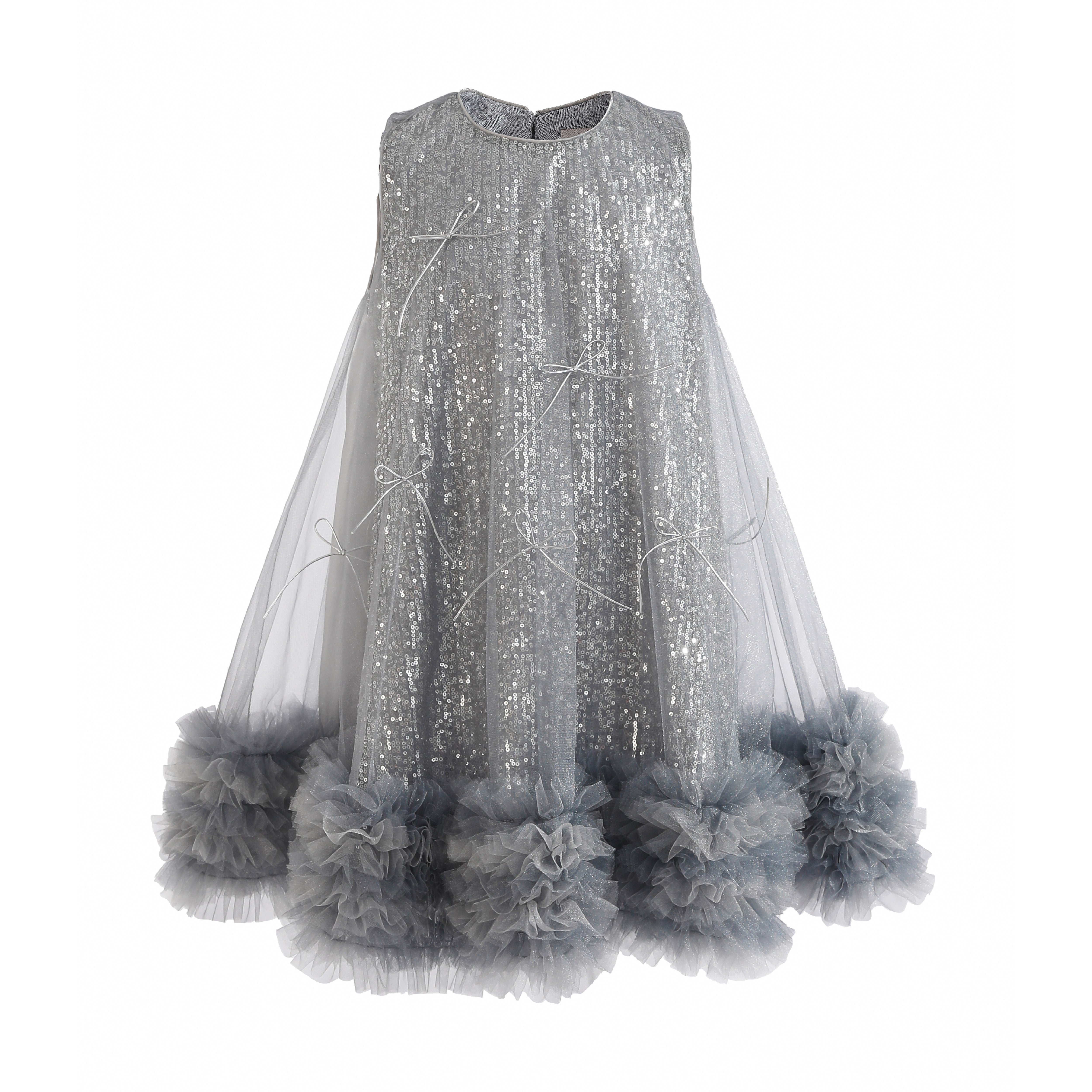 A dazzling blue-gray dress with a shimmering sequined bodice and a flared silhouette. Sheer tulle overlays adorned with delicate ribbon bows and voluminous ruffled trim at the hemline add drama and elegance, making it perfect for festive occasions.