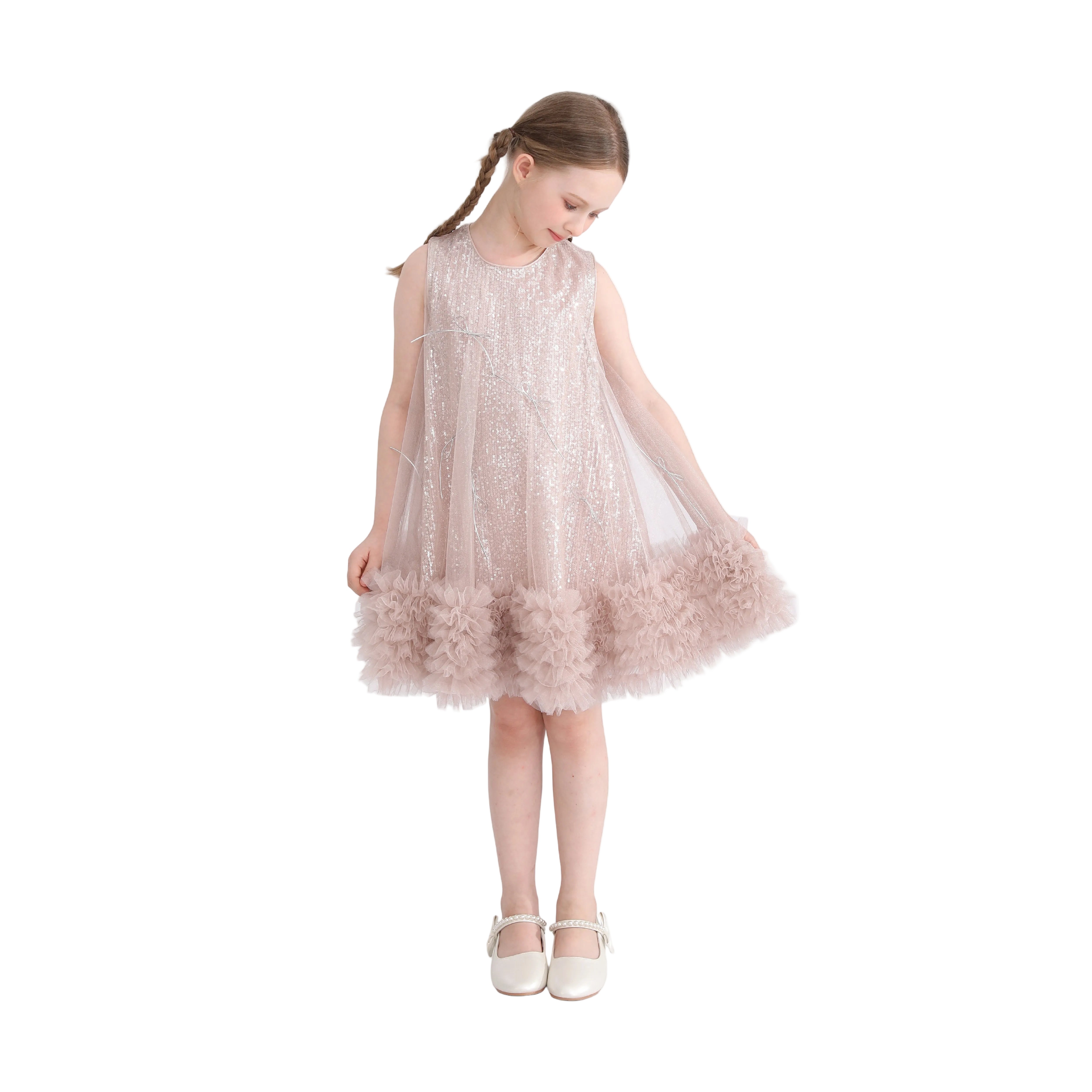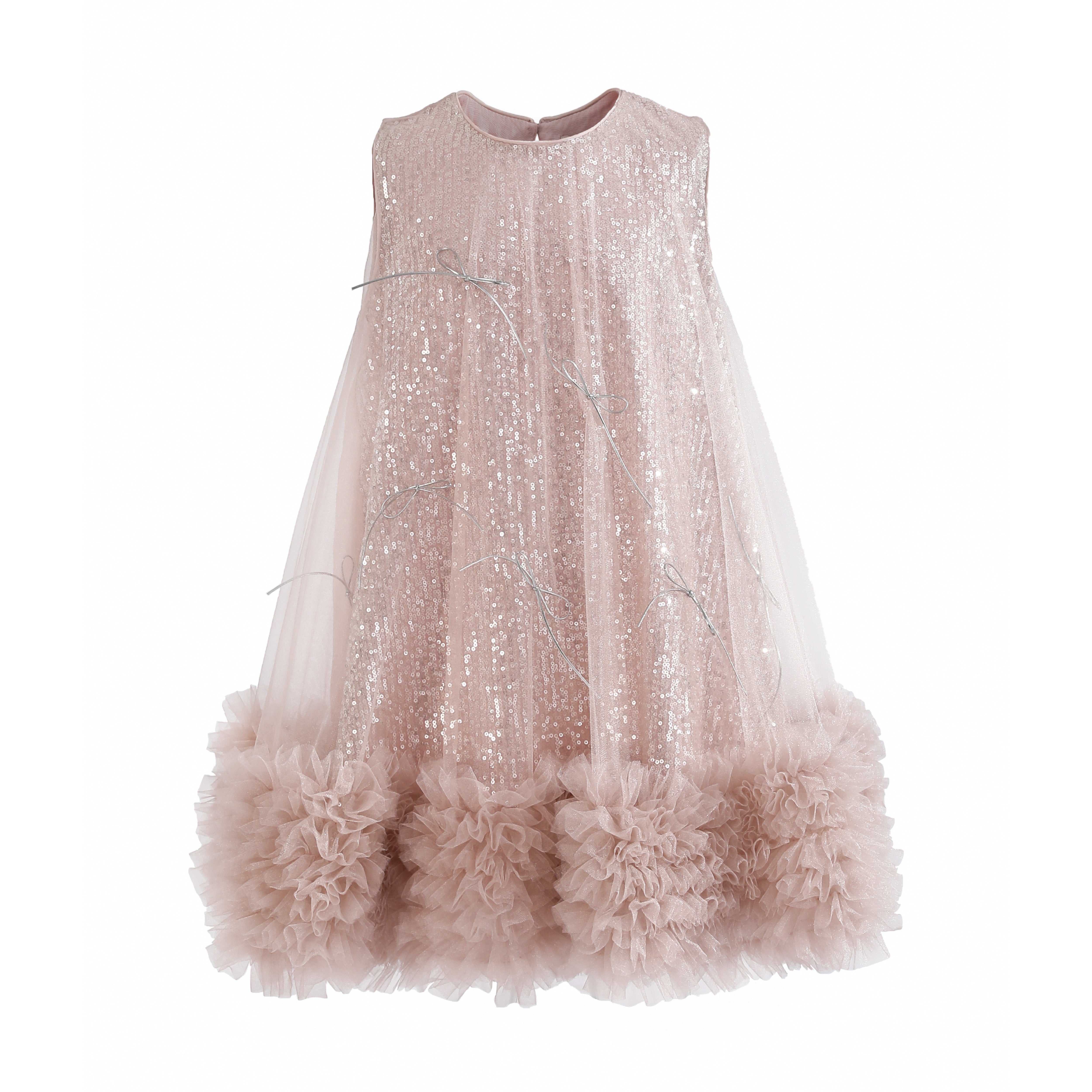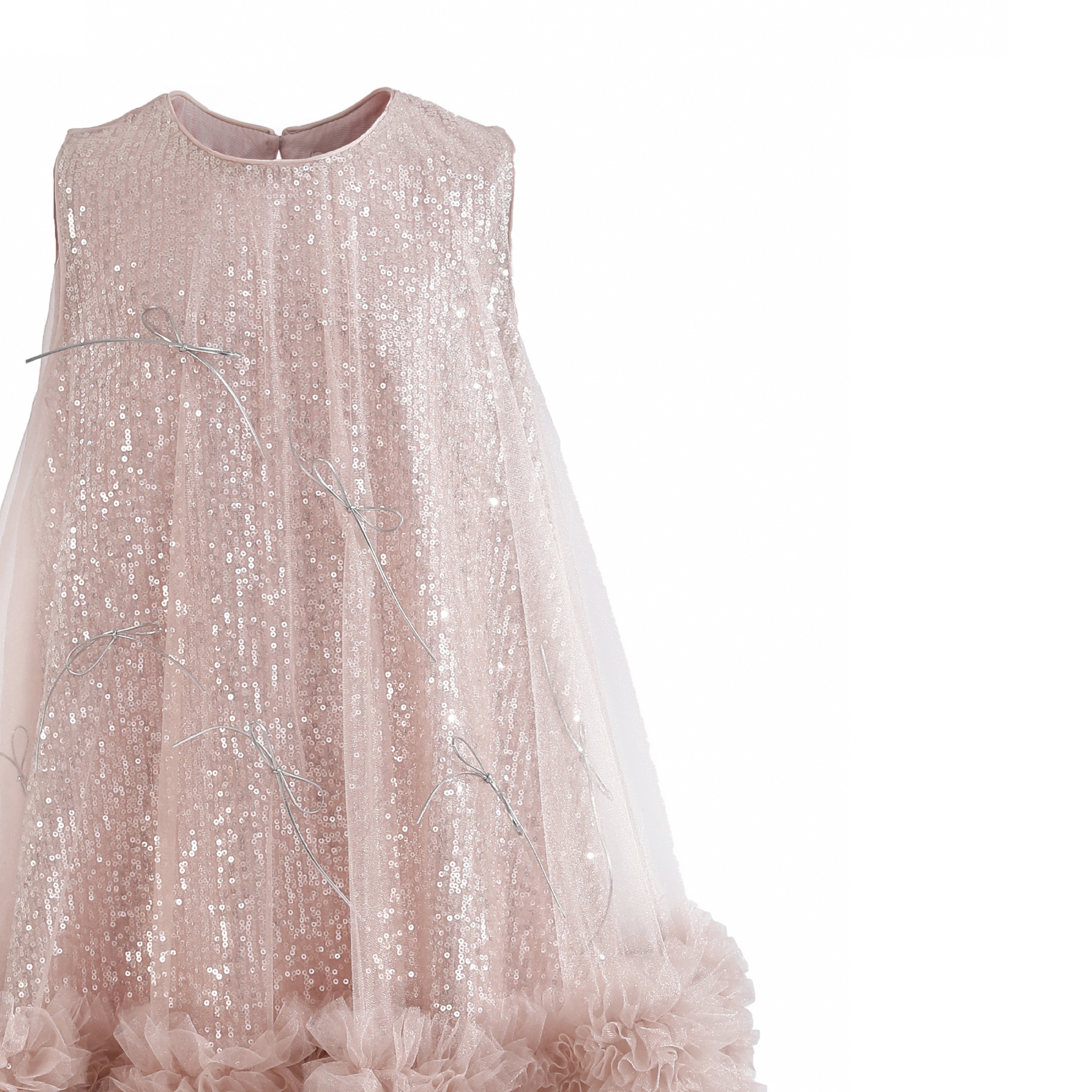 A dazzling pink dress with a shimmering sequined bodice and a flared silhouette. Sheer tulle overlays adorned with delicate ribbon bows and voluminous ruffled trim at the hemline add drama and elegance, making it perfect for festive occasions.