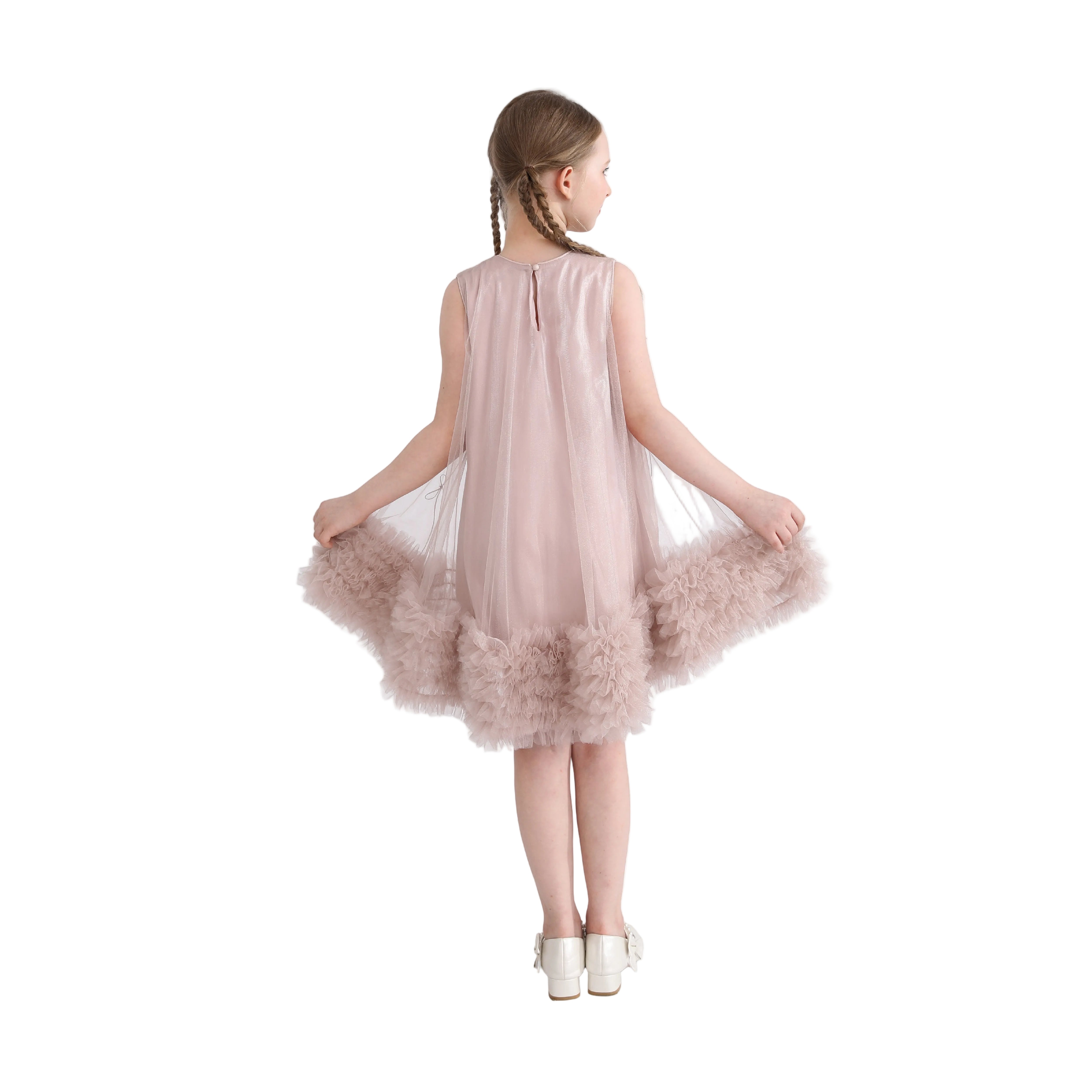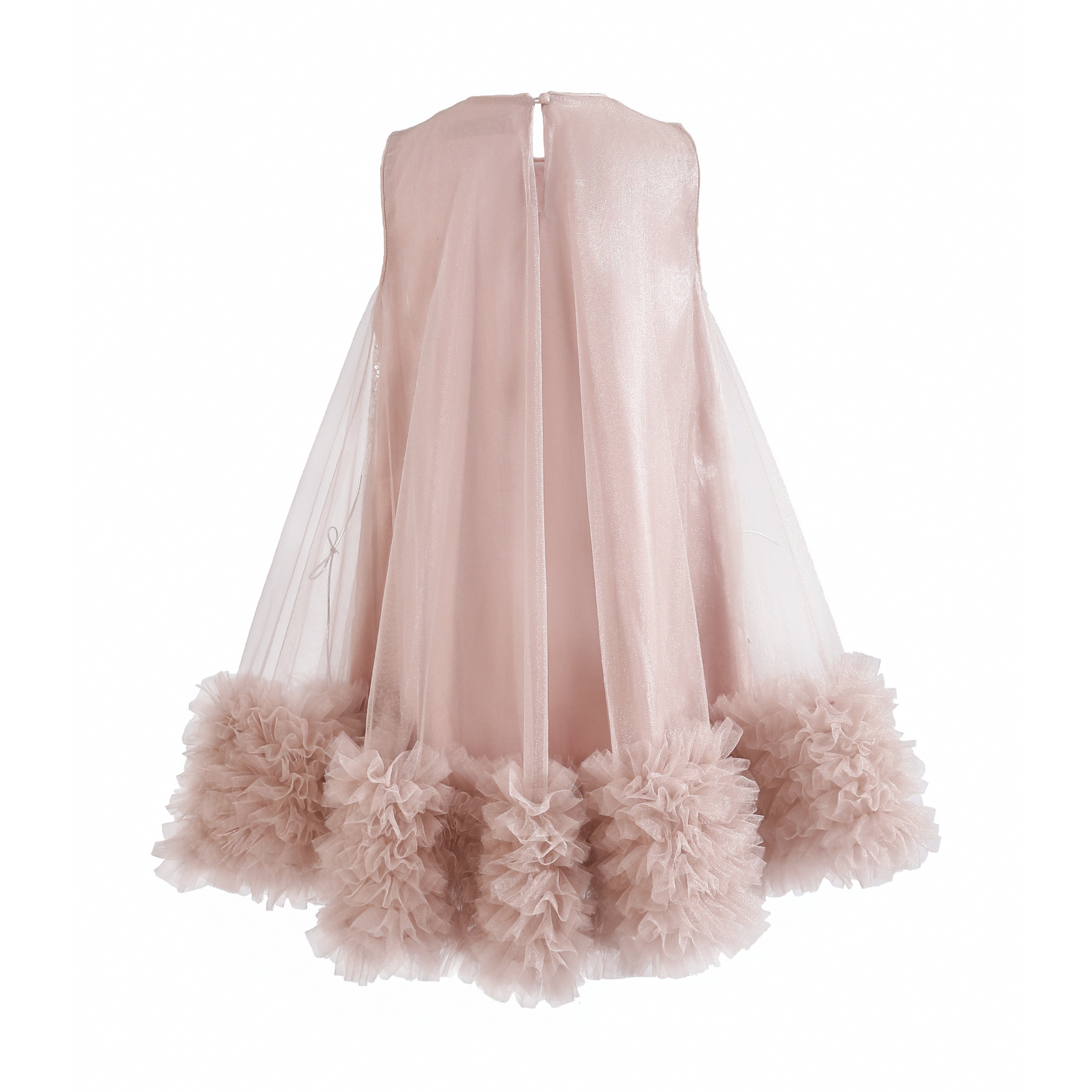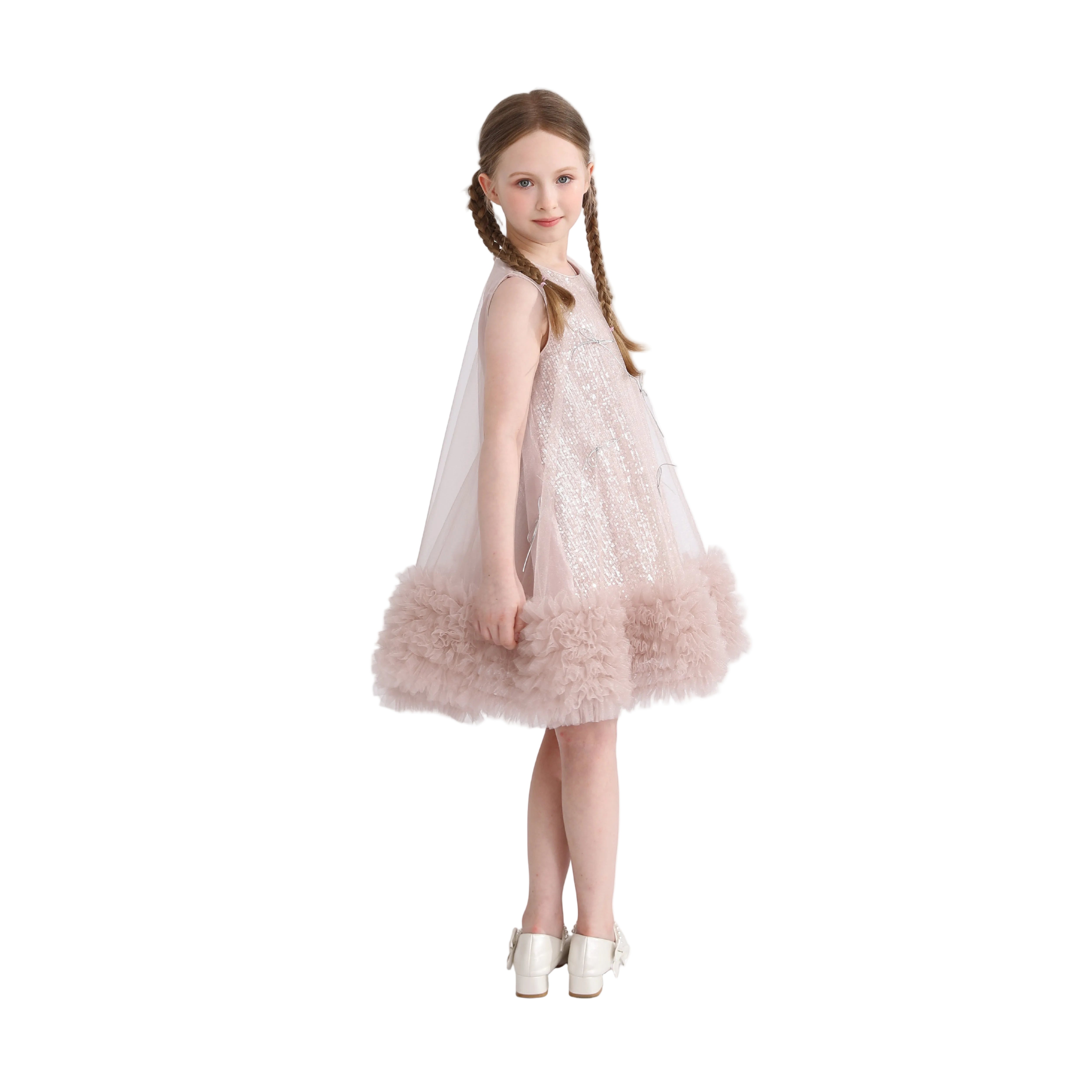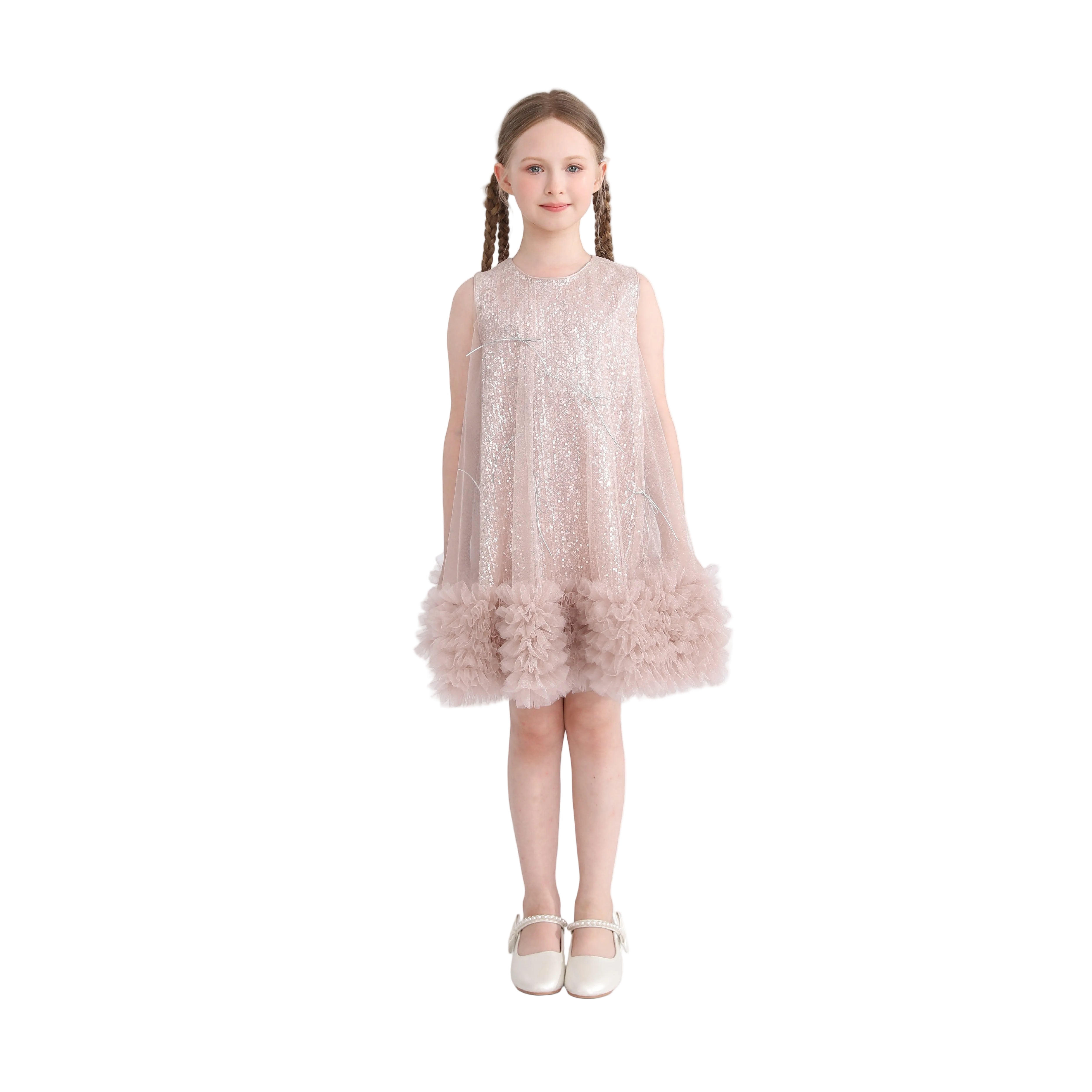A dazzling pink dress with a shimmering sequined bodice and a flared silhouette. Sheer tulle overlays adorned with delicate ribbon bows and voluminous ruffled trim at the hemline add drama and elegance, making it perfect for festive occasions.
