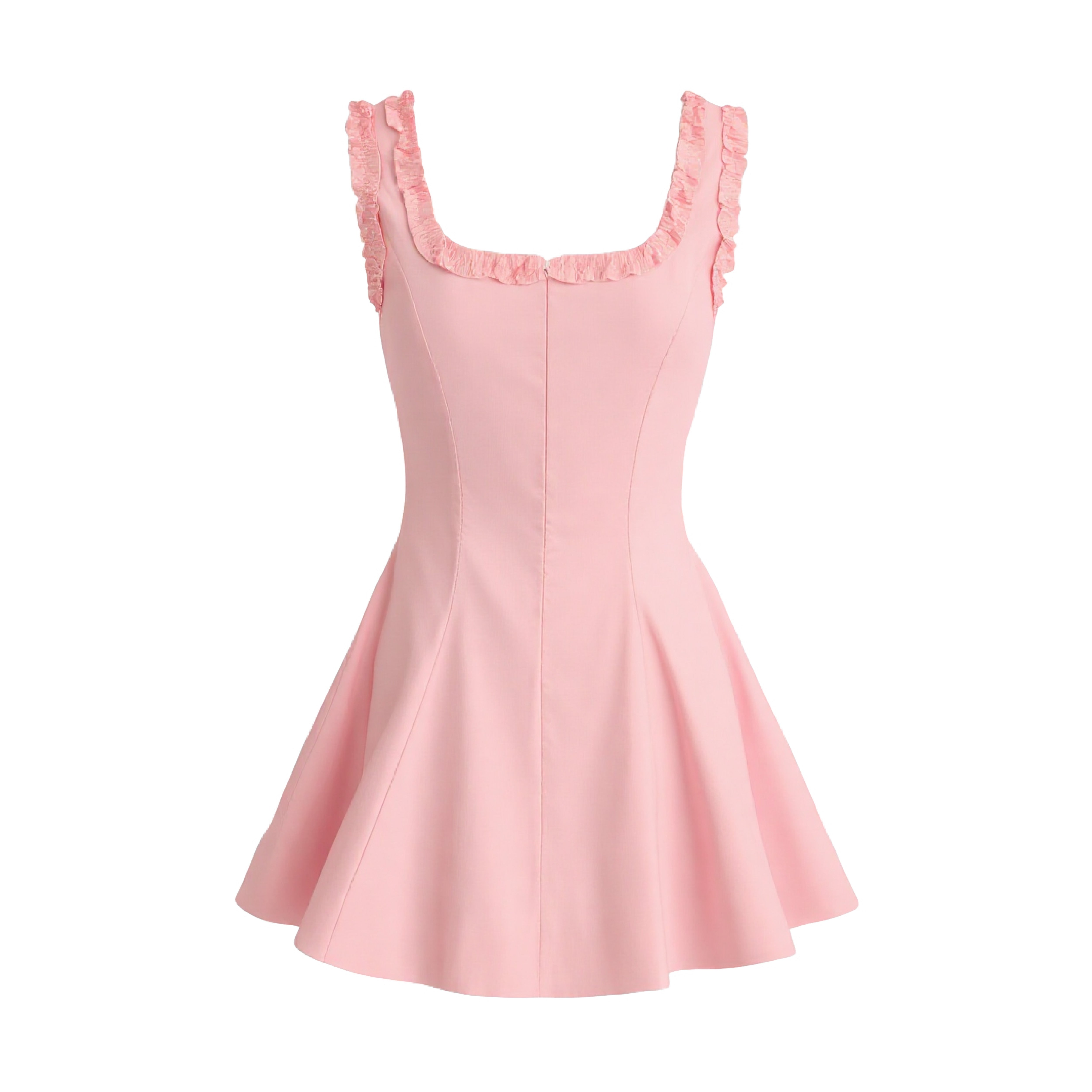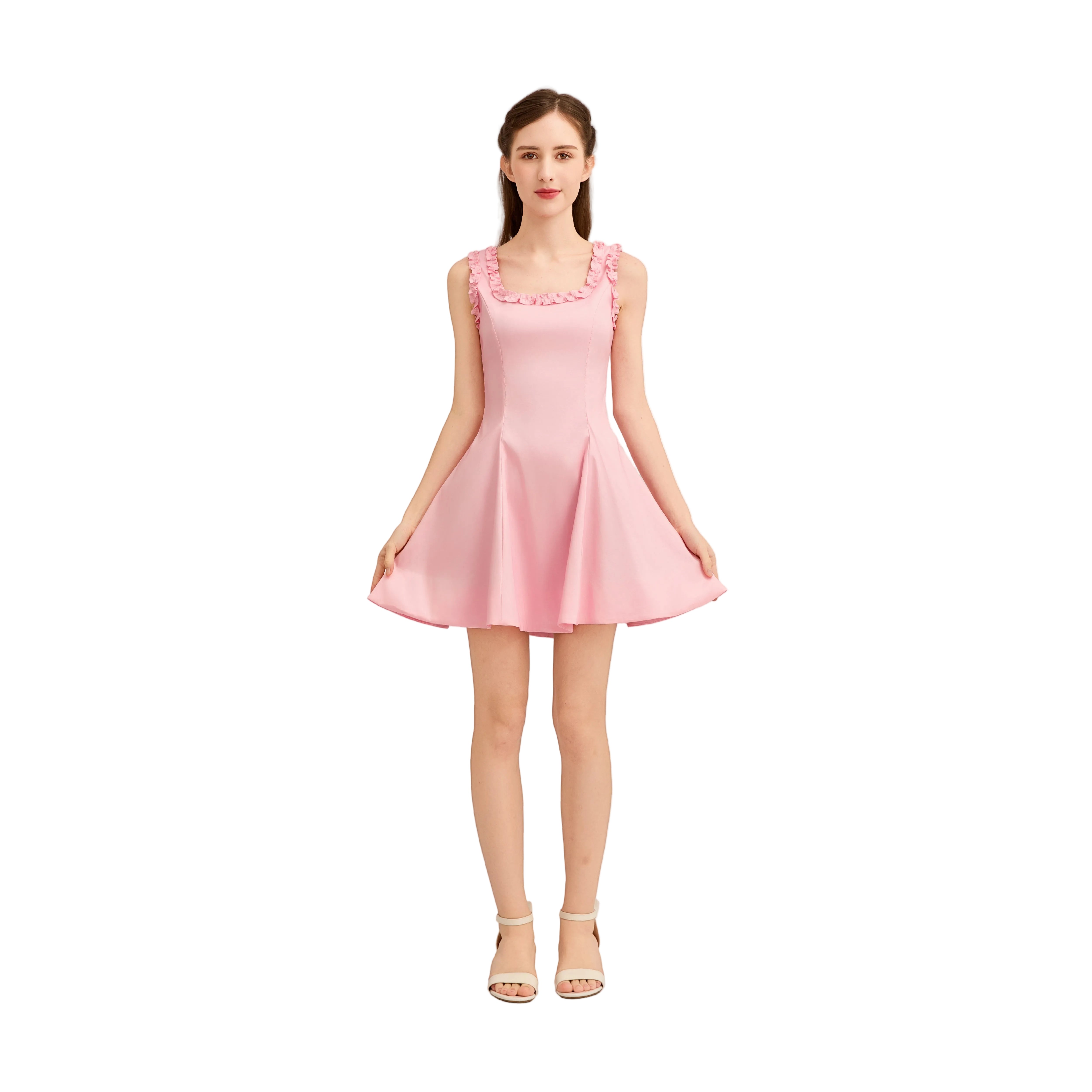 This charming sleeveless dress features a fitted bodice and a softly flared skirt, enhanced by delicate ruffle detailing along the neckline and straps. The smooth texture and pastel hue give it a feminine, graceful appeal, perfect for casual outings or semi-formal occasions.